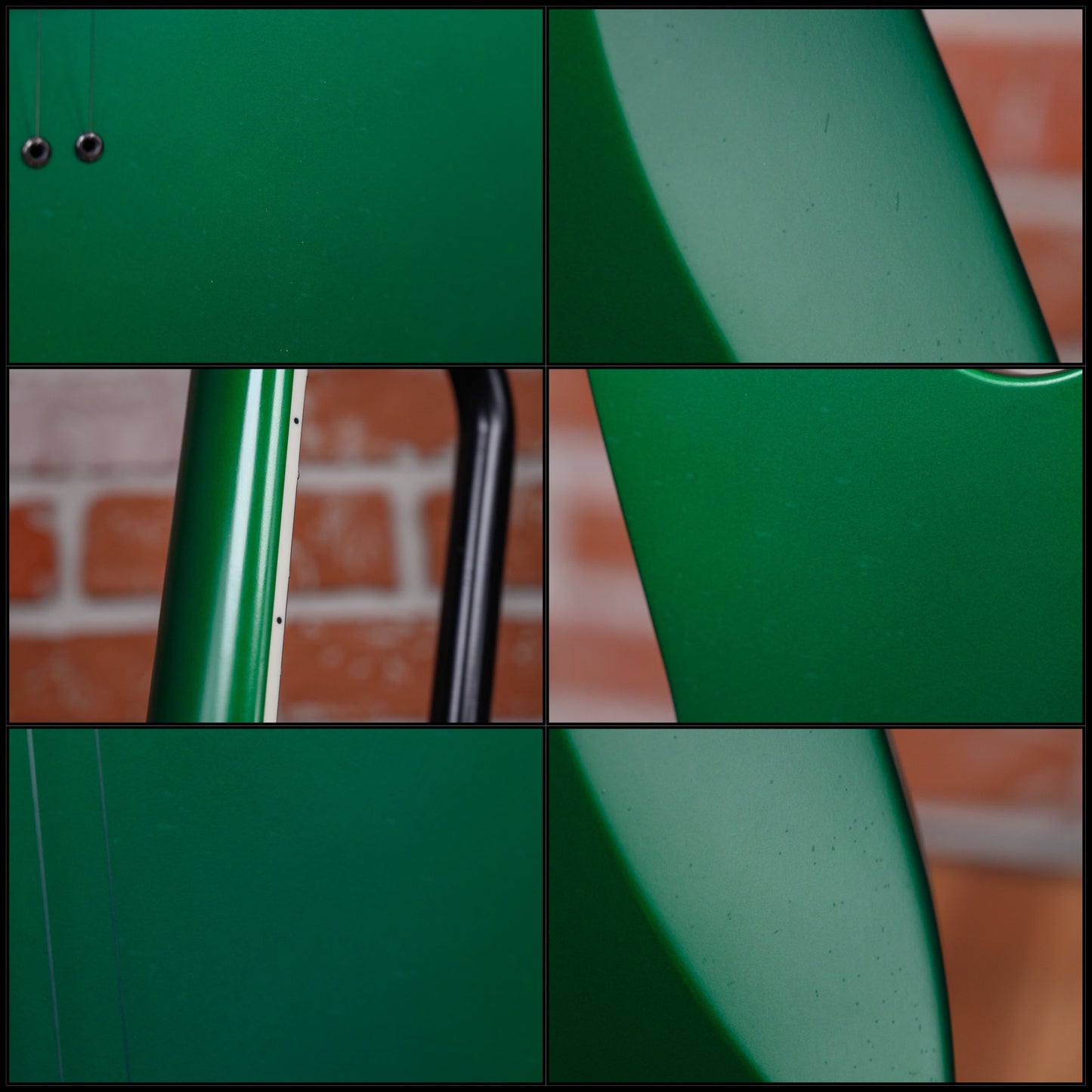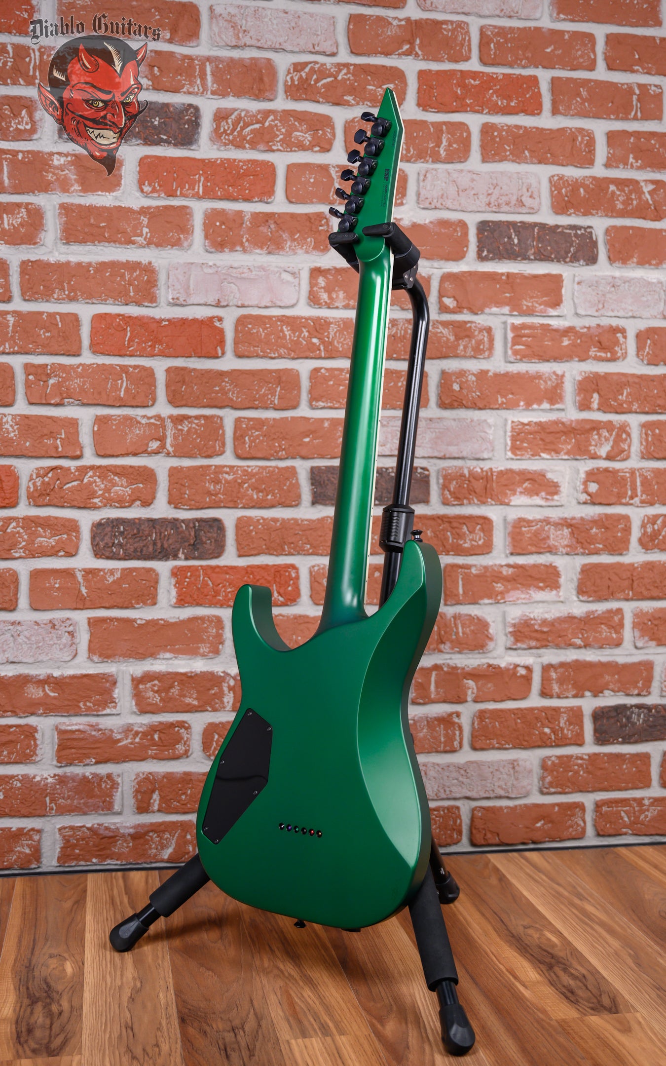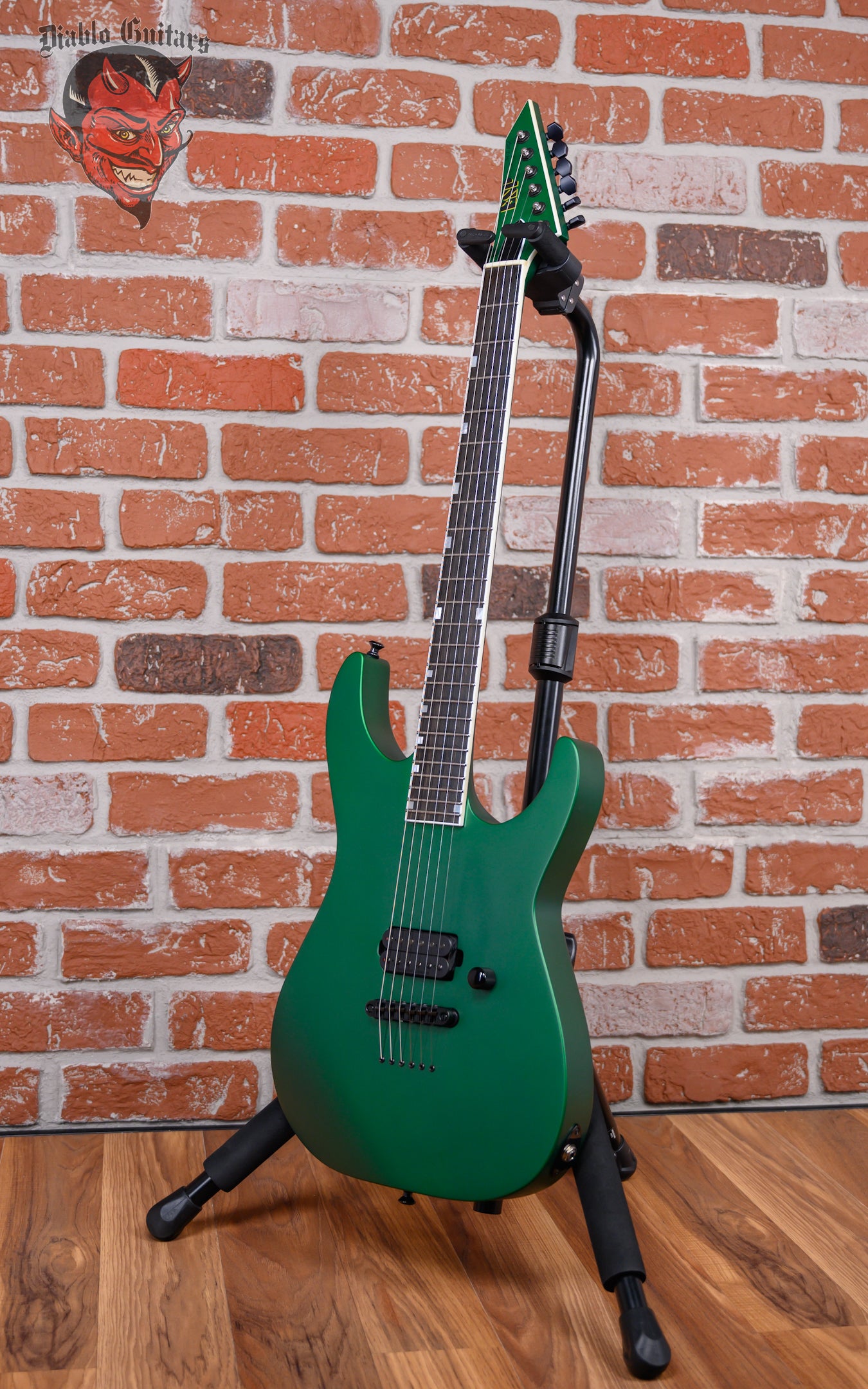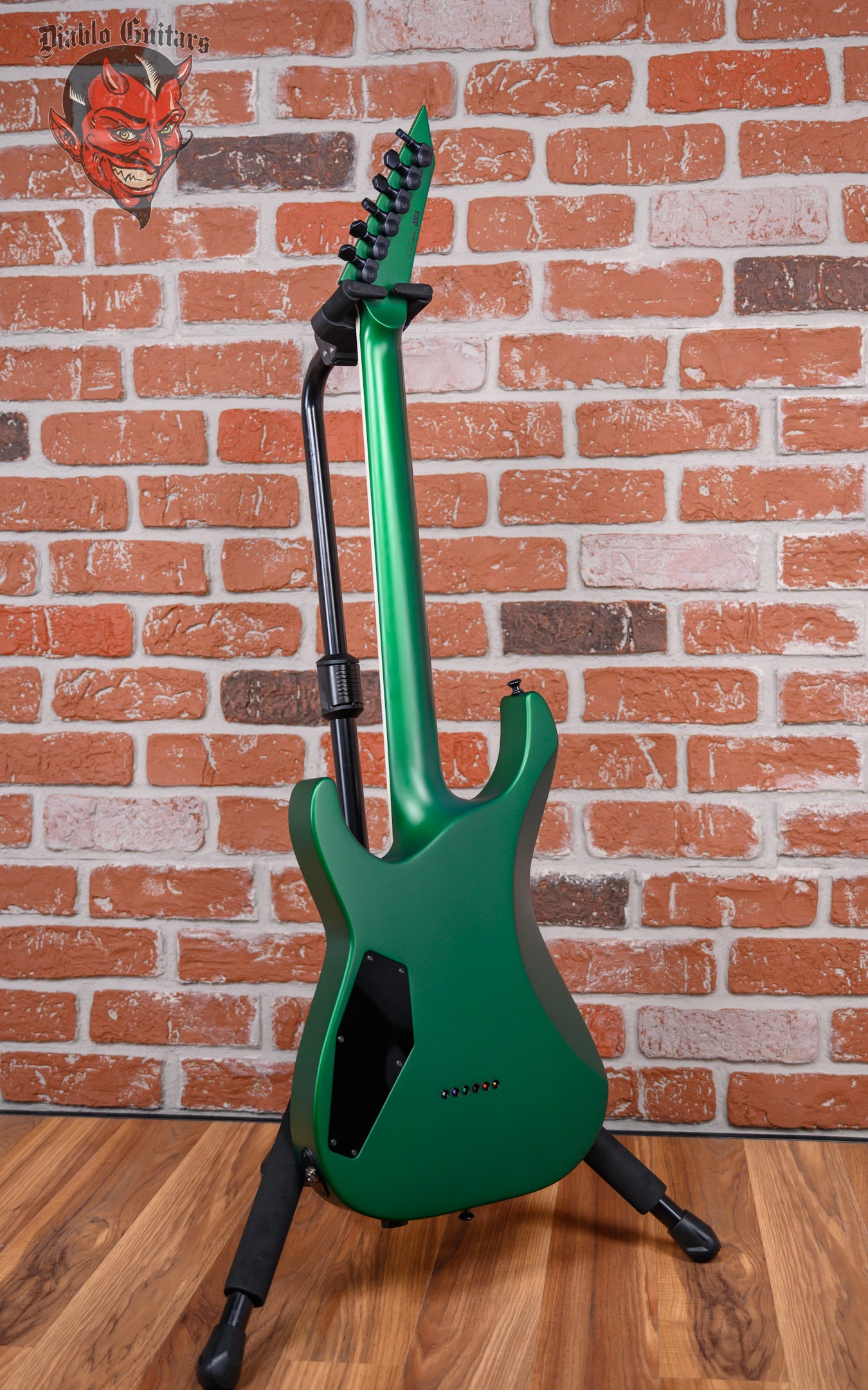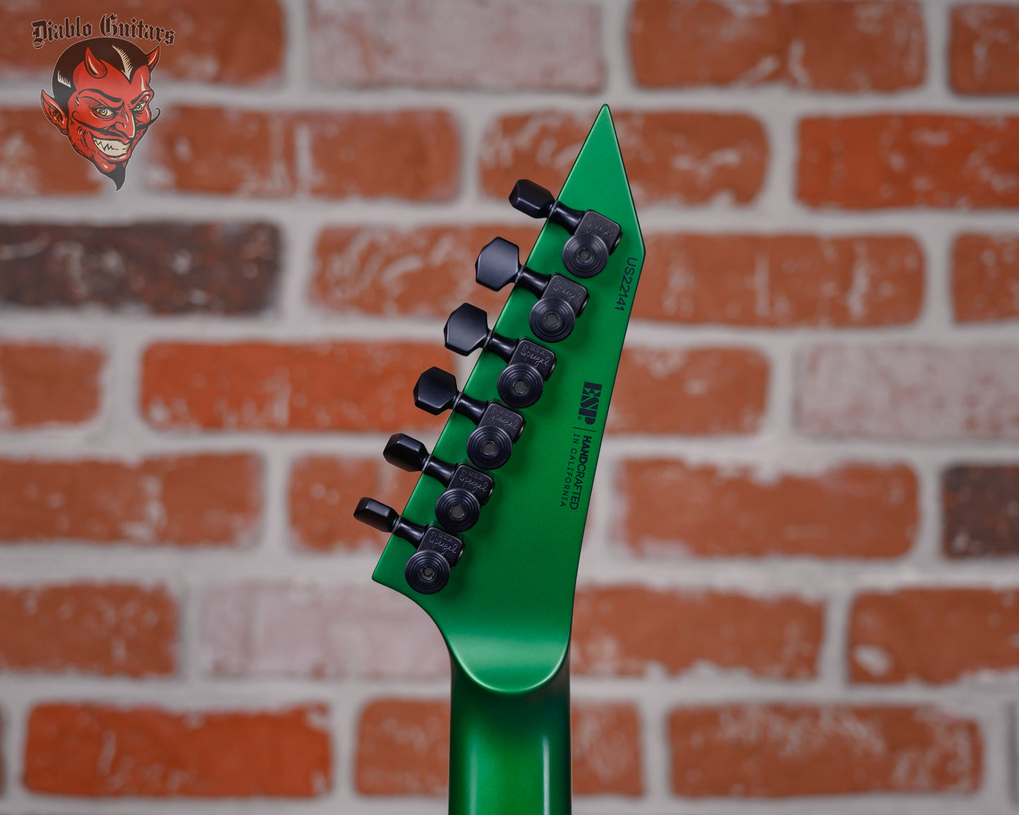 ESP USA Custom Shop M-I NTB TOM in Candy Apple Green Satin finish made in 2022 with Original Hard Shell Case. This guitar features a solid mahogany body, 3-Piece maple neck-thru and bound ebony fingerboard with a reverse, bound and color matched headstock. Equipped with a single Seymour Duncan pegasus in the bridge position and Controlled by one master volume pot with push/pull coil tap. The 25.5" scale length neck has mother of pearl offset block inlays and black side markers with 24 extra jumbo stainless steel jescar Fw57110 frets on a 305mm radius with an extra thin U profile. The hardware is comprised of black sperzel Trim-Lok tuning machines with cloche heads, a bone nut, a tone pros T3BT locking bridge with string-thru body tail and black knurled dome knob.