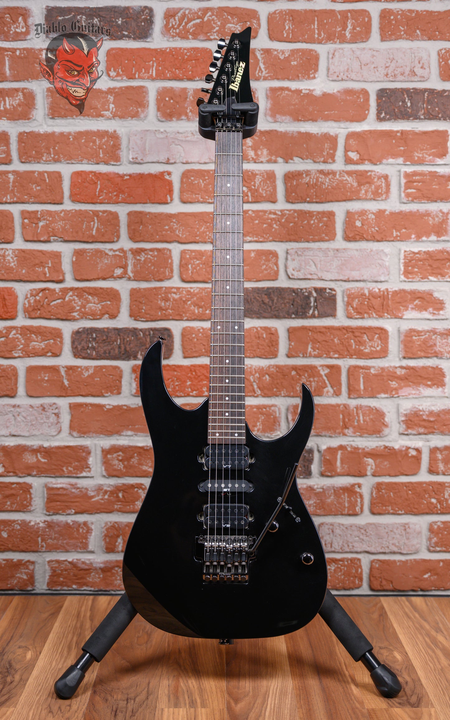 Ibanez Prestige RG1570 in Black finish made in 2008 with Original Hard Shell Case. This guitar features a solid basswood body, 5-Piece maple/walnut neck and rosewood fingerboard. Equipped with an Ibanez V7 humbucker in the neck position, an Ibanez S1 single coil in the middle position, and an Ibanez V8 humbucker in the bridge position. Controlled by 1 volume pot, 1 tone pot and a 5-Way blade switch. The 25.5" scale length neck has pearloid dot inlays and white side markers with 24 jumbo frets on a 430mm radius with a Wizard Prestige profile. The hardware is comprised of cosmo black Gotoh sealed die-cast tuning machines with cloche heads, a Top Lok III nut, an Ibanez Edge Double Pro Locking Tremolo bridge and cosmo black knurled dome knobs.