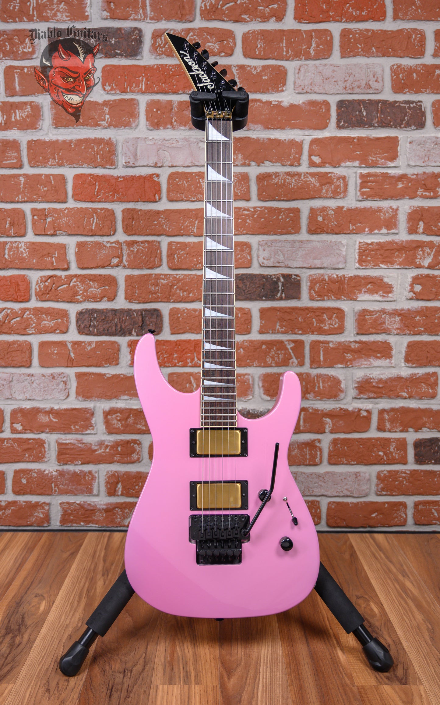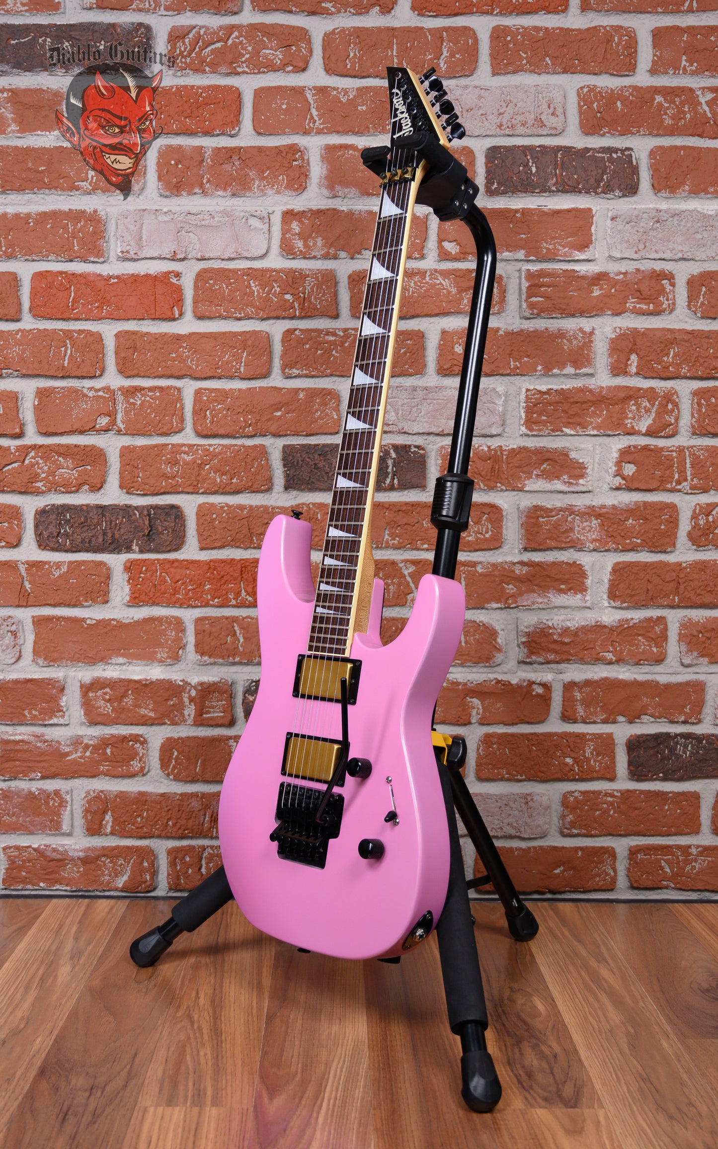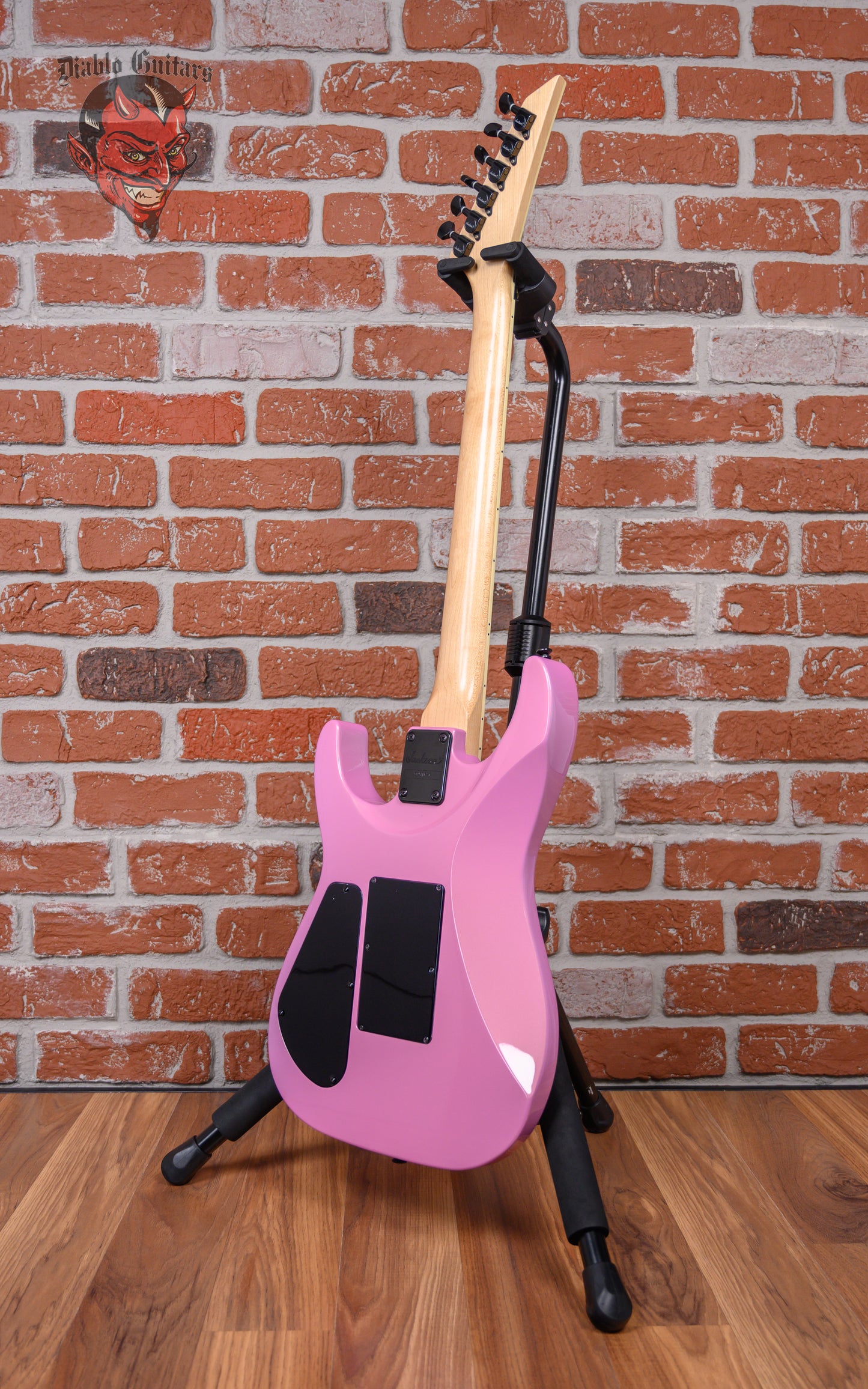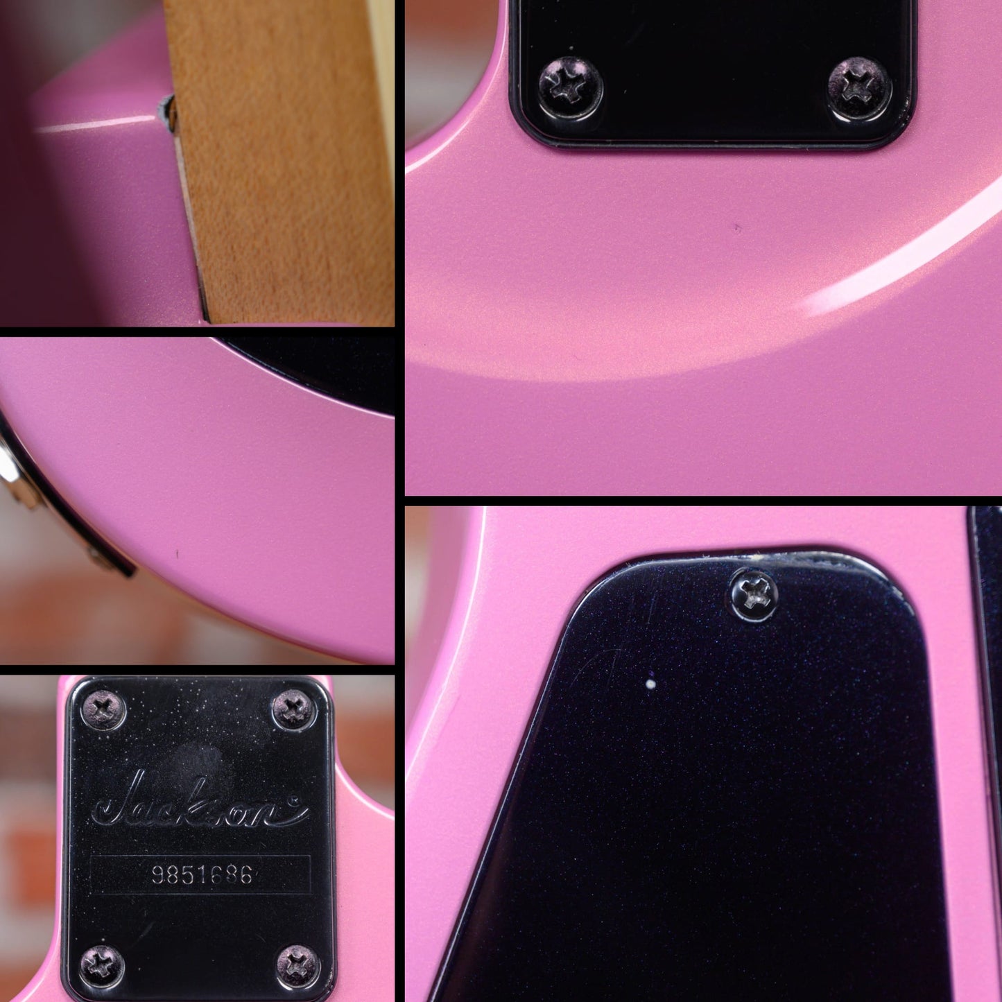 Jackson DXMG in Pink Pearl finish made in 2005 with Gator Hardshell Case. This guitar features a solid basswood body, maple neck and bound rosewood fingerboard with a reverse/bound headstock. Equipped with a set of brushed gold EMGs; a 60 in the neck position and an 81 in the bridge position. Controlled by 1 volume pot, 1 tone pot and a 3-way blade switch. The 25.5" scale length neck has pearloid sharkfin inlays and black side markers with 24 jumbo frets on a compound 12"-16" radius with a speed profile. The hardware is comprised of black Jackson sealed die-cast tuning machines with cloche heads, a Floyd Rose locking nut, a Floyd Rose 1000 Series Double Locking Tremolo bridge and black knurled dome knobs.