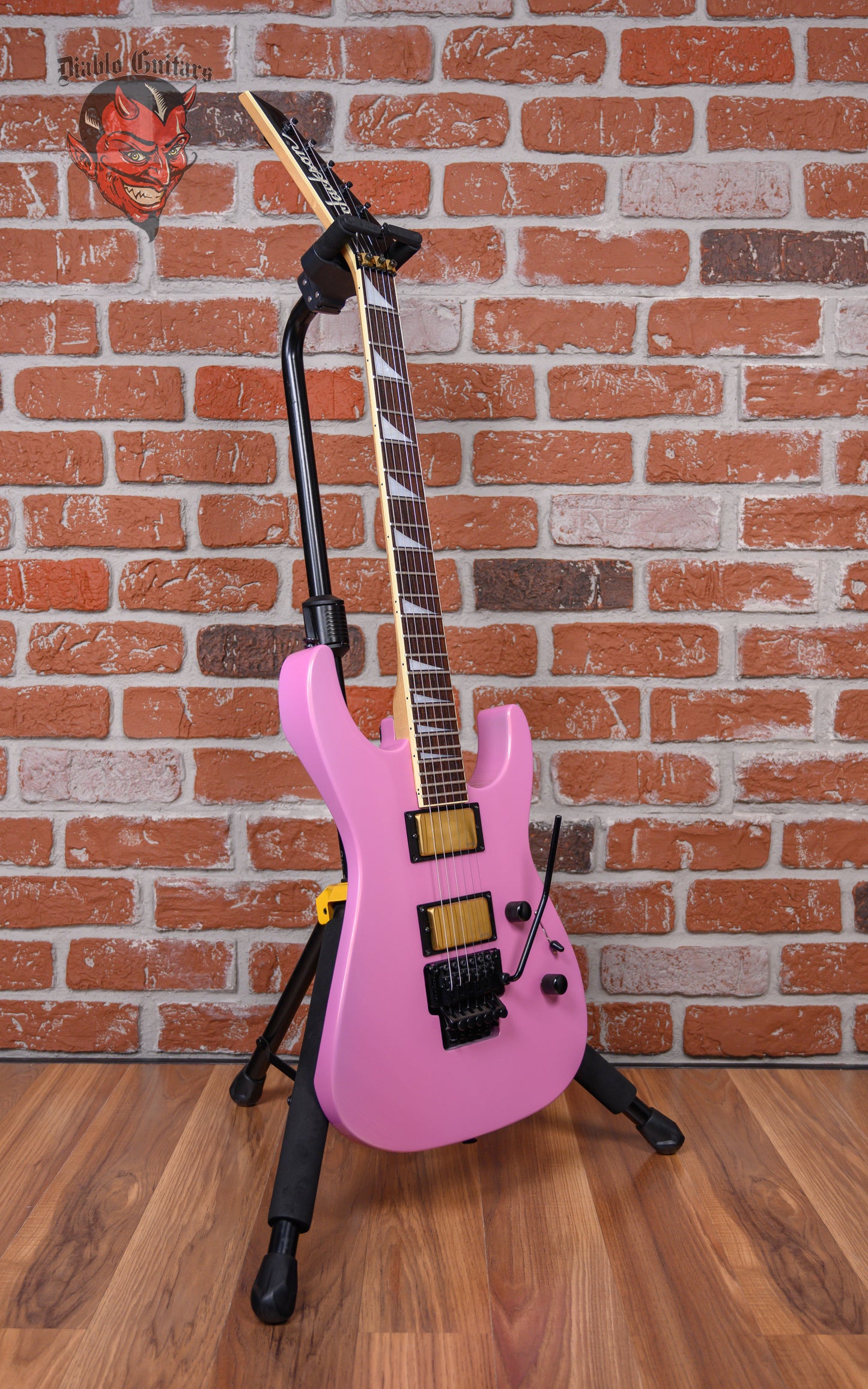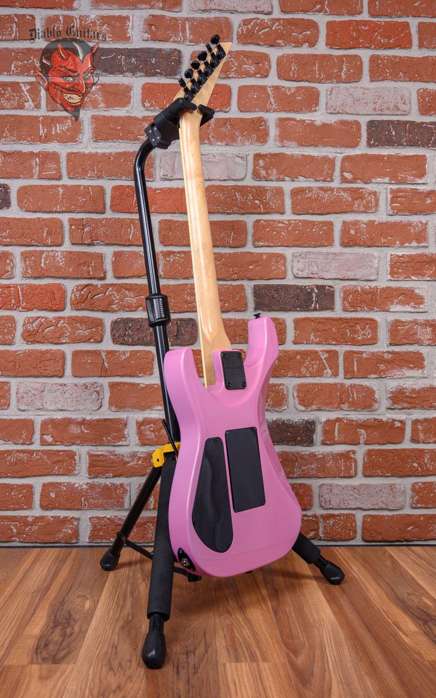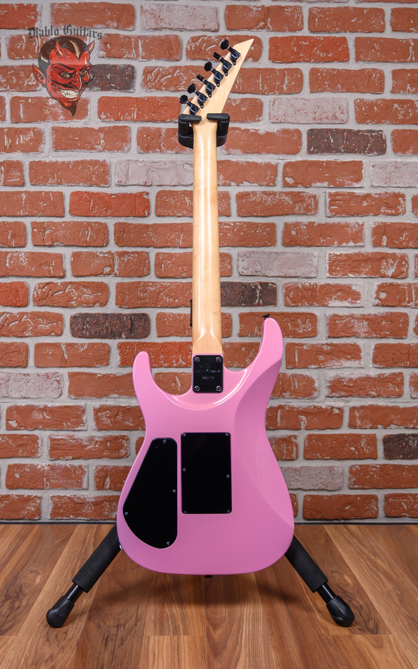 Jackson DXMG in Pink Pearl finish made in 2005 with Gator Hardshell Case. This guitar features a solid basswood body, maple neck and bound rosewood fingerboard with a reverse/bound headstock. Equipped with a set of brushed gold EMGs; a 60 in the neck position and an 81 in the bridge position. Controlled by 1 volume pot, 1 tone pot and a 3-way blade switch. The 25.5" scale length neck has pearloid sharkfin inlays and black side markers with 24 jumbo frets on a compound 12"-16" radius with a speed profile. The hardware is comprised of black Jackson sealed die-cast tuning machines with cloche heads, a Floyd Rose locking nut, a Floyd Rose 1000 Series Double Locking Tremolo bridge and black knurled dome knobs.