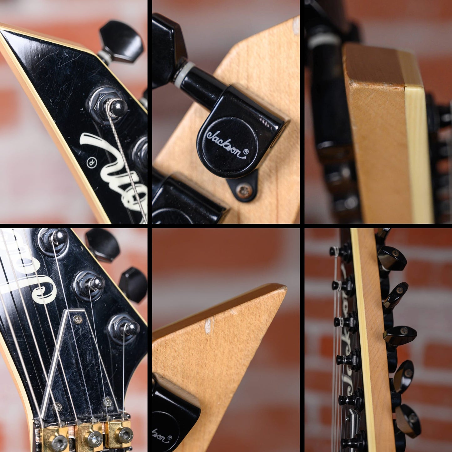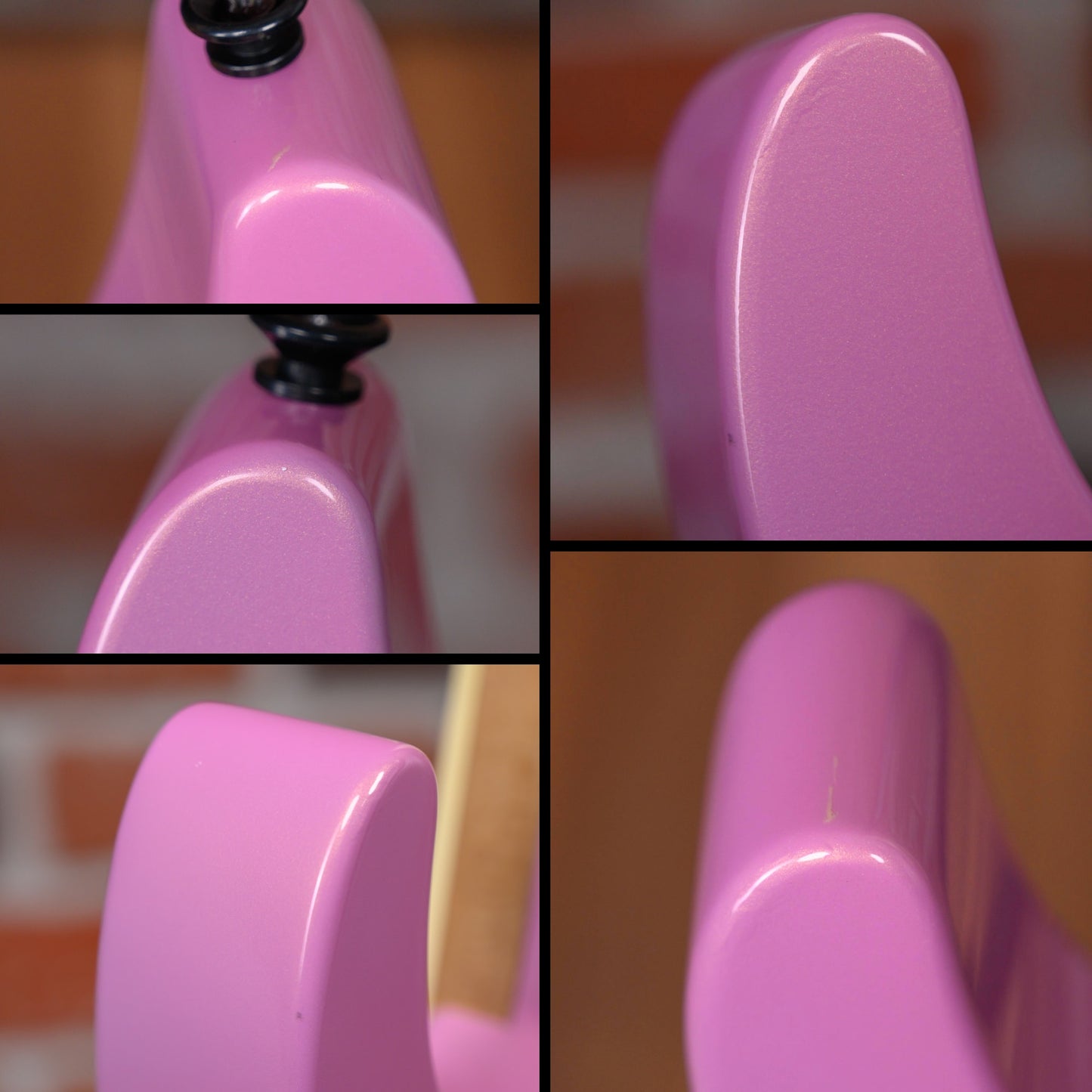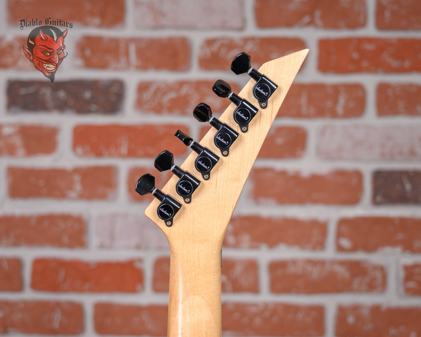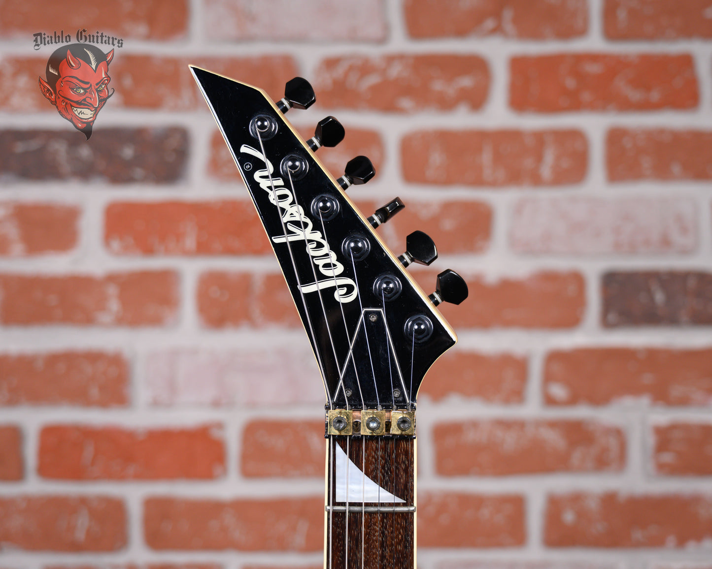 Jackson DXMG in Pink Pearl finish made in 2005 with Gator Hardshell Case. This guitar features a solid basswood body, maple neck and bound rosewood fingerboard with a reverse/bound headstock. Equipped with a set of brushed gold EMGs; a 60 in the neck position and an 81 in the bridge position. Controlled by 1 volume pot, 1 tone pot and a 3-way blade switch. The 25.5" scale length neck has pearloid sharkfin inlays and black side markers with 24 jumbo frets on a compound 12"-16" radius with a speed profile. The hardware is comprised of black Jackson sealed die-cast tuning machines with cloche heads, a Floyd Rose locking nut, a Floyd Rose 1000 Series Double Locking Tremolo bridge and black knurled dome knobs.