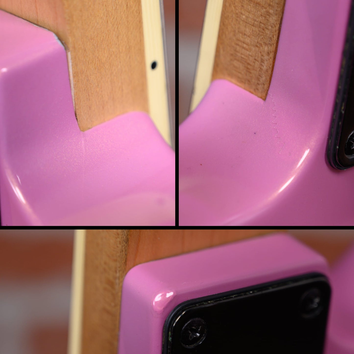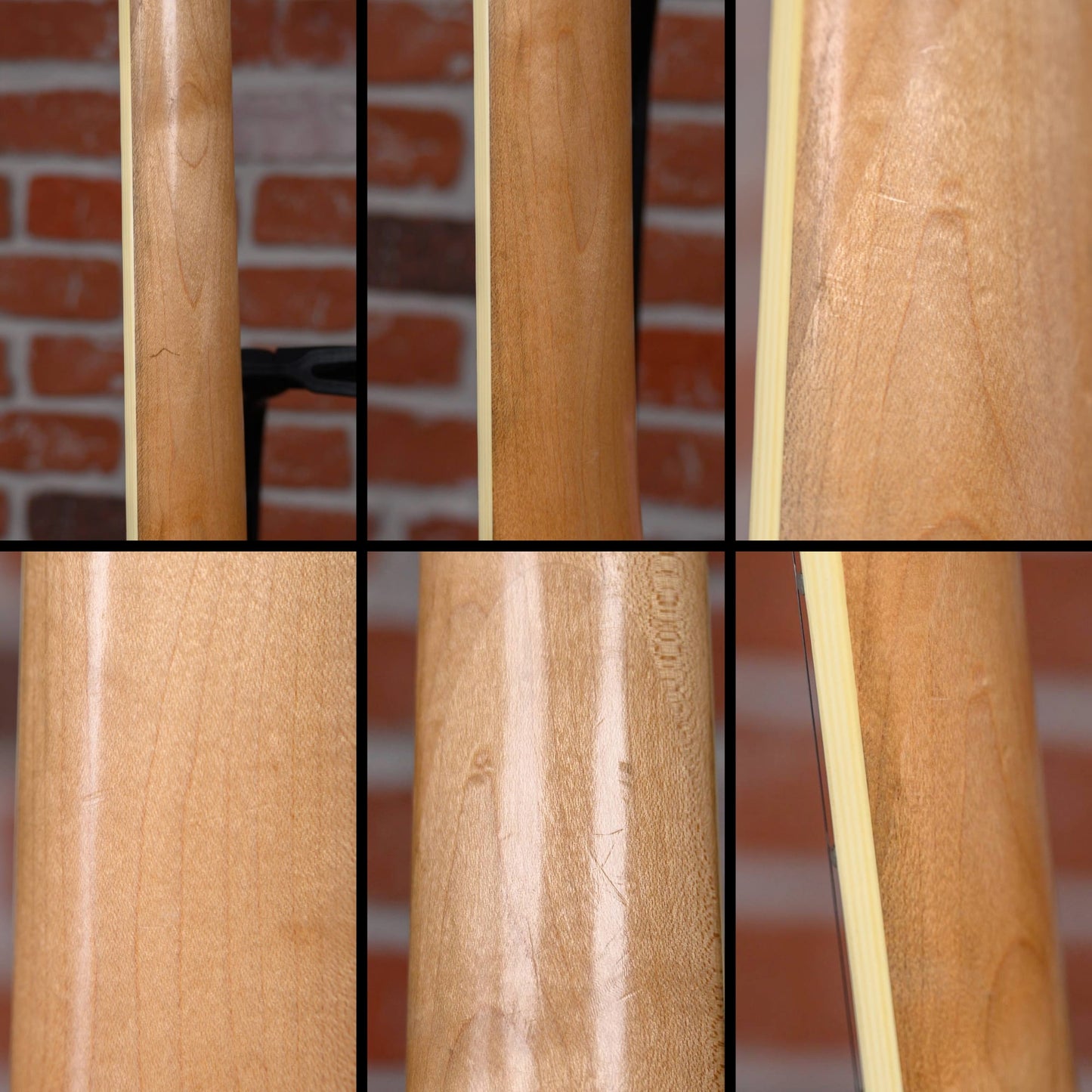 This guitar is in overall very good condition. This guitar was refinished and the body shows little to no sign of play. There are some finish inconsistencies around the corners and small finish splits in the neck pocket. The back of the neck has some dents and dings. The headstock has some light surface marks, small dings and some binding separation. (See pics)