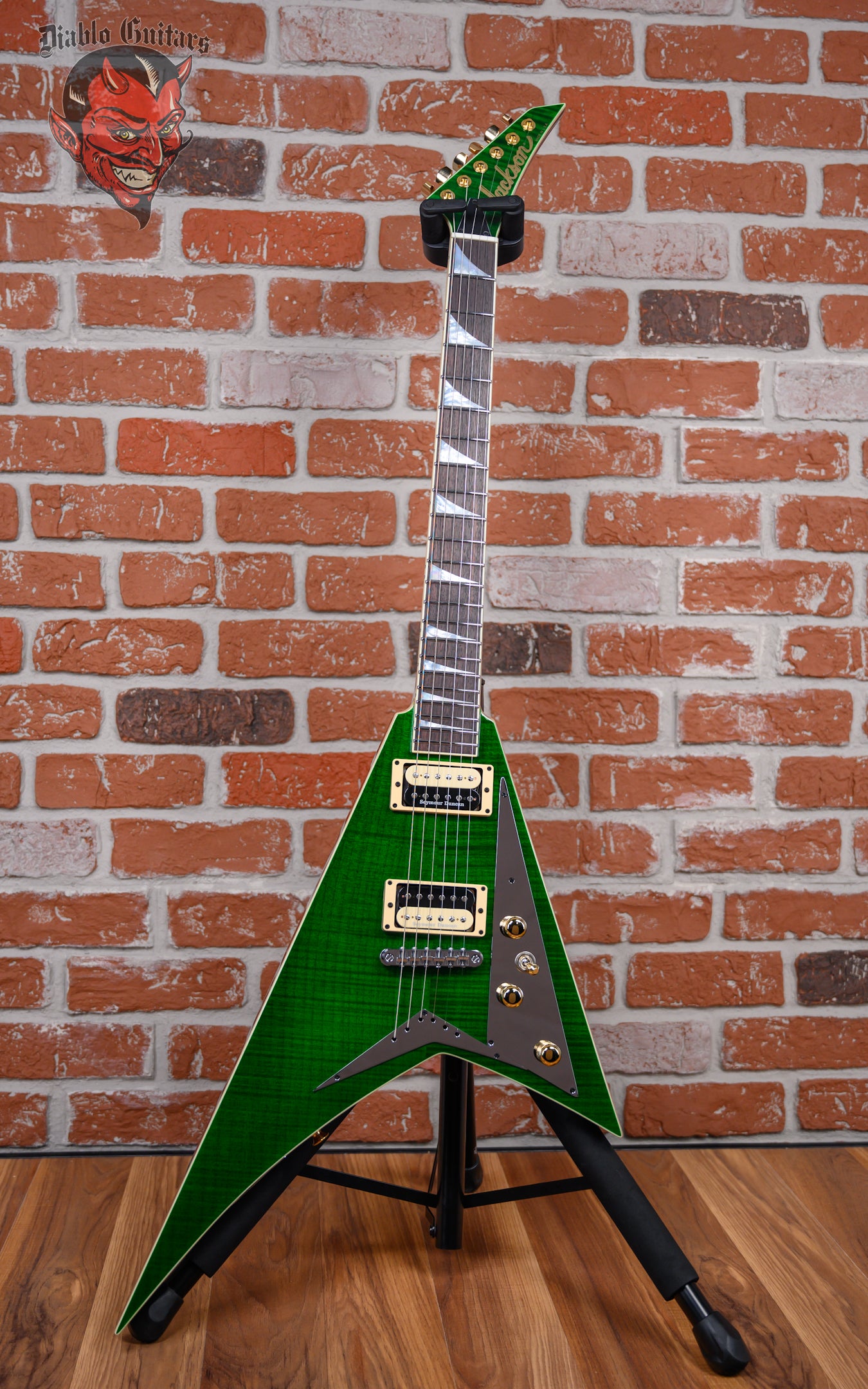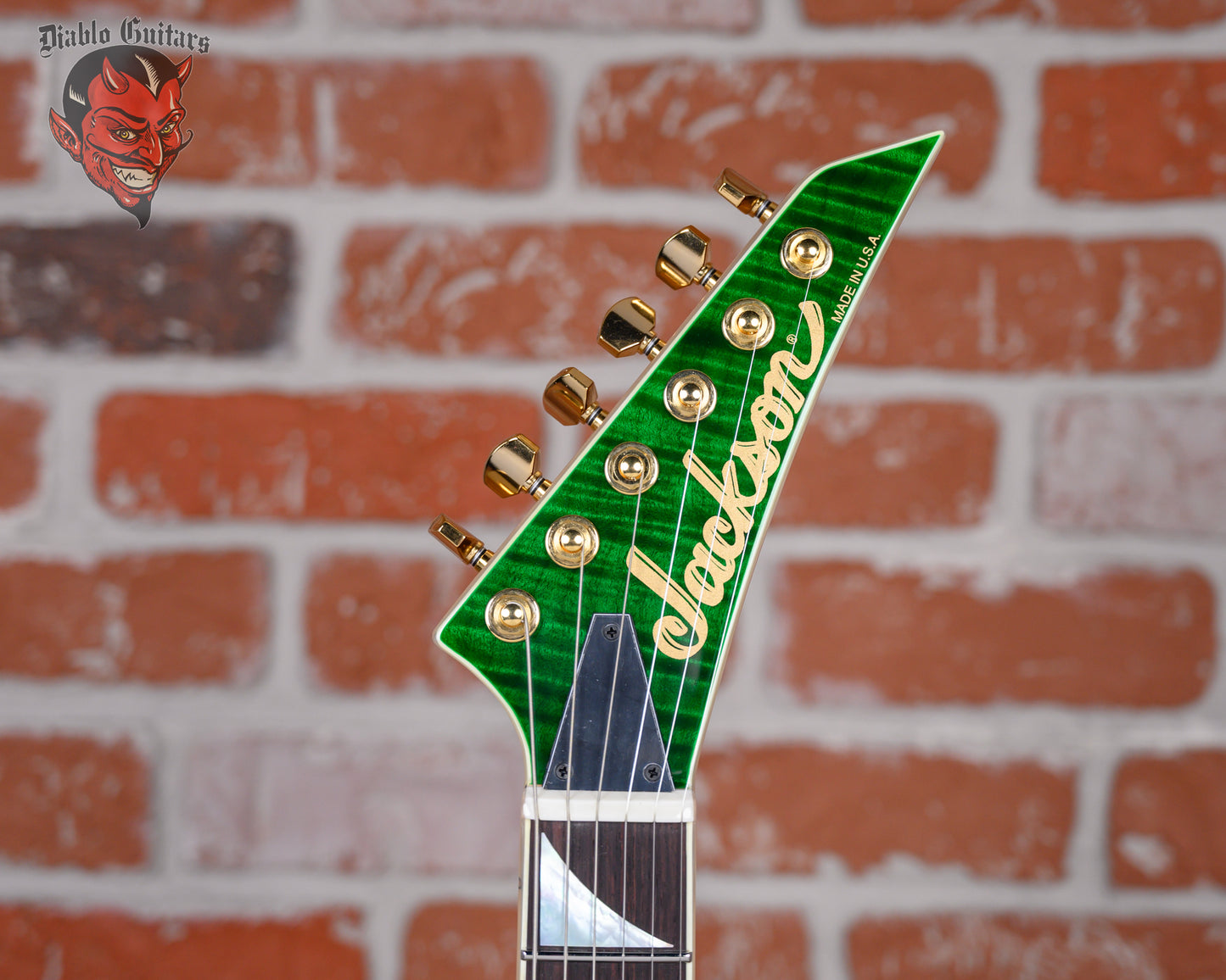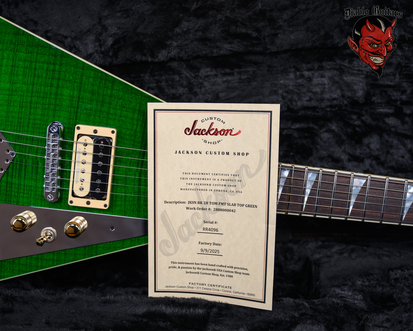New Jackson USA Custom Shop RR 2H TOM FMT MAH Rhoads Flame Maple Slab Top in Transparent Green finish made in 2025 with Original Hard Shell Case. This guitar features a solid mahogany body with a bound flamed maple top, mahogany neck-thru and bound rosewood fingerboard with a bound, color matched flame maple overlay headstock. Equipped with a Seymour Duncan SH2N jazz in the neck position and a Seymour Duncan SH-4 JB in the bridge position. Controlled by 1 volume, 2 tone pots and a 3-Way toggle switch. The 25.5" scale length neck has mother of pearl sharkfin inlays, luminlay side markers with 22 jumbo stainless steel frets on a compound 12"-16" radius with a standard neck profile. The hardware is comprised of chrome/Gold gotoh magnum Lock-Trad tuning machines with cloche heads, a bone nut, a gotoh Tune-o-matic string-thru body bridge and gold knurled dome knobs with a chrome pickguard.