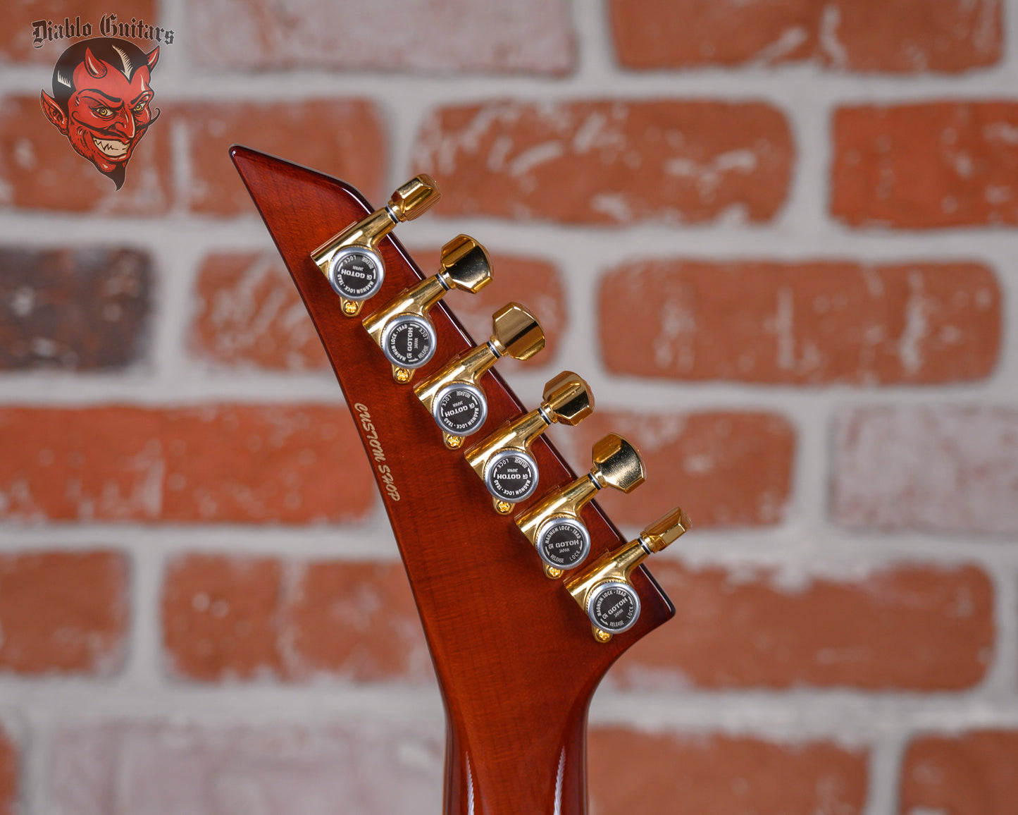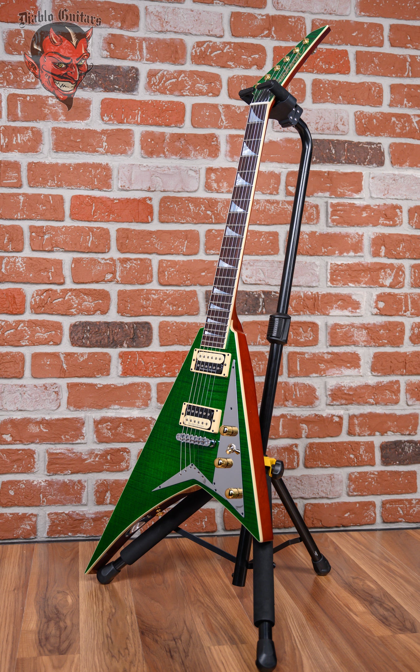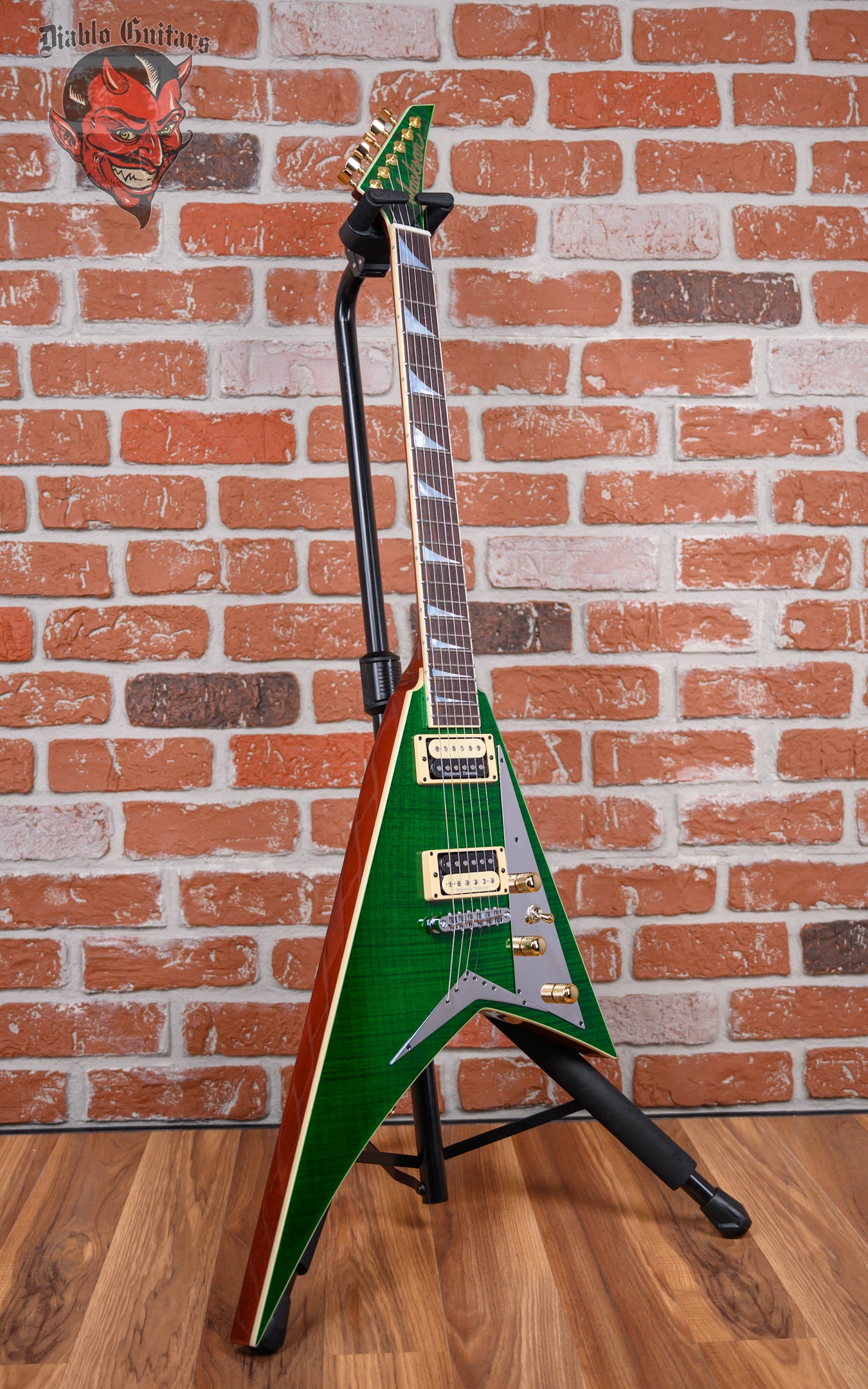 New Jackson USA Custom Shop RR 2H TOM FMT MAH Rhoads Flame Maple Slab Top in Transparent Green finish made in 2025 with Original Hard Shell Case. This guitar features a solid mahogany body with a bound flamed maple top, mahogany neck-thru and bound rosewood fingerboard with a bound, color matched flame maple overlay headstock. Equipped with a Seymour Duncan SH2N jazz in the neck position and a Seymour Duncan SH-4 JB in the bridge position. Controlled by 1 volume, 2 tone pots and a 3-Way toggle switch. The 25.5" scale length neck has mother of pearl sharkfin inlays, luminlay side markers with 22 jumbo stainless steel frets on a compound 12"-16" radius with a standard neck profile. The hardware is comprised of chrome/Gold gotoh magnum Lock-Trad tuning machines with cloche heads, a bone nut, a gotoh Tune-o-matic string-thru body bridge and gold knurled dome knobs with a chrome pickguard.
