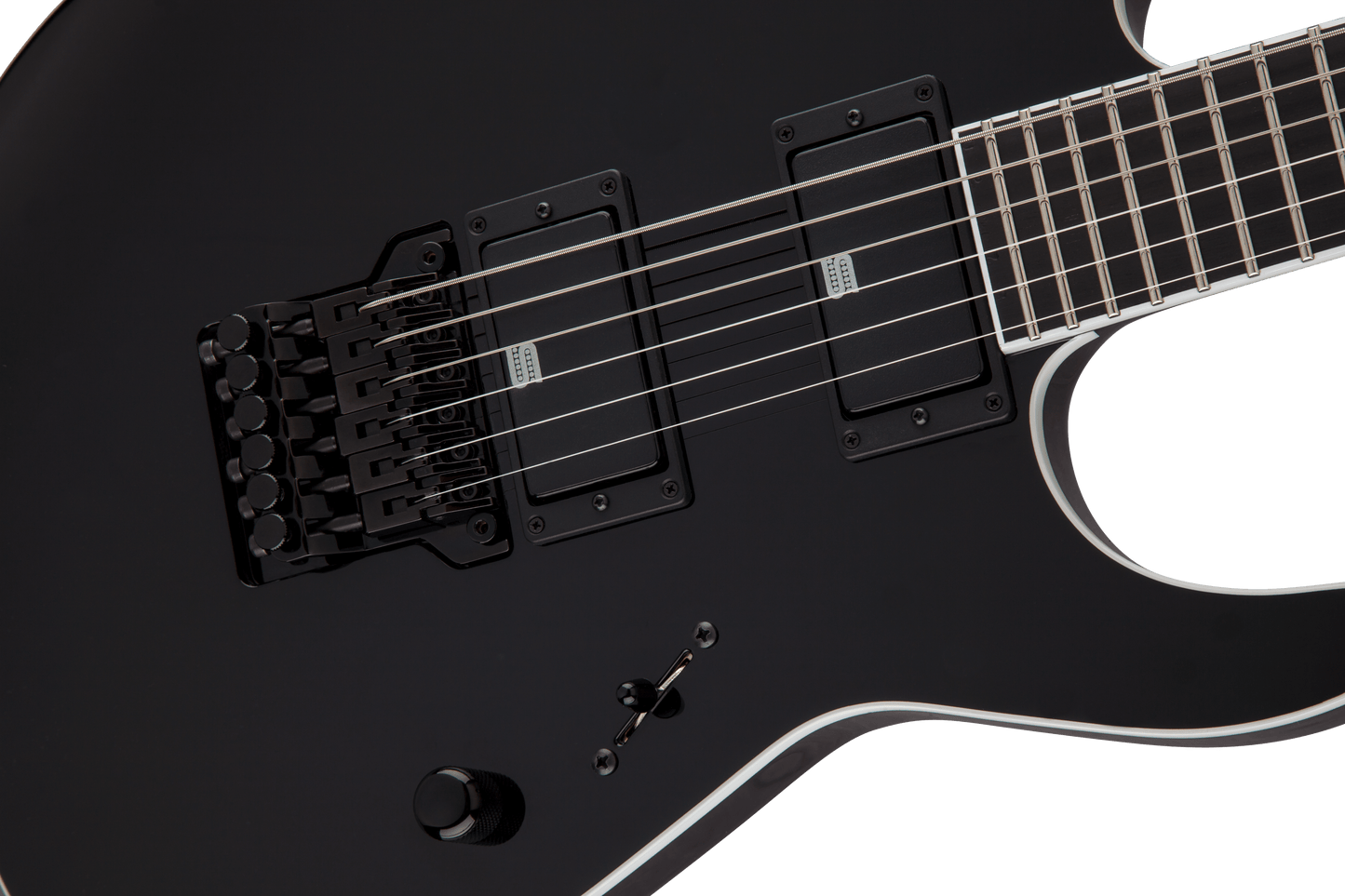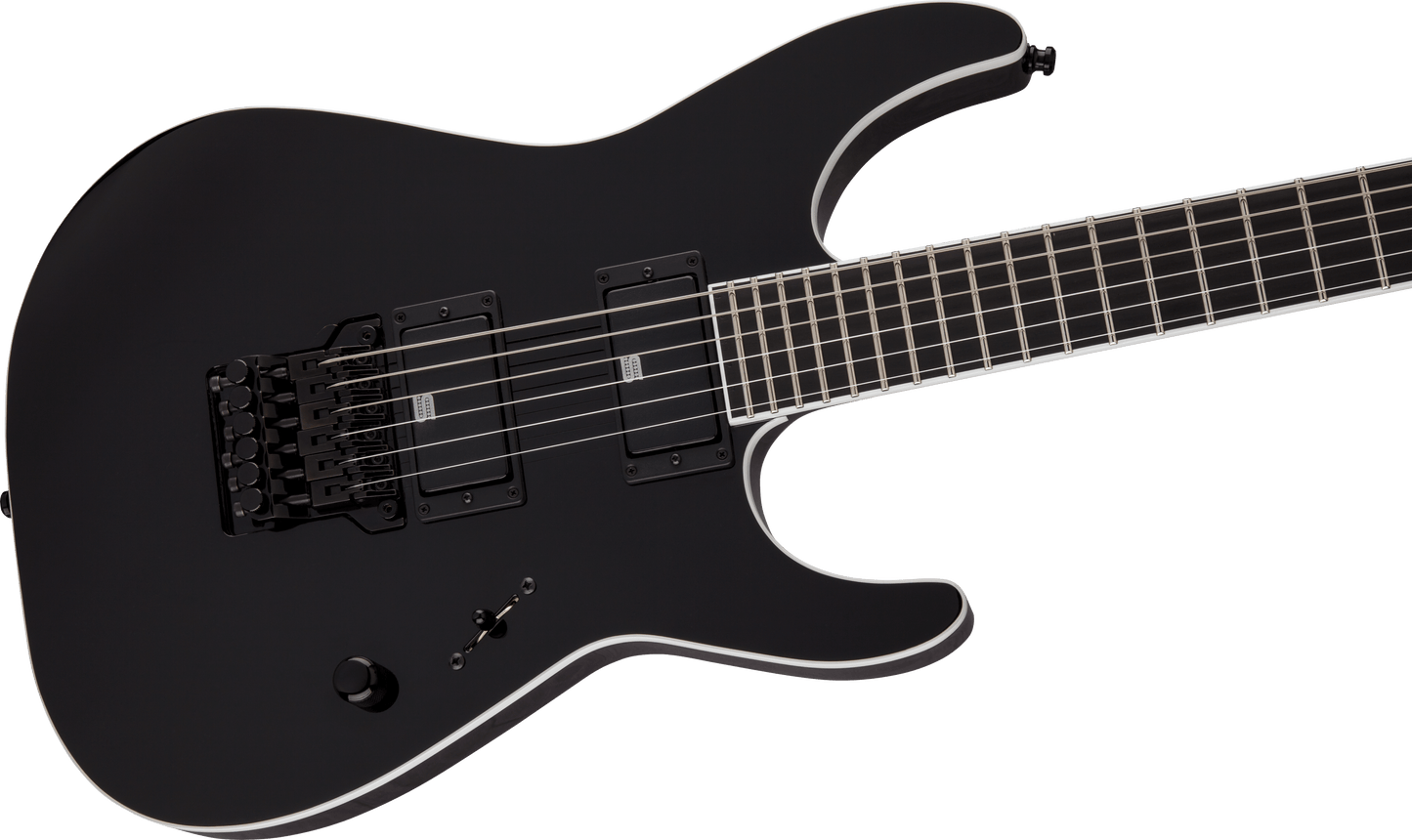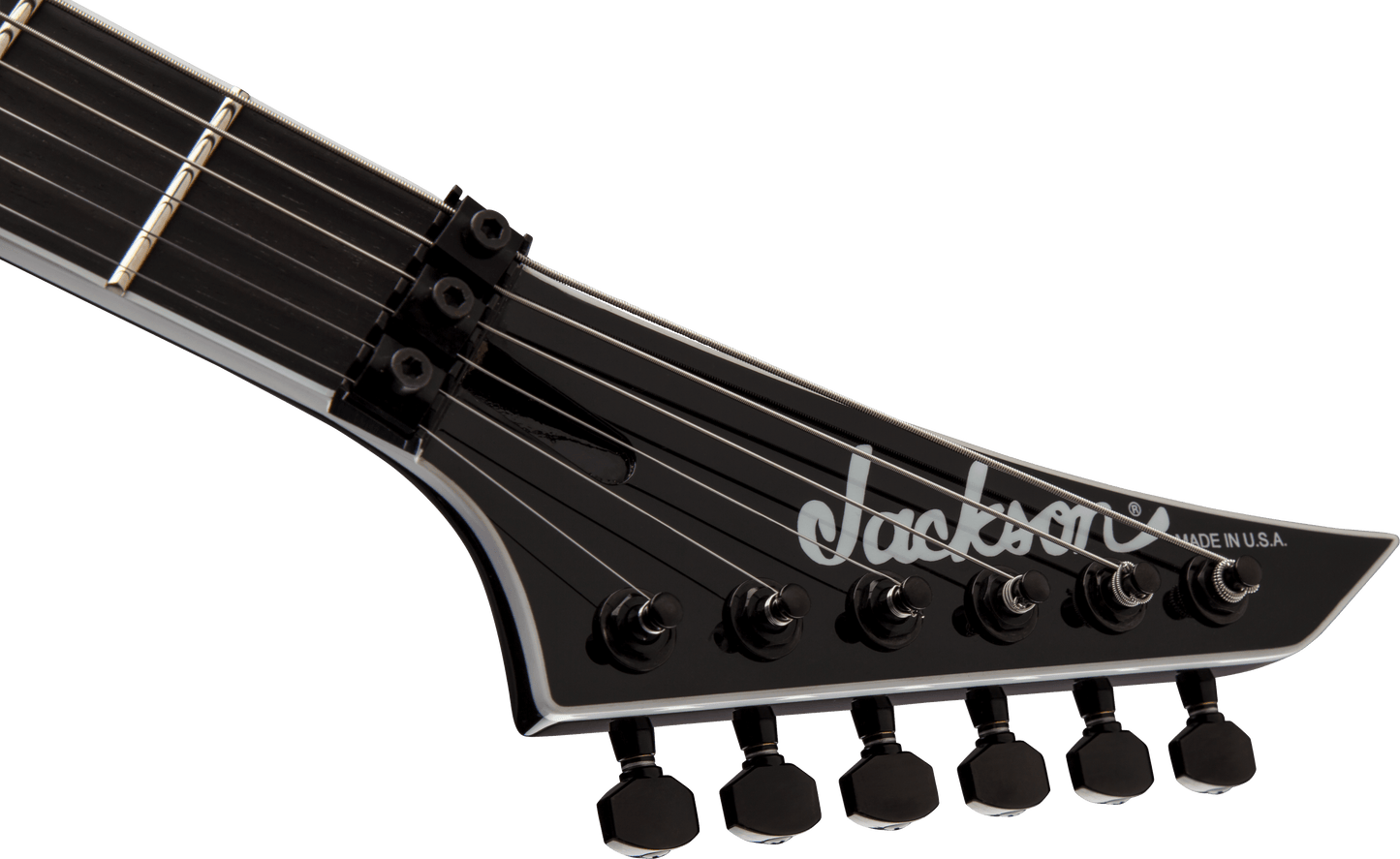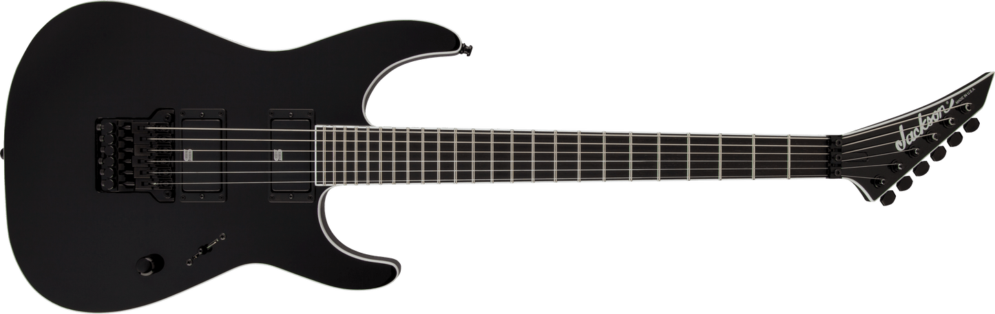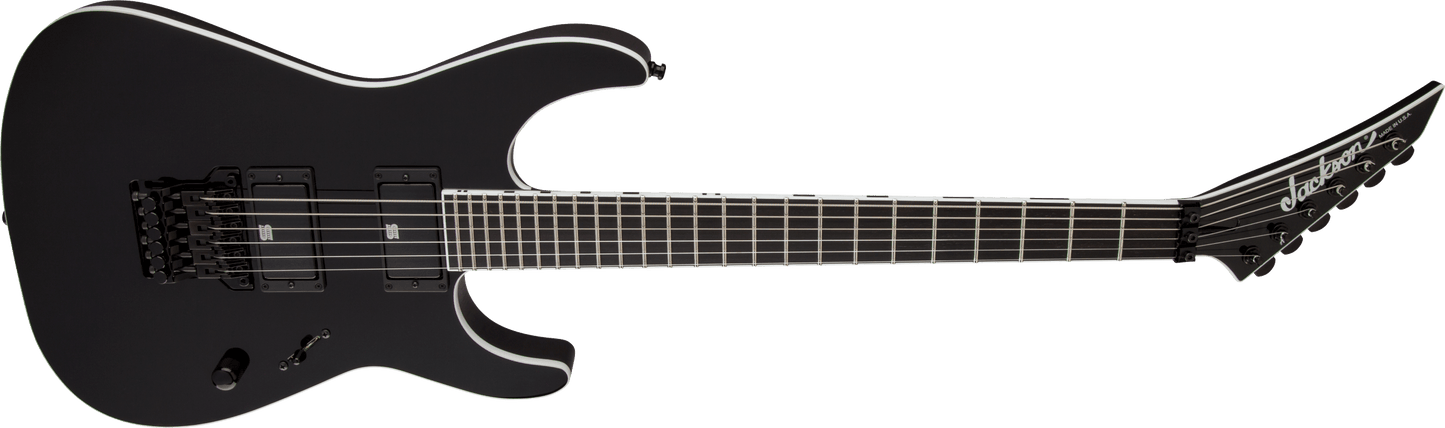 Jackson USA Signature Mick Thomson Soloist in Black finish made in 2018 with Original Hard Shell Case. This guitar features a bound solid mahogany body, 3-Piece maple neck-thru and bound ebony fingerboard with a reverse, bound headstock. Equipped with a pair of Seymour Duncan Mick Thomson Signature® Blackouts® AHB-3S in the neck and bridge position. Controlled by one master volume pot and a 3-Way blade switch. The 25.5" scale length neck has no inlays, rectangle side markers with 24 jumbo frets on a compound 12"-16" radius with a speed profile. The hardware is comprised of Black Jackson Sealed Diecast tuning machines with cloche heads, a Floyd Rose Locking nut, a Jackson MTB HT6 bridge and Black knurled dome knob.