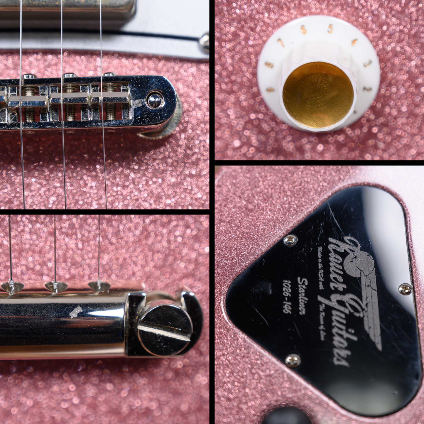 Kauer Starliner Express in Brilliant Pink finish made in 2022 with Gigbag. This guitar features a bound solid Spanish mahogany body, Spanish mahogany neck and bound wenge fingerboard with a bound headstock. Equipped with a set of aged nickel Wolfetone KauerBucker humbuckers in the neck and bridge positions. Controlled by 1 volume pot, 1 tone pot and a 3-way toggle switch. The 24.75" scale length neck has pearloid keystones inlays and black side markers with 22 Jescar 47095 nickel silver frets on a 12" radius with a C profile. The hardware is comprised of chrome Sperzel Open Back locking tuning machines with keystone heads, a bone nut, a Tone Pros Tune-o-Matic bridge & locking stoptail and white top hat reflector knobs with a silver plexi pickguard.