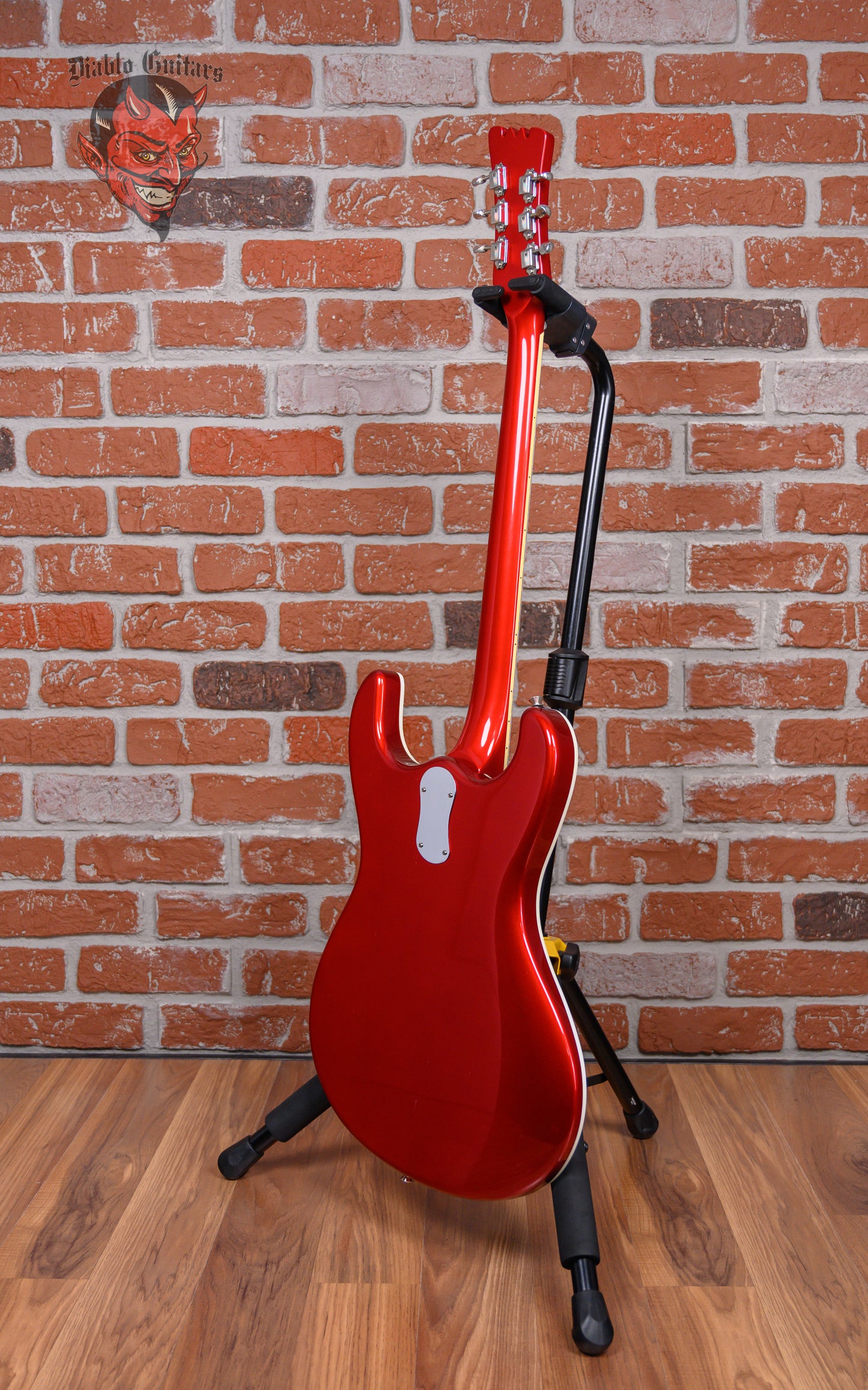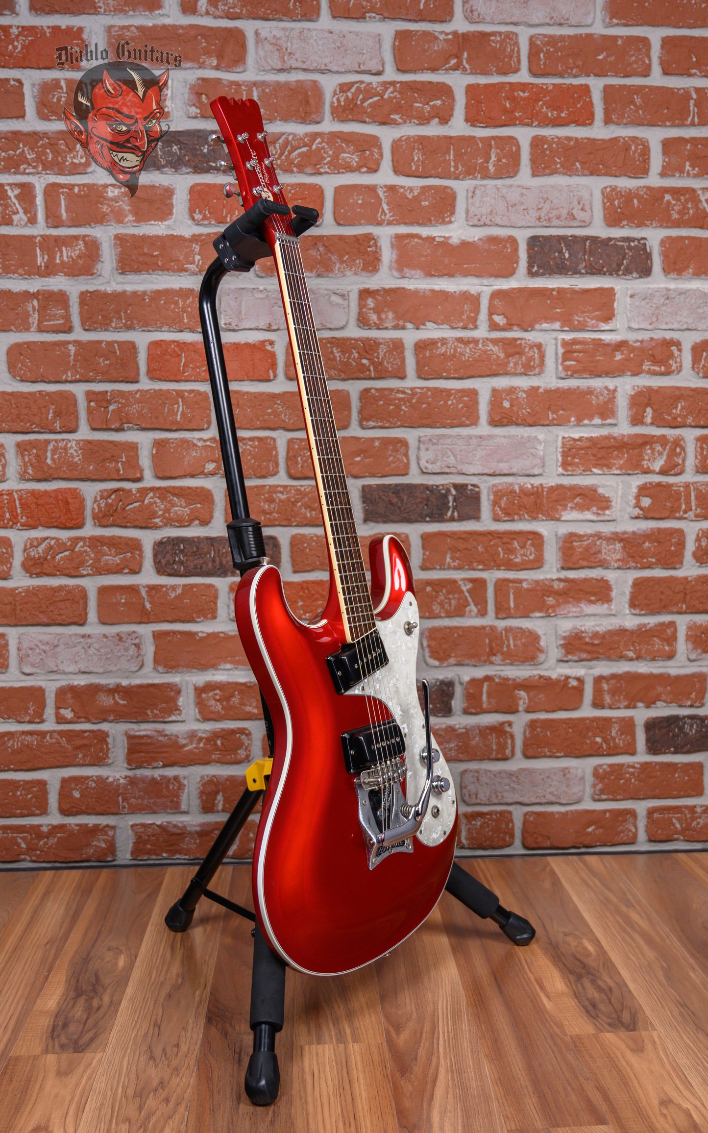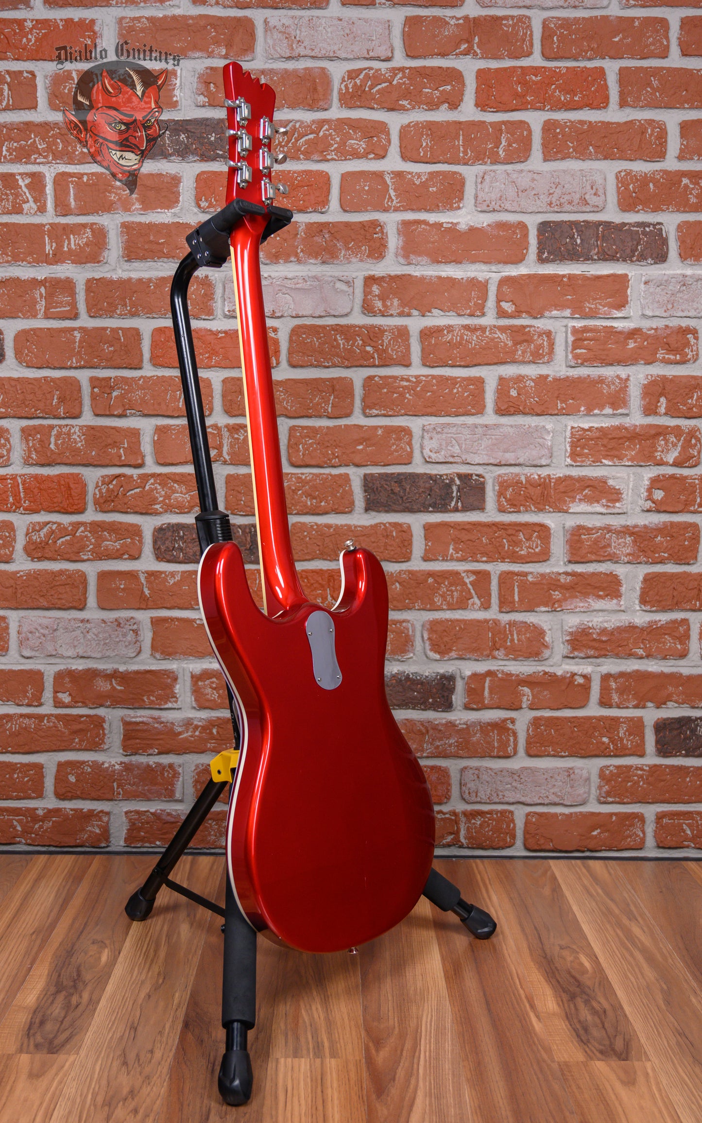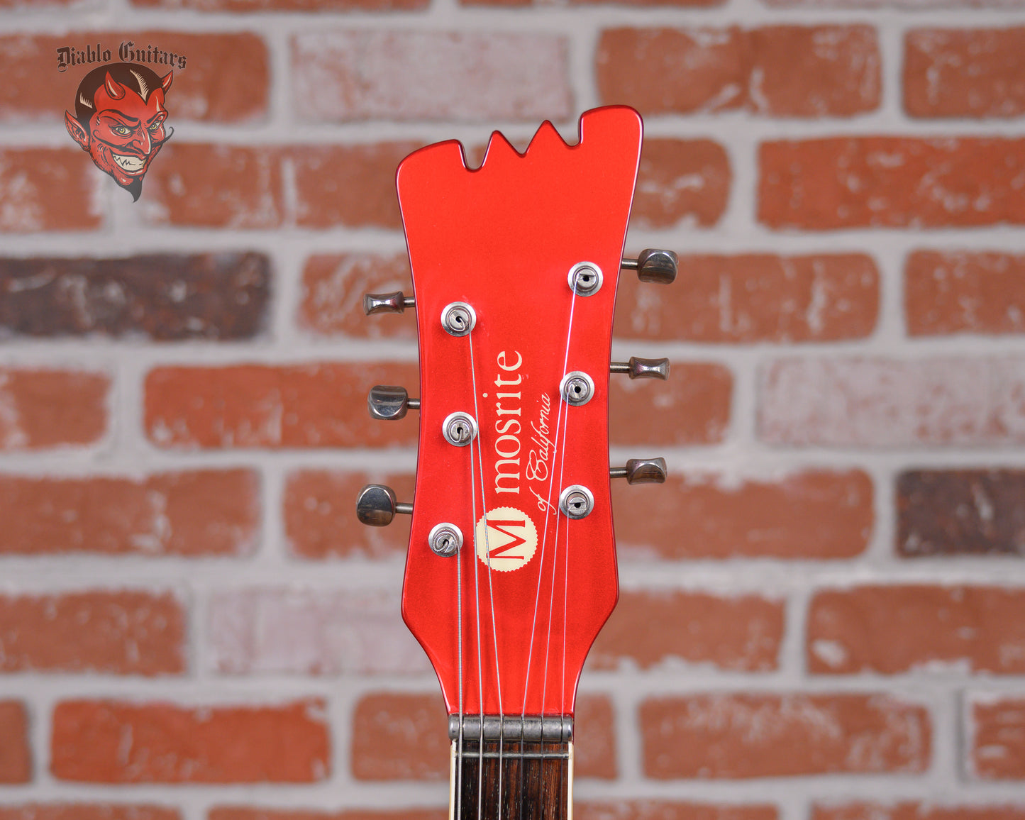 Mosrite USA Ventures Model '64 in Candy Apple Red finish made in 2014 with Original Hard Shell Case. This guitar features a solid bound basswood body, maple neck and bound rosewood fingerboard with a color matched headstock. Equipped with a set of Mosrite Dana Moseley Custom Wound single coil pickups in the neck and bridge positions. Controlled by 1 volume pot, 1 tone pot and a 3-way toggle switch. The 24.75" scale length neck has white dot inlays and black side markers with 22 vintage spec frets on a 9.5" radius with a medium C profile. The hardware is comprised of chrome Kluson-style vintage tuning machines with oval heads, an aluminum nut w/ zero fret, a Mosrite Vibramute Vibrato bridge and aluminum top hat knobs with a 3-ply pearloid pickguard.