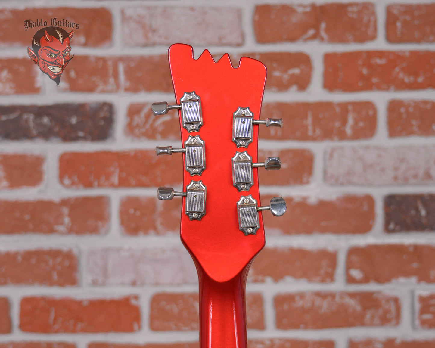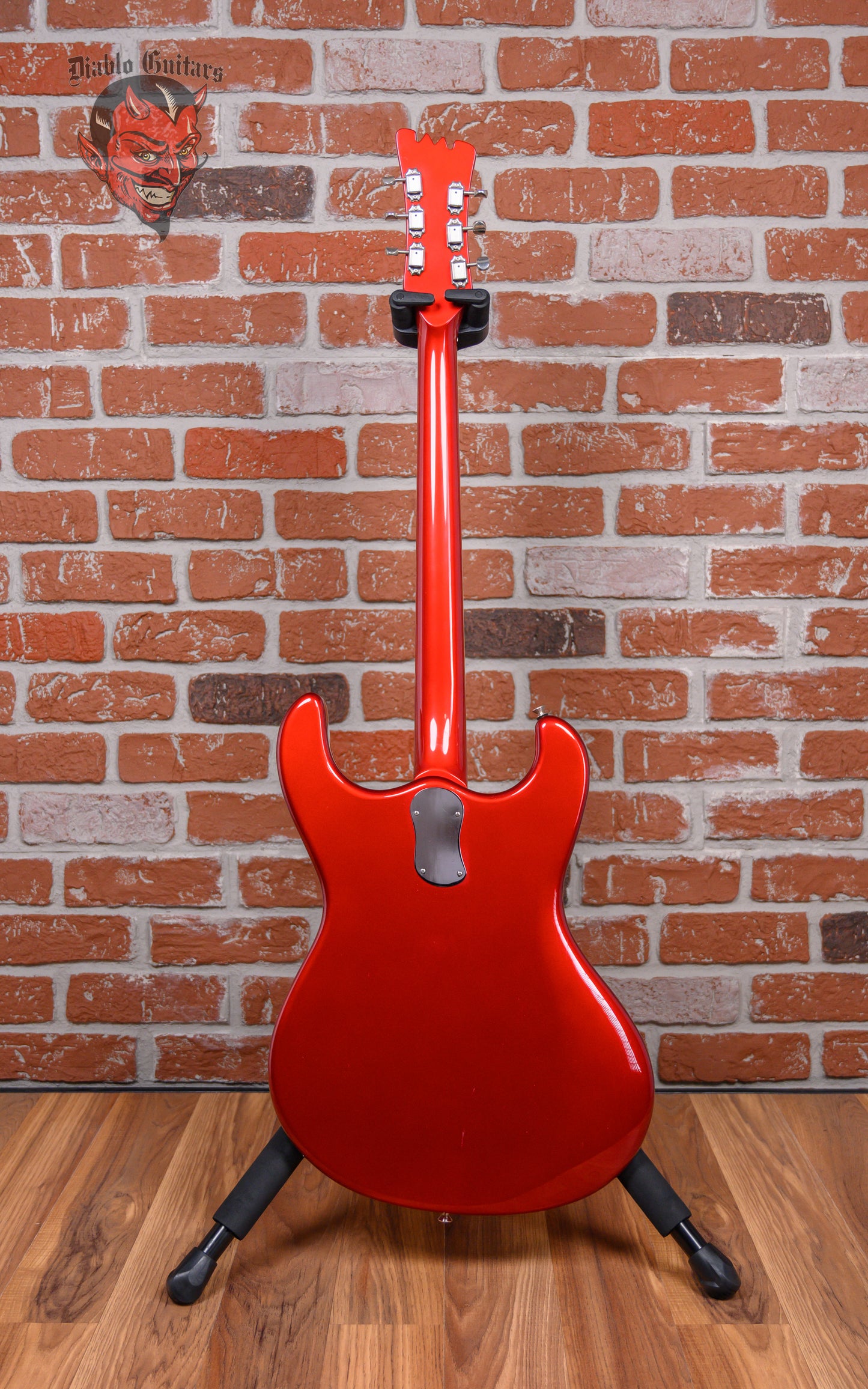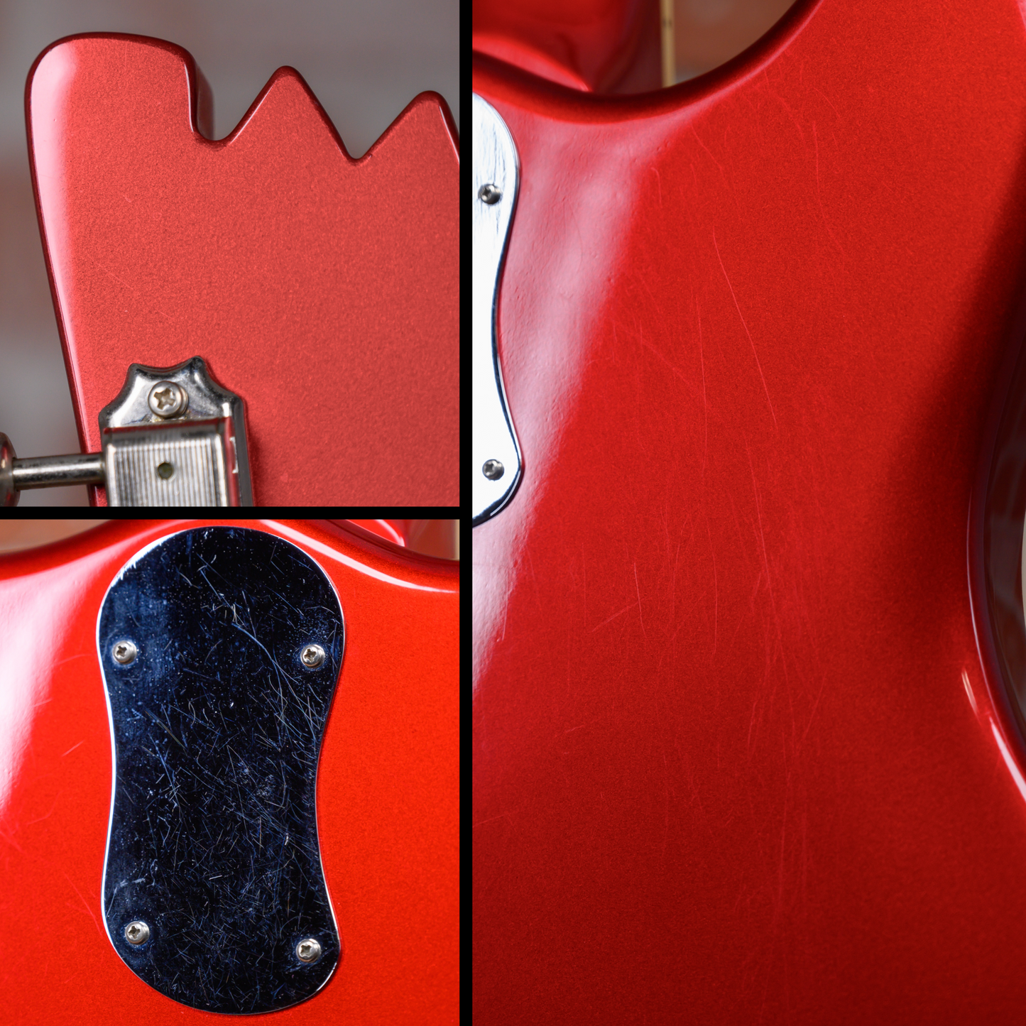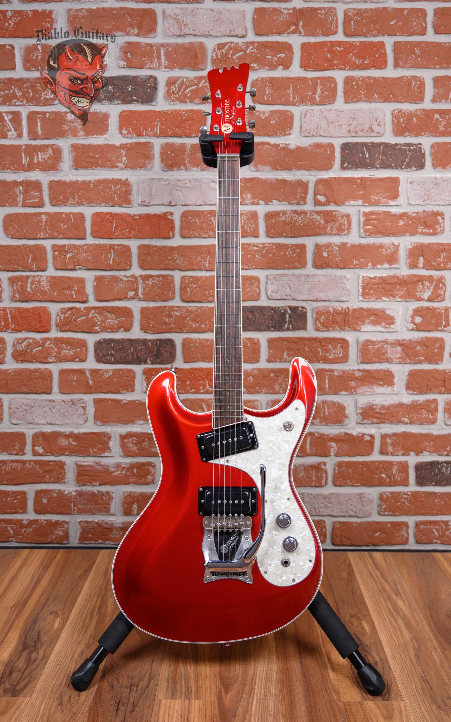 Mosrite USA Ventures Model '64 in Candy Apple Red finish made in 2014 with Original Hard Shell Case. This guitar features a solid bound basswood body, maple neck and bound rosewood fingerboard with a color matched headstock. Equipped with a set of Mosrite Dana Moseley Custom Wound single coil pickups in the neck and bridge positions. Controlled by 1 volume pot, 1 tone pot and a 3-way toggle switch. The 24.75" scale length neck has white dot inlays and black side markers with 22 vintage spec frets on a 9.5" radius with a medium C profile. The hardware is comprised of chrome Kluson-style vintage tuning machines with oval heads, an aluminum nut w/ zero fret, a Mosrite Vibramute Vibrato bridge and aluminum top hat knobs with a 3-ply pearloid pickguard.