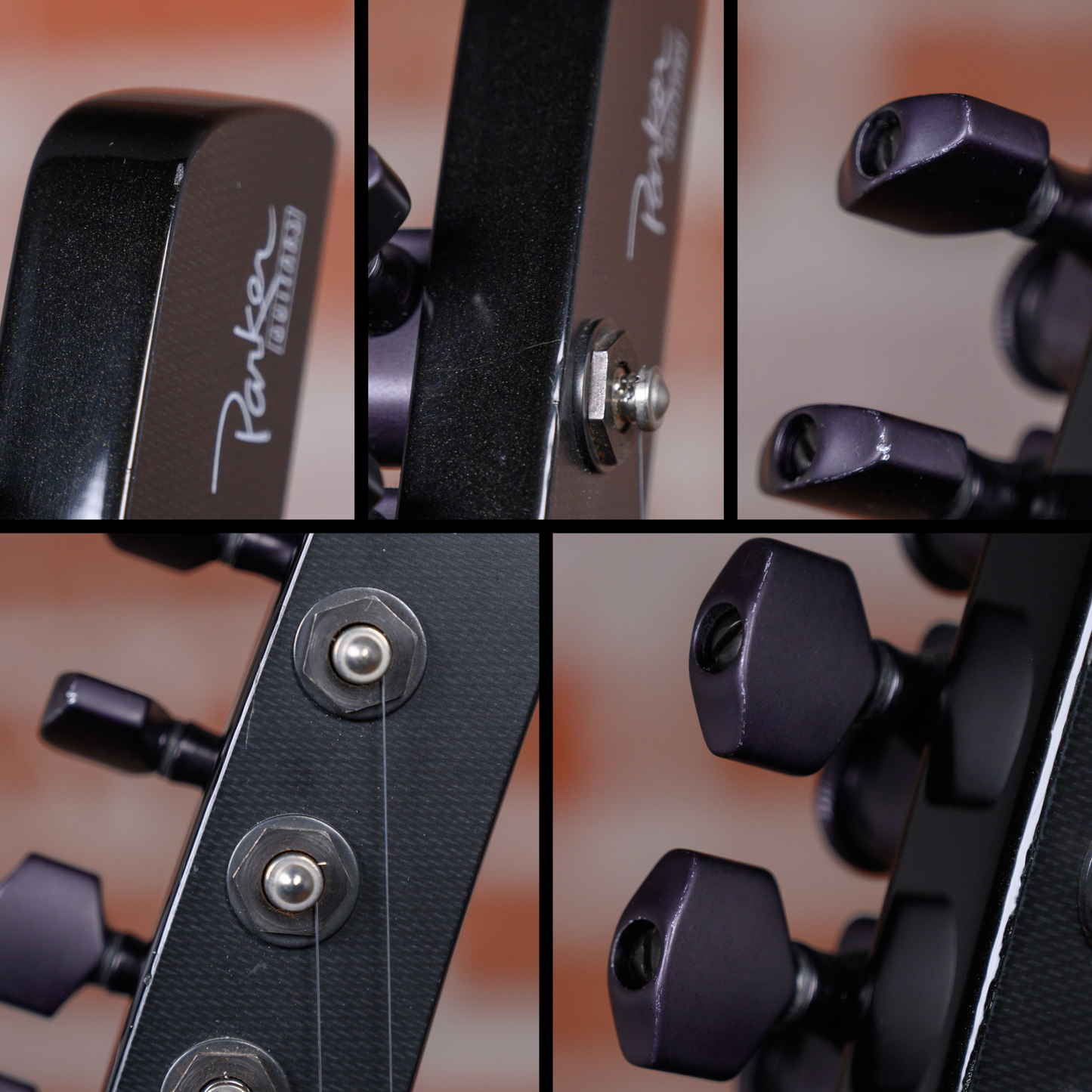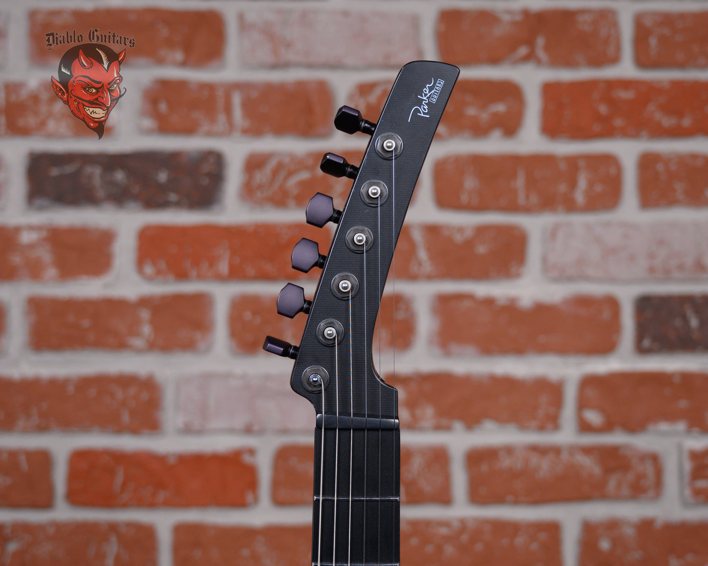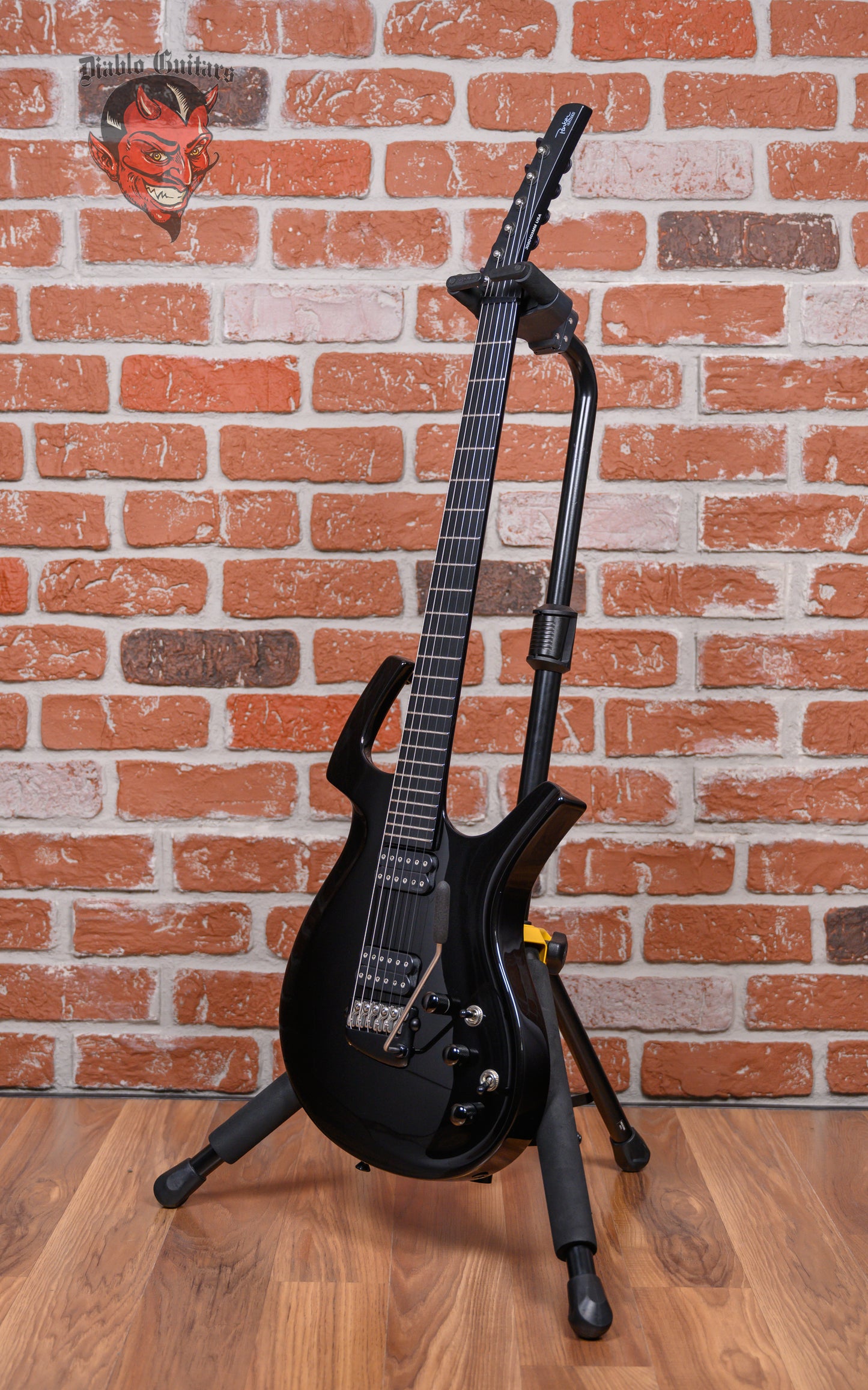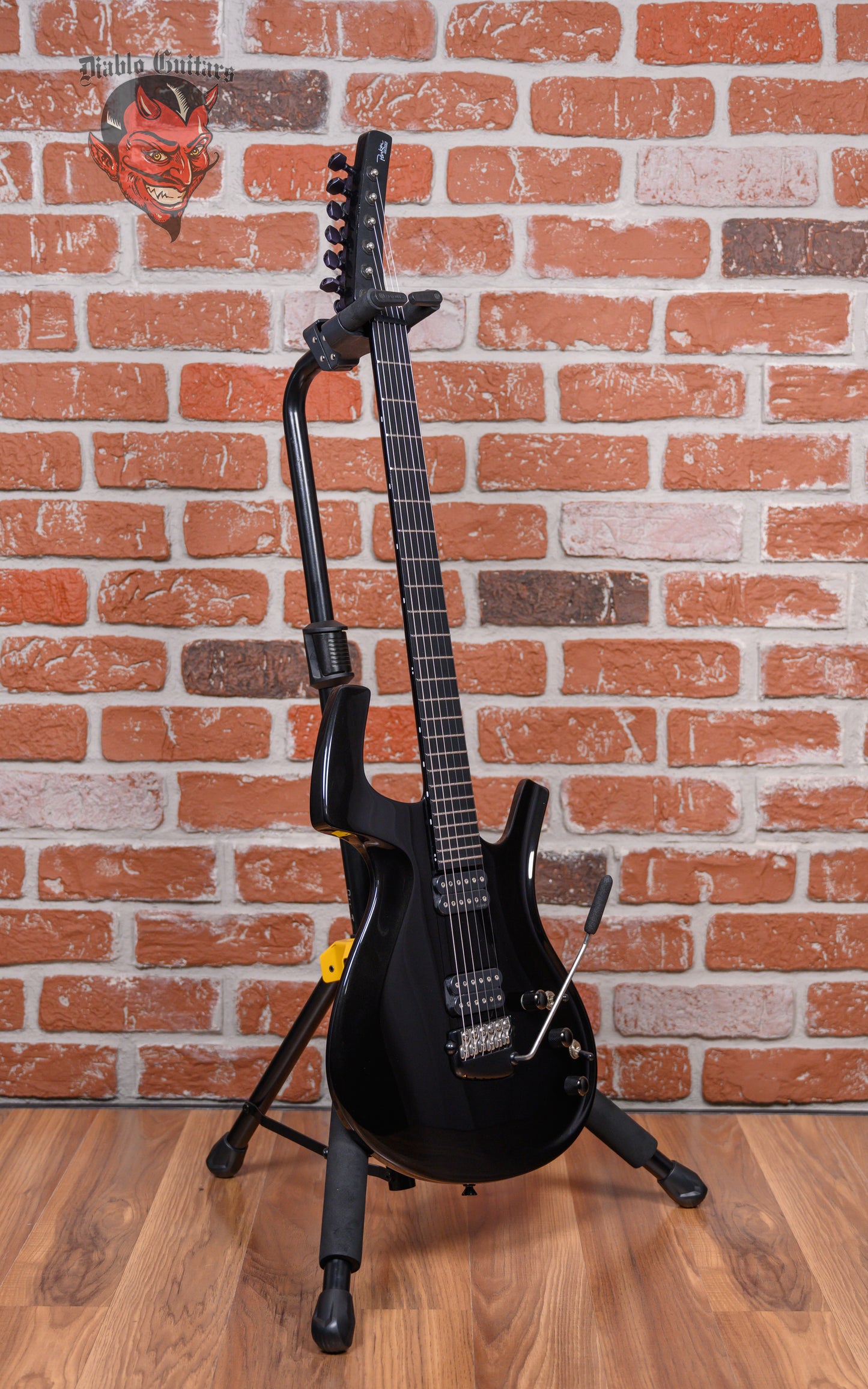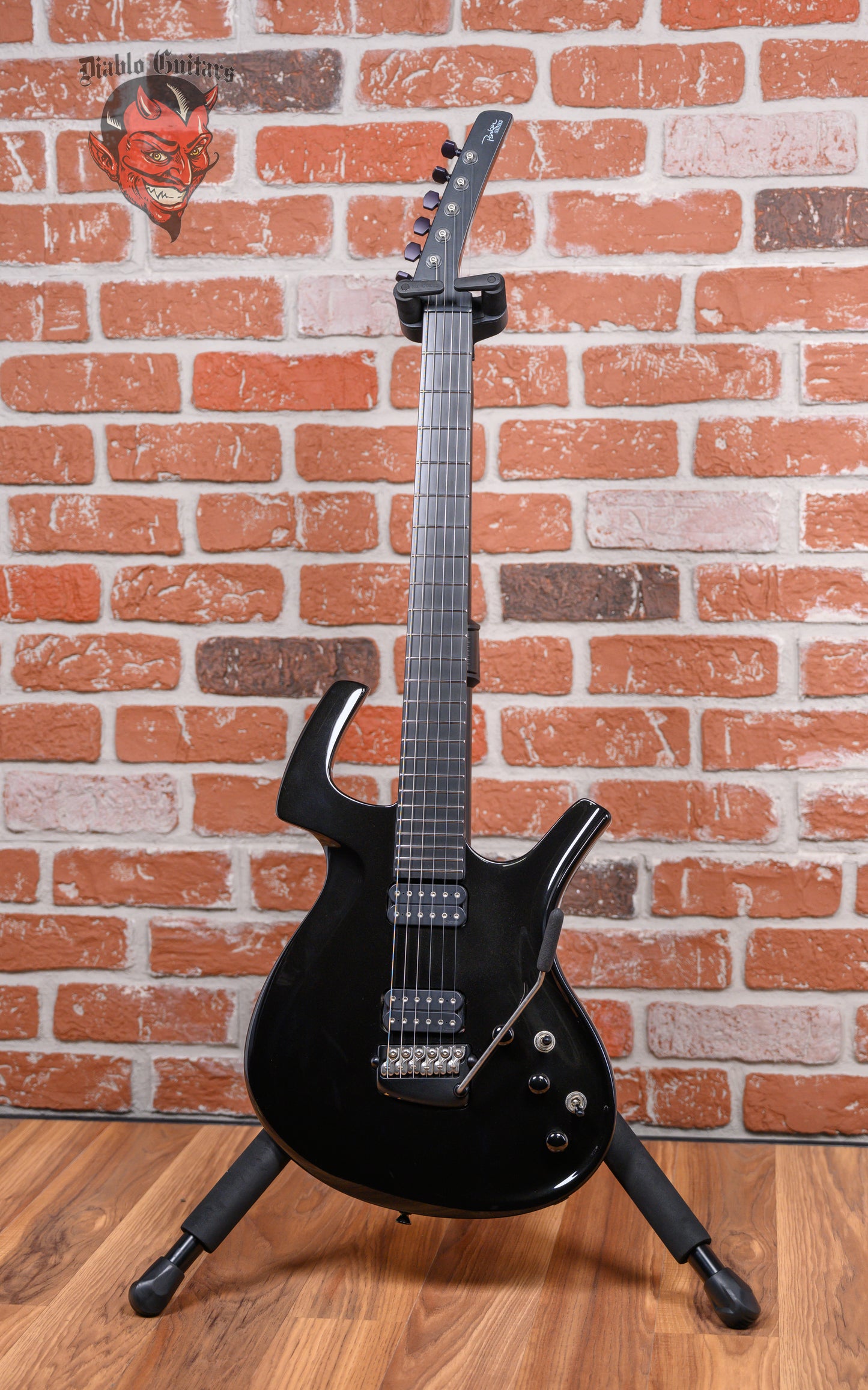 Parker Fly Mojo in Dusty Black finish made in 2003 with Original Hard Shell Case. This guitar features a solid mahogany body, mahogany neck and a carbon-glass-epoxy composite fingerboard. Equipped with a custom-wound DiMarzio PHWP1 in the neck position, a custom-wound DiMarzio PHWP2 in the bridge position and a Fishman 6-Element Piezo pickup. Controlled by 1 master mag volume, 1 mag tone with push/pull coil splitting, 1 piezo volume pot, a 3-way pickup toggle switch and a mag/piezo 3-way toggle switch with a Graph Tech Piezo Pre-Amp. The 25.5" scale length neck has no inlays and white side markers with 24 medium stainless steel frets on a compound 10"-13" radius with a slim C profile. The hardware is comprised of satin black Sperzel Trim-Lok tuning machines with cloche heads, a Graph Tech Black TUSQ XL nut, a Parker custom-cast aluminum vibrato bridge w/ stainless steel saddles and black knurled dome knobs.