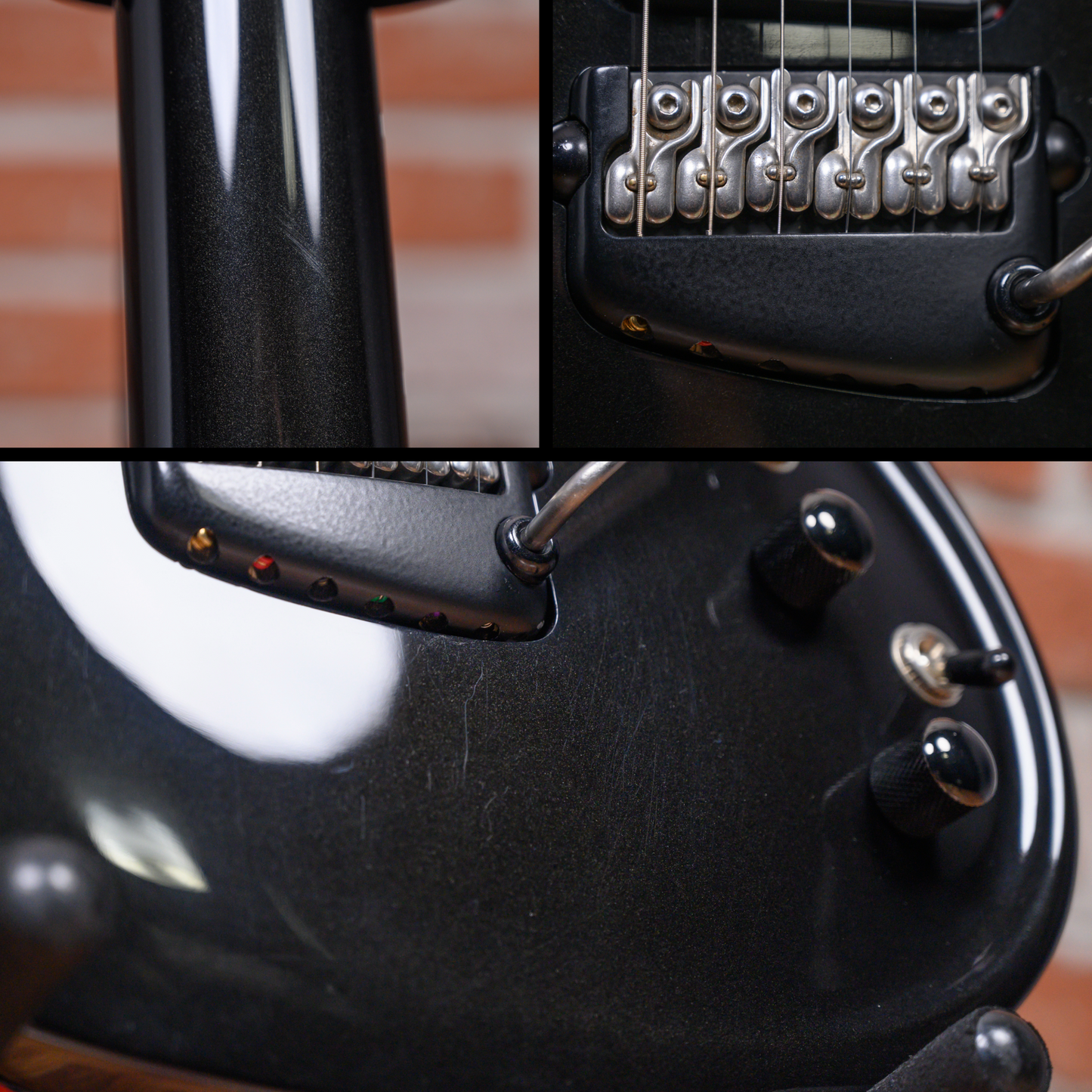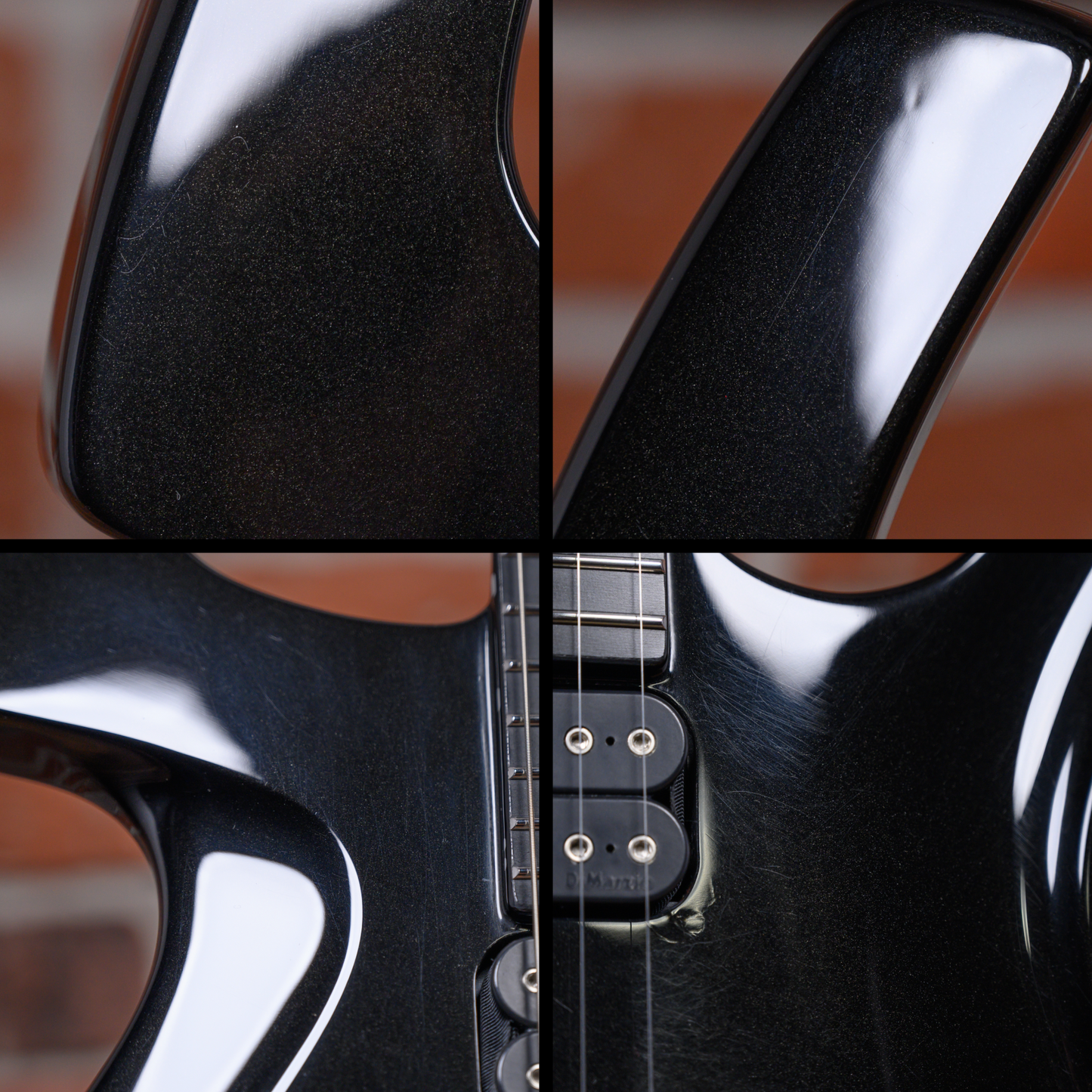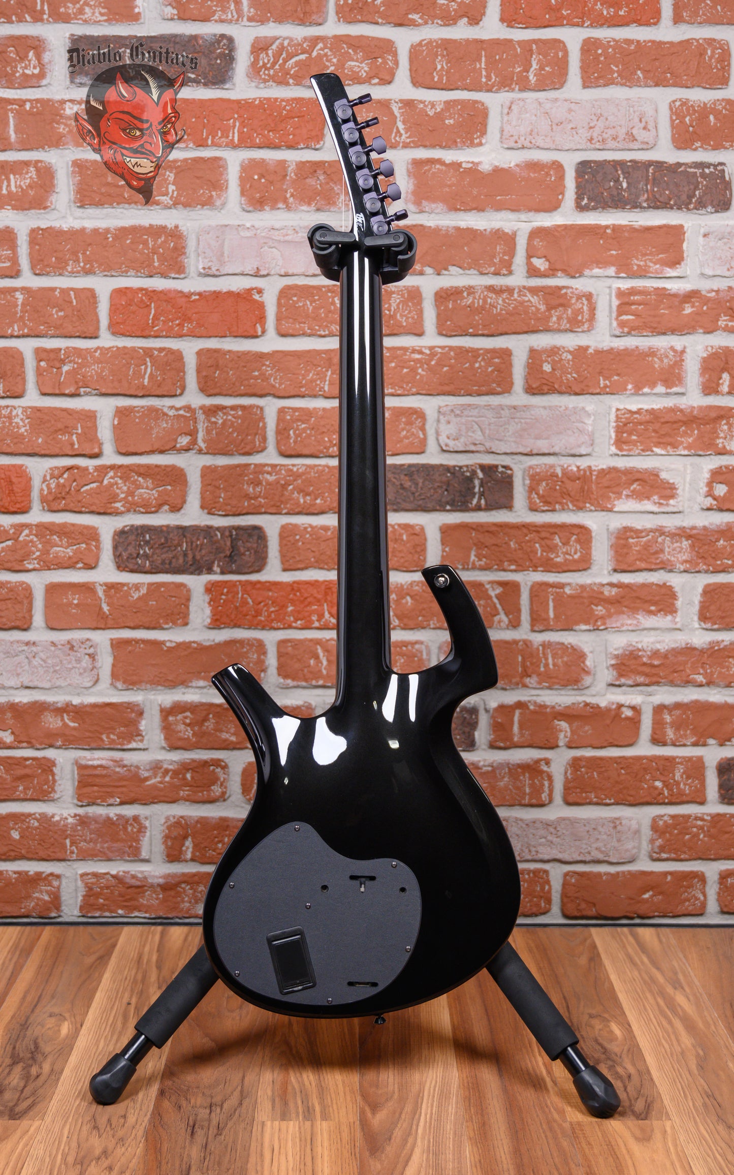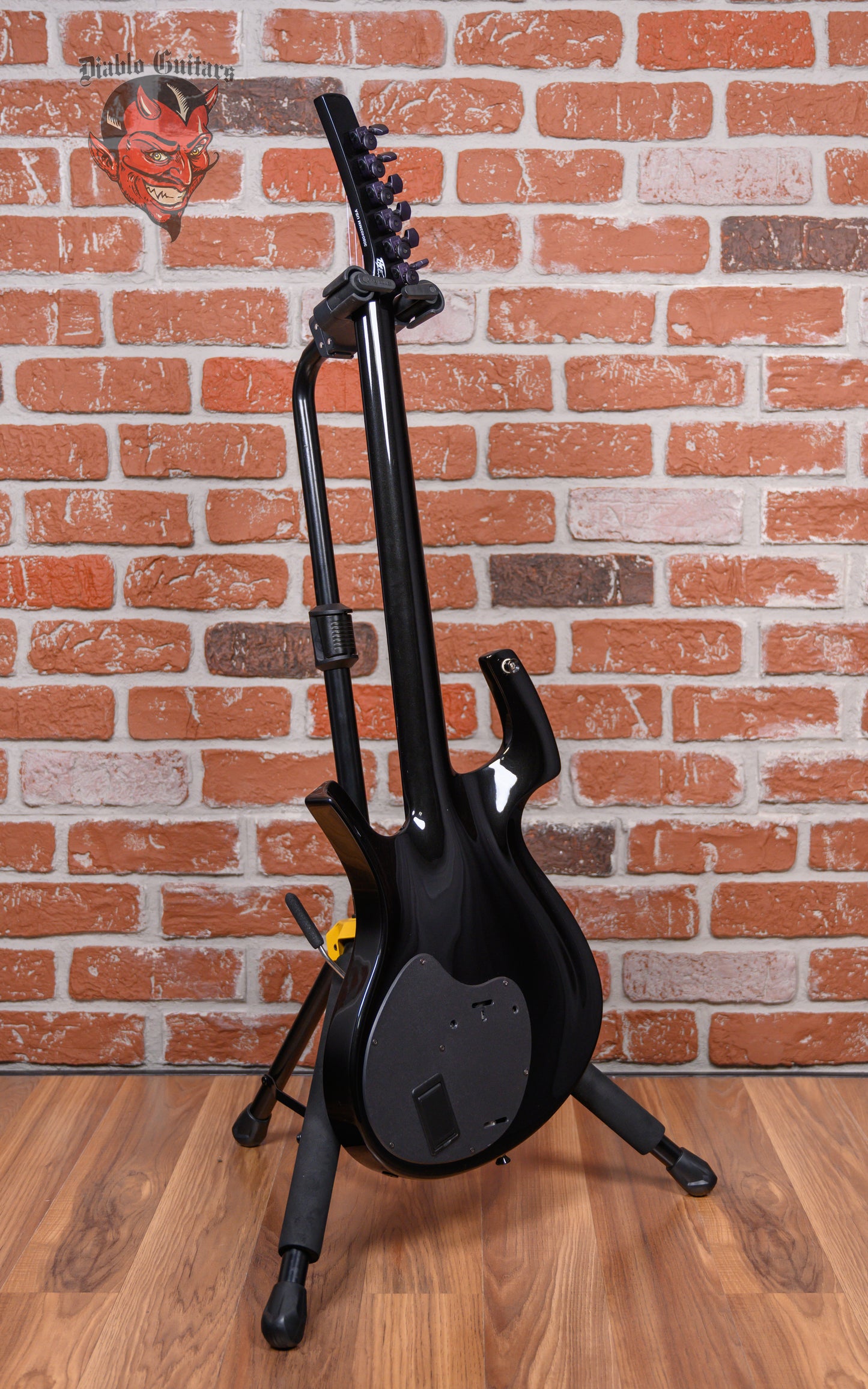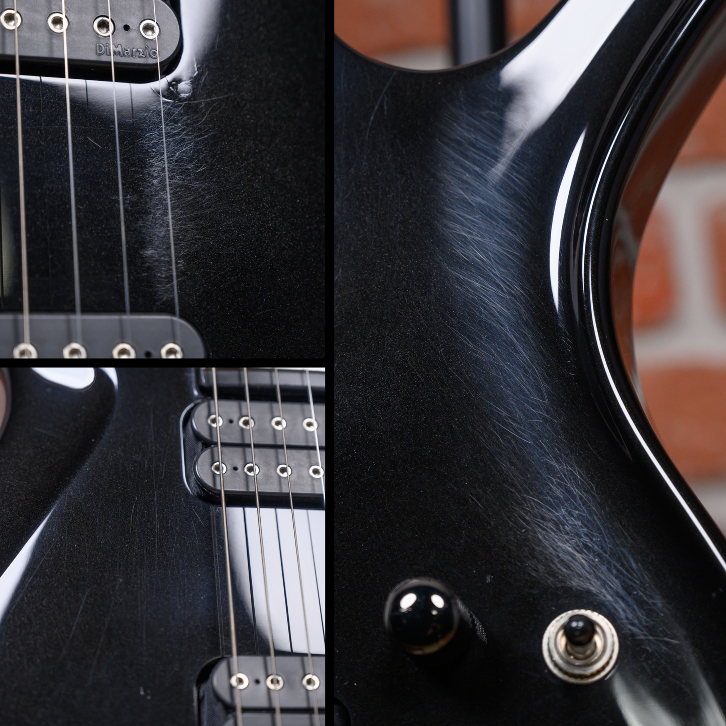 Parker Fly Mojo in Dusty Black finish made in 2003 with Original Hard Shell Case. This guitar features a solid mahogany body, mahogany neck and a carbon-glass-epoxy composite fingerboard. Equipped with a custom-wound DiMarzio PHWP1 in the neck position, a custom-wound DiMarzio PHWP2 in the bridge position and a Fishman 6-Element Piezo pickup. Controlled by 1 master mag volume, 1 mag tone with push/pull coil splitting, 1 piezo volume pot, a 3-way pickup toggle switch and a mag/piezo 3-way toggle switch with a Graph Tech Piezo Pre-Amp. The 25.5" scale length neck has no inlays and white side markers with 24 medium stainless steel frets on a compound 10"-13" radius with a slim C profile. The hardware is comprised of satin black Sperzel Trim-Lok tuning machines with cloche heads, a Graph Tech Black TUSQ XL nut, a Parker custom-cast aluminum vibrato bridge w/ stainless steel saddles and black knurled dome knobs.