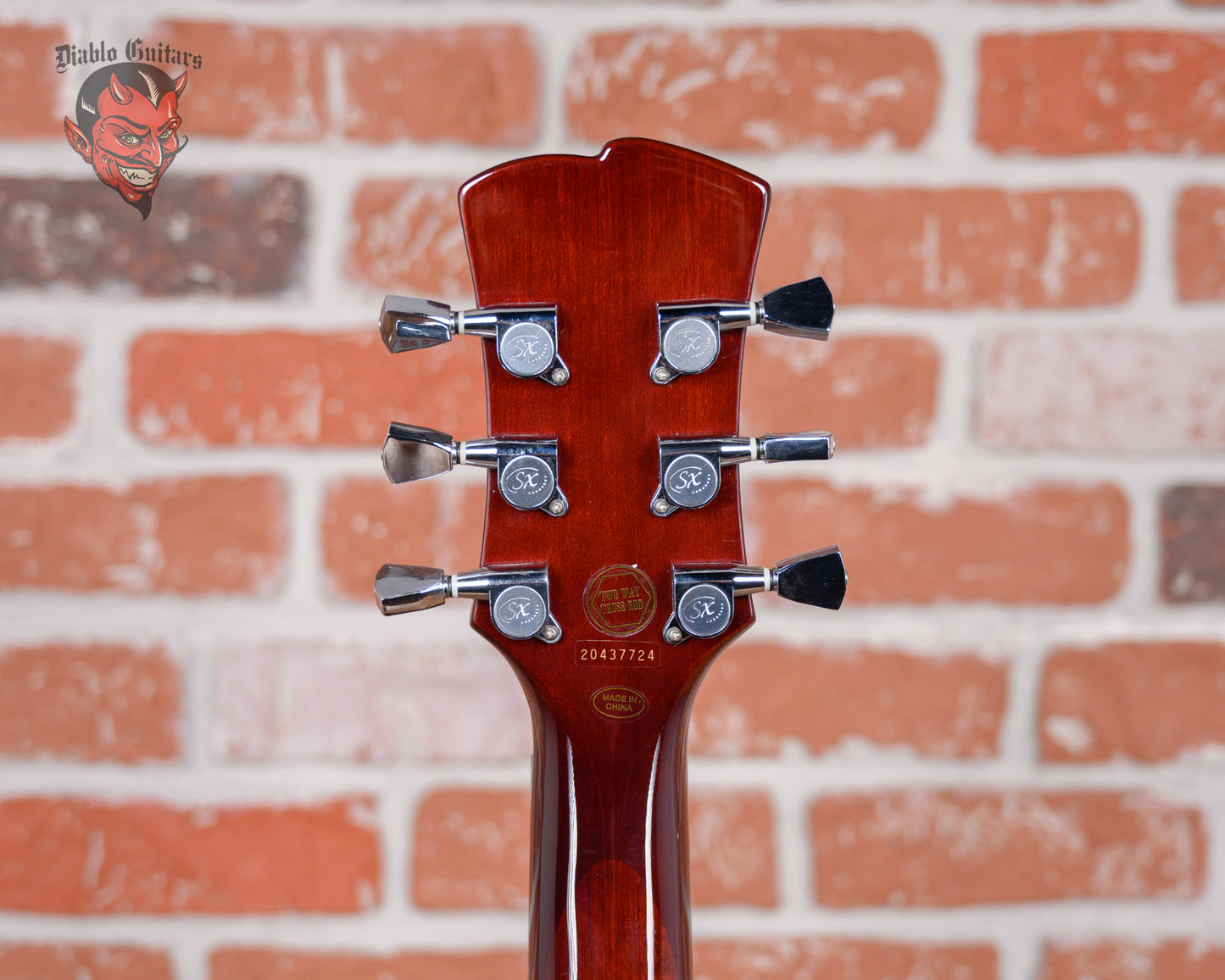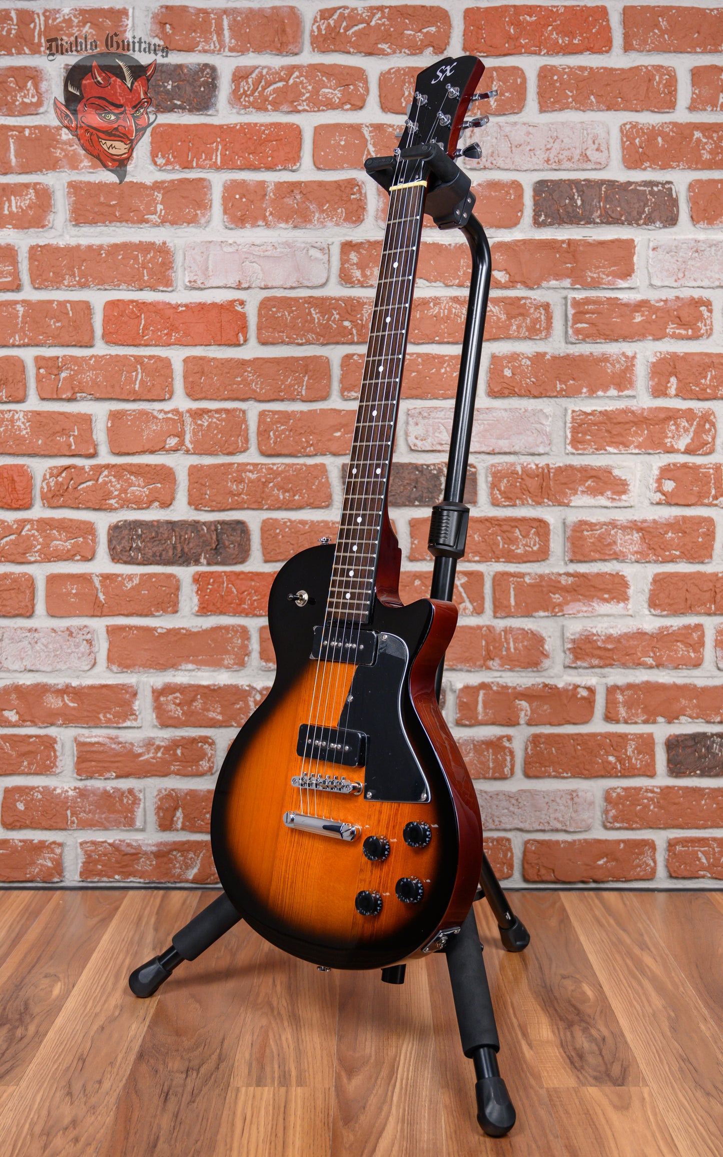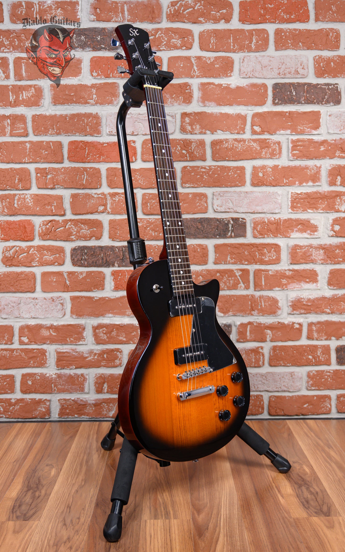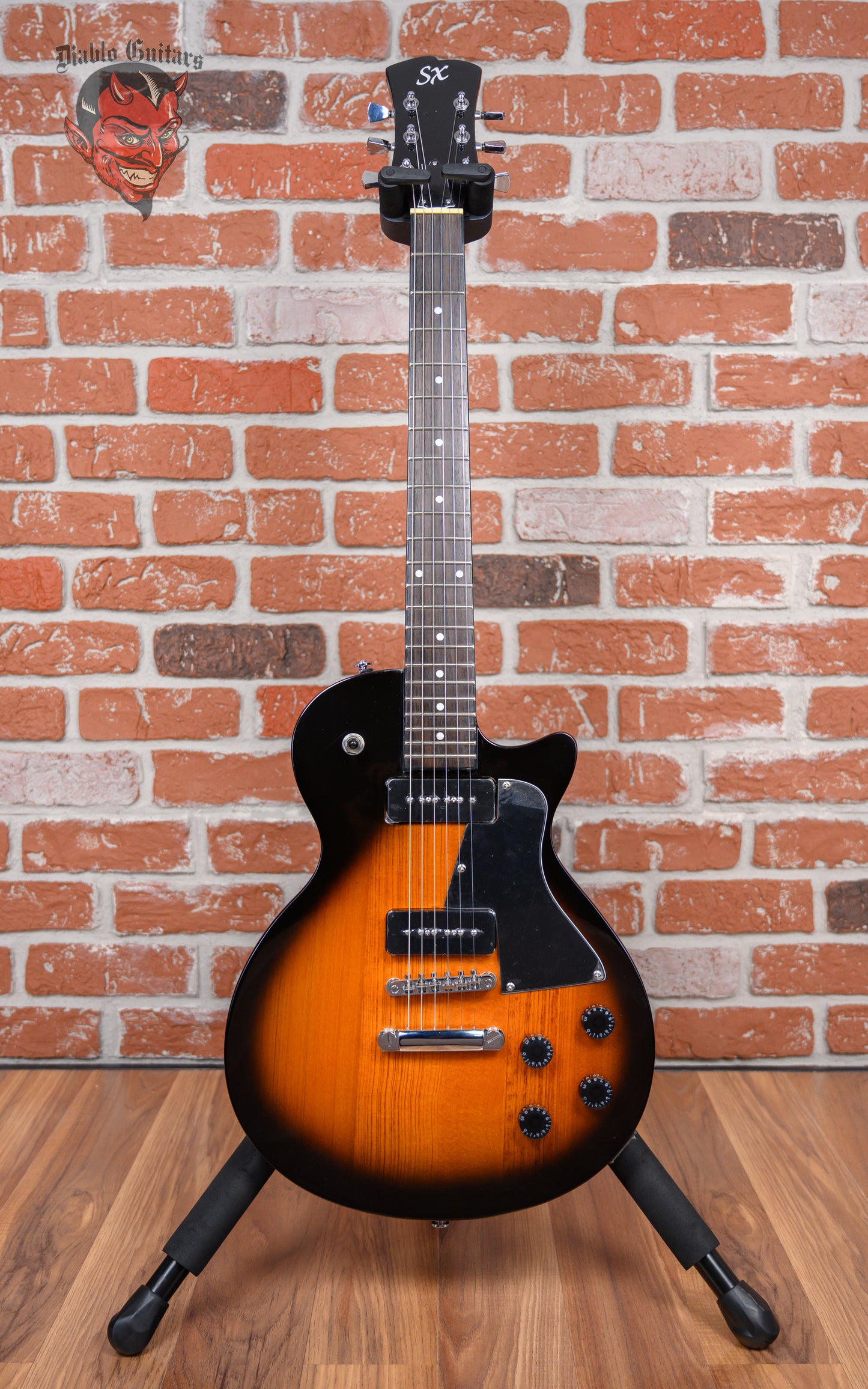 SX Callisto JR 2TS in Tobacco Sunburst finish made in 2020 with Gigbag. This guitar features a solid mahogany body, mahogany neck and rosewood fingerboard. Equipped with a set of SX P90 single coil pickups in the neck and bridge positions. Controlled by 2 volume pots, 2 tone pots and a 3-Way toggle switch. The 24.75" scale length neck has white dot inlays and white side markers with 22 jumbo frets on a 12" radius with a medium C profile. The hardware is comprised of chrome sealed die-cast tuning machines with keystone heads, a plastic nut, a Tune-O-Matic bridge w/ stopbar tailpiece and black speed knobs with a 3 ply black on white pickguard.