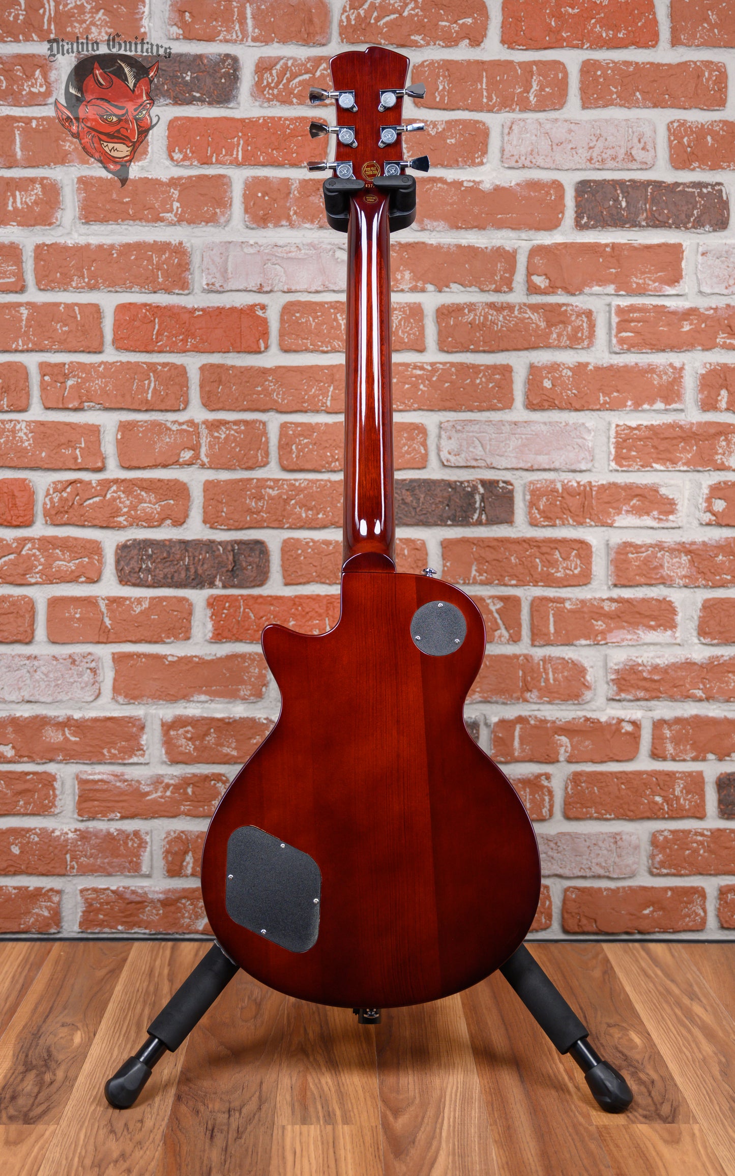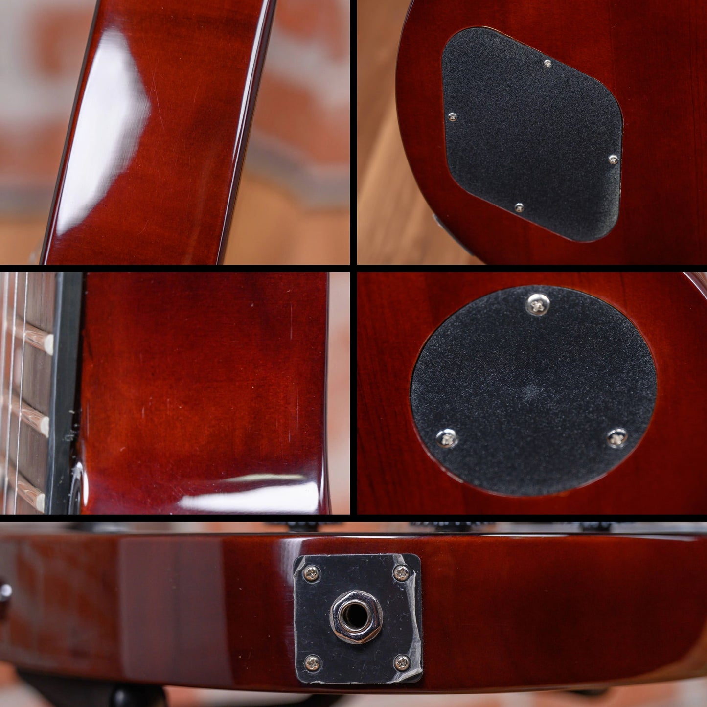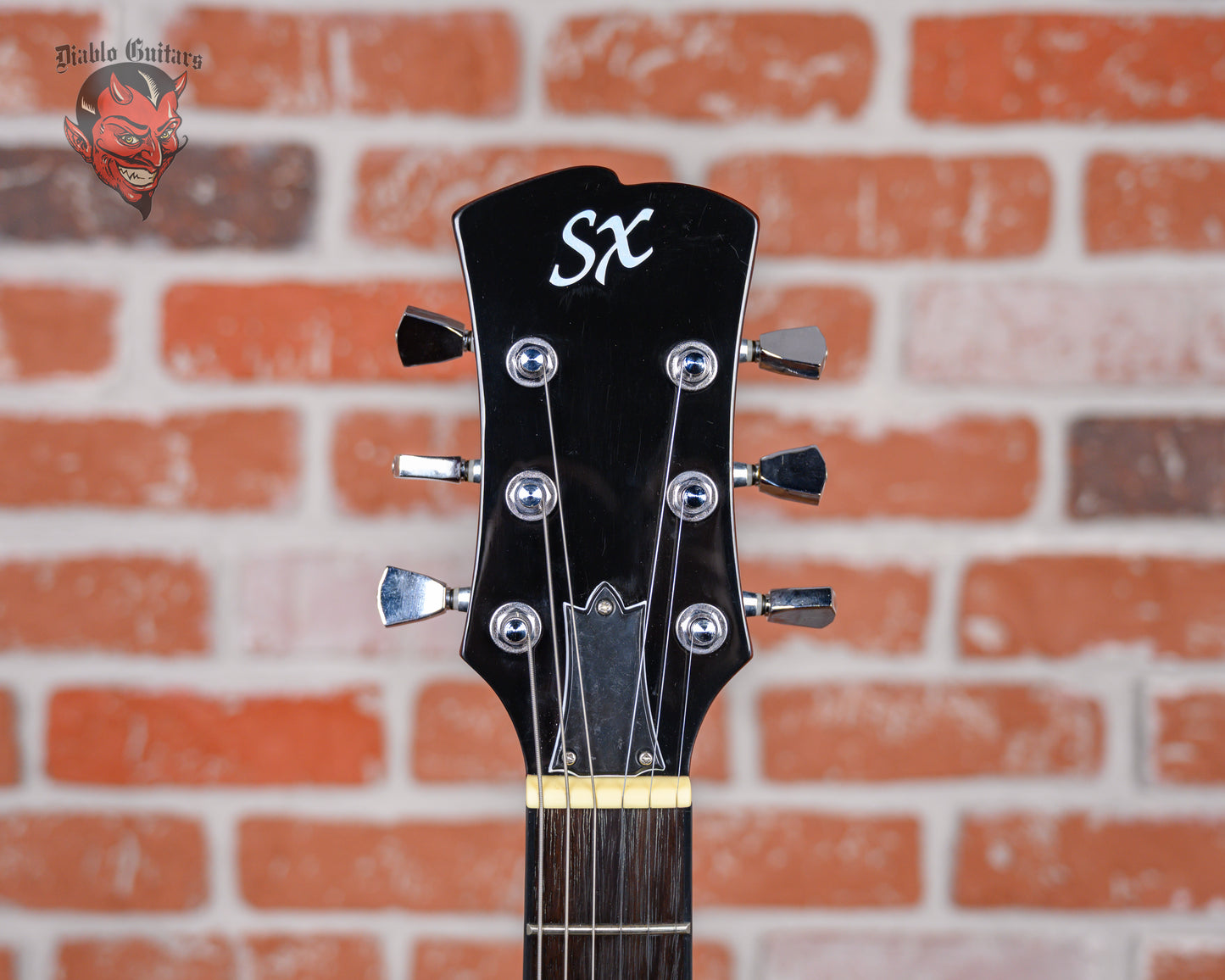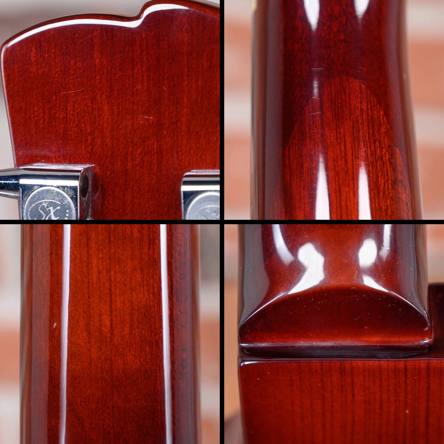 SX Callisto JR 2TS in Tobacco Sunburst finish made in 2020 with Gigbag. This guitar features a solid mahogany body, mahogany neck and rosewood fingerboard. Equipped with a set of SX P90 single coil pickups in the neck and bridge positions. Controlled by 2 volume pots, 2 tone pots and a 3-Way toggle switch. The 24.75" scale length neck has white dot inlays and white side markers with 22 jumbo frets on a 12" radius with a medium C profile. The hardware is comprised of chrome sealed die-cast tuning machines with keystone heads, a plastic nut, a Tune-O-Matic bridge w/ stopbar tailpiece and black speed knobs with a 3 ply black on white pickguard.