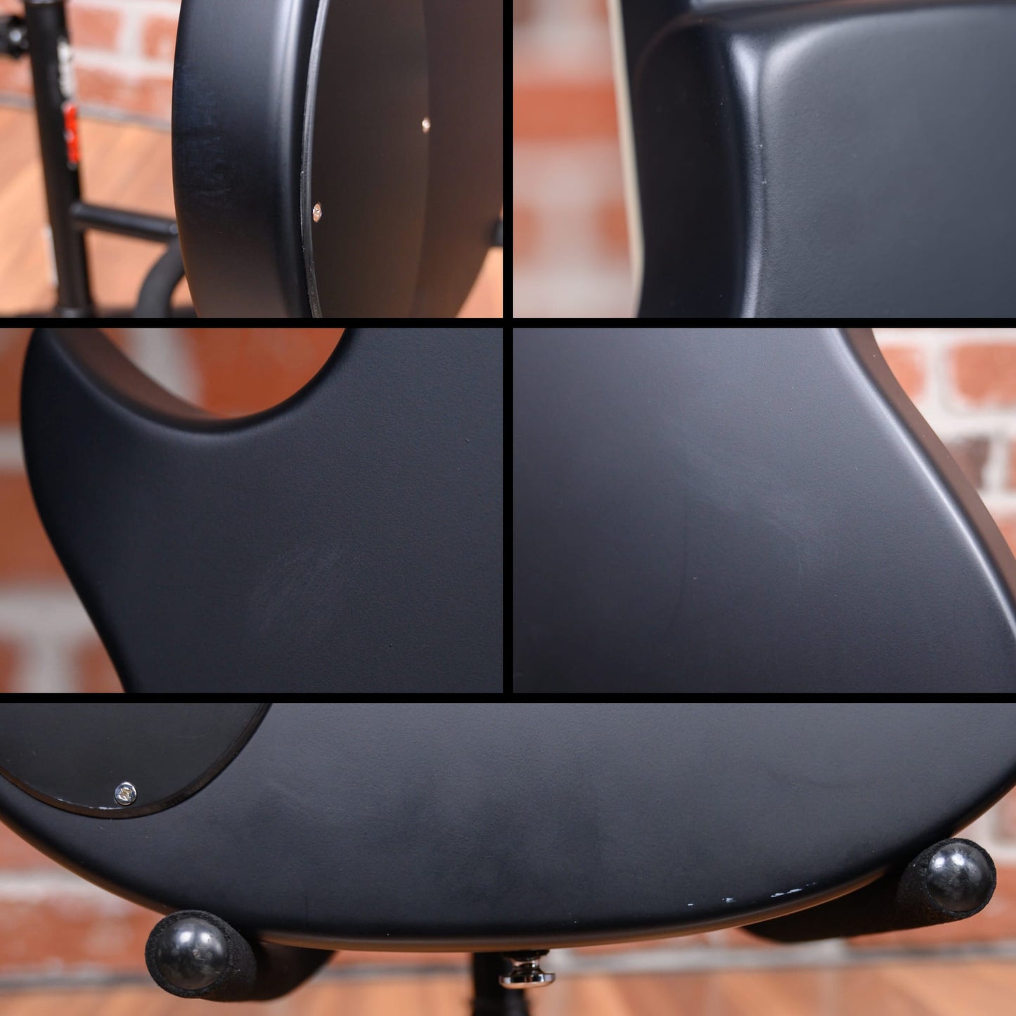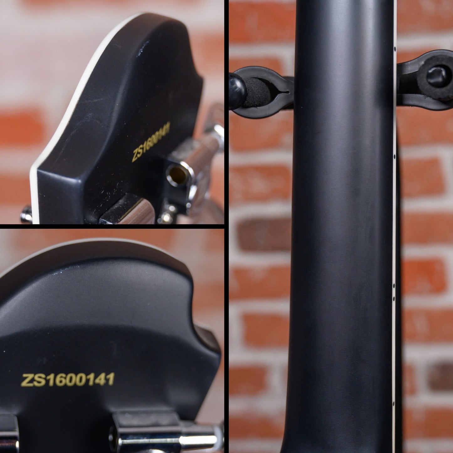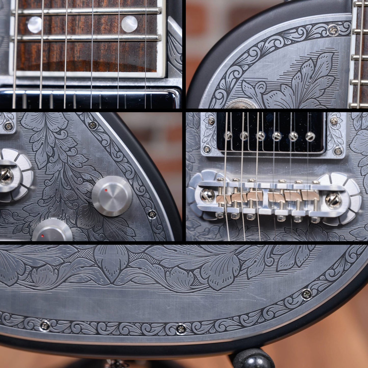 This guitar is in overall excellent condition. The headstock has a few light surface marks and the back of the neck has some very light finish wear. There are some light scuffs on the back of the body. The aluminum top has surface marks around the edges, bridge, and controls. There is some discoloration on the fretboard after the 24th fret. (See pics)