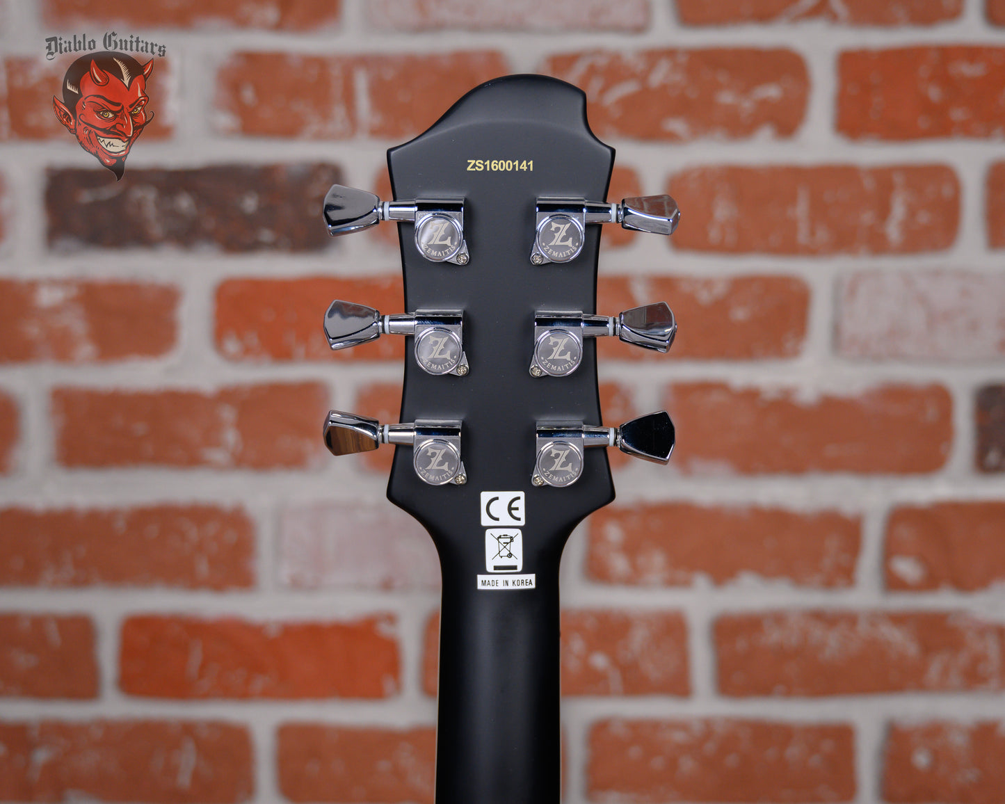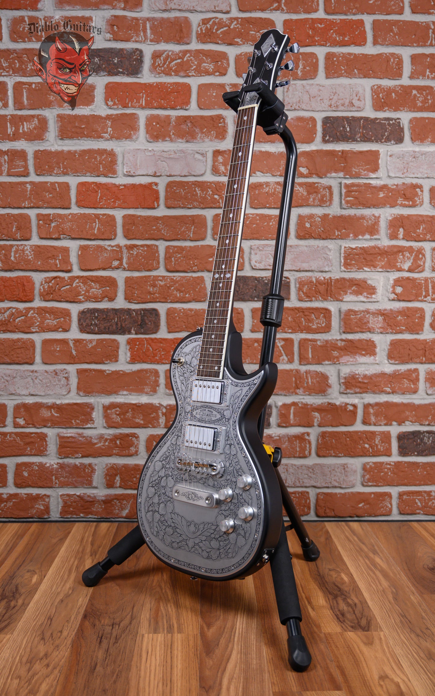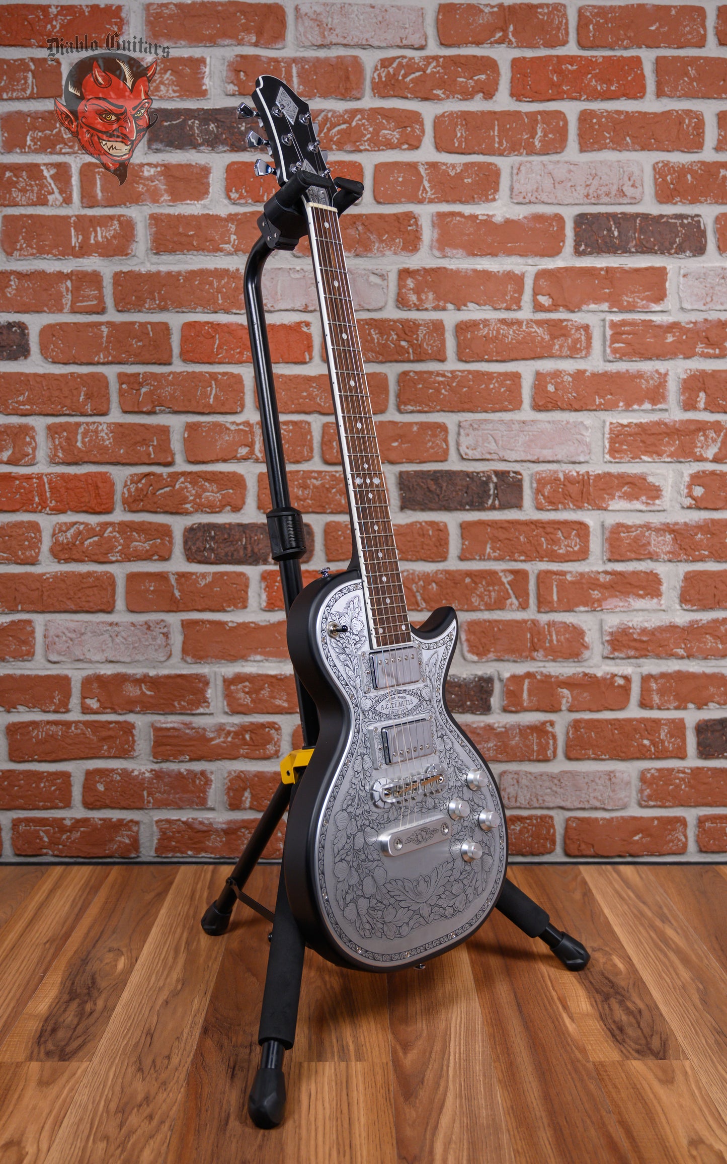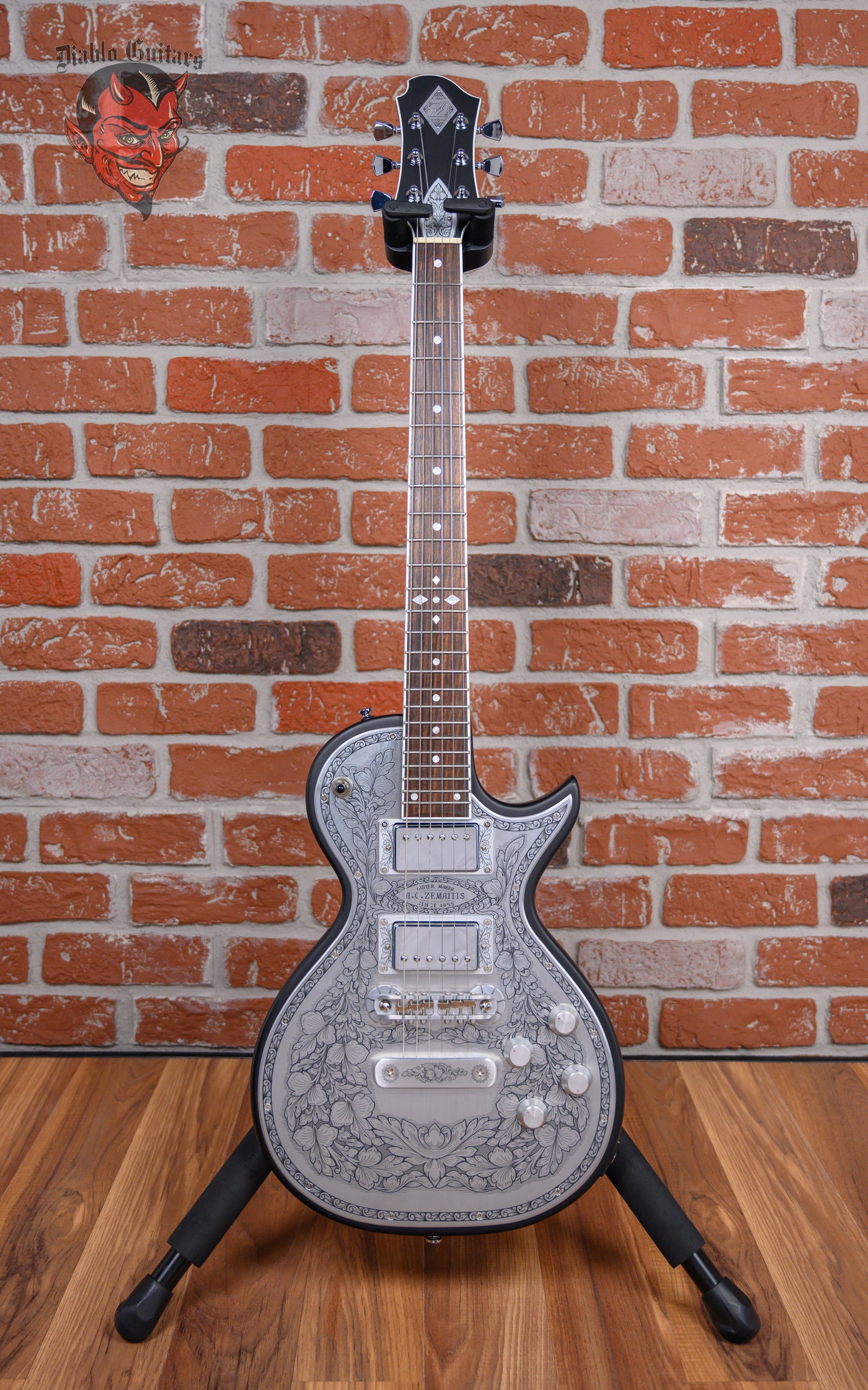 Zemaitis C24MF Casimere in Satin Black finish made in 2016 with Original Gigbag. This guitar features a solid mahogany body with an acid etched aluminum top, mahogany neck and bound rosewood fingerboard with bound headstock. Equipped with a pair of Zemaitis D5 Classic humbuckers in the neck and bridge positions. Controlled by 2 volume pots, 2 tone pots and a 3-Way toggle switch. The 25" scale length neck has pearloid dot inlays and black side markers with 24 medium jumbo frets on a 12" radius with a medium C profile. The hardware is comprised of chrome Gotoh sealed die-cast tuning machines with keystone heads, a bone nut, a Zemaitis custom designed "flower wheel" bridge and aluminum top hat knobs.