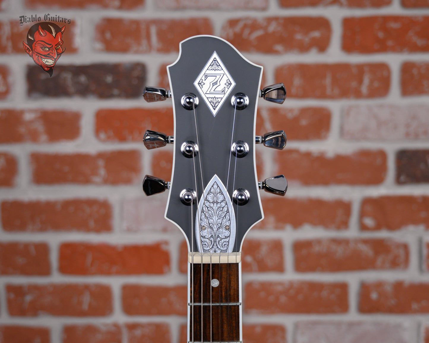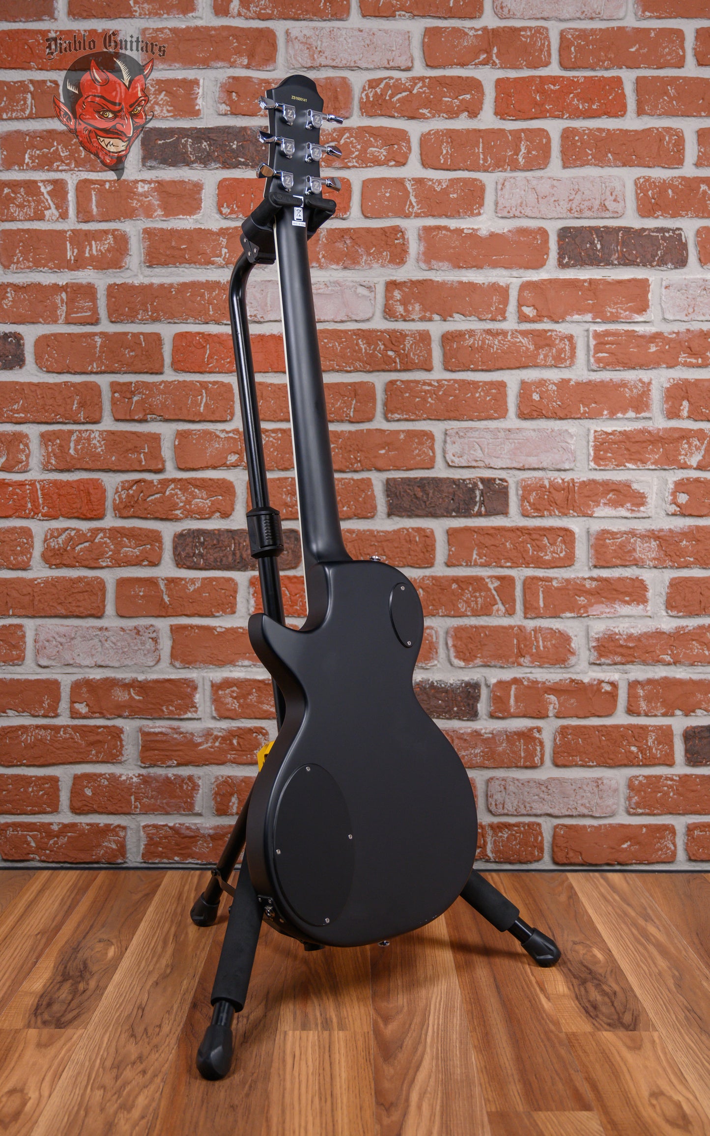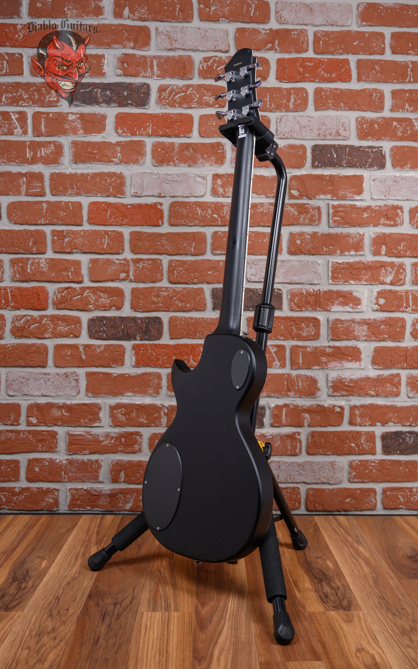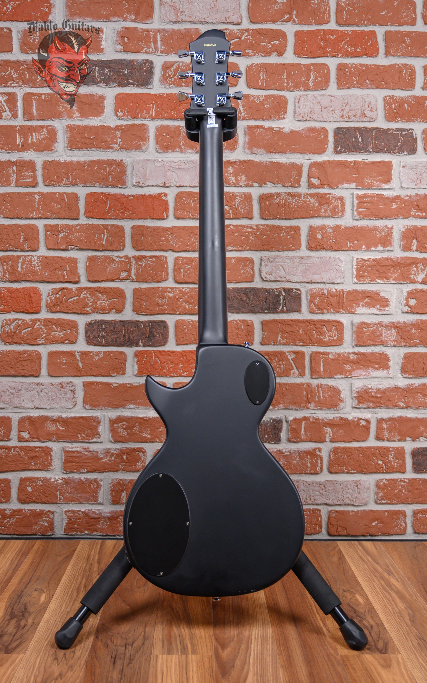 Zemaitis C24MF Casimere in Satin Black finish made in 2016 with Original Gigbag. This guitar features a solid mahogany body with an acid etched aluminum top, mahogany neck and bound rosewood fingerboard with bound headstock. Equipped with a pair of Zemaitis D5 Classic humbuckers in the neck and bridge positions. Controlled by 2 volume pots, 2 tone pots and a 3-Way toggle switch. The 25" scale length neck has pearloid dot inlays and black side markers with 24 medium jumbo frets on a 12" radius with a medium C profile. The hardware is comprised of chrome Gotoh sealed die-cast tuning machines with keystone heads, a bone nut, a Zemaitis custom designed "flower wheel" bridge and aluminum top hat knobs.