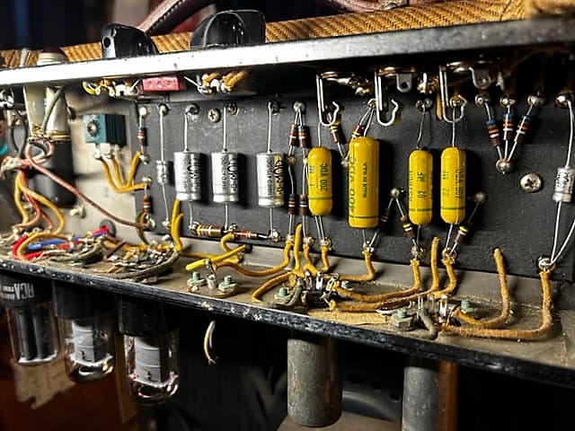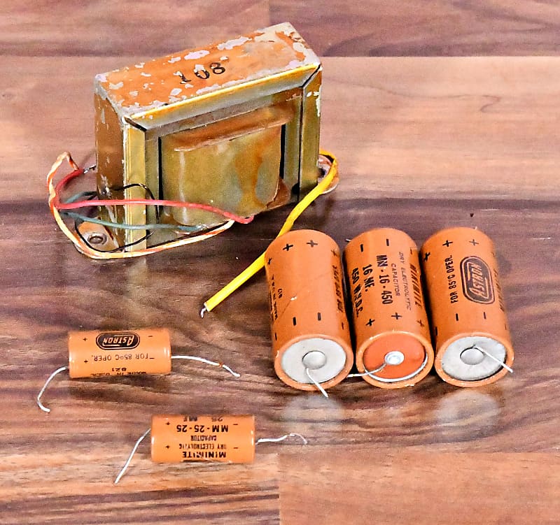 The amp ships with the stock input transformer. It has been shorted in the secondary, but should you wish to pursue having it repaired in order to return the amp to 100% stock, the option is there for you. The amp has also been recapped which is a very standard maintenance item for older amps. Again for the sake of collectability, we're including the original caps for you. You wont want to re-install them as they are failing.