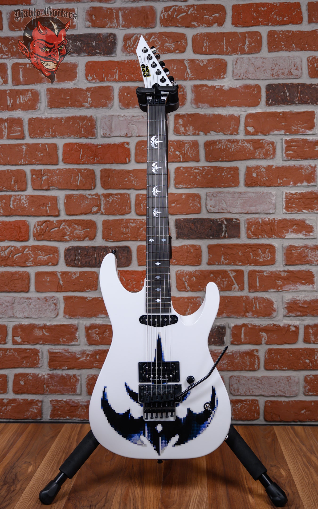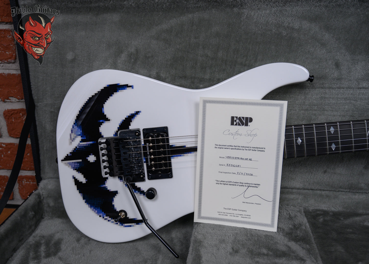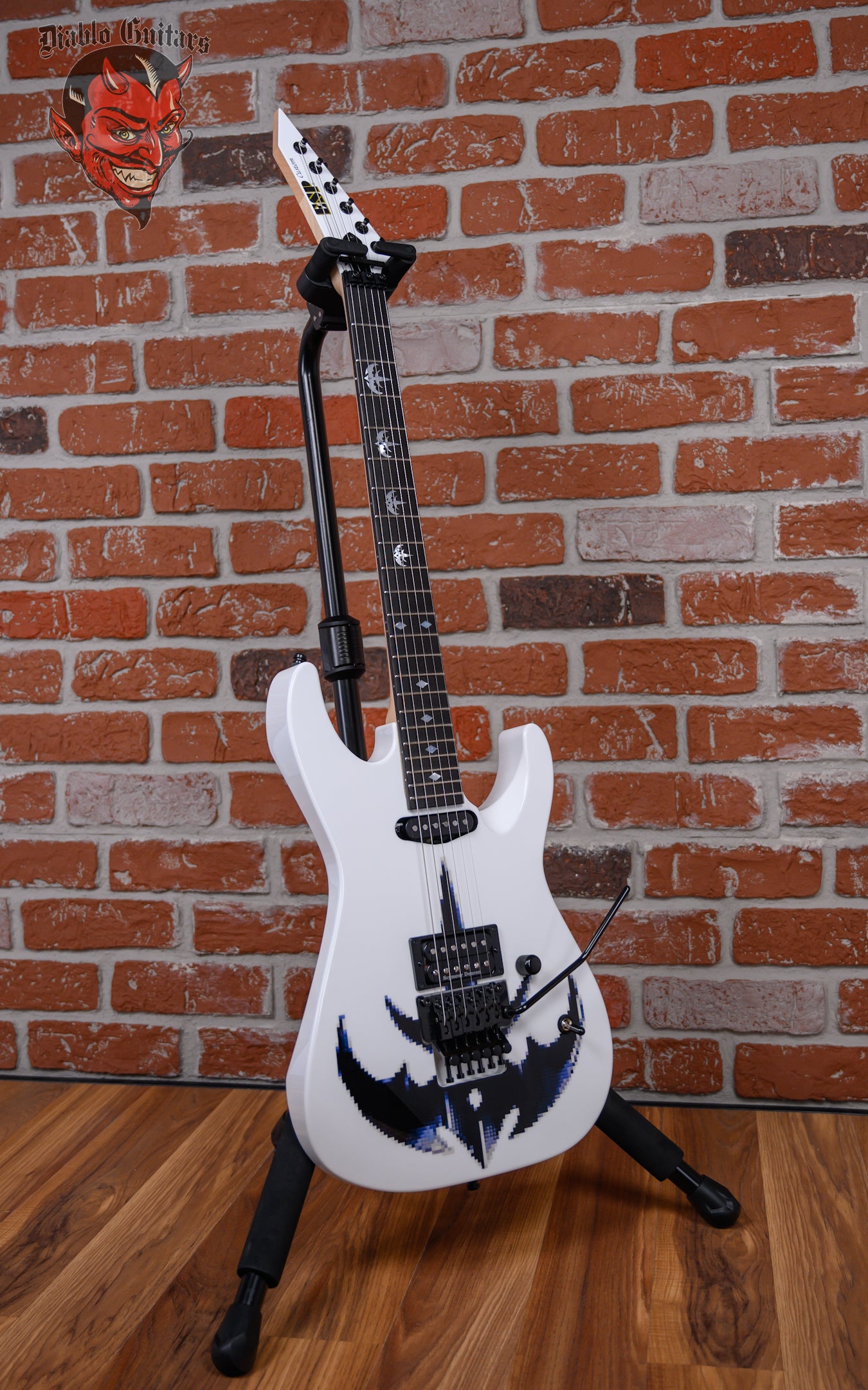 New ESP Custom Shop Chris Degarmo Signature M-II HS in Snow White With Triryche Empire Graphic finish made in 2026 with Original Hard Shell Case. This guitar features a solid alder body, 3-Piece maple neck and ebony fingerboard with a reverse/ color matched headstock. Equipped with an ESP SS-120 single coil in the neck position and a Seymour Duncan TB-59 in the bridge position. Controlled by one master volume pot and a 3-Way toggle switch. The 25.5" scale length neck has mother of pearl Triryche /diamond inlays, mother of pearl side markers with 22 extra jumbo frets on a 305mm radius with a thin U profile. The hardware is comprised of black Gotoh SG-360 Sealed Diecast tuning machines with cloche heads, a Floyd Rose R2 Locking nut, a Floyd Rose Original Double Locking Tremolo bridge and black knurled dome knob.