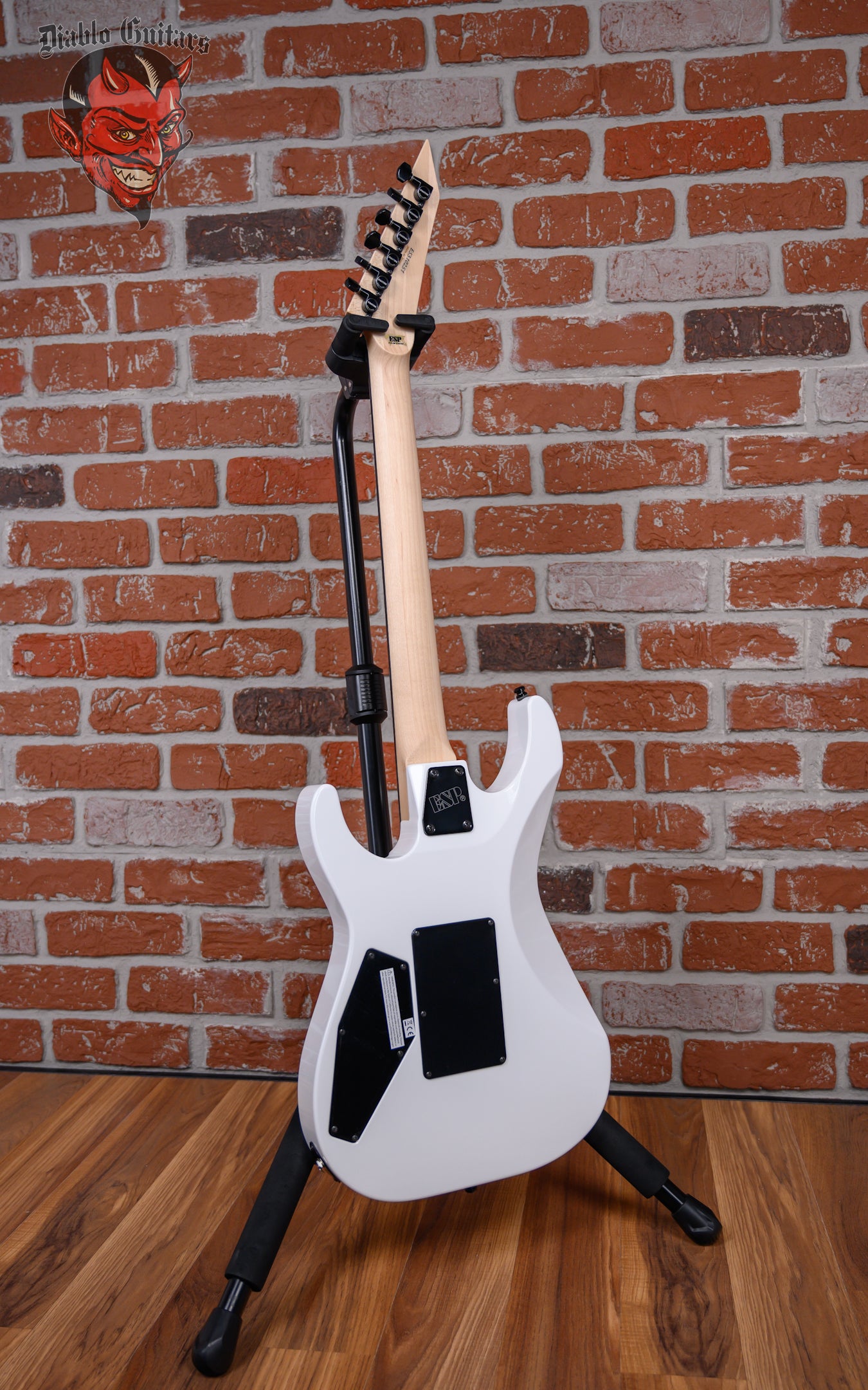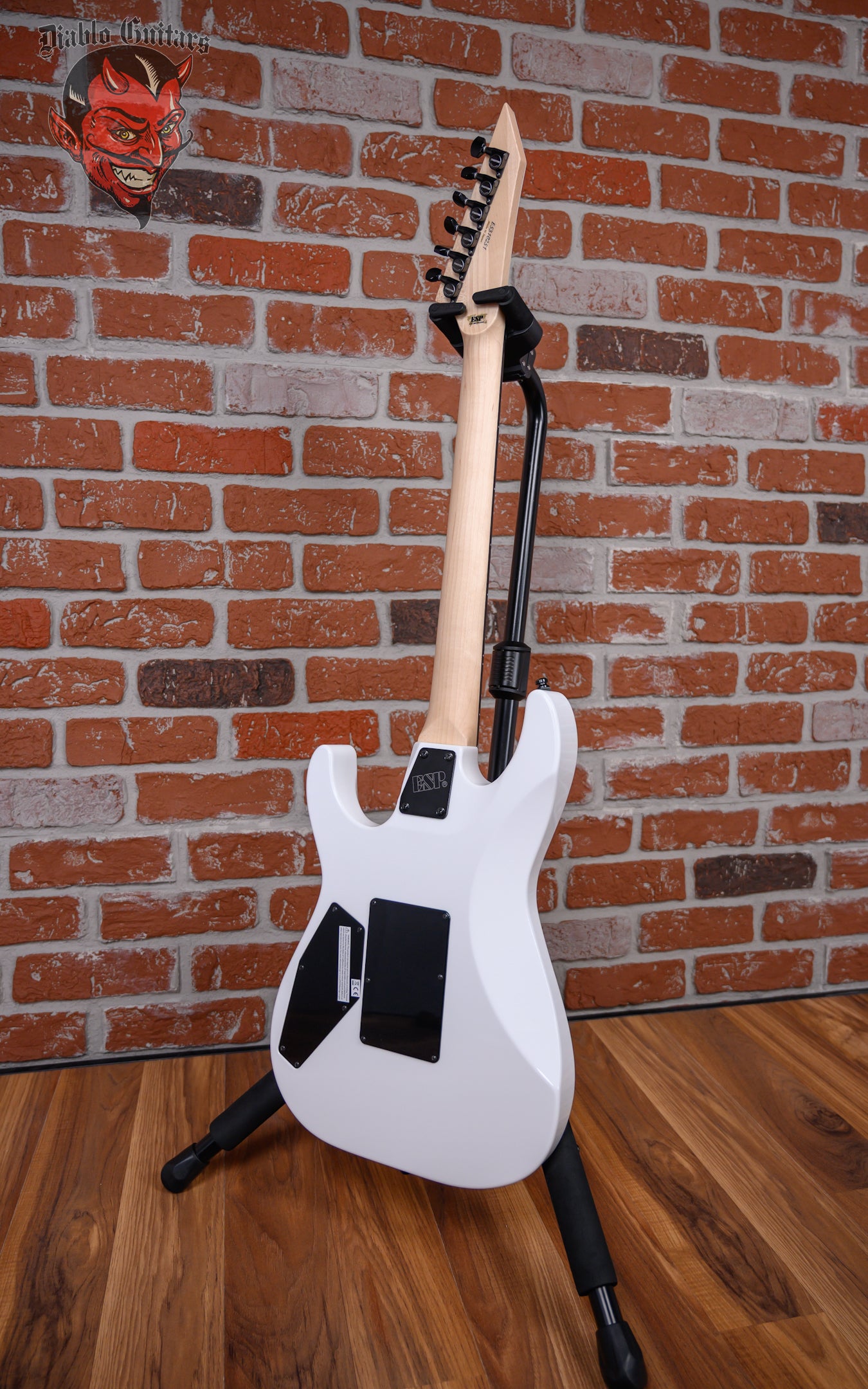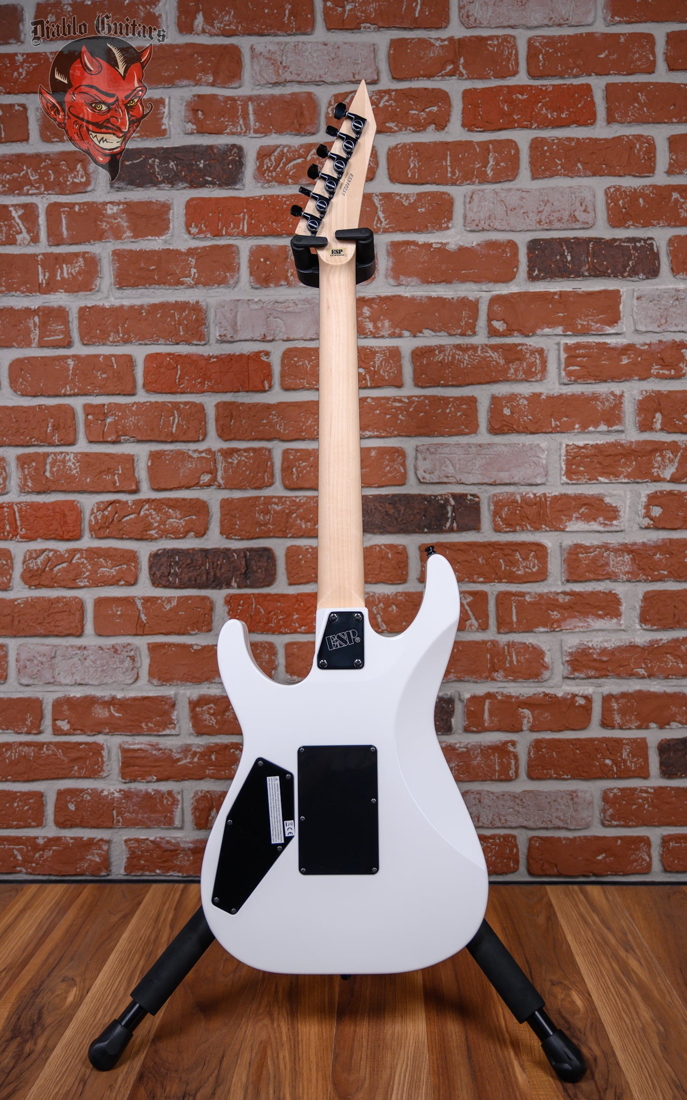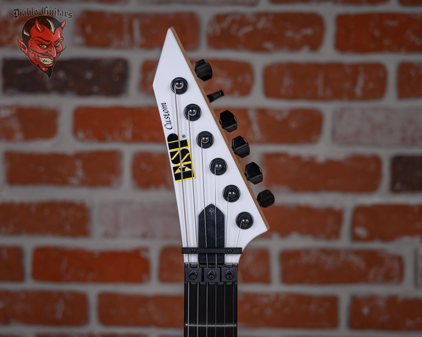 New ESP Custom Shop Chris Degarmo Signature M-II HS in Snow White With Triryche Empire Graphic finish made in 2026 with Original Hard Shell Case. This guitar features a solid alder body, 3-Piece maple neck and ebony fingerboard with a reverse/ color matched headstock. Equipped with an ESP SS-120 single coil in the neck position and a Seymour Duncan TB-59 in the bridge position. Controlled by one master volume pot and a 3-Way toggle switch. The 25.5" scale length neck has mother of pearl Triryche /diamond inlays, mother of pearl side markers with 22 extra jumbo frets on a 305mm radius with a thin U profile. The hardware is comprised of black Gotoh SG-360 Sealed Diecast tuning machines with cloche heads, a Floyd Rose R2 Locking nut, a Floyd Rose Original Double Locking Tremolo bridge and black knurled dome knob.