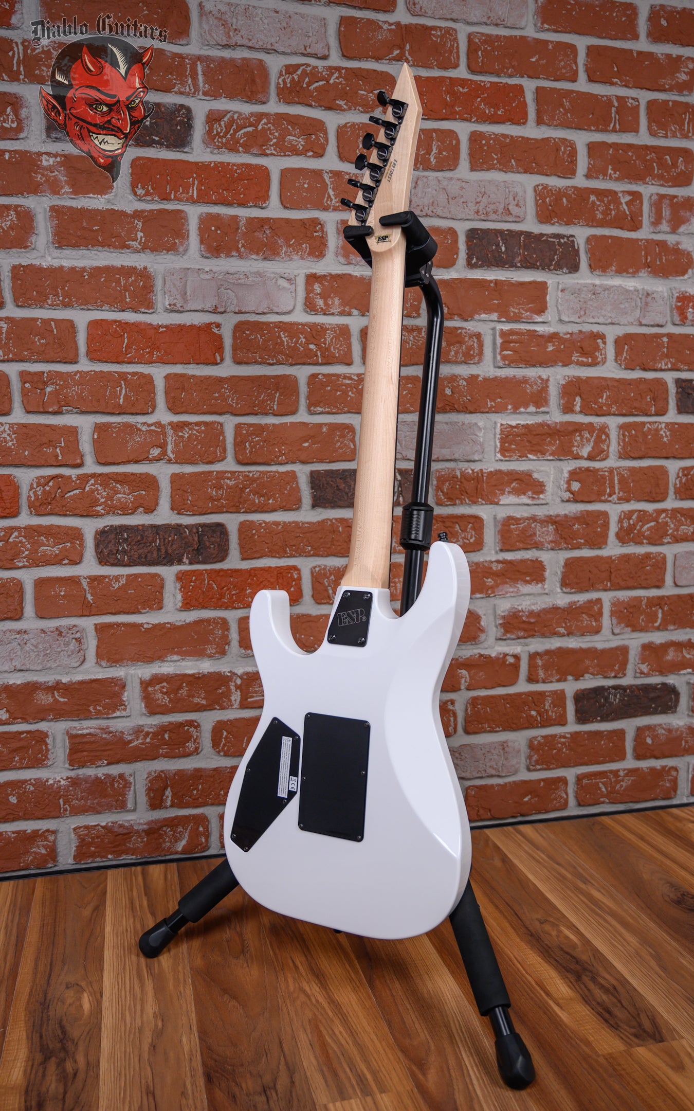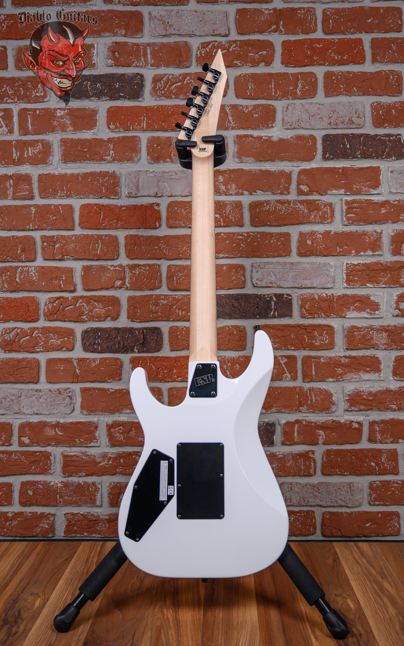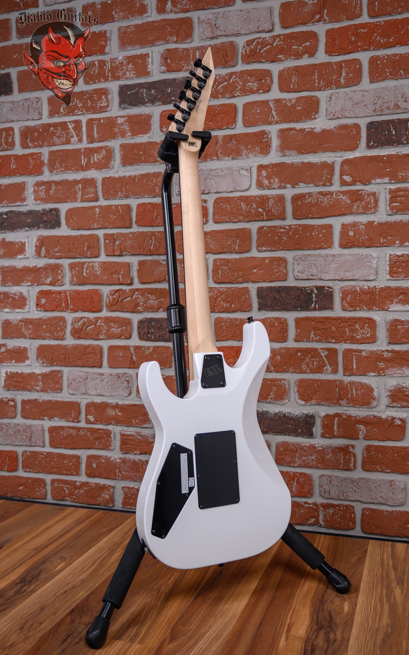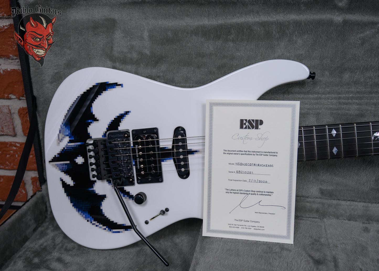 New ESP Custom Shop Chris Degarmo Signature M-II HSS in Snow White With Triryche Empire Graphic finish made in 2026 with Original Hard Shell Case. This guitar features a solid alder body, 3-Piece maple neck and ebony fingerboard with a reverse/ color matched headstock. Equipped with a pair of ESP SS-120 single coils in the neck /middle position and a Seymour Duncan TB-59 in the bridge position. Controlled by one master volume pot and a 5-Way blade switch. The 25.5" scale length neck has mother of pearl Triryche /diamond inlays, mother of pearl side markers with 22 extra jumbo frets on a 305mm radius with a thin U profile. The hardware is comprised of black Gotoh SG-360 Sealed Diecast tuning machines with cloche heads, a Floyd Rose R2 Locking nut, a Floyd Rose Original Double Locking Tremolo bridge and black knurled dome knob.
