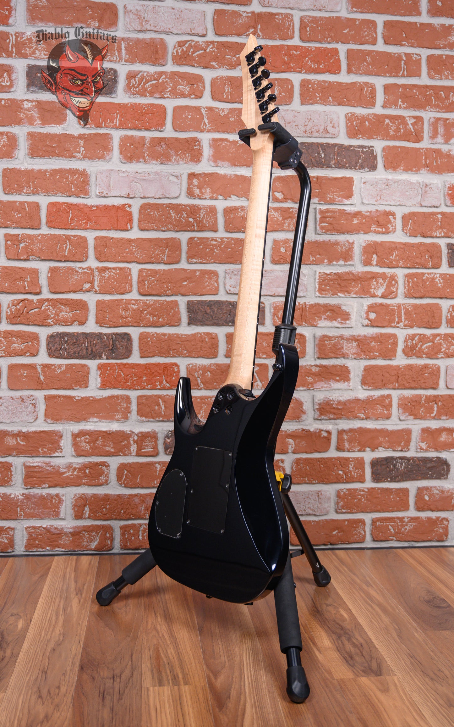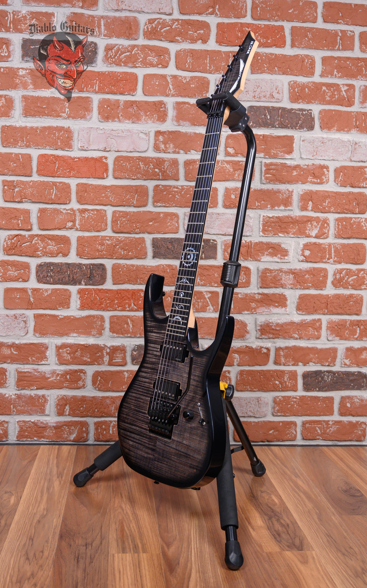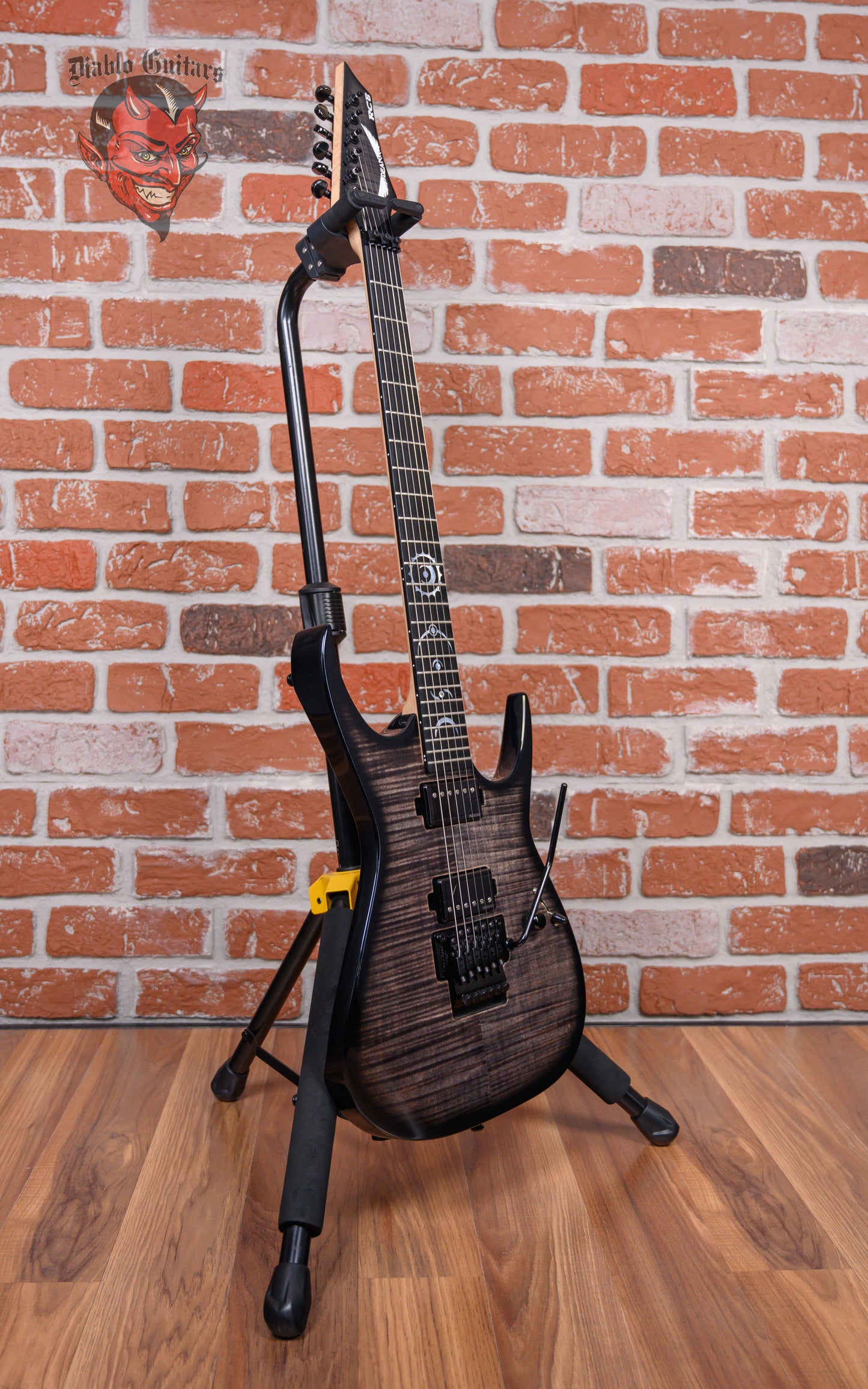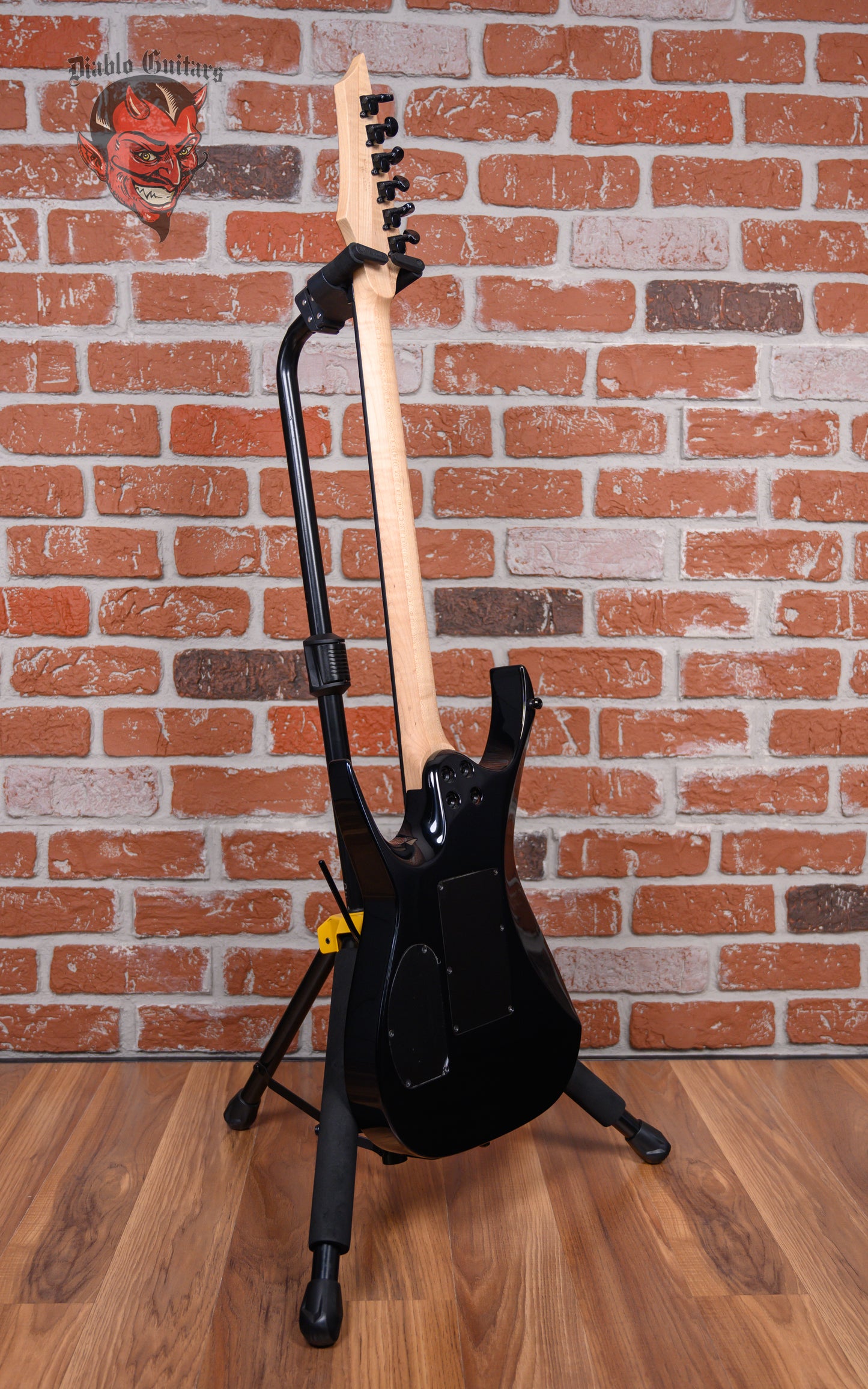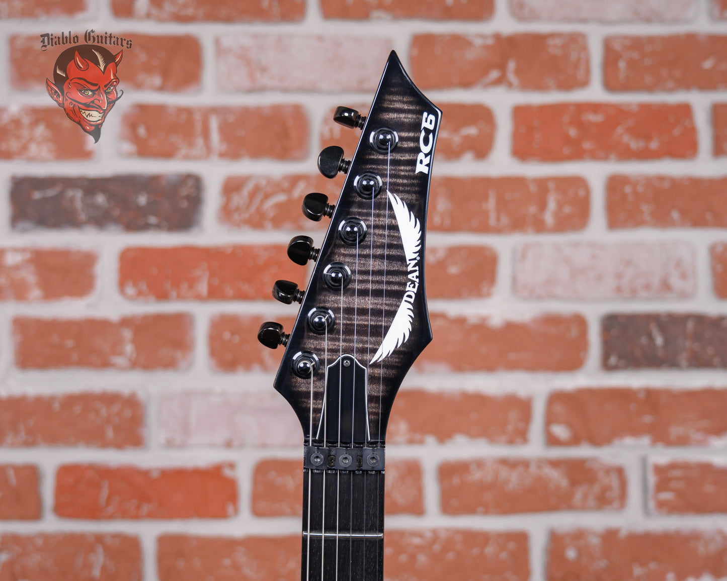 Dean USA Rusty Cooley RC6 FM in Transparent Black Burst finish made in 2016 with Original Hard Shell Case. This guitar features a solid alder body with a flamed maple top, maple neck and ebony fingerboard with a color matched flame maple overlay headstock. Equipped with a Fishman Fluence DT1 in the neck position and a Fishman Fluence DT1 in the bridge position. Controlled by one master volume pot with push/pull coil tap and a 3-way blade switch. The 25.5" scale length neck has mother of pearl Cooley Custom inlays and white side markers with 24 jumbo frets with a Cooley Spec profile. The hardware is comprised of black Grover Mini Rotomatic tuning machines with Mini Kidney Bean heads, a Floyd Rose Locking nut, a Floyd Rose Pro bridge and one black knurled dome knob.