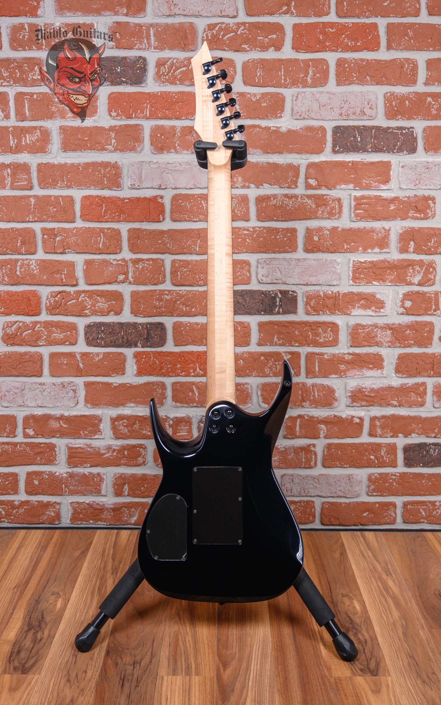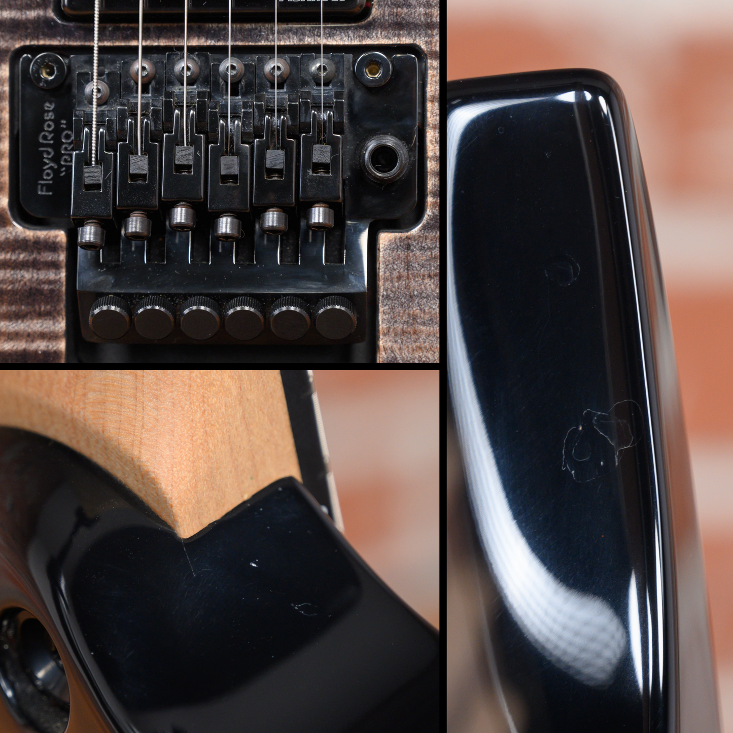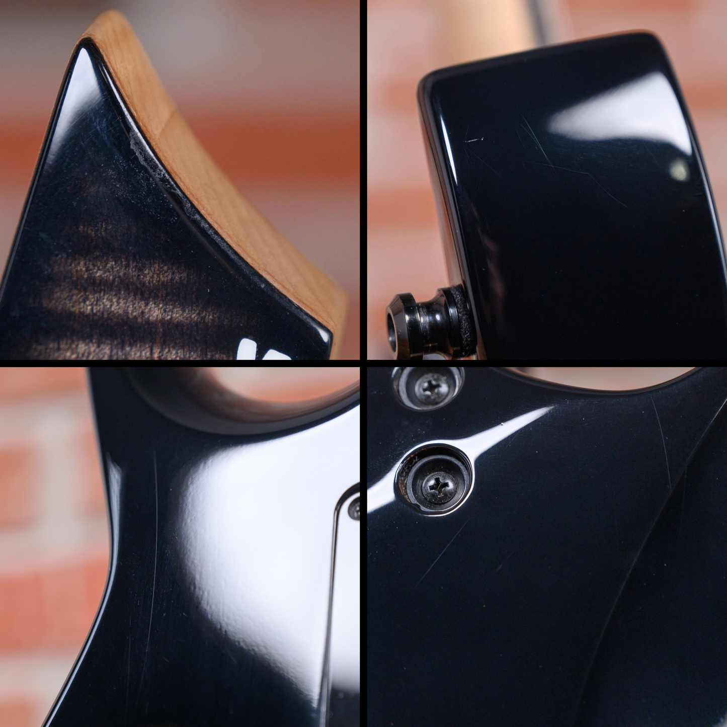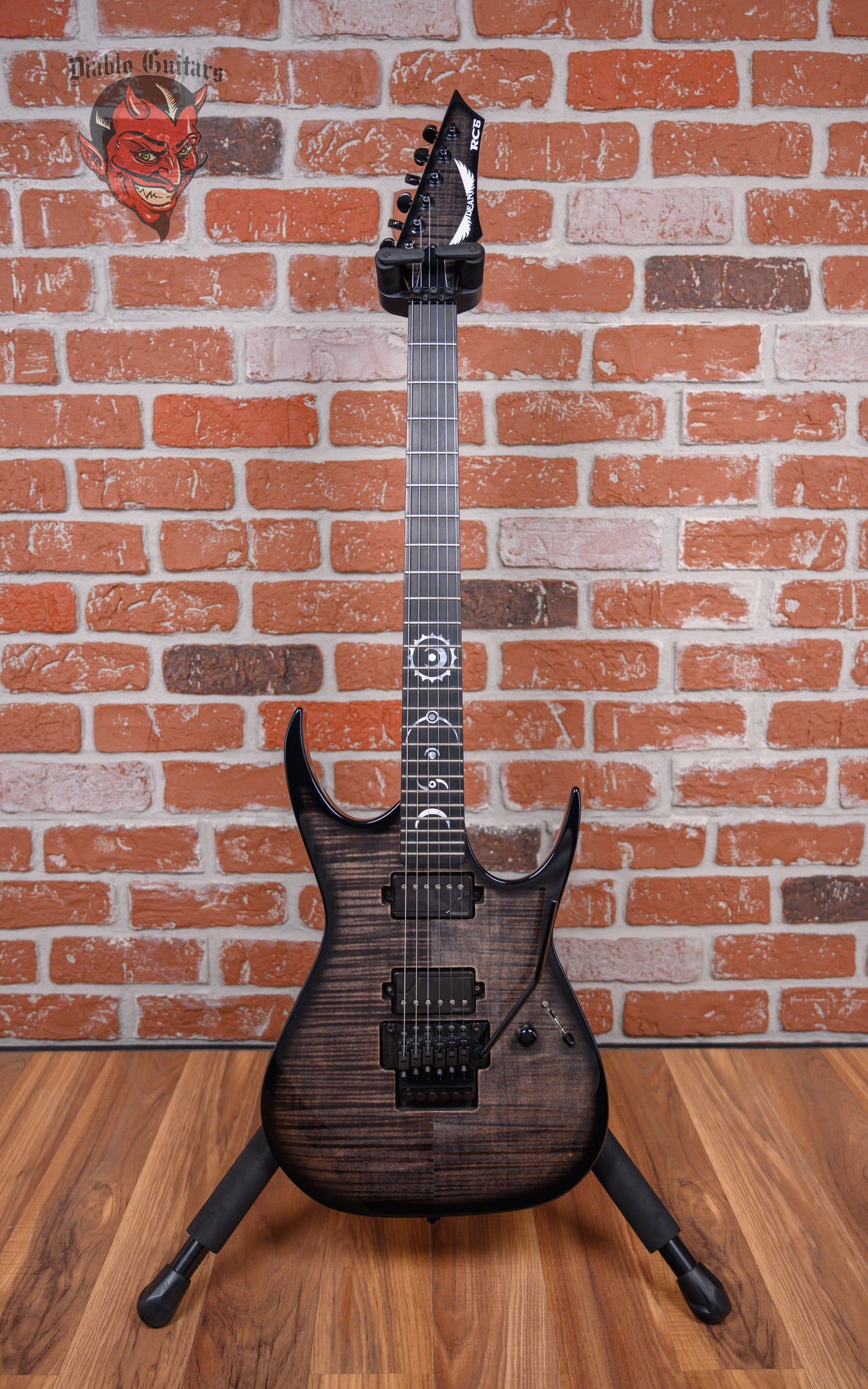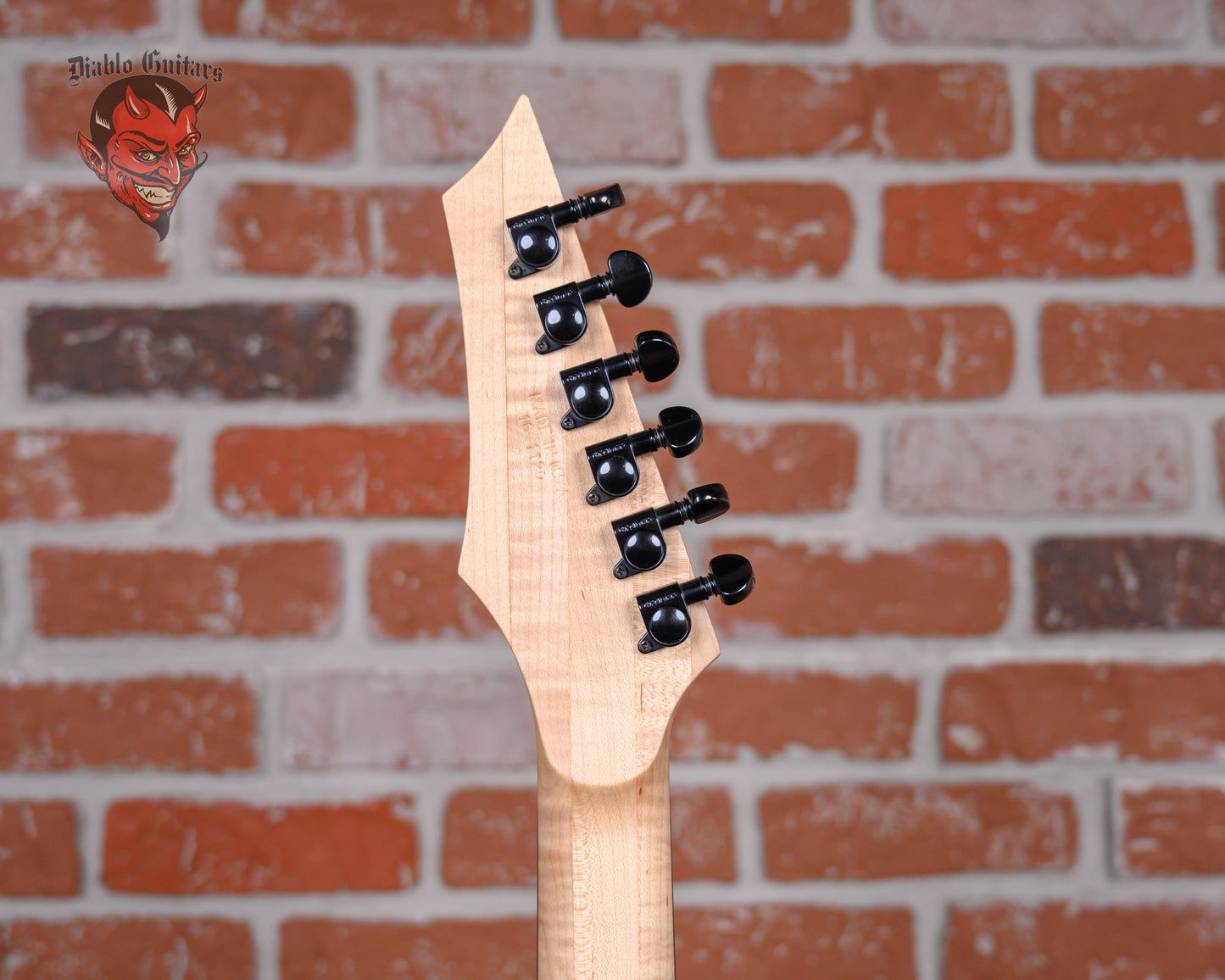 Dean USA Rusty Cooley RC6 FM in Transparent Black Burst finish made in 2016 with Original Hard Shell Case. This guitar features a solid alder body with a flamed maple top, maple neck and ebony fingerboard with a color matched flame maple overlay headstock. Equipped with a Fishman Fluence DT1 in the neck position and a Fishman Fluence DT1 in the bridge position. Controlled by one master volume pot with push/pull coil tap and a 3-way blade switch. The 25.5" scale length neck has mother of pearl Cooley Custom inlays and white side markers with 24 jumbo frets with a Cooley Spec profile. The hardware is comprised of black Grover Mini Rotomatic tuning machines with Mini Kidney Bean heads, a Floyd Rose Locking nut, a Floyd Rose Pro bridge and one black knurled dome knob.