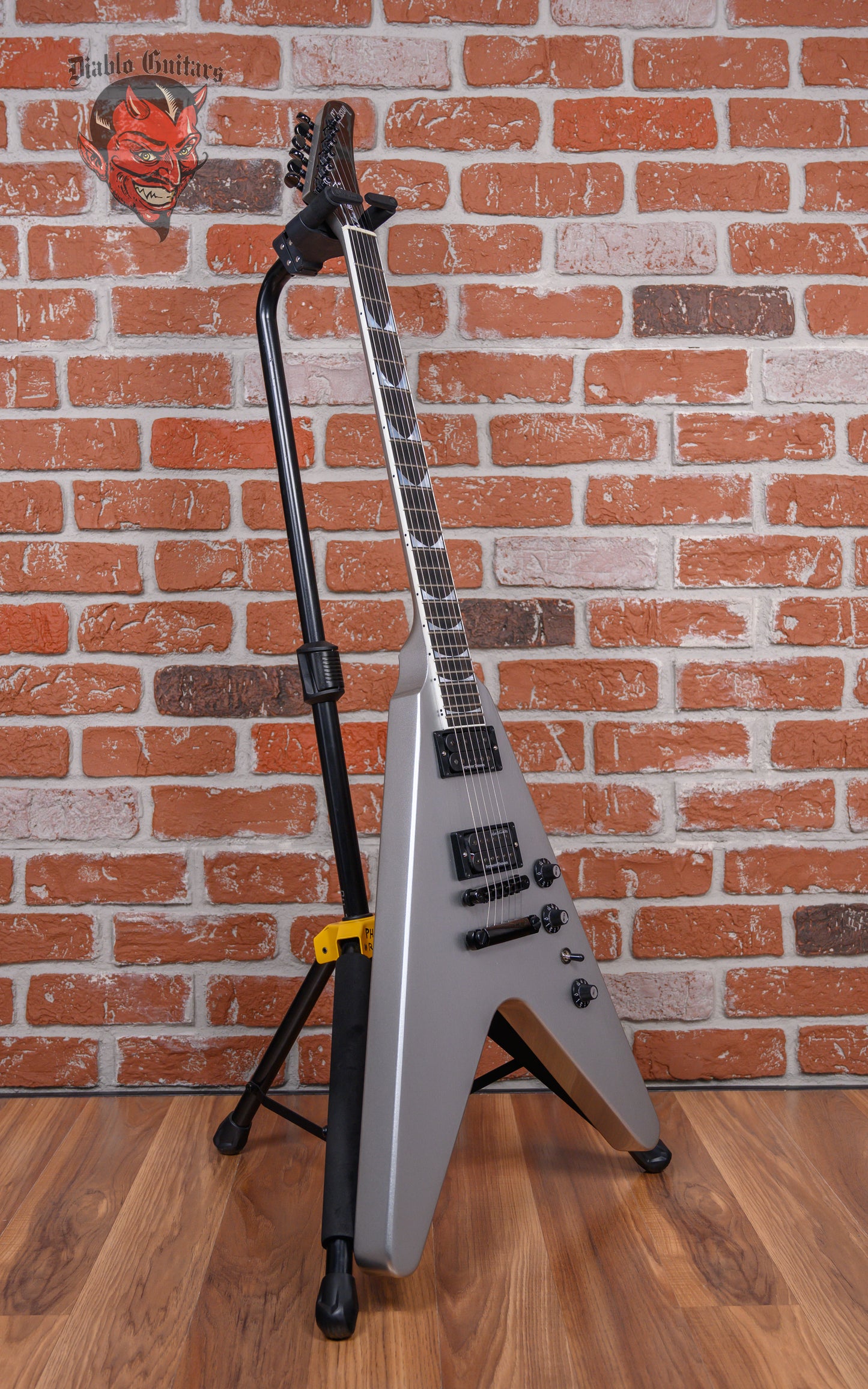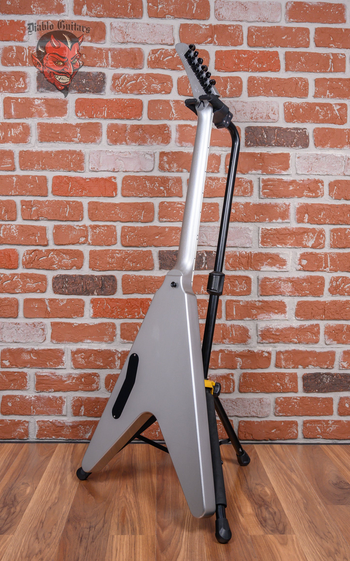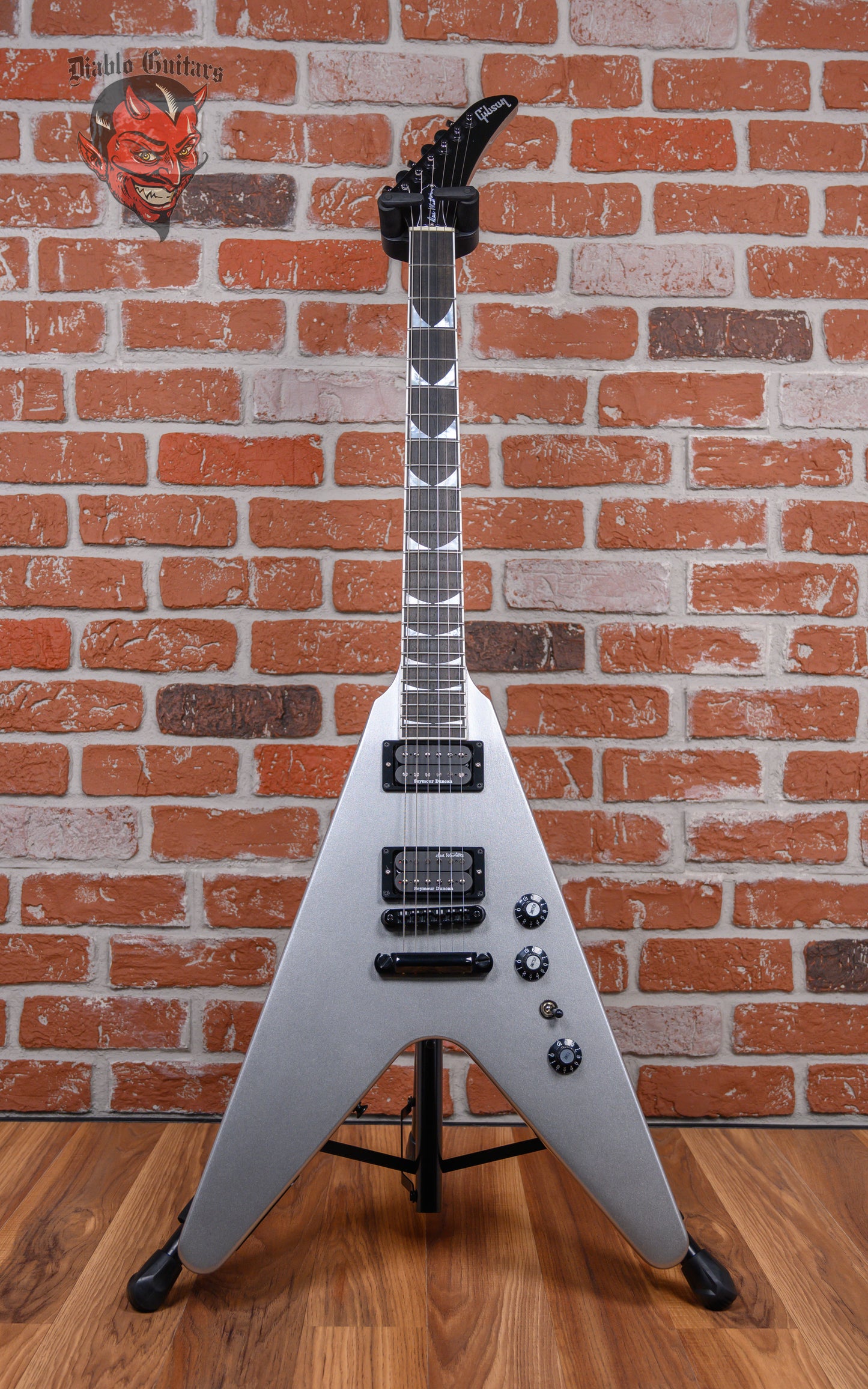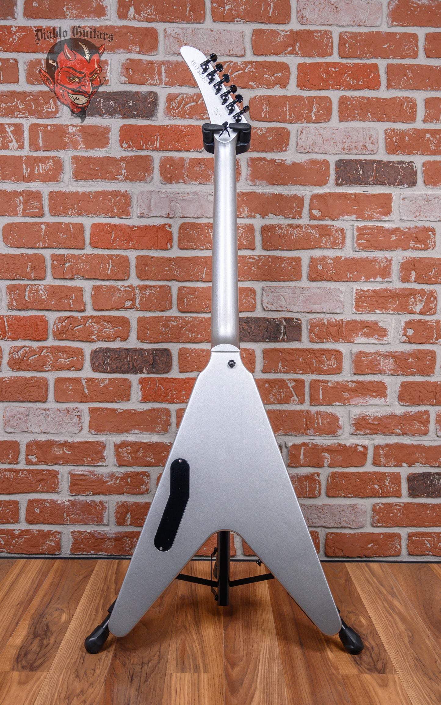 Gibson Dave Mustaine Flying V EXP in Silver Metallic finish made in 2023 with Original Hard Shell Case. This guitar features a solid mahogany body, mahogany neck and bound ebony fingerboard with an EXP headstock. Equipped with a Seymour Duncan SH-1 '59 in the neck position and a Seymour Duncan Thrash Factor in the bridge position. Controlled by 2 volume pots, 1 tone pot and a 3-way toggle switch. The 24.75" scale length neck has mother of pearl Teeth inlays and black side markers with 24 medium jumbo frets on a compound radius with a Slim Taper profile. The hardware is comprised of black Grover Mini-Rotomatic tuning machines with mini kidney bean heads, a bone nut, a Gibson Nashville Tune-O-Matic bridge and witch hat knobs.