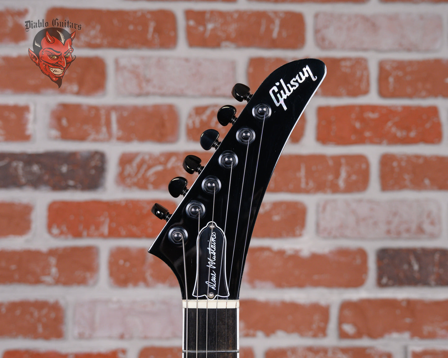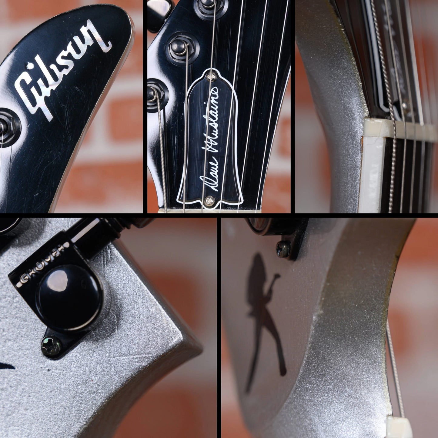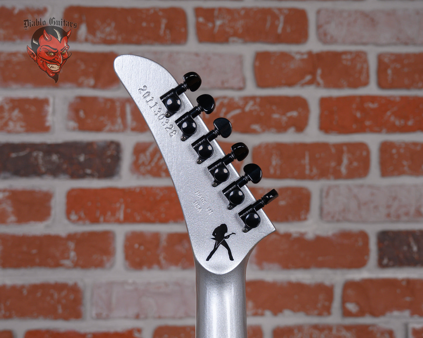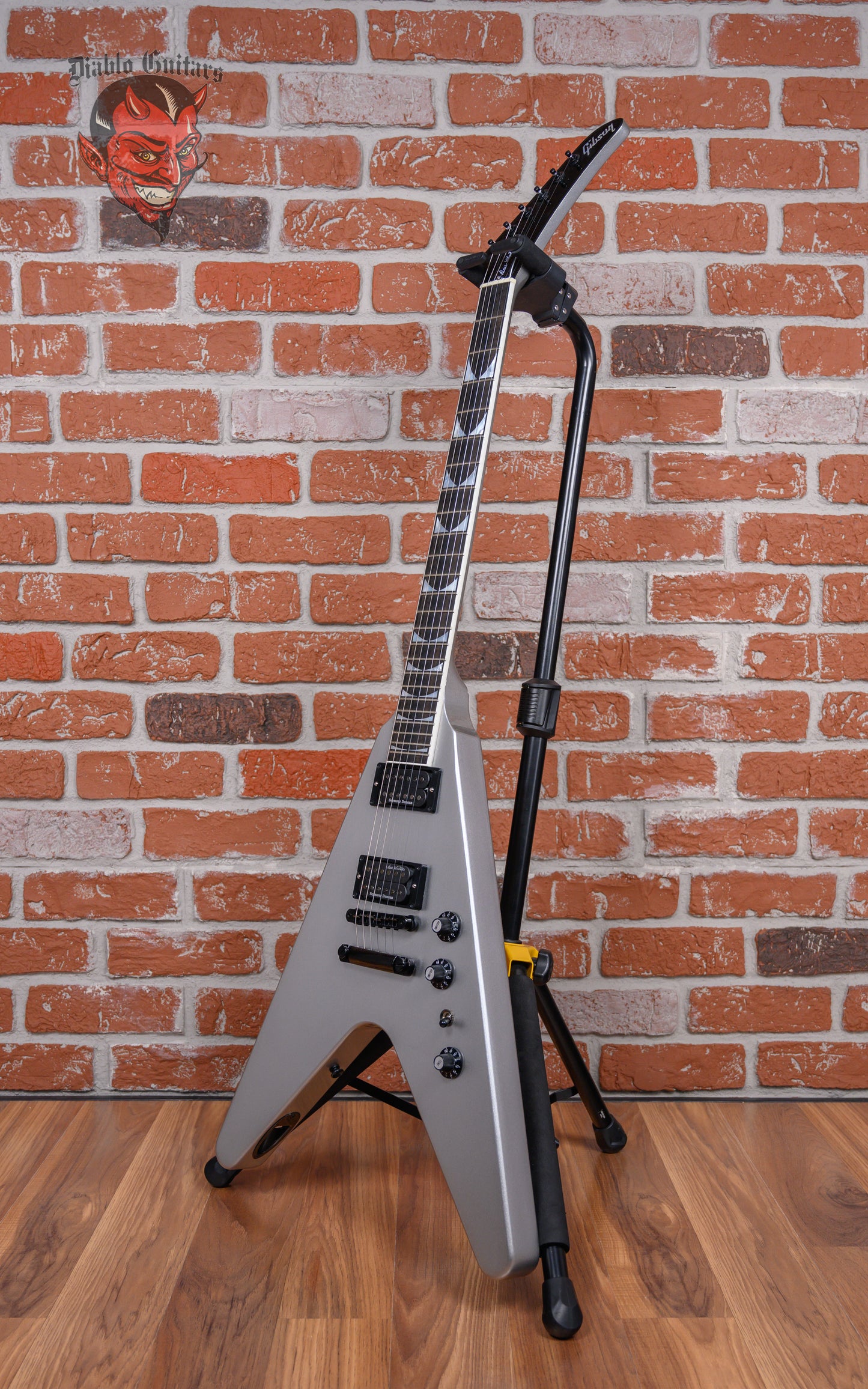 Gibson Dave Mustaine Flying V EXP in Silver Metallic finish made in 2023 with Original Hard Shell Case. This guitar features a solid mahogany body, mahogany neck and bound ebony fingerboard with an EXP headstock. Equipped with a Seymour Duncan SH-1 '59 in the neck position and a Seymour Duncan Thrash Factor in the bridge position. Controlled by 2 volume pots, 1 tone pot and a 3-way toggle switch. The 24.75" scale length neck has mother of pearl Teeth inlays and black side markers with 24 medium jumbo frets on a compound radius with a Slim Taper profile. The hardware is comprised of black Grover Mini-Rotomatic tuning machines with mini kidney bean heads, a bone nut, a Gibson Nashville Tune-O-Matic bridge and witch hat knobs.