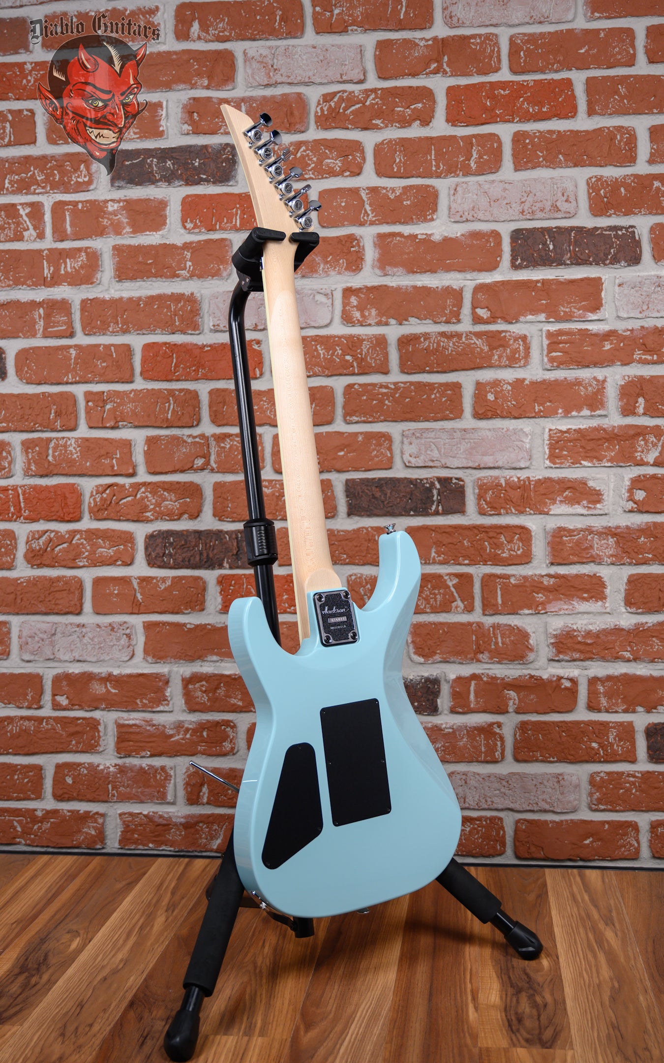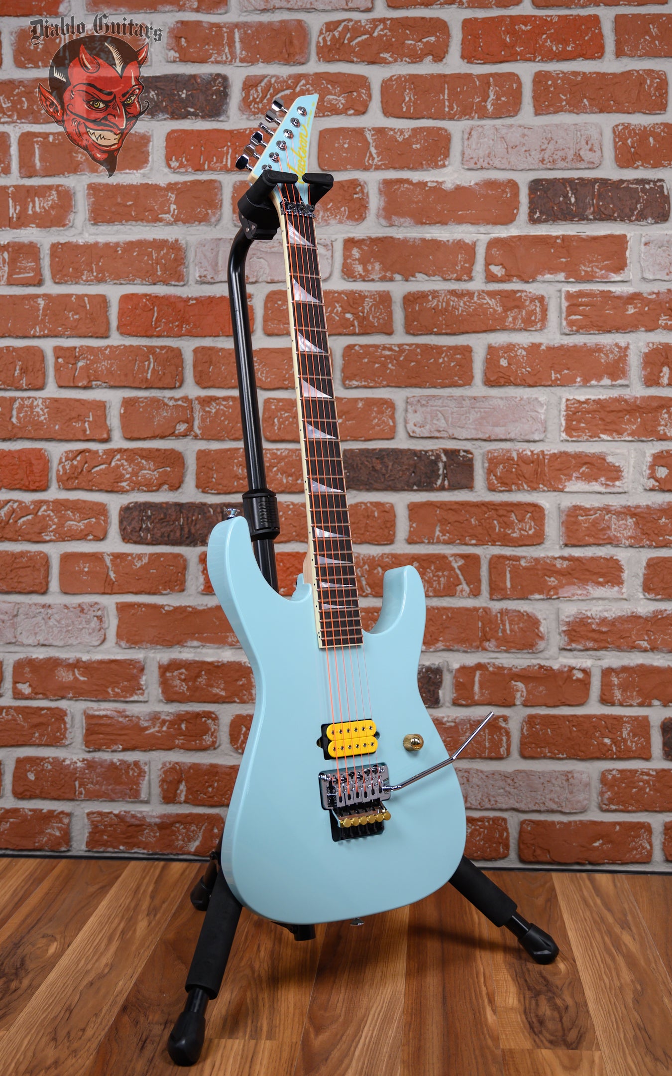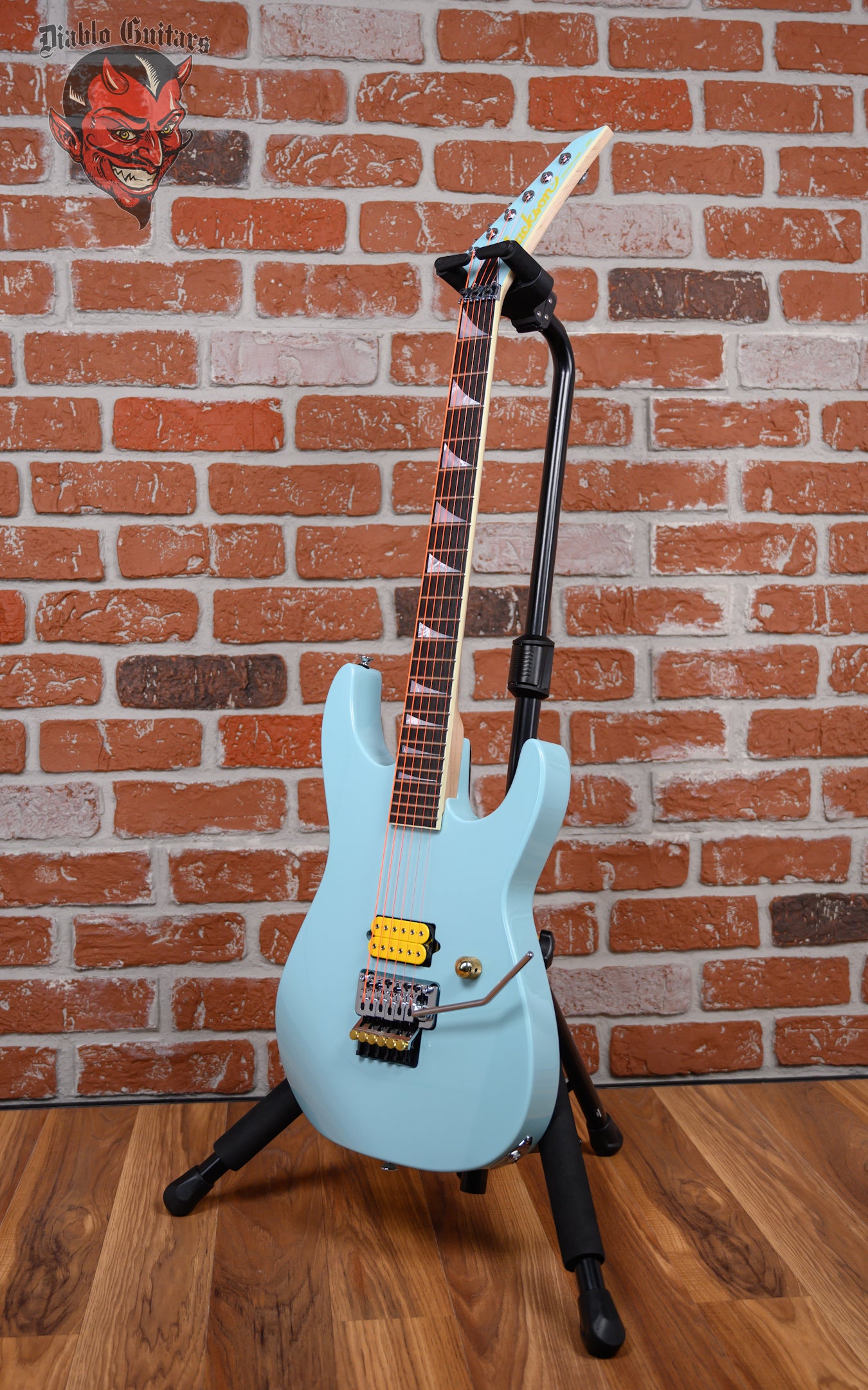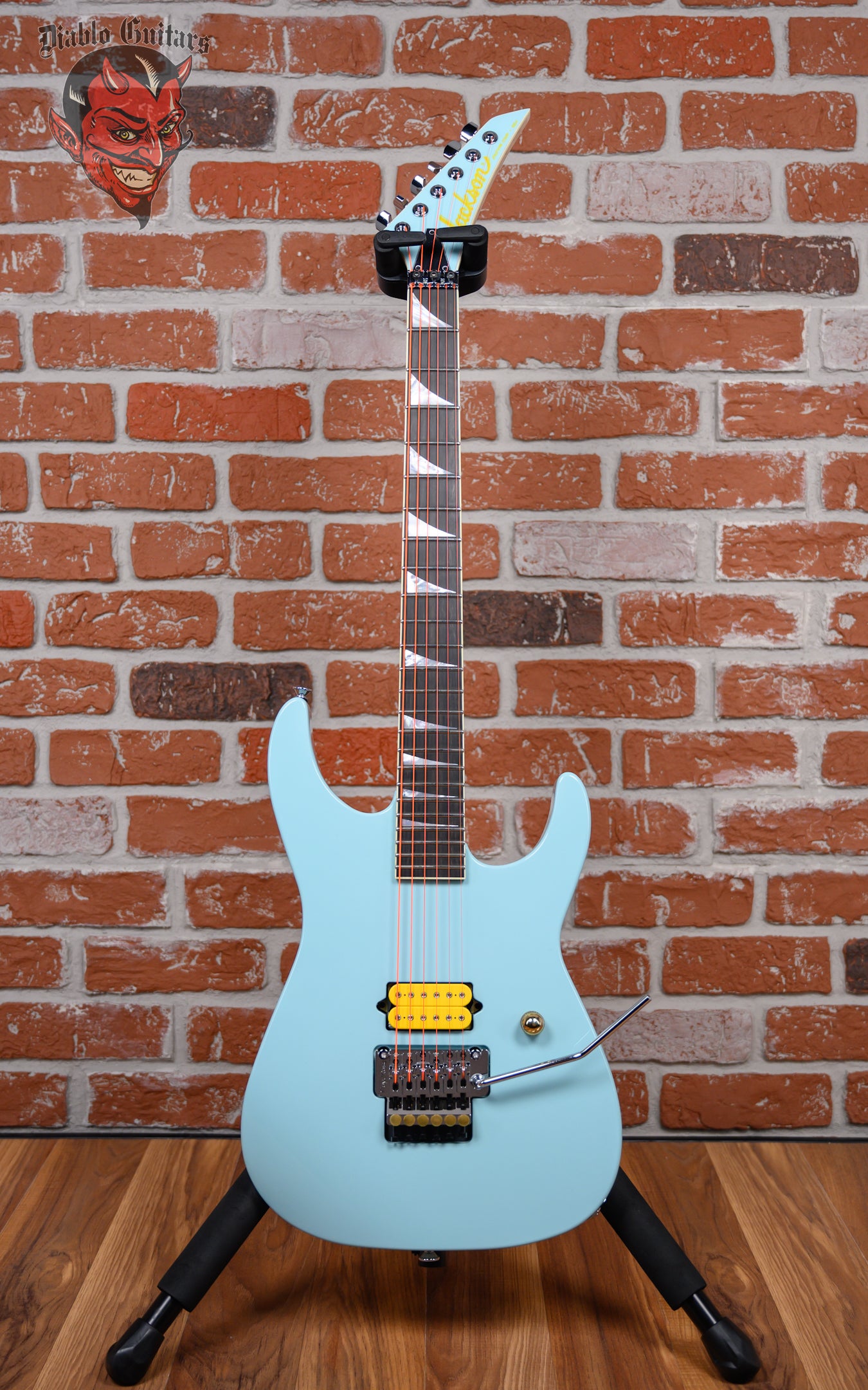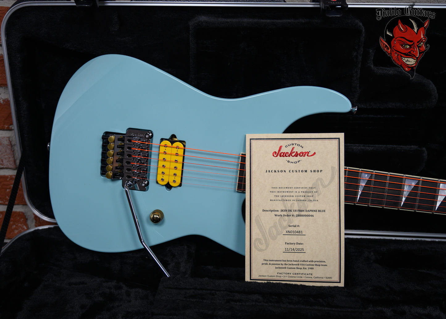 New Jackson USA Custom Shop Dinky 1-H FR84 in Daphne Blue finish made in 2025 with Original Hard Shell Case (B-stock). this guitar features a solid alder body, maple neck and bound ebony fingerboard with a bound color matched headstock with graffiti yellow logo. Equipped with a single Dimarzio super distortion in the bridge position and controlled by one master volume pot. The 25.5" scale length neck has mother of pearl sharkfin inlays and luminlay side markers with 22 jumbo stainless steel frets on a compound 12"-16" radius with a standard neck profile. The hardware is comprised of chrome gotoh magnum Lock-Trad tuning machines with cloche heads, a Floyd Rose locking nut, a Floyd Rose original FR84 double locking tremolo and brass knurled dome knob.