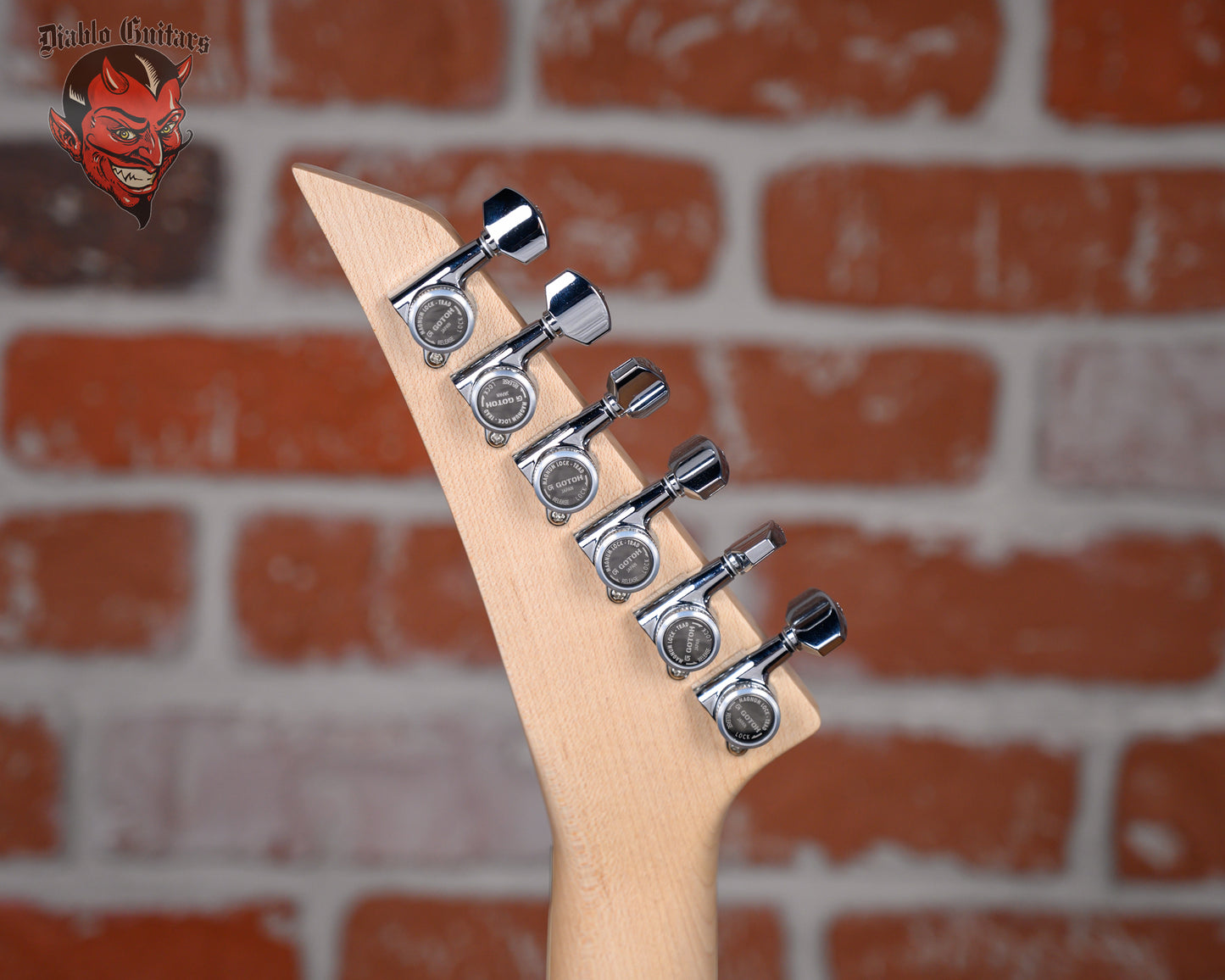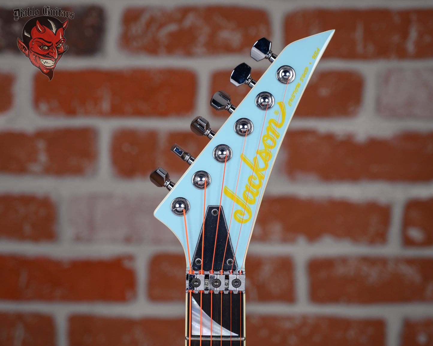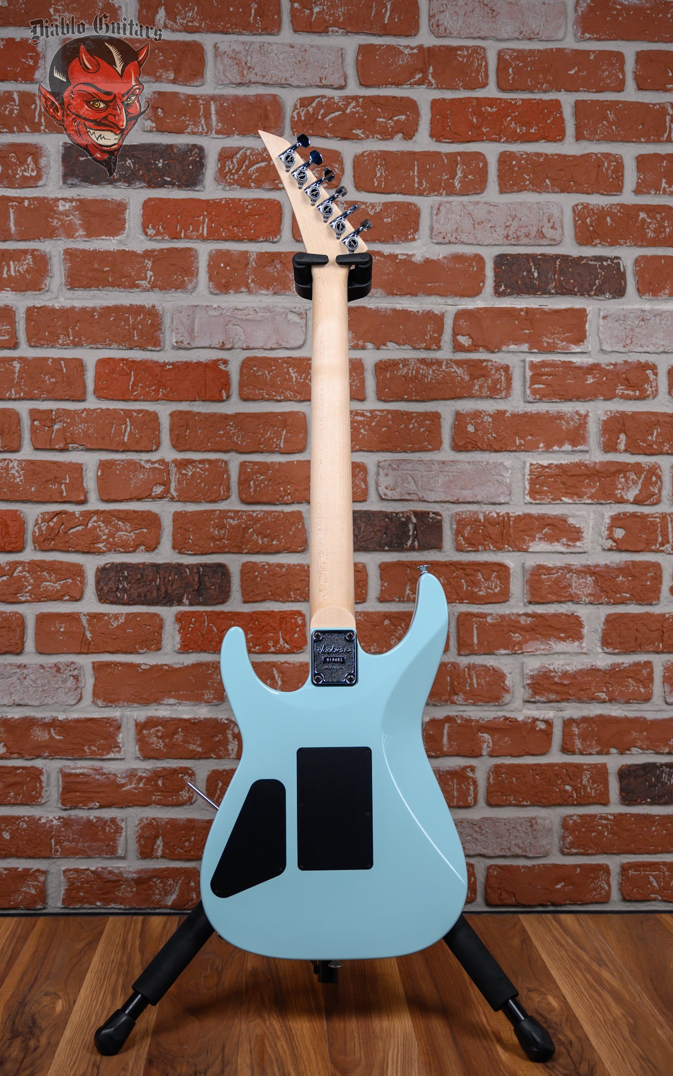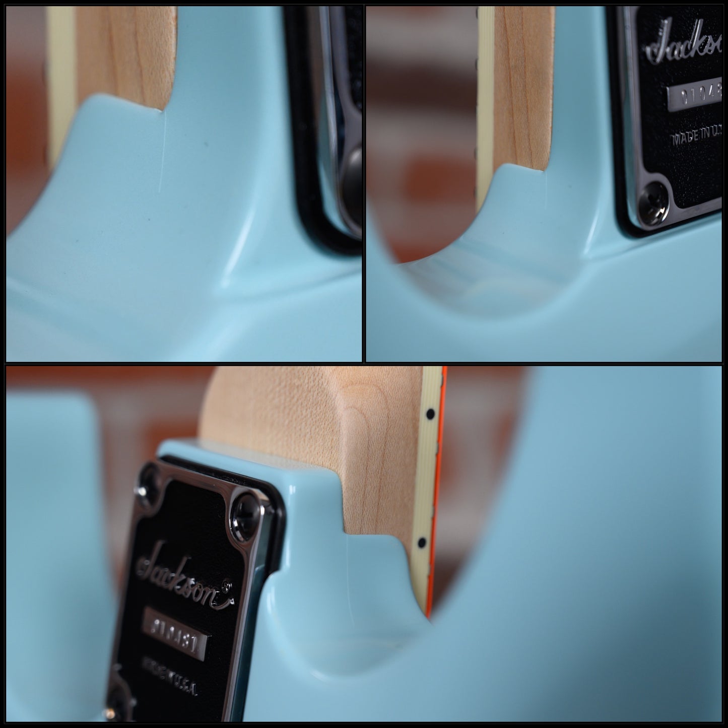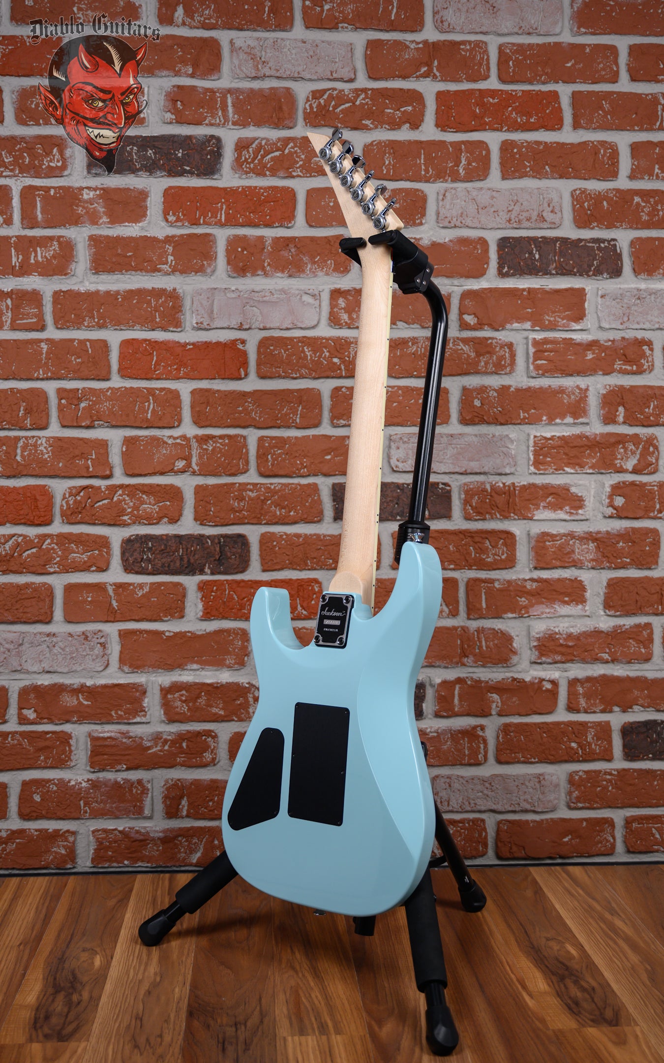 New Jackson USA Custom Shop Dinky 1-H FR84 in Daphne Blue finish made in 2025 with Original Hard Shell Case (B-stock). this guitar features a solid alder body, maple neck and bound ebony fingerboard with a bound color matched headstock with graffiti yellow logo. Equipped with a single Dimarzio super distortion in the bridge position and controlled by one master volume pot. The 25.5" scale length neck has mother of pearl sharkfin inlays and luminlay side markers with 22 jumbo stainless steel frets on a compound 12"-16" radius with a standard neck profile. The hardware is comprised of chrome gotoh magnum Lock-Trad tuning machines with cloche heads, a Floyd Rose locking nut, a Floyd Rose original FR84 double locking tremolo and brass knurled dome knob.