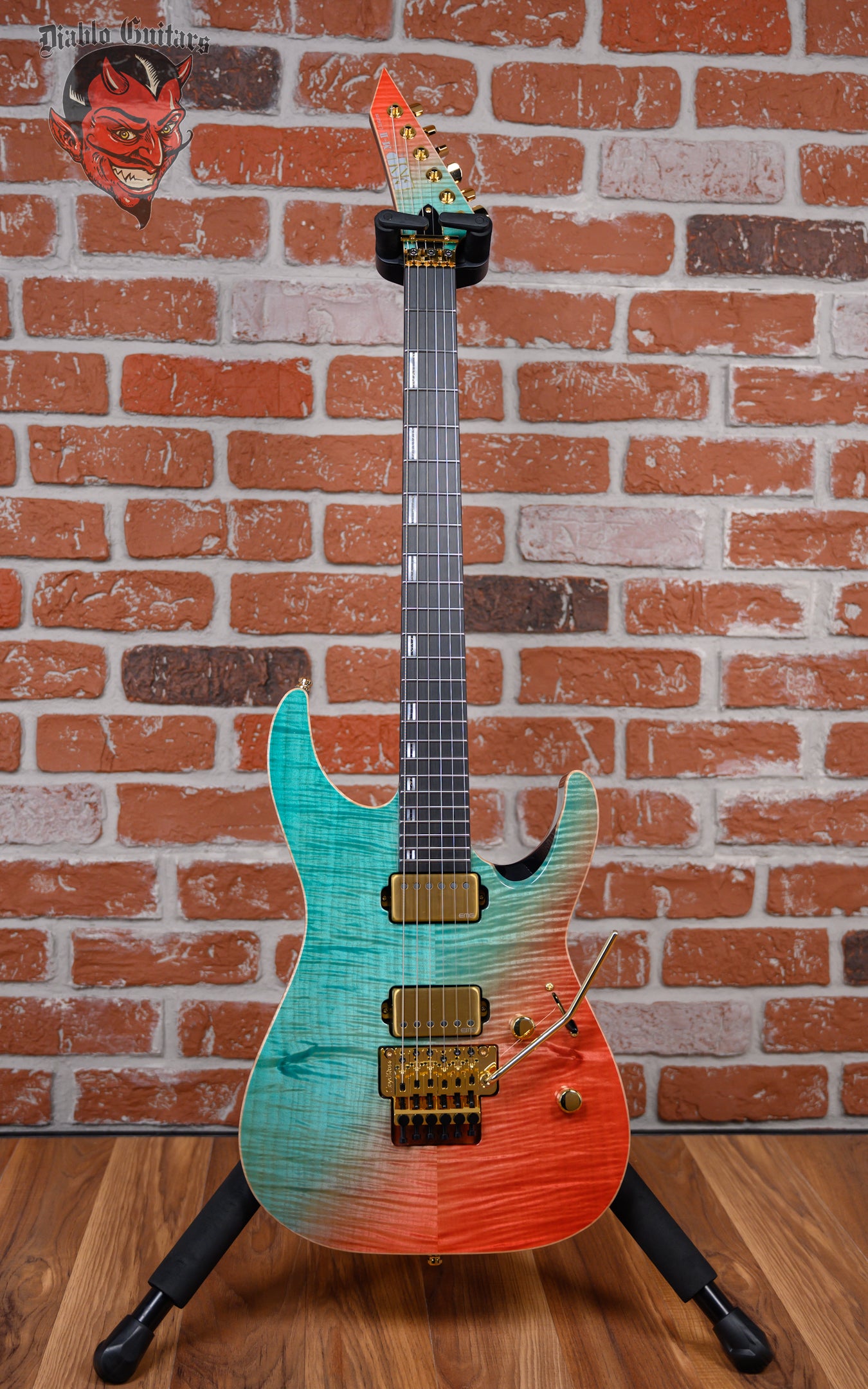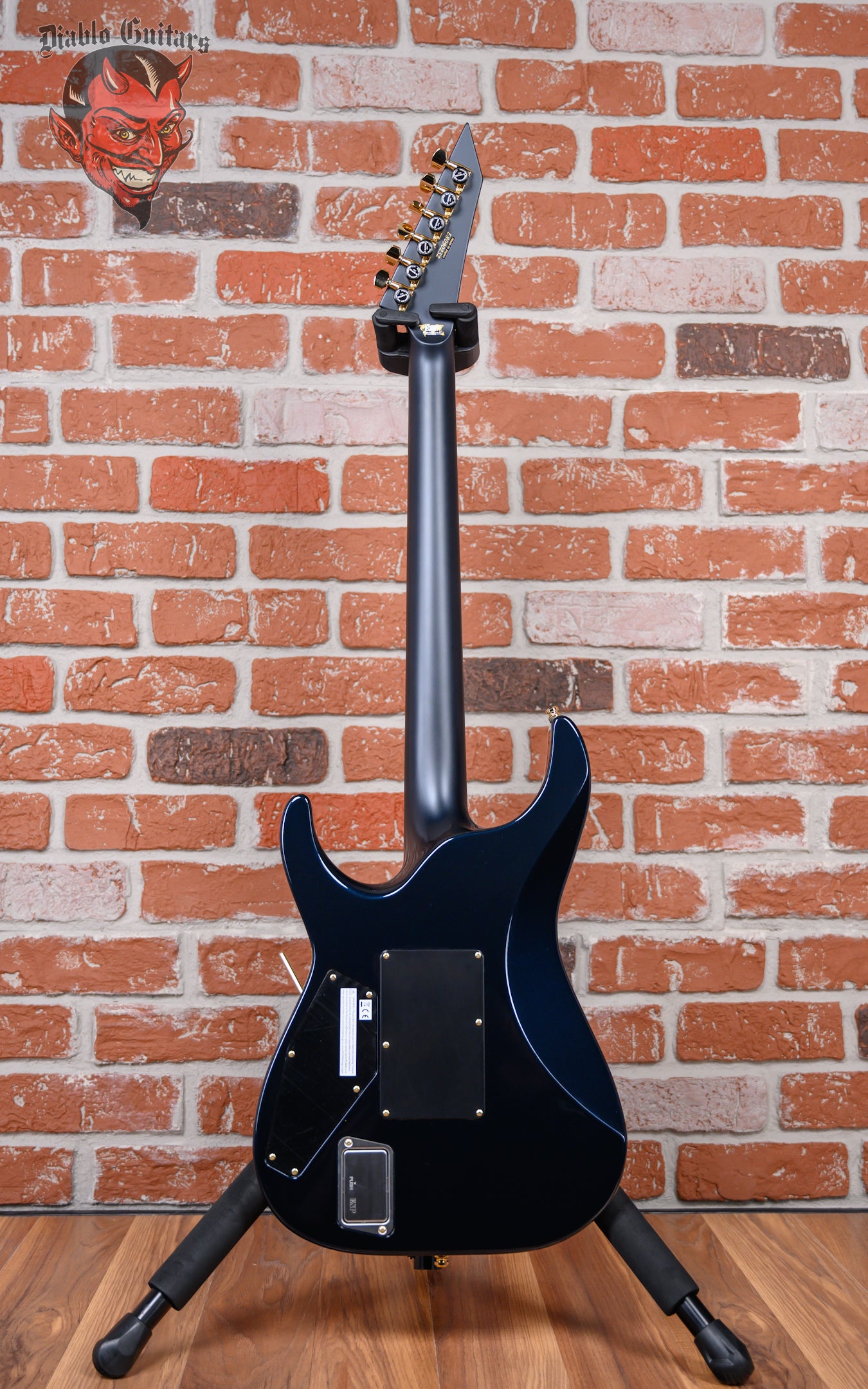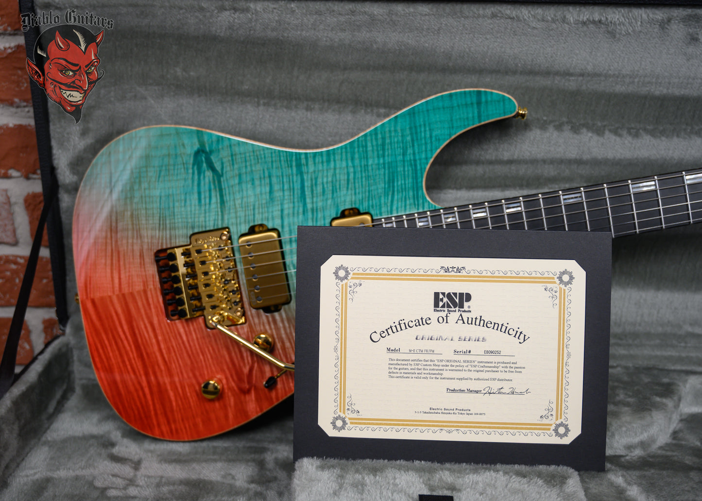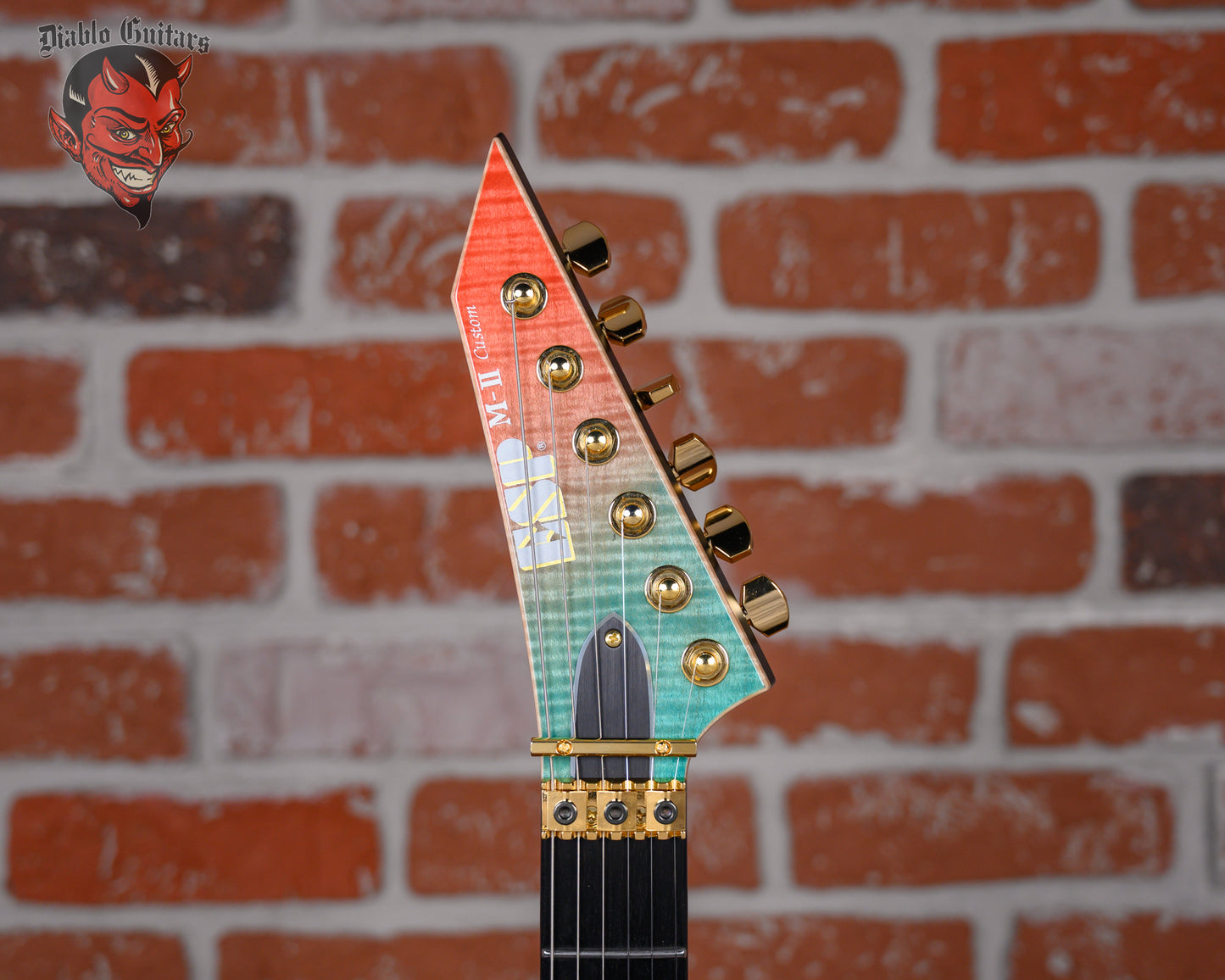 ESP Original Series M-II Custom FM FR in Reverse Pink Blue Gradation Finish made in 2025 with Original Hard Shell Case. This guitar features a solid alder body, natural bound flame maple top, 3-Piece maple neck-thru and bound ebony fingerboard with a reverse, natural bound and color matched flame maple overlay headstock. Equipped with a pair of Brushed gold EMG 66TW in the neck position and a EMG 57TW in the bridge position. Controlled by 1 volume with push/pull coil tap, 1 tone pot with push/pull coil tap and a 3-Way blade switch. The 25.5" scale length neck has mother of pearl/ recon stone offset double stripe inlays, luminlay side markers with 24 extra jumbo frets on a 305mm radius with a thin U profile. The hardware is comprised of gold Gotoh magnum Lock-Trad tuning machines with cloche heads, a Floyd Rose locking nut, a Floyd Rose original double locking tremolo bridge and gold knurled Dome knobs.