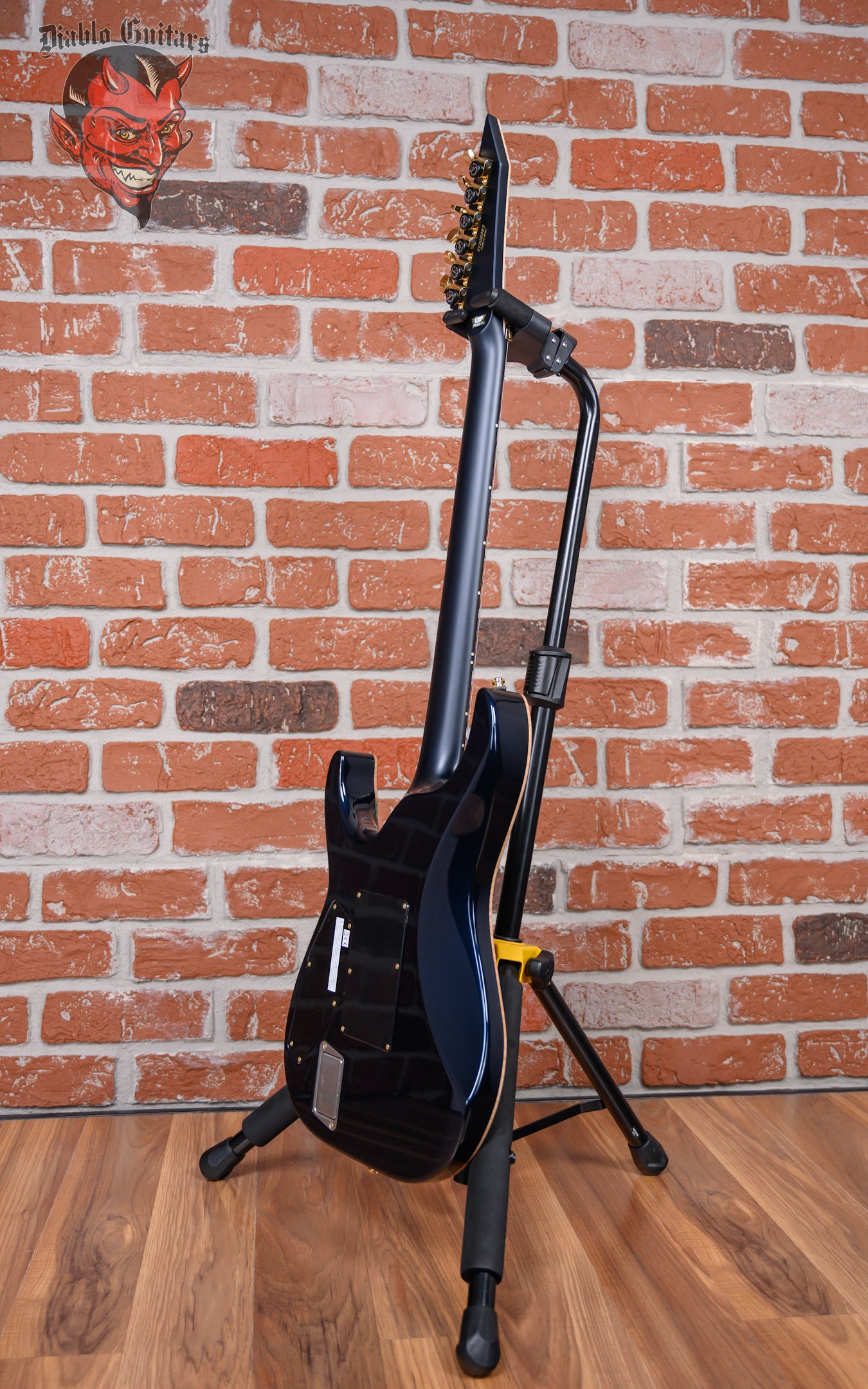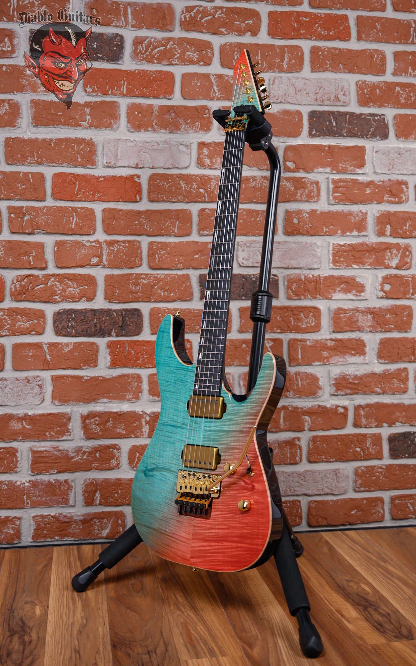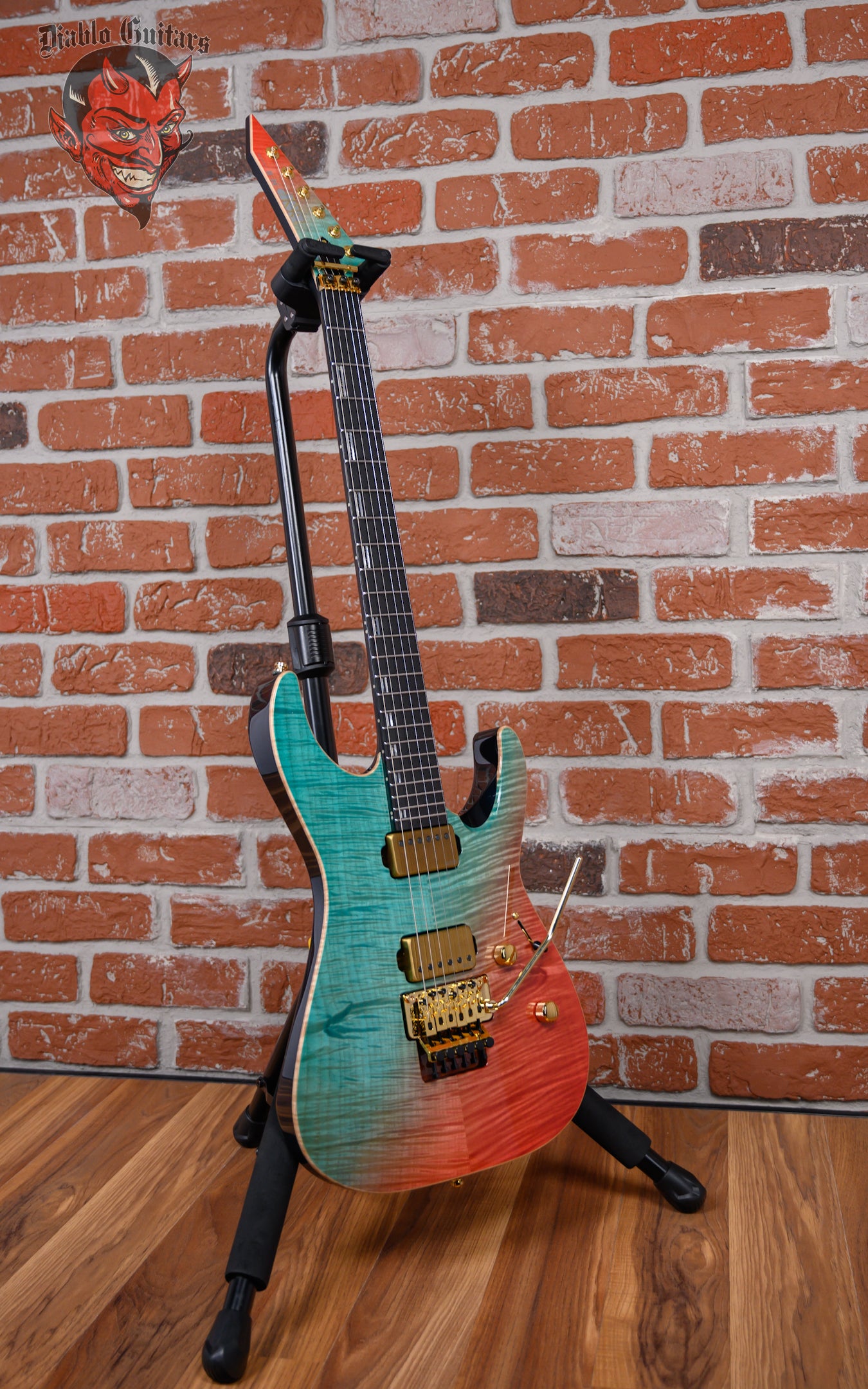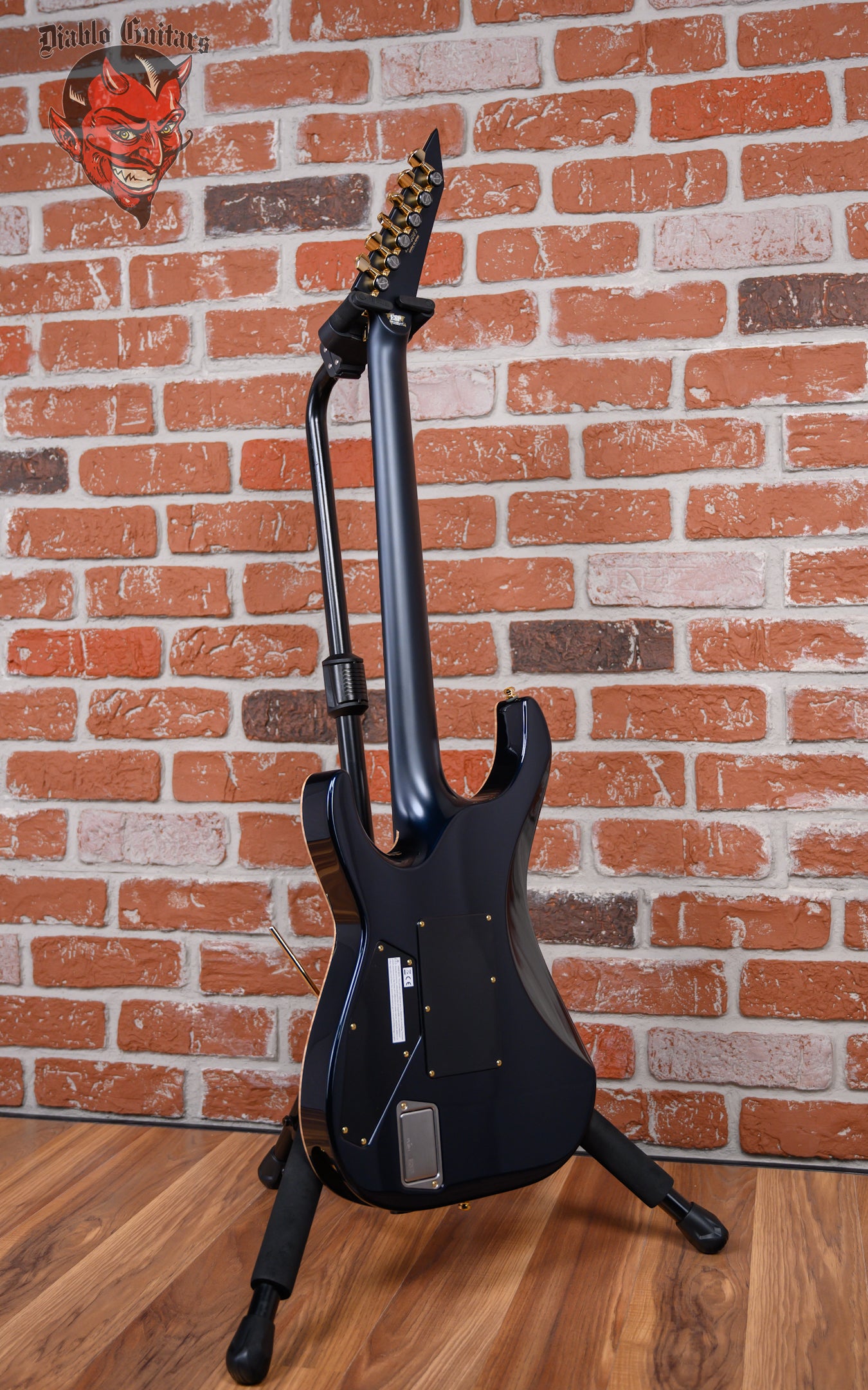 ESP Original Series M-II Custom FM FR in Reverse Pink Blue Gradation Finish made in 2025 with Original Hard Shell Case. This guitar features a solid alder body, natural bound flame maple top, 3-Piece maple neck-thru and bound ebony fingerboard with a reverse, natural bound and color matched flame maple overlay headstock. Equipped with a pair of Brushed gold EMG 66TW in the neck position and a EMG 57TW in the bridge position. Controlled by 1 volume with push/pull coil tap, 1 tone pot with push/pull coil tap and a 3-Way blade switch. The 25.5" scale length neck has mother of pearl/ recon stone offset double stripe inlays, luminlay side markers with 24 extra jumbo frets on a 305mm radius with a thin U profile. The hardware is comprised of gold Gotoh magnum Lock-Trad tuning machines with cloche heads, a Floyd Rose locking nut, a Floyd Rose original double locking tremolo bridge and gold knurled Dome knobs.