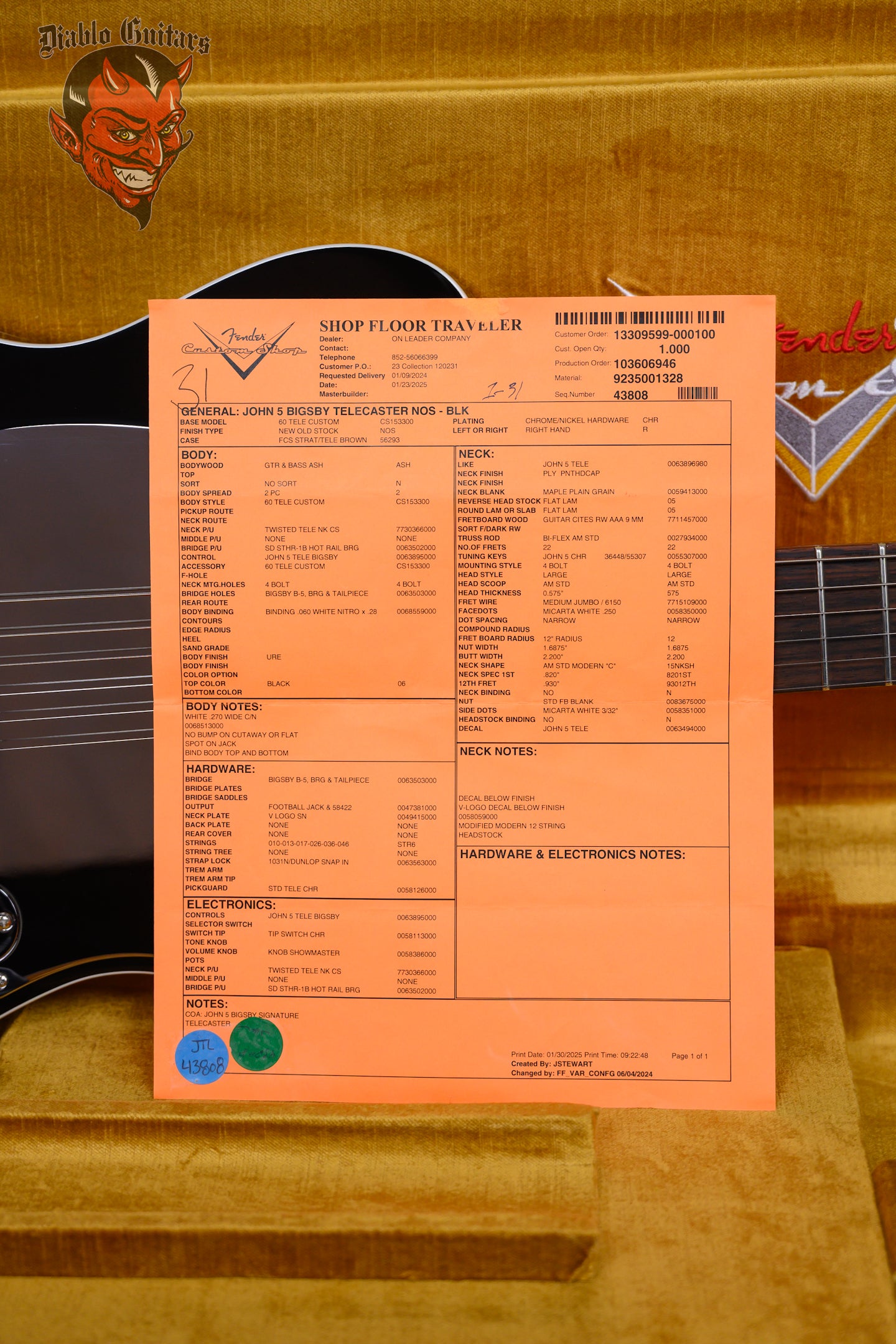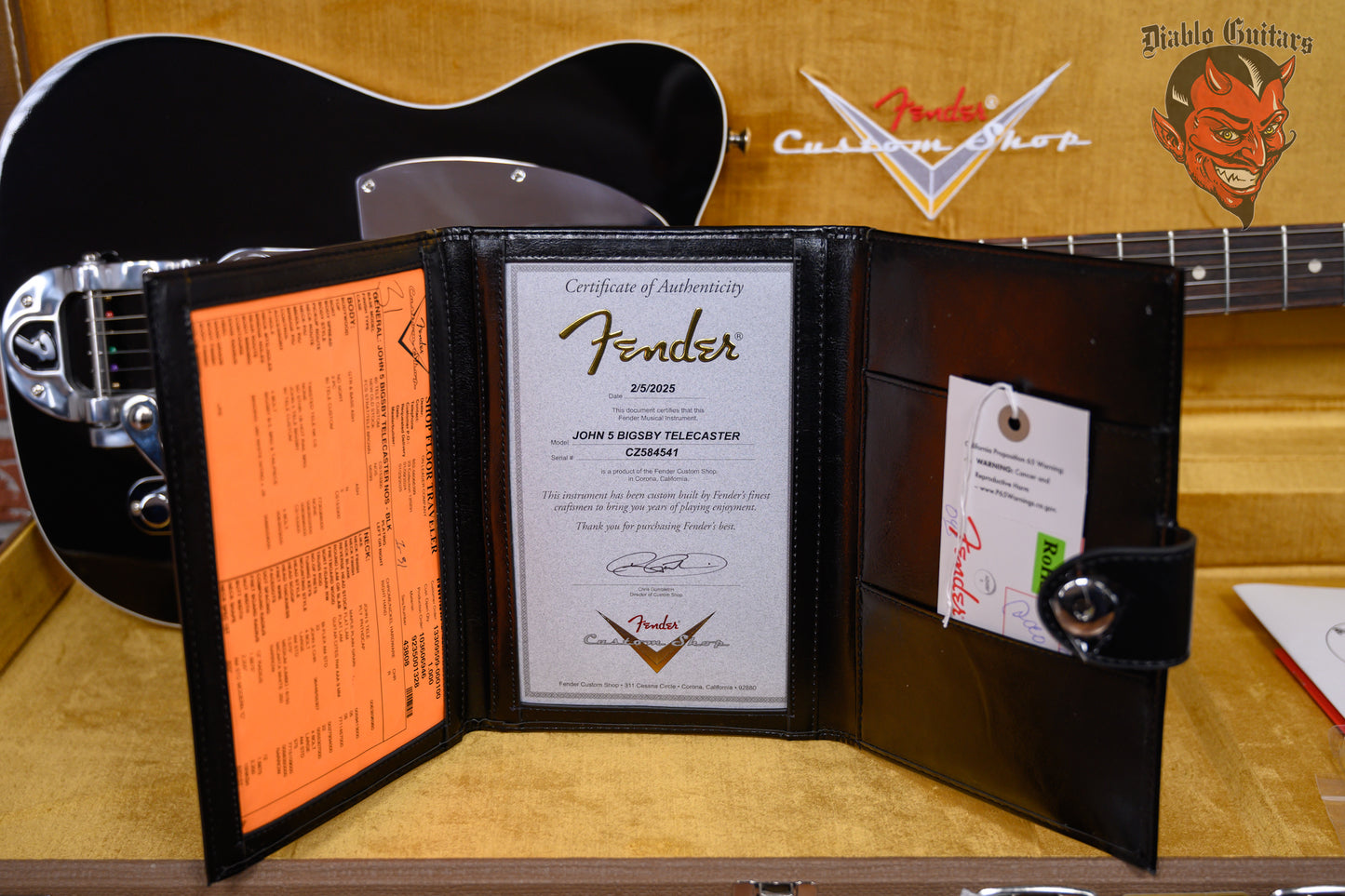 Fender USA Custom Shop John 5 Signature Bigsby Telecaster in Black finish made in 2025 with Original Hard Shell Case. This guitar features a double bound solid select ash body, maple neck and rosewood fingerboard with a color matched headstock. Equipped with a Fender Custom Shop Twisted Single Coil Tele in the neck position and a Seymour Duncan Hotrails in the bridge position. Controlled by 1 volume, 1 tone pot and a 3-Way blade switch. The 25.5" scale length neck has white dot inlays and white side markers with 22 medium jumbo frets on a 12" radius with a modern "C" profile. The hardware is comprised of chrome Fender Deluxe Cast/Sealed Locking tuning machines with cloche heads, a synthetic bone nut, a Fender 6-Saddle Adjustable Bridge with Fender Bigsby Vibrato Tailpiece and chrome knurled flat top knobs with a chrome pickguard.