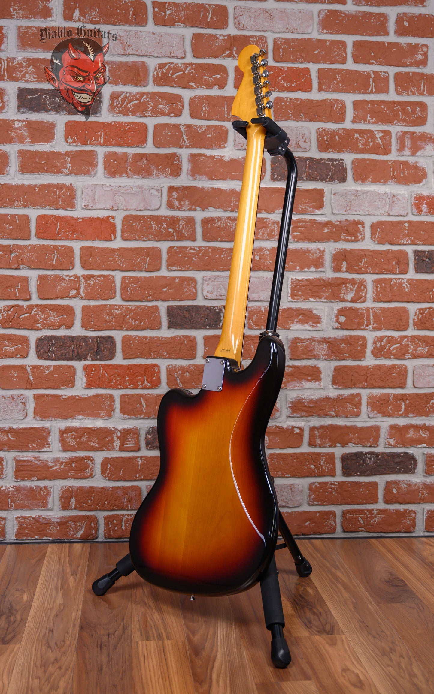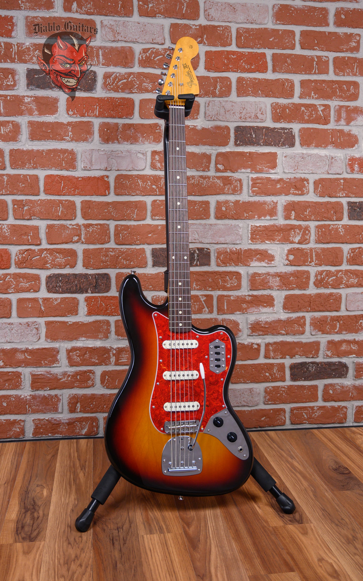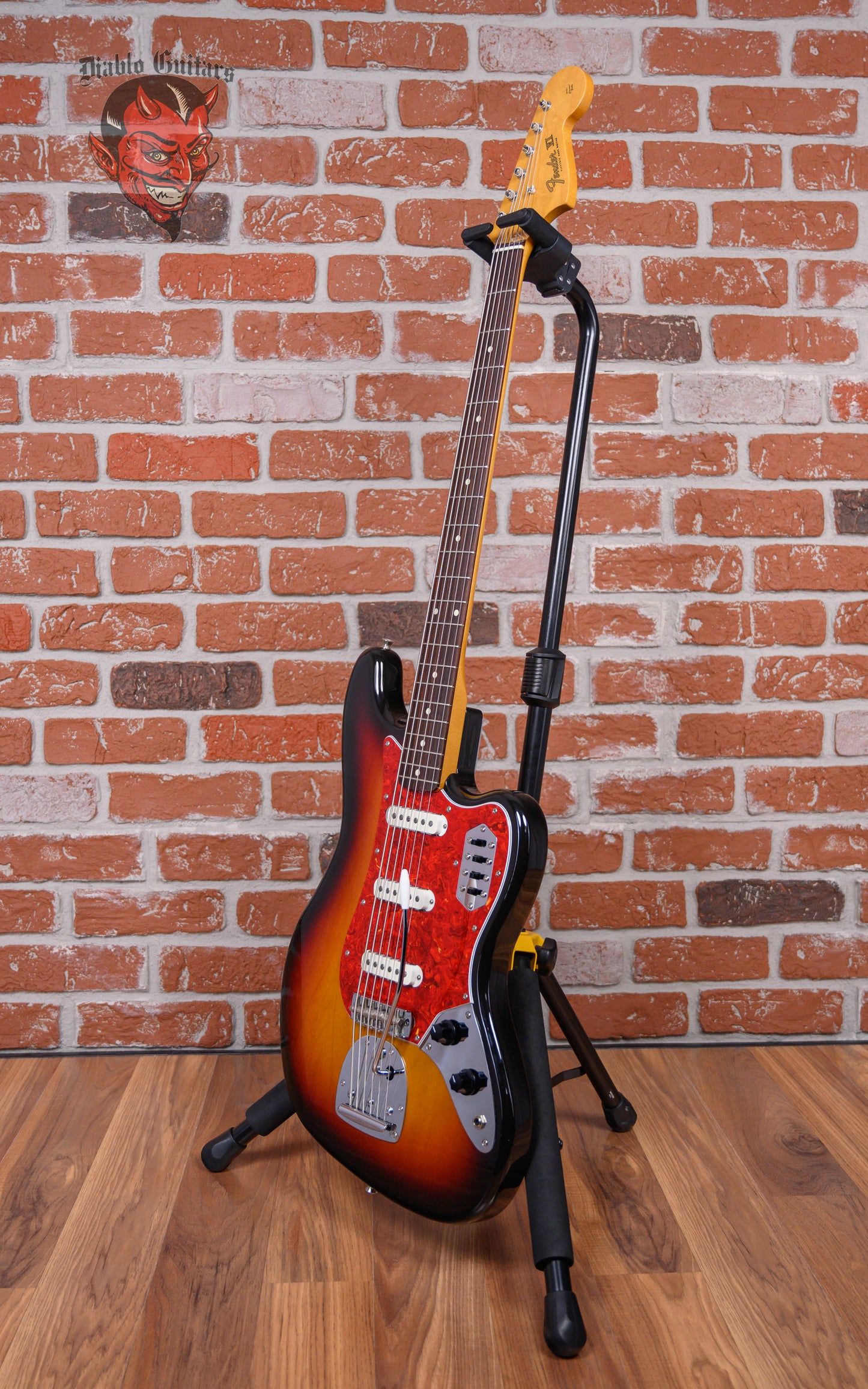 Fender Bass VI in 3-Color Sunburst finish made in 1994 with Gigbag. This guitar features a solid alder body, maple neck and rosewood fingerboard. Equipped with a set of Fender JG-Single Coils in the neck, middle, and bridge positions. Controlled by 1 volume pot, 1 tone pot, 3x individual pickup on/off switches and 1x low cut switch. The 30.3" scale length neck has white dot inlays and white side markers with 21 medium frets on a 7.25" radius with an oval type profile. The hardware is comprised of chrome Fender Vintage-Style tuning machines with oval heads, a bone nut, a Fender Floating Tremolo bridge and black grip knobs with a 5-ply red tortoise pickguard.