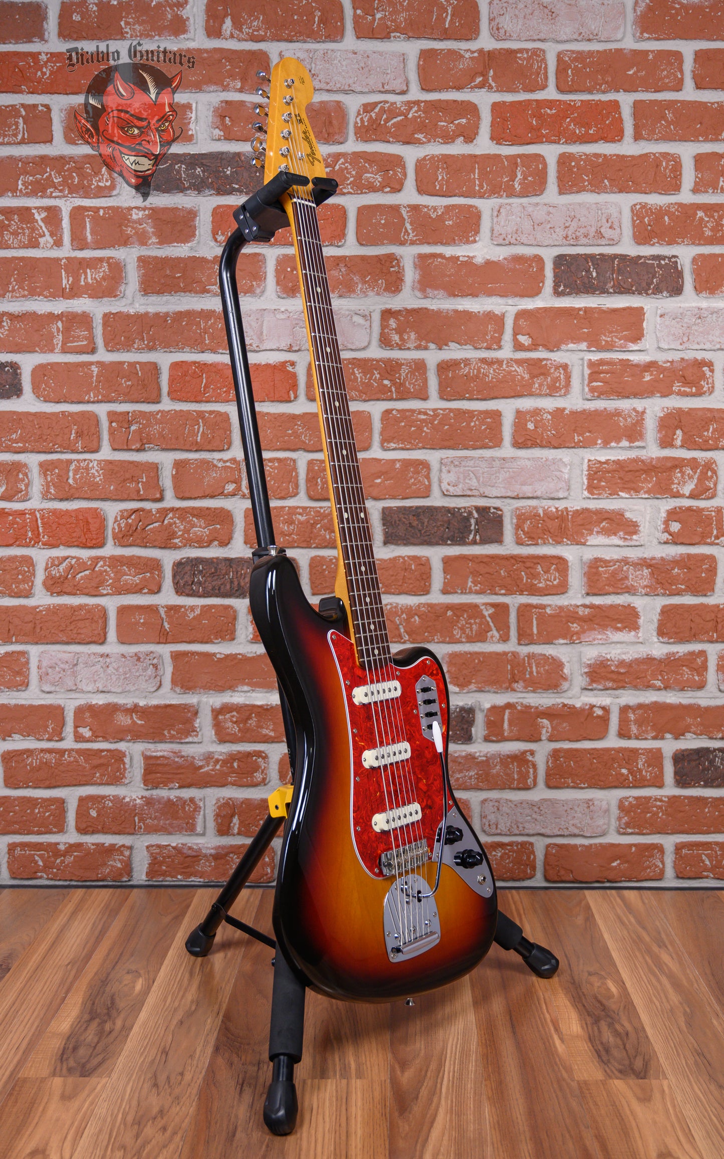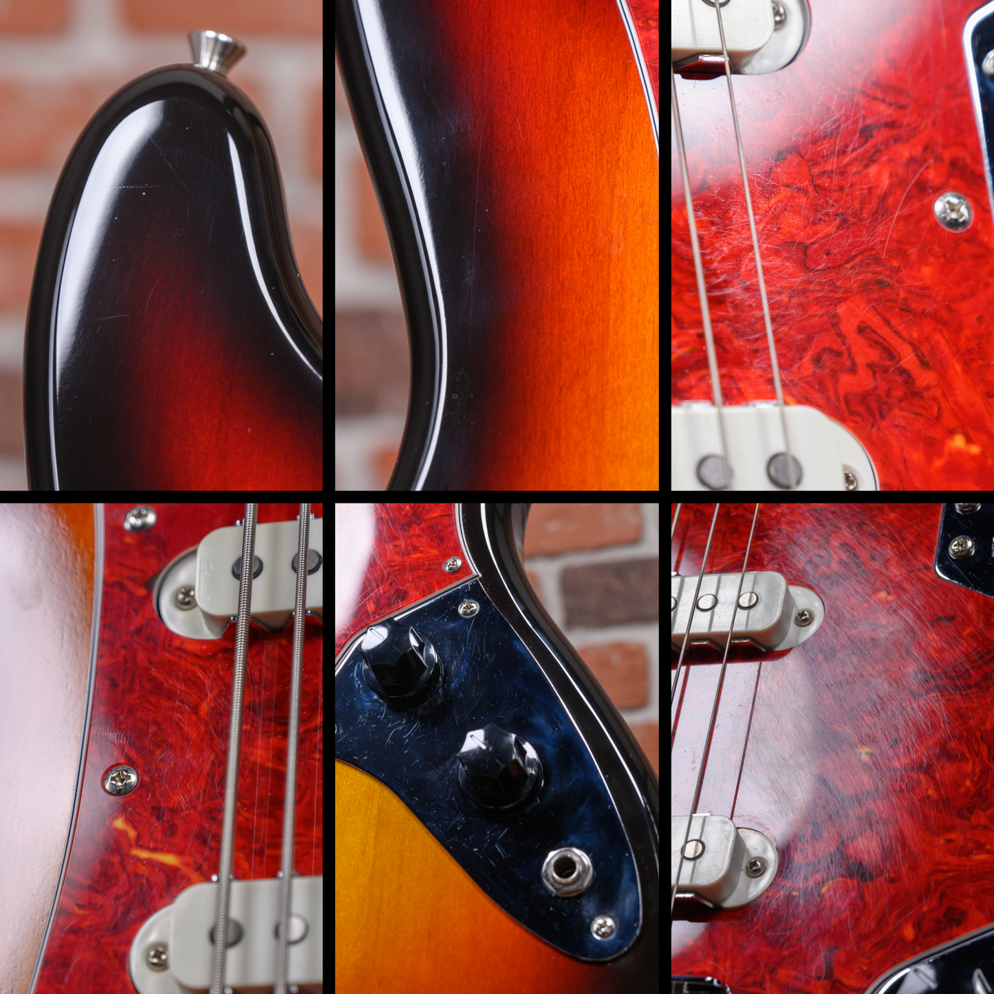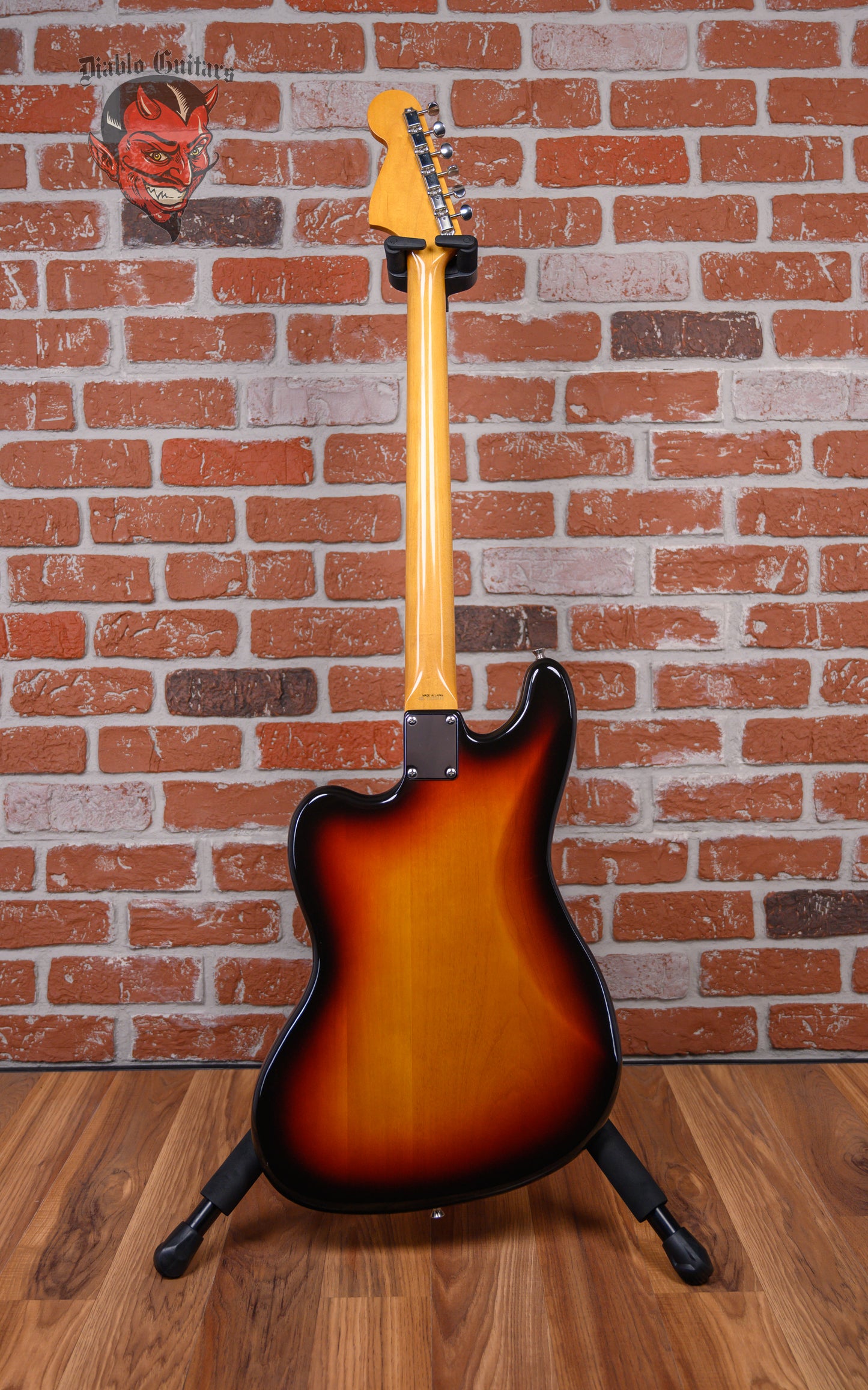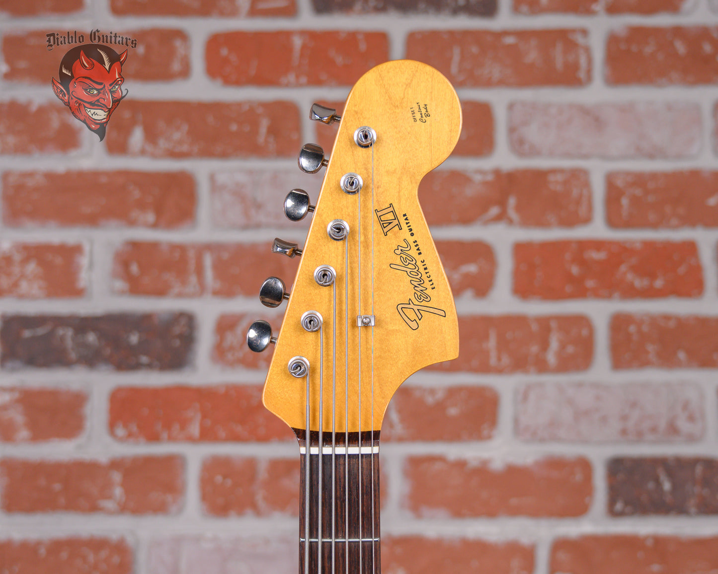 Fender Bass VI in 3-Color Sunburst finish made in 1994 with Gigbag. This guitar features a solid alder body, maple neck and rosewood fingerboard. Equipped with a set of Fender JG-Single Coils in the neck, middle, and bridge positions. Controlled by 1 volume pot, 1 tone pot, 3x individual pickup on/off switches and 1x low cut switch. The 30.3" scale length neck has white dot inlays and white side markers with 21 medium frets on a 7.25" radius with an oval type profile. The hardware is comprised of chrome Fender Vintage-Style tuning machines with oval heads, a bone nut, a Fender Floating Tremolo bridge and black grip knobs with a 5-ply red tortoise pickguard.