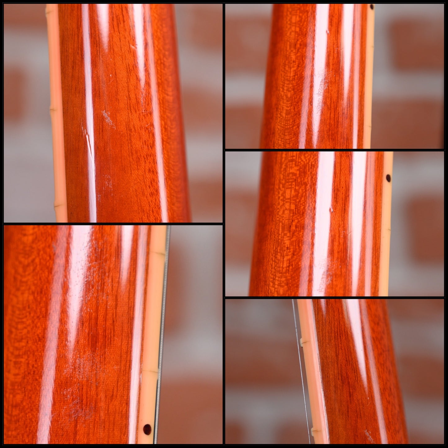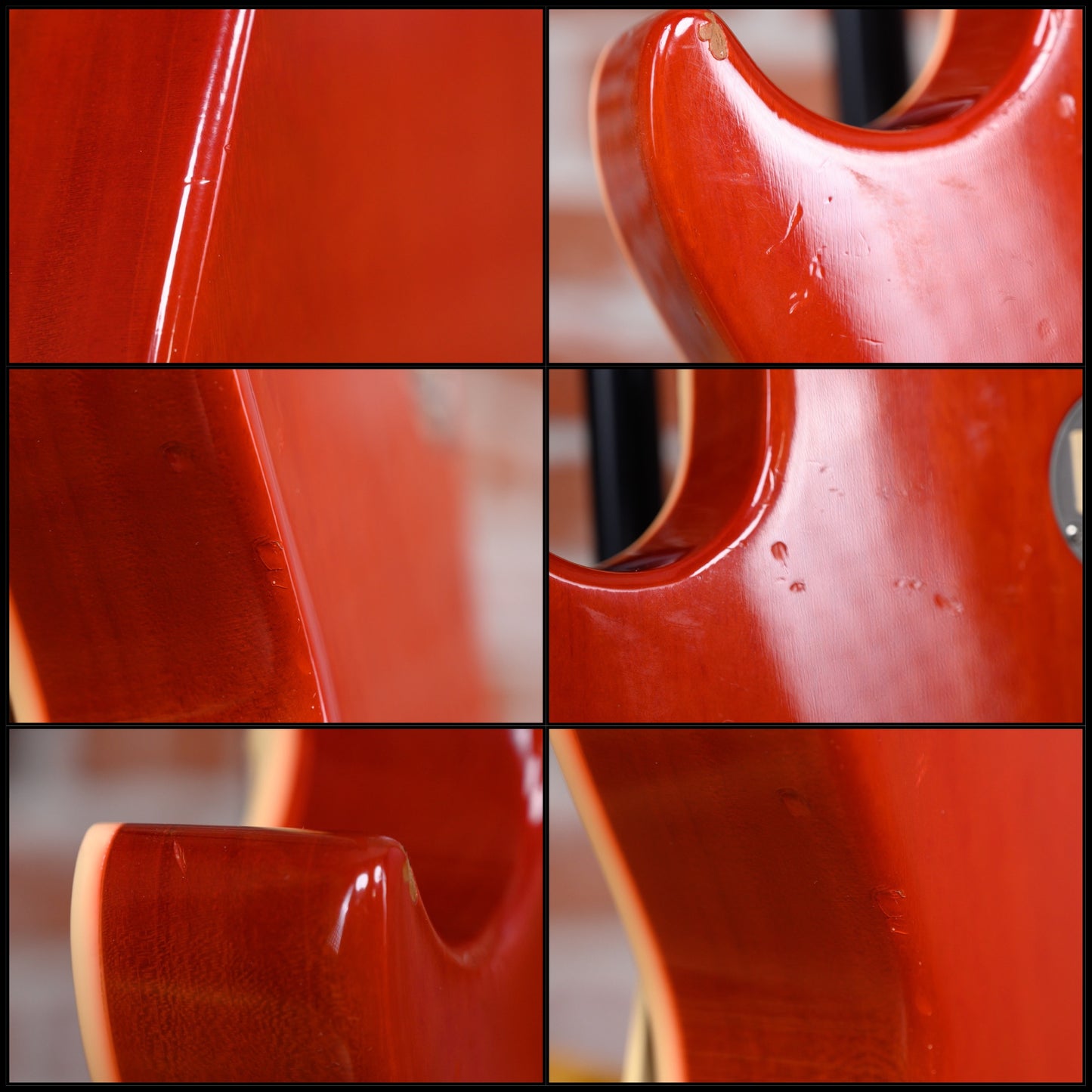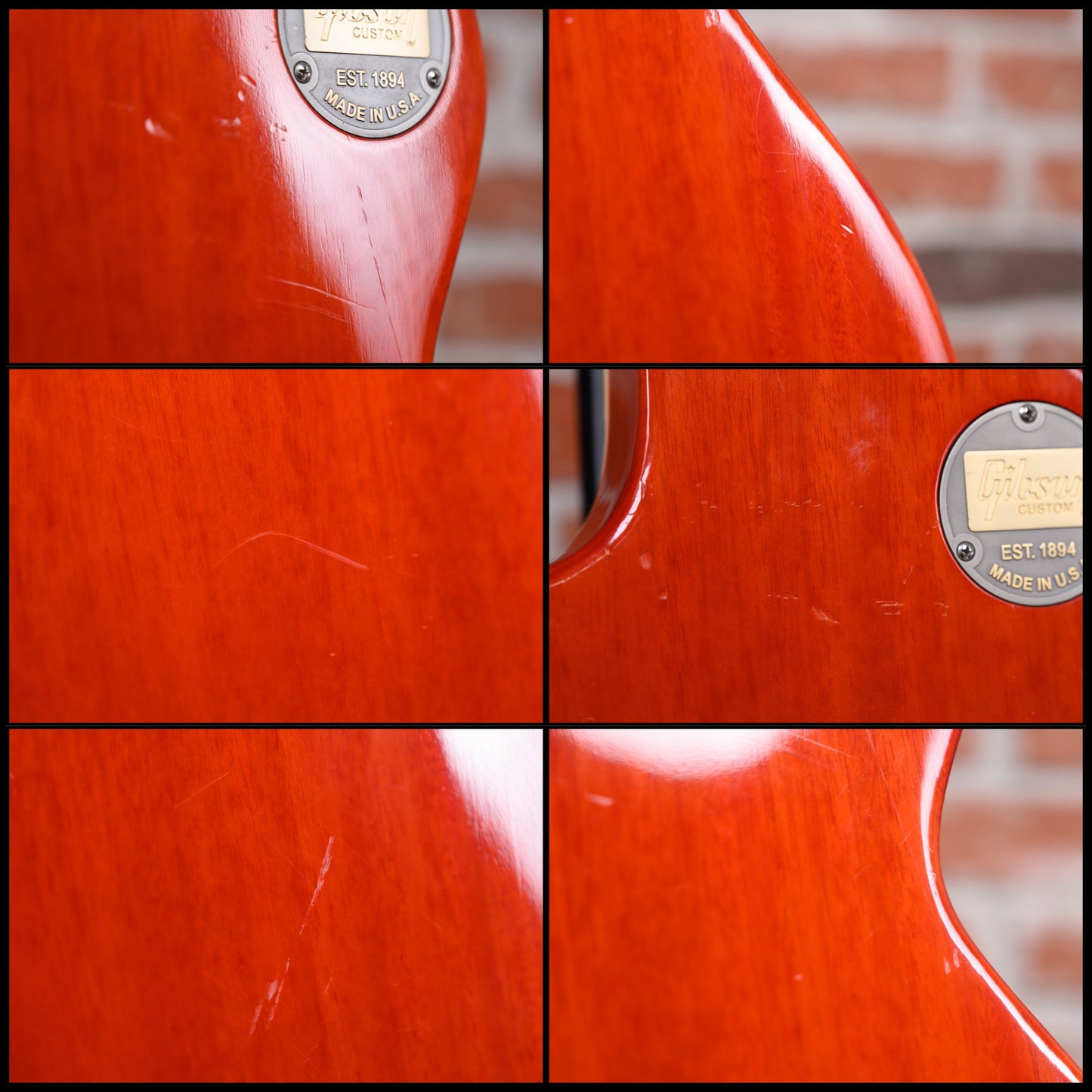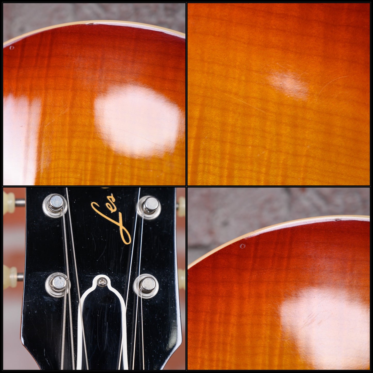 This guitar is in overall very good condition with some visible signs of play. It has some light surface marks, some light surface scratches, its back has some visible belt rash /dings and dents. Its top and neck has some light marks/ dings. The binding shows light signs of splits at the fret ends. (See Pics)