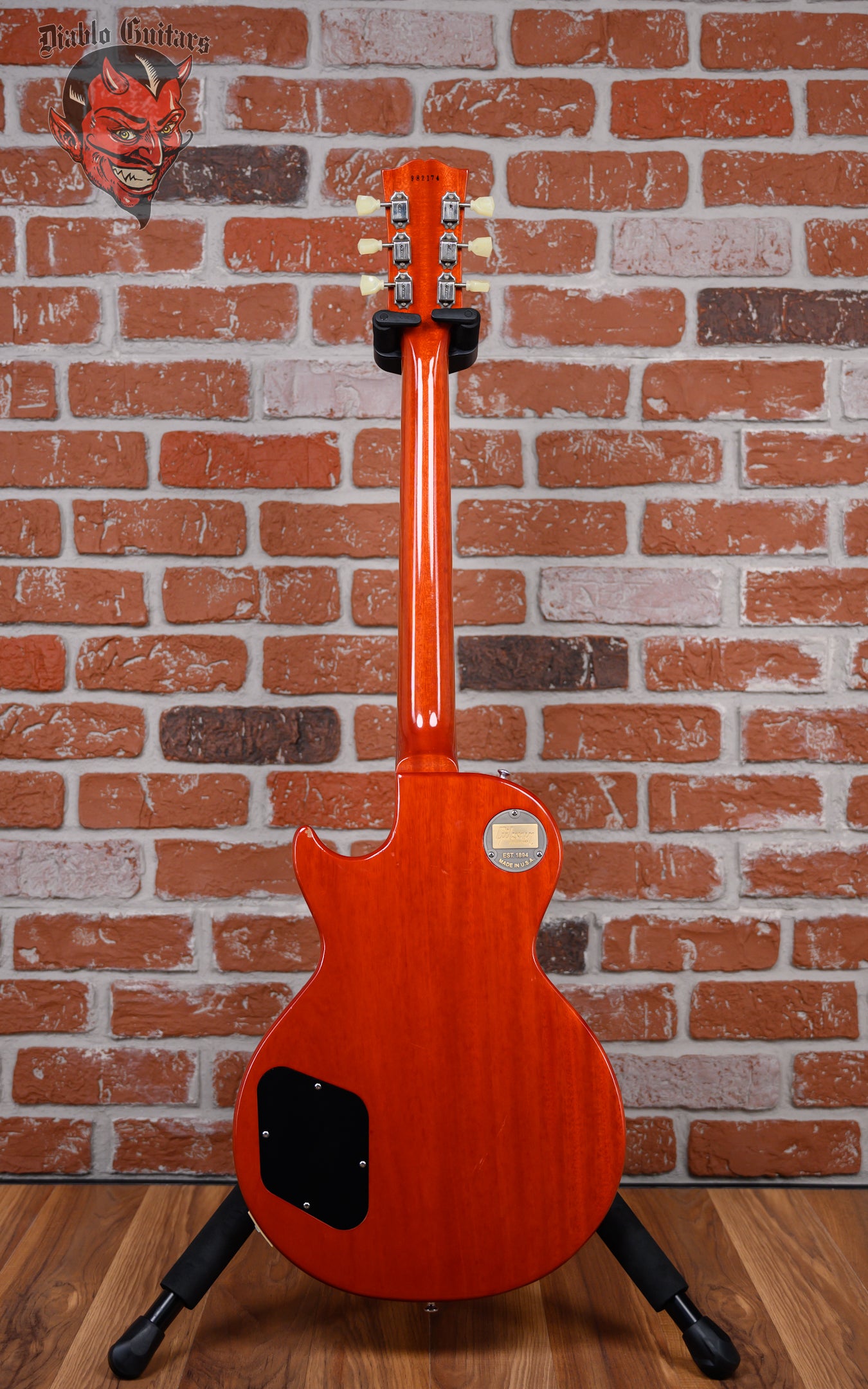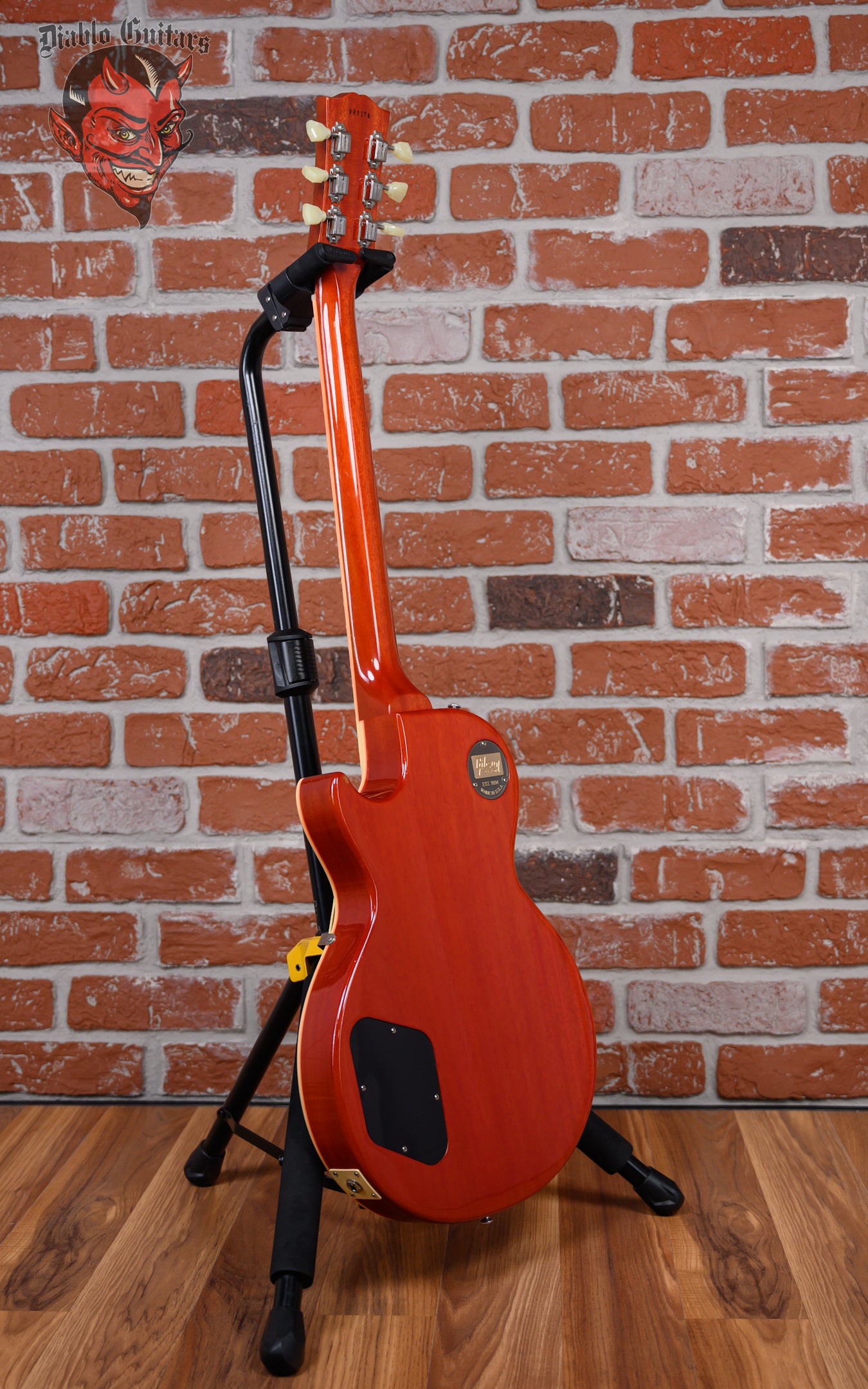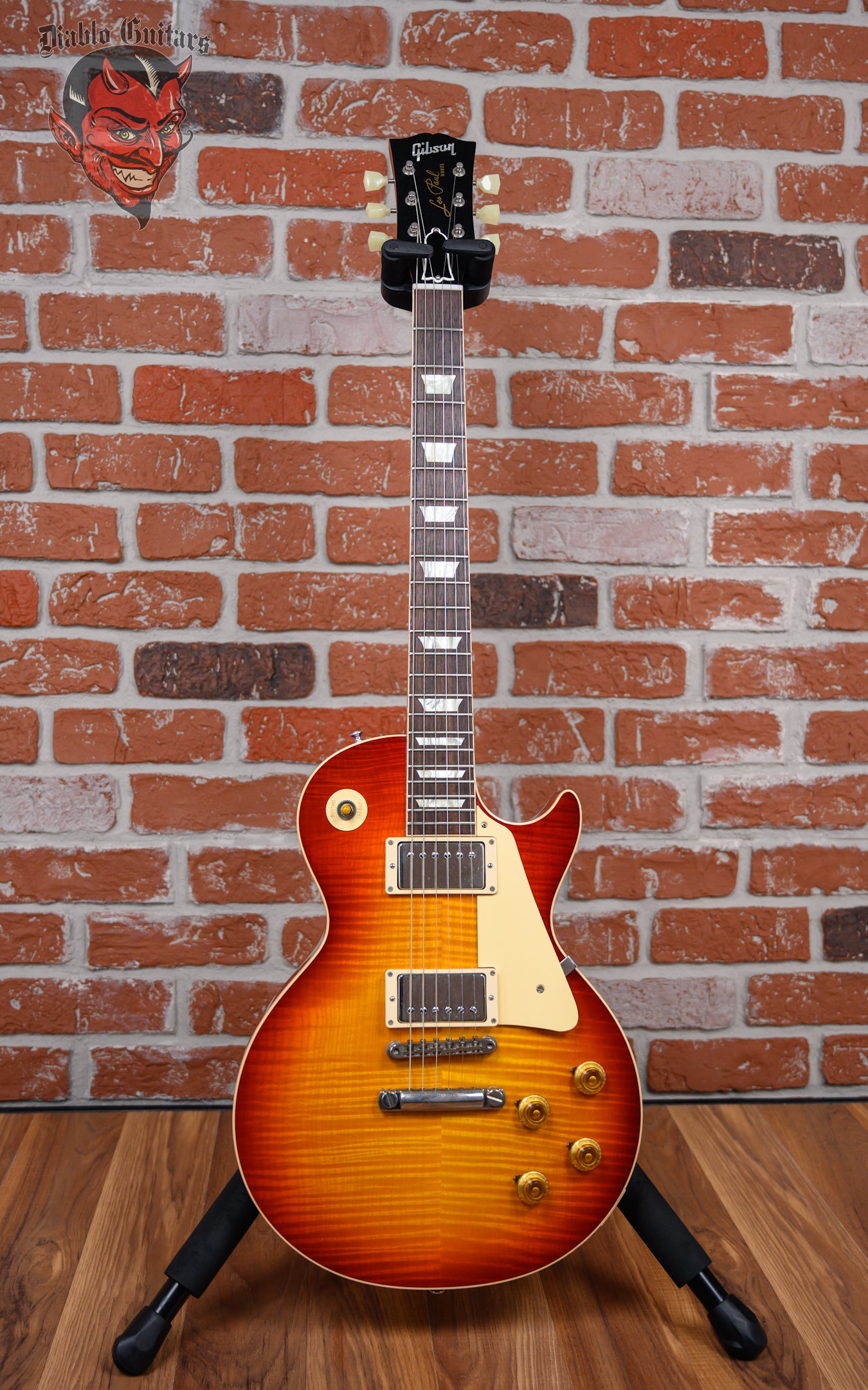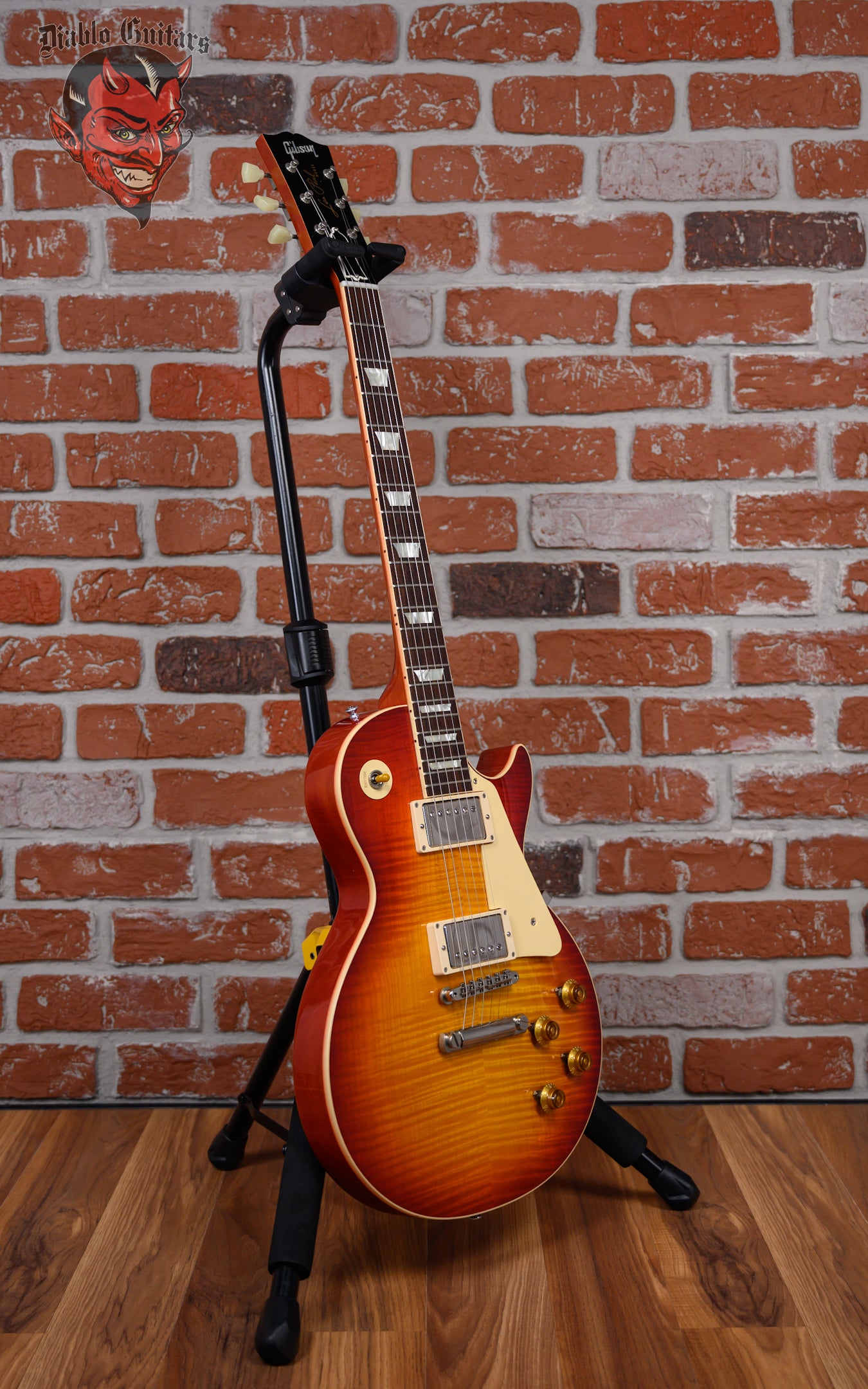 Gibson Custom Shop Historic 1959 Historic Les Paul Standard Flame Maple Top in Vintage Cherry Sunburst finish made in 2018 with Original Hard Shell Case. This guitar features a solid mahogany body with a bound flamed maple top, mahogany neck and bound rosewood fingerboard. Equipped with a pair of Gibson Custombuckers in the neck position and bridge position. Controlled by 2 volume, 2 tone pots and a 3-Way toggle switch comprised by CTS pots and Bumblebee capacitors. The 24.75" scale length neck has cellulose nitrate trapezoid inlays, tortoise side markers with 22 medium jumbo frets on a 12" radius with a ‘59 medium "C" profile. The hardware is comprised of aged nickel Kluson deluxe single line single ring tuning machines with keystone heads, a nylon nut, a Gibson ABR-1 Tune-O-Matic bridge and gold top hat knobs with a laminated cellulose acetate butyrate cream pickguard.