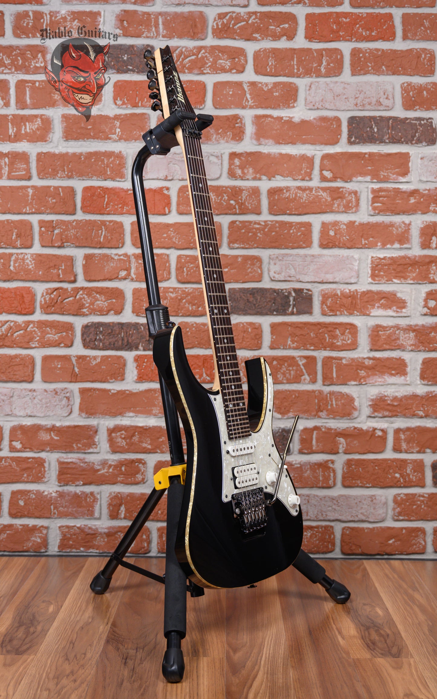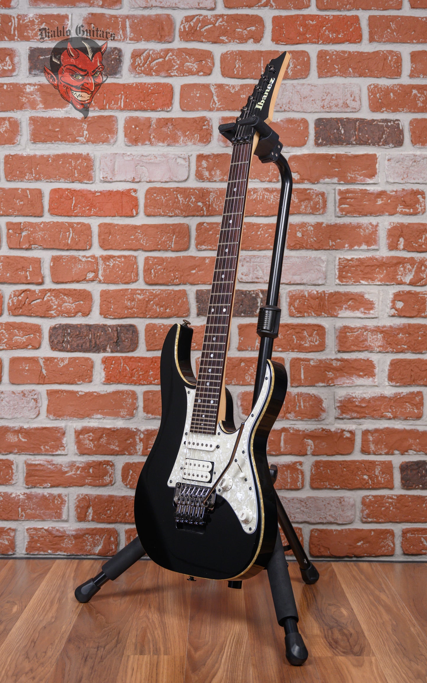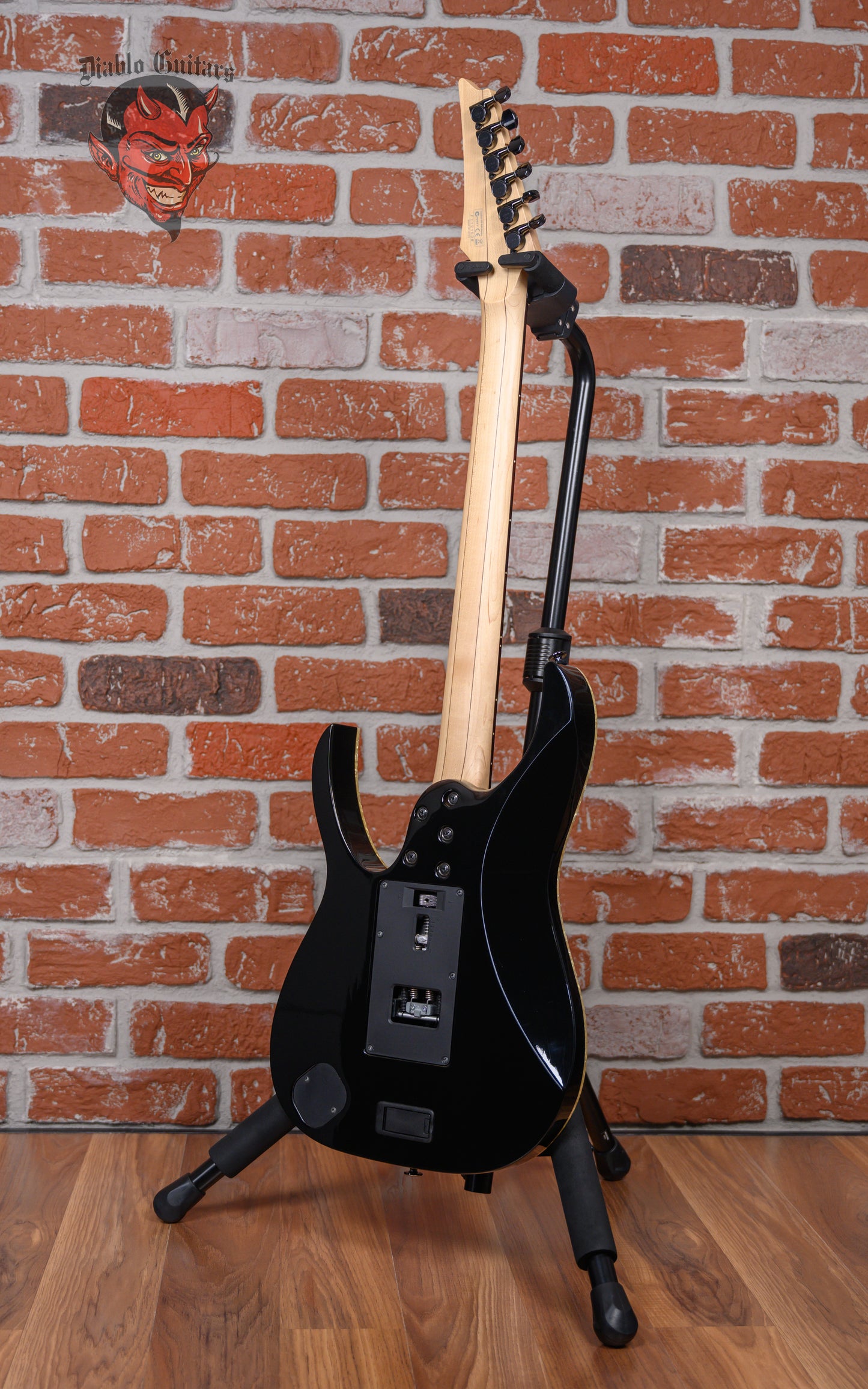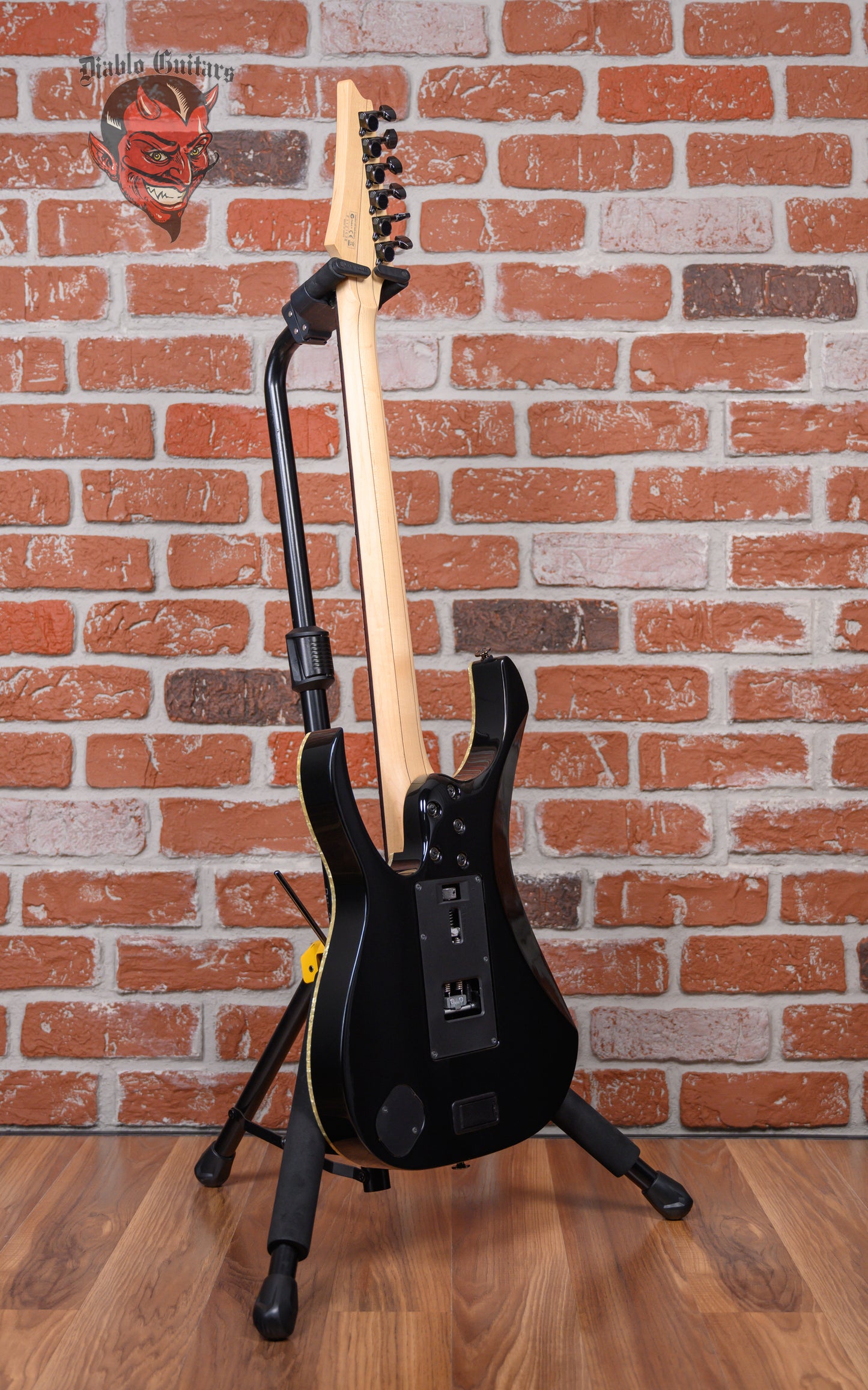 Ibanez Prestige RG2011SC in Black finish made in 2011 with Original Hard Shell Case. This guitar features a bound solid alder body, 5-piece maple/walnut neck and rosewood fingerboard. Equipped with a DiMarzio True Velvet in the middle position and a DiMarzio Tone Zone in the bridge position. Controlled by 1 volume pot, 1 tone pot and a 5-way blade switch with coil tapping & neck pickup simulator. The 25.5" scale length neck has pearloid dot inlays and white side markers with 30 jumbo frets on a 430mm radius with an RG2011SC Prestige profile. The hardware is comprised of cosmo black Gotoh sealed die-cast tuning machines with cloche heads, a Top Lok nut, an Ibanez Edge Zero Tremolo bridge w/ ZPS3 Stabilizer and white top hat knobs with a 3-ply white pearloid on black pickguard.