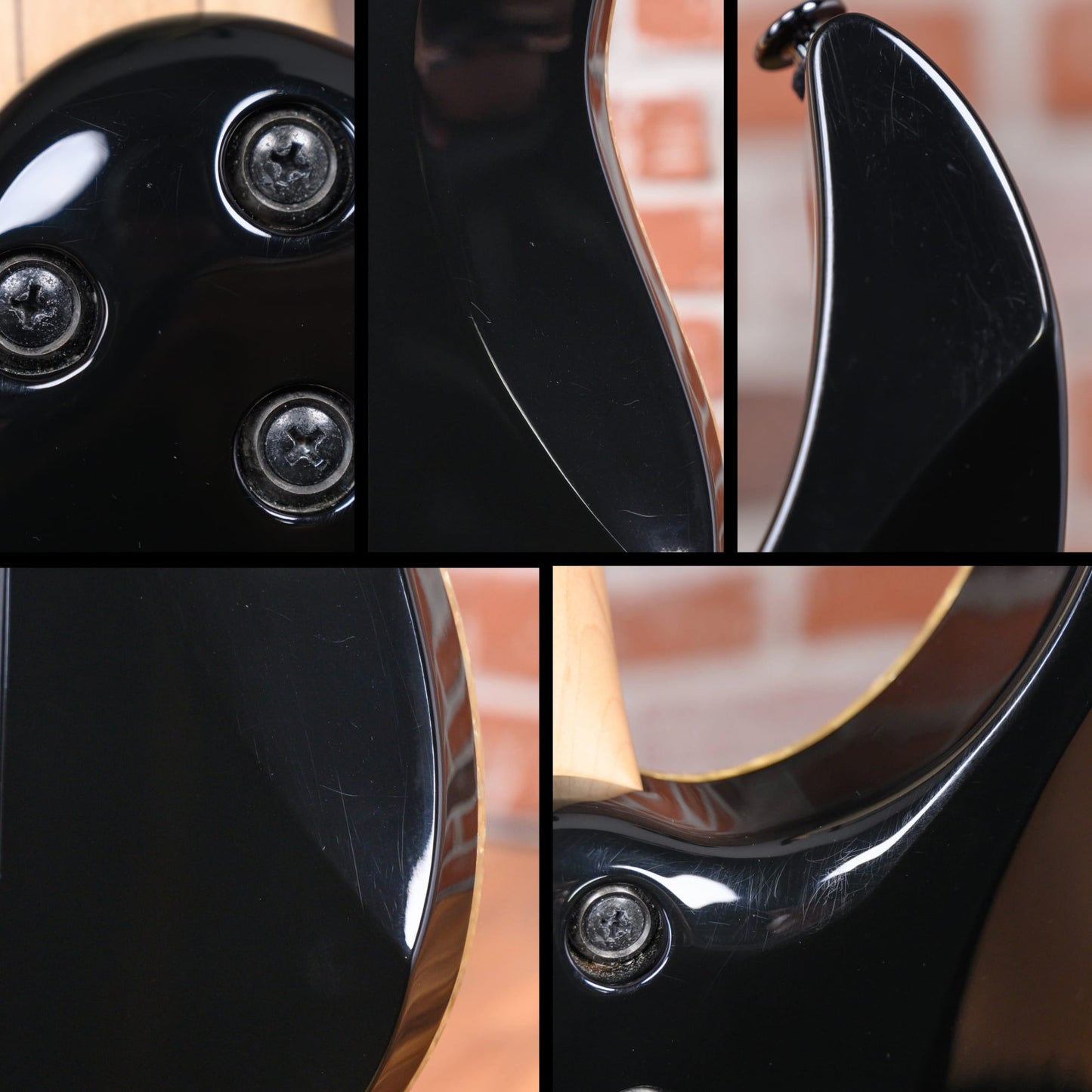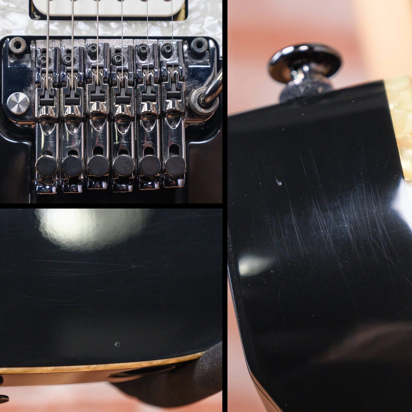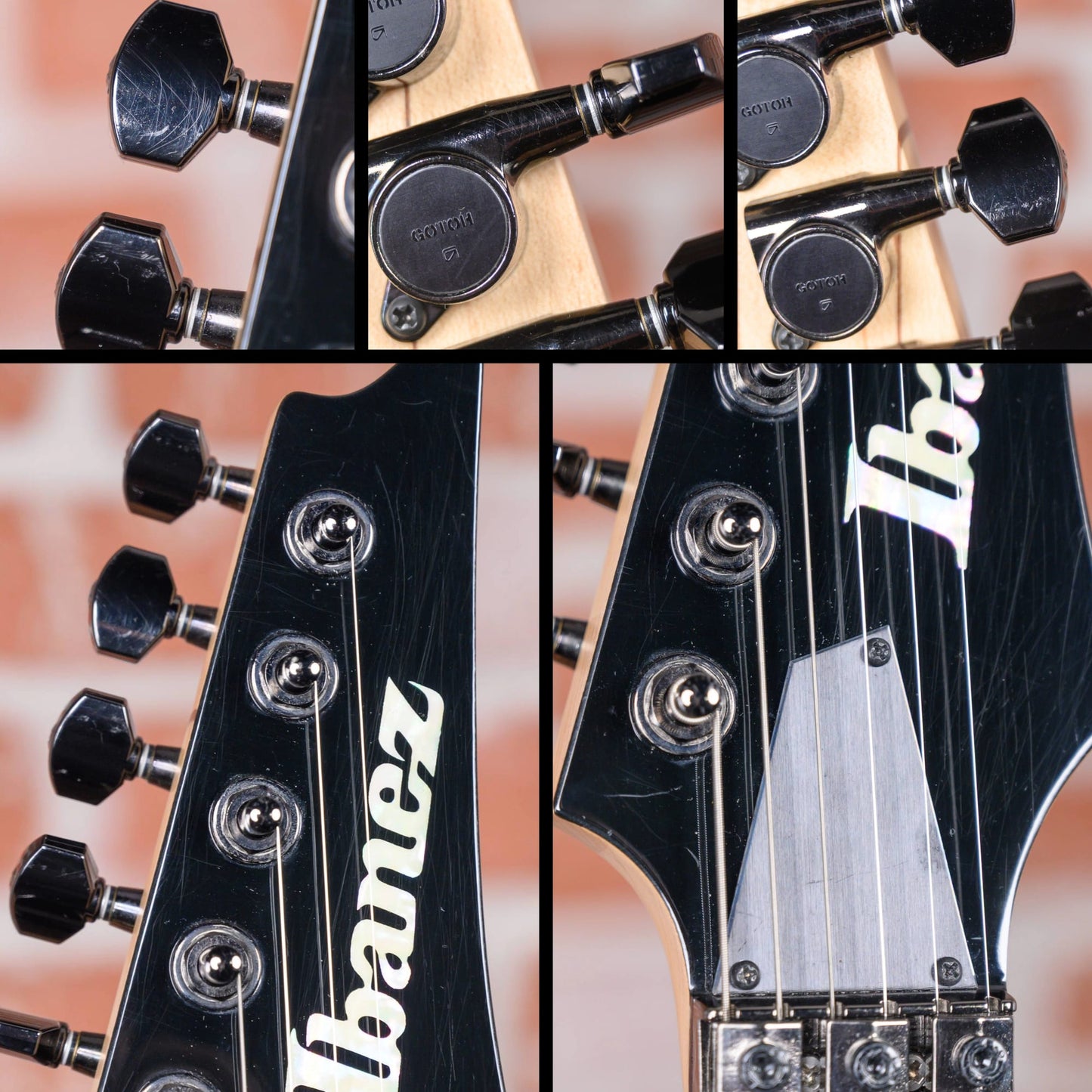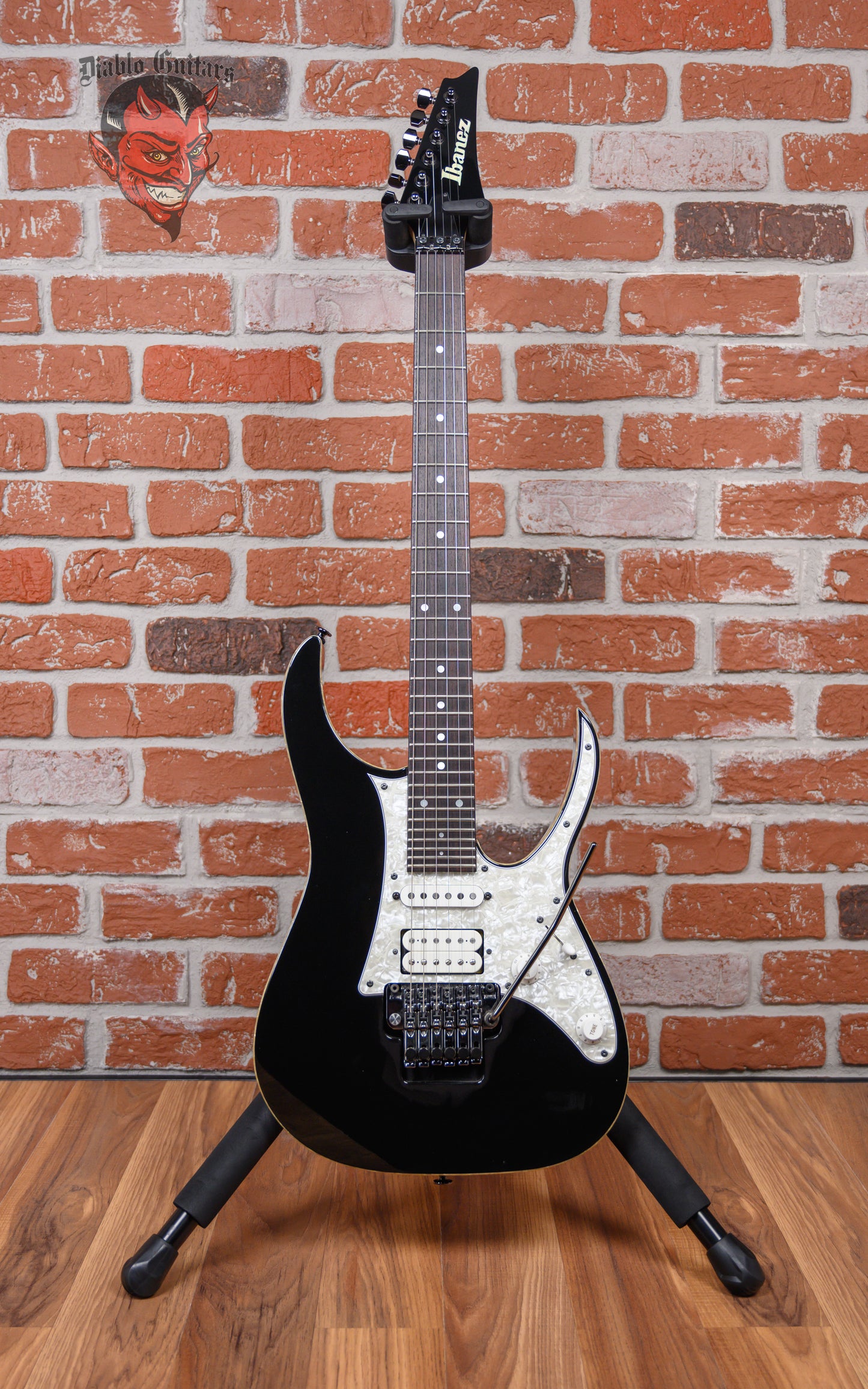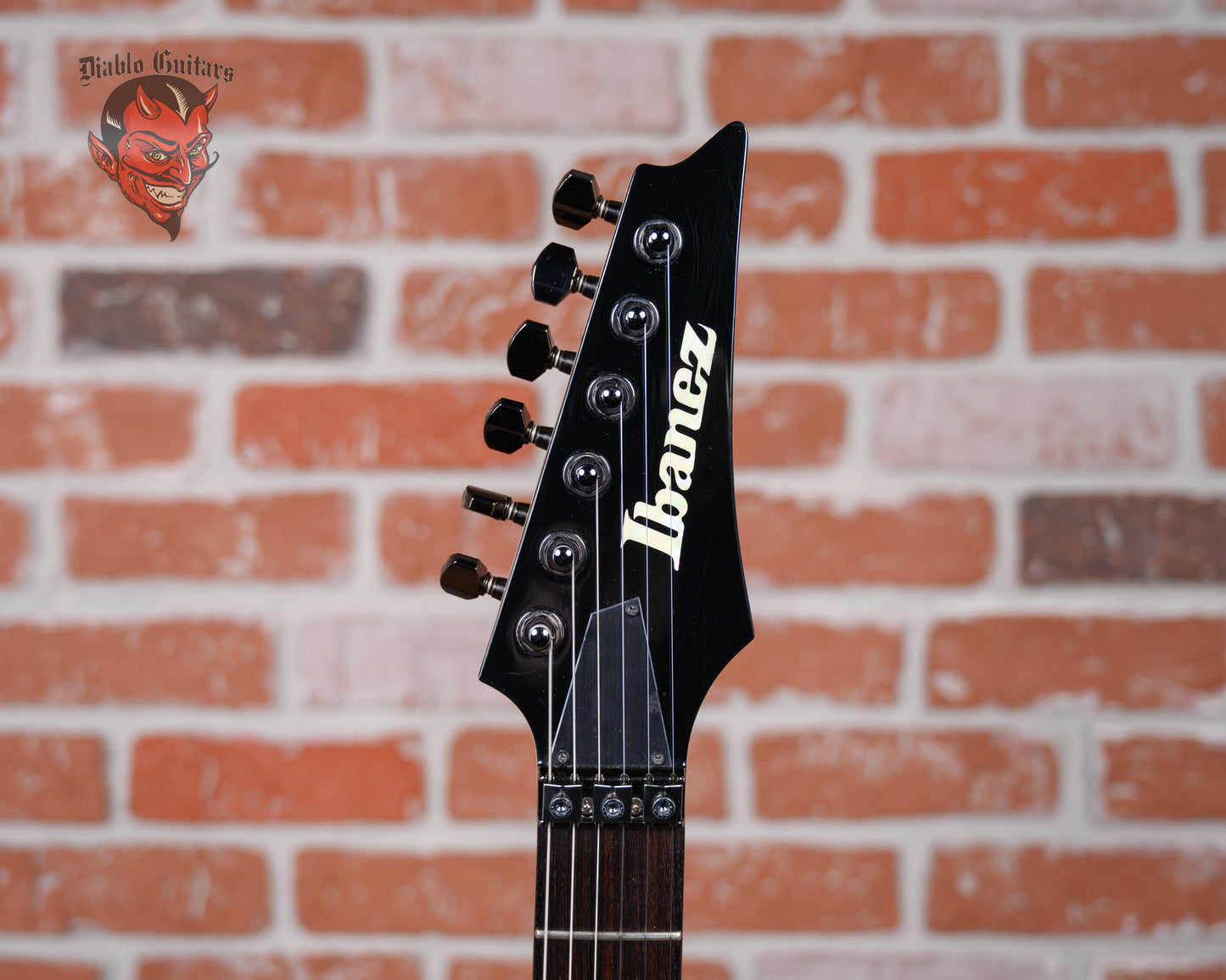 Ibanez Prestige RG2011SC in Black finish made in 2011 with Original Hard Shell Case. This guitar features a bound solid alder body, 5-piece maple/walnut neck and rosewood fingerboard. Equipped with a DiMarzio True Velvet in the middle position and a DiMarzio Tone Zone in the bridge position. Controlled by 1 volume pot, 1 tone pot and a 5-way blade switch with coil tapping & neck pickup simulator. The 25.5" scale length neck has pearloid dot inlays and white side markers with 30 jumbo frets on a 430mm radius with an RG2011SC Prestige profile. The hardware is comprised of cosmo black Gotoh sealed die-cast tuning machines with cloche heads, a Top Lok nut, an Ibanez Edge Zero Tremolo bridge w/ ZPS3 Stabilizer and white top hat knobs with a 3-ply white pearloid on black pickguard.