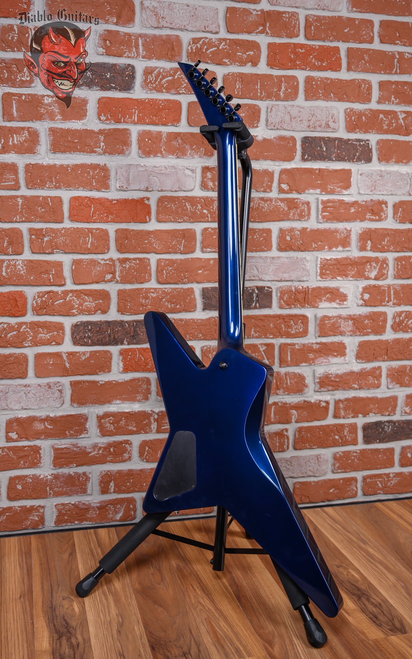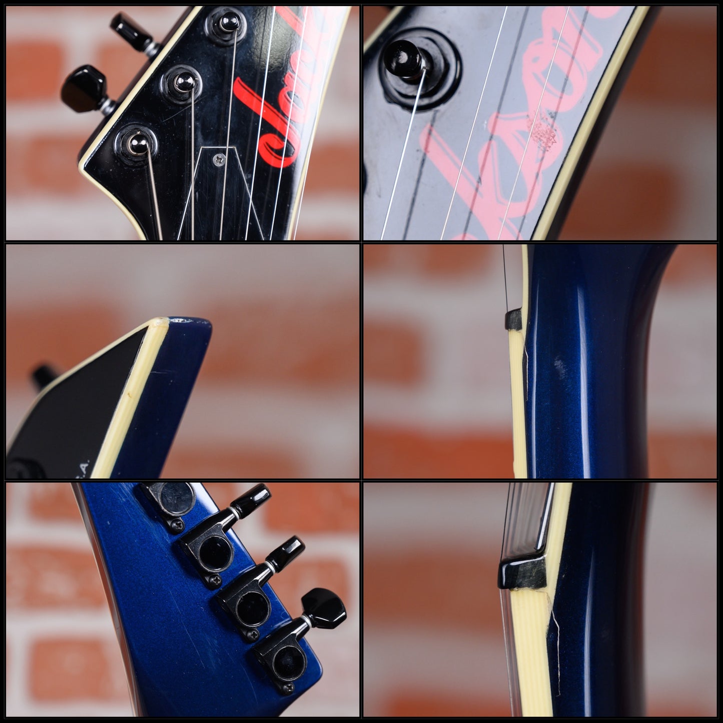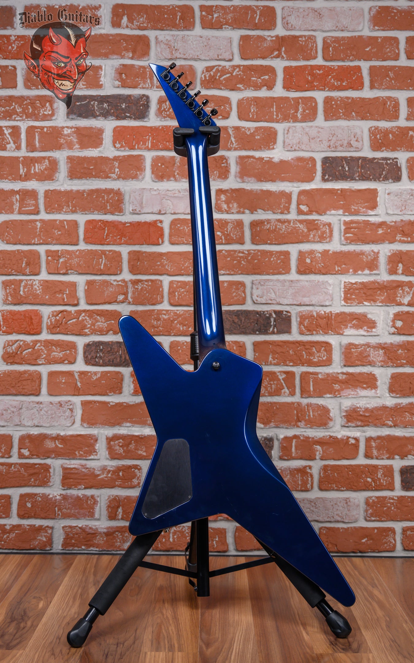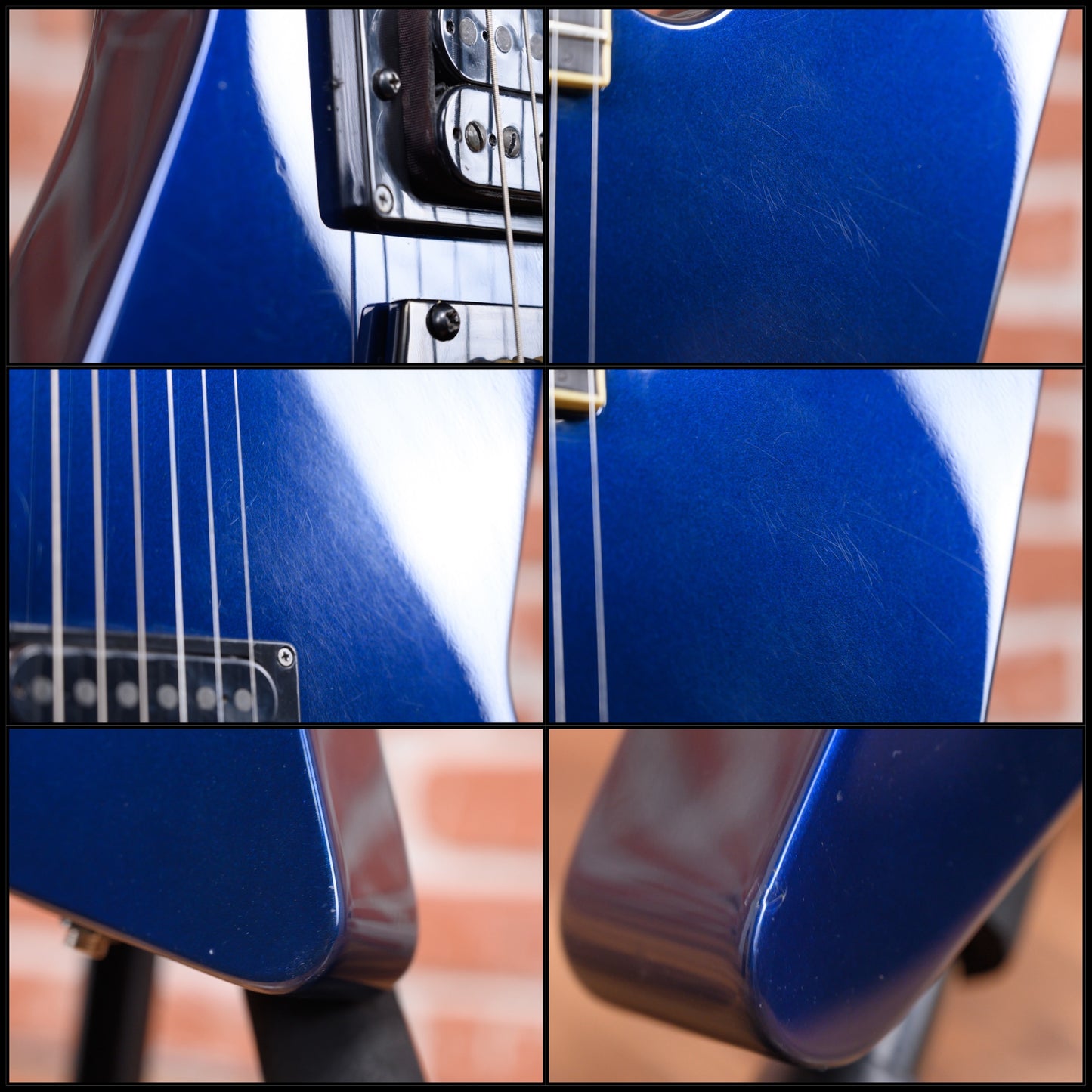 Vintage Jackson USA Custom Shop San Dimas Star in Cobalt Blue finish made in 1986 with Original Hard Shell Case. This guitar features a solid poplar body, quartersawn maple neck-thru and bound ebony fingerboard with a bound headstock with red logo. Equipped with a single Jackson J50B humbucker in the bridge position and controlled by one master volume pot. The 25.5" scale length neck has mother of pearl sharkfin inlays and black side markers with 22 jumbo frets on a compound 12"-16" radius with a speed profile. The hardware is comprised of black Jackson sealed diecast tuning machines with cloche heads, a graphite nut, a kahler 3310 hardtail bridge and black knurled dome knob.