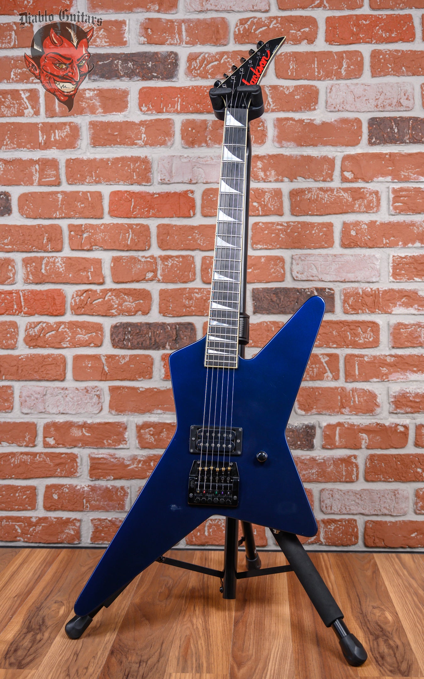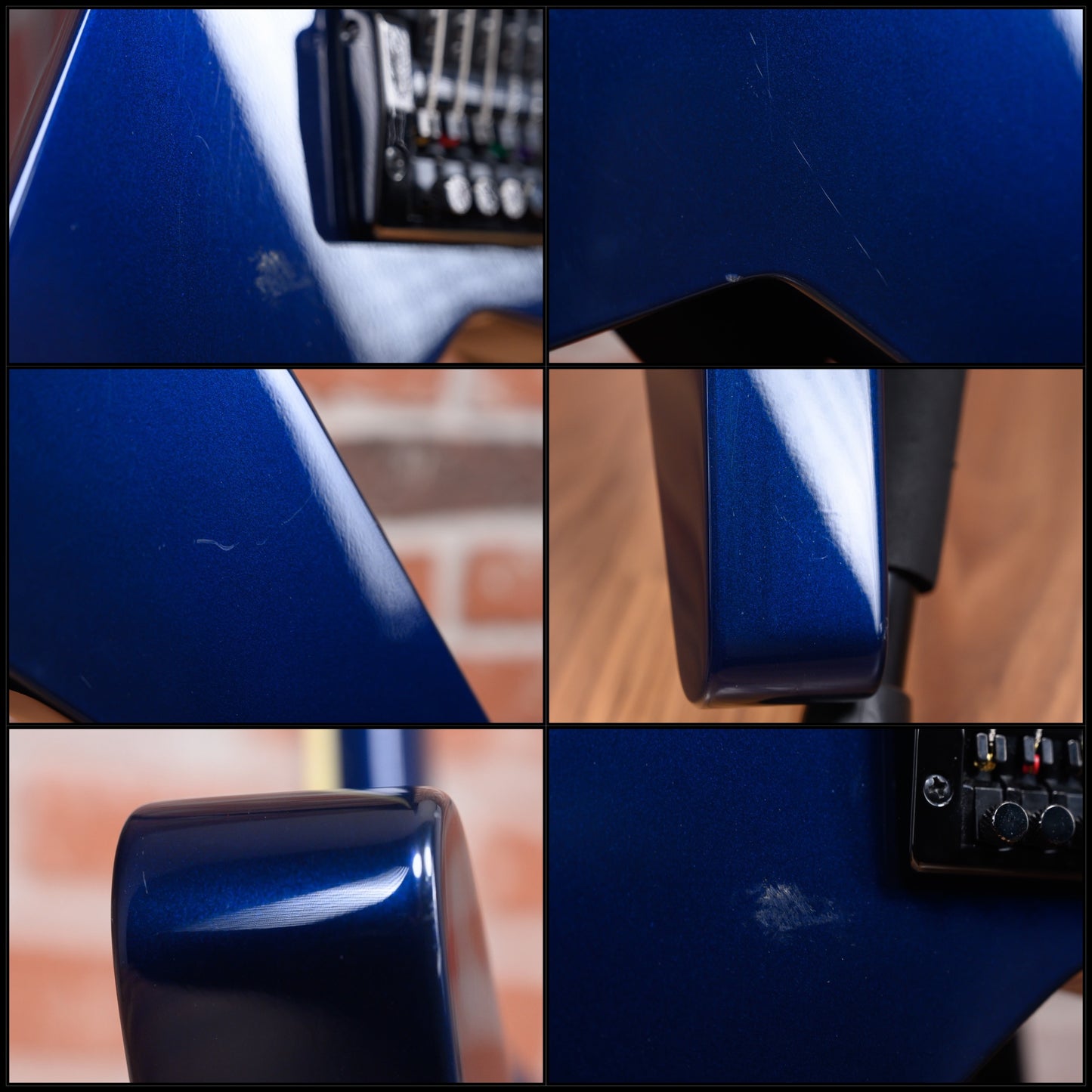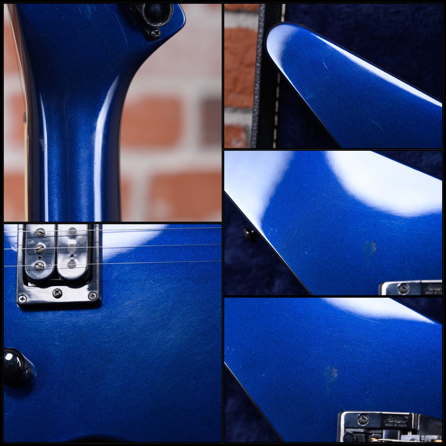 Vintage Jackson USA Custom Shop San Dimas Star in Cobalt Blue finish made in 1986 with Original Hard Shell Case. This guitar features a solid poplar body, quartersawn maple neck-thru and bound ebony fingerboard with a bound headstock with red logo. Equipped with a single Jackson J50B humbucker in the bridge position and controlled by one master volume pot. The 25.5" scale length neck has mother of pearl sharkfin inlays and black side markers with 22 jumbo frets on a compound 12"-16" radius with a speed profile. The hardware is comprised of black Jackson sealed diecast tuning machines with cloche heads, a graphite nut, a kahler 3310 hardtail bridge and black knurled dome knob.