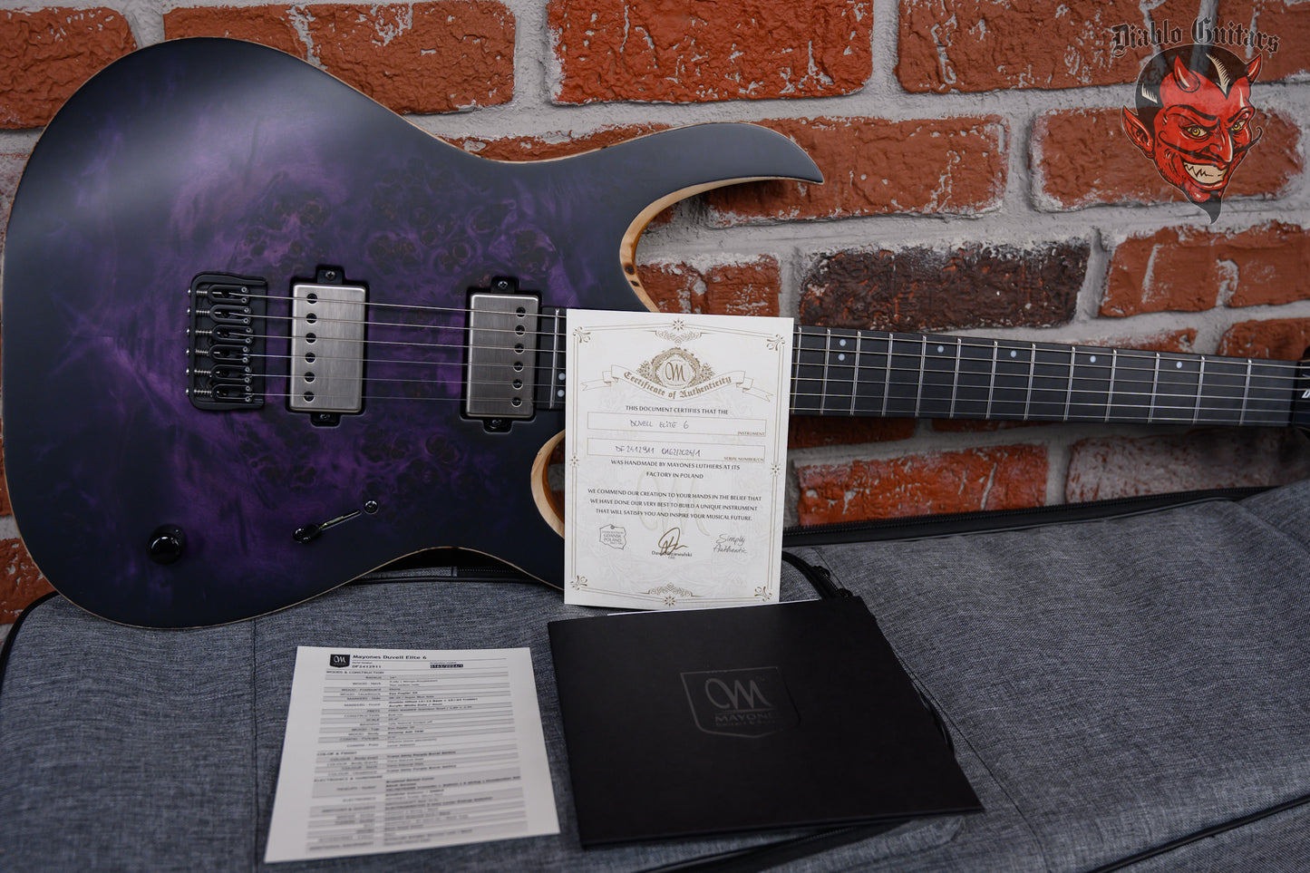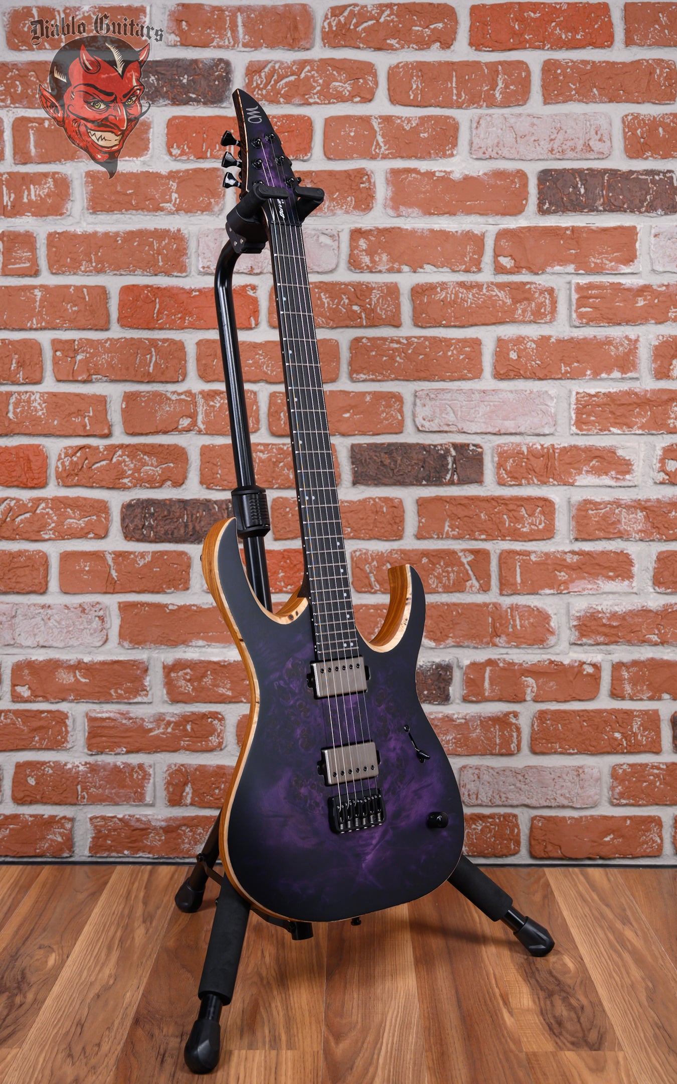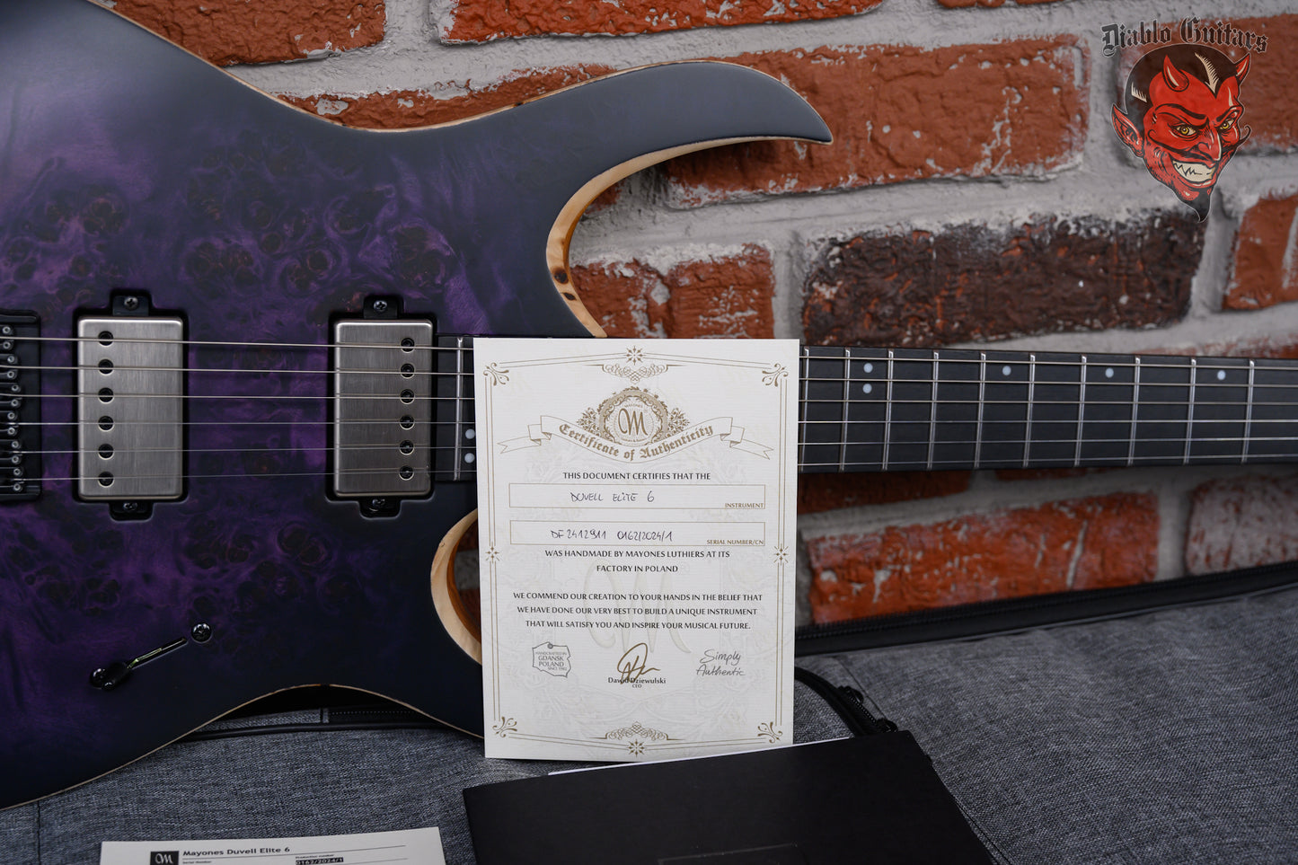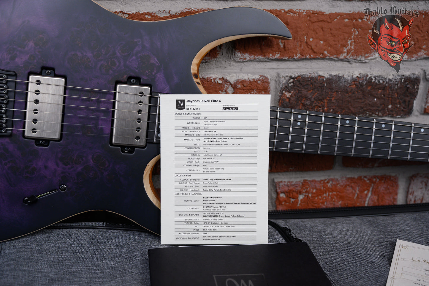 Mayones Duvall Elite 6 Eye Poplar 3A Top in Transparent Dirty Purple Burst Satine finish made in 2024 with Original Soft Shell Case. This guitar features a solid swamp ash TEW body with a bound 3A eye poplar burl top, 5-Ply wenge/purpleheart neck and ebony fingerboard with a color matched 3A eye poplar overlay headstock. Equipped with a velvtrone solium in the neck position and a velvtrone ironside in the bridge position. Controlled by one master volume pot and a 5-Way blade switch. The 25.4" scale length neck has acrylic white 4mm dot inlays, SB-20 super blue side markers with 24 ferd wagner stainless steel 2.80 x 3.34 frets on a 16" radius with a thin "C" profile. The hardware is comprised of black hipshot griplock tuning machines with keystone heads, a graphtech black tusq nut, a hipshot hardtail 6 and black knurled dome knob.