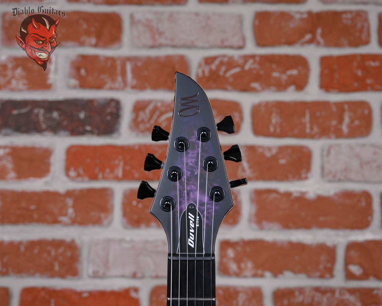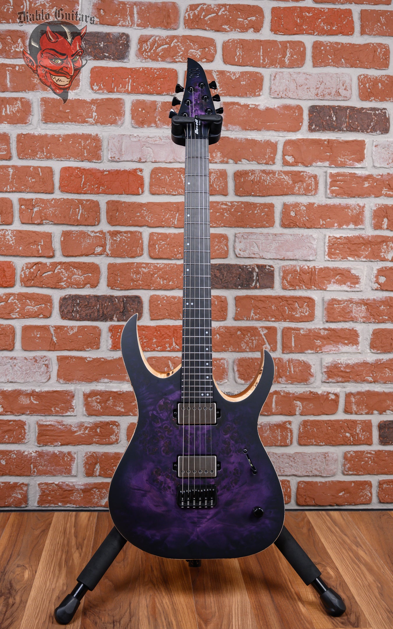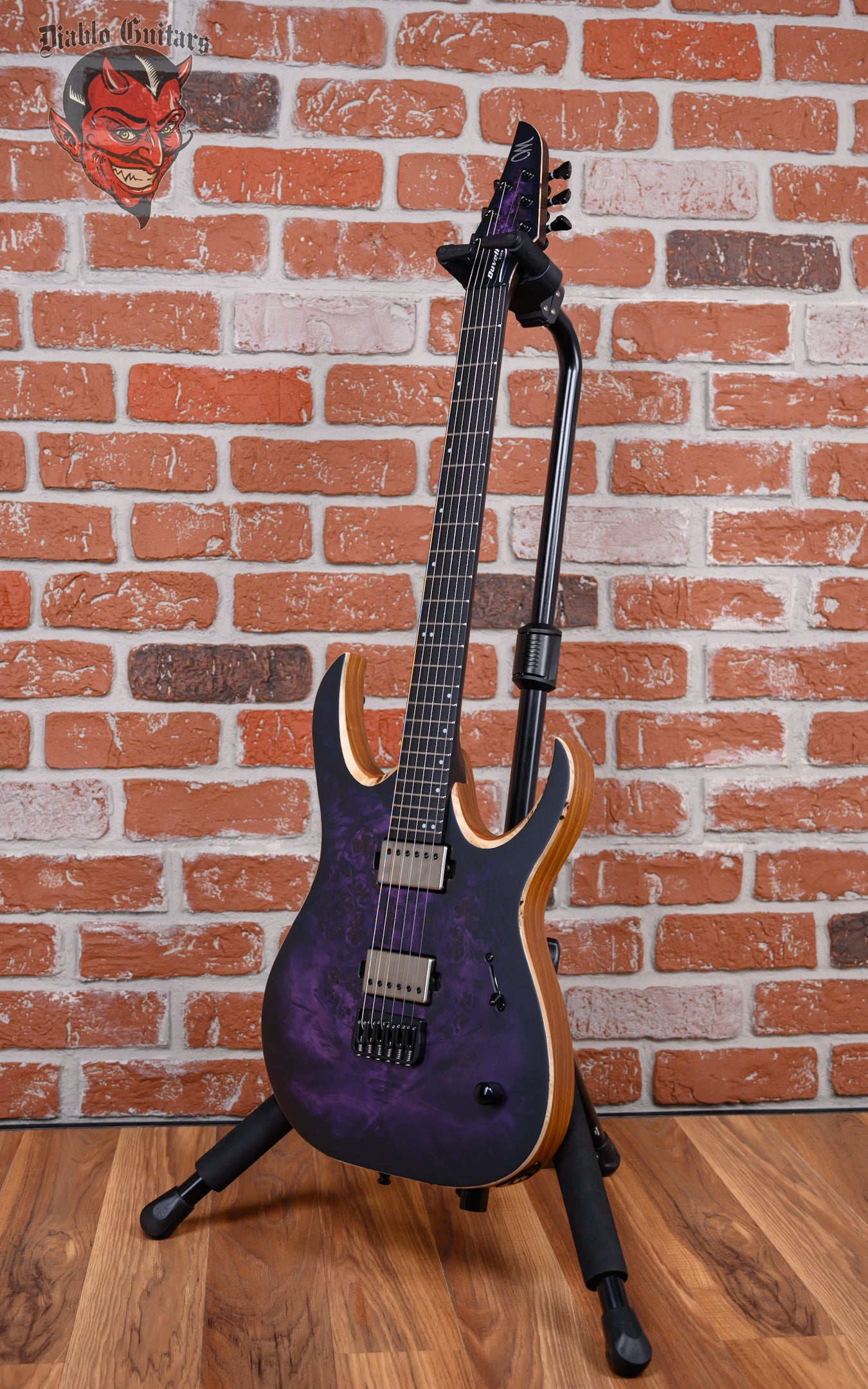 Mayones Duvall Elite 6 Eye Poplar 3A Top in Transparent Dirty Purple Burst Satine finish made in 2024 with Original Soft Shell Case. This guitar features a solid swamp ash TEW body with a bound 3A eye poplar burl top, 5-Ply wenge/purpleheart neck and ebony fingerboard with a color matched 3A eye poplar overlay headstock. Equipped with a velvtrone solium in the neck position and a velvtrone ironside in the bridge position. Controlled by one master volume pot and a 5-Way blade switch. The 25.4" scale length neck has acrylic white 4mm dot inlays, SB-20 super blue side markers with 24 ferd wagner stainless steel 2.80 x 3.34 frets on a 16" radius with a thin "C" profile. The hardware is comprised of black hipshot griplock tuning machines with keystone heads, a graphtech black tusq nut, a hipshot hardtail 6 and black knurled dome knob.