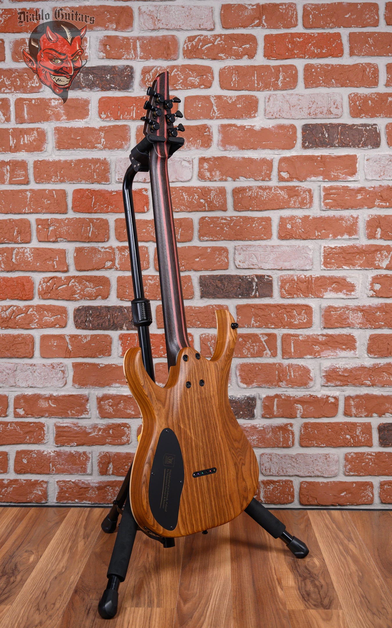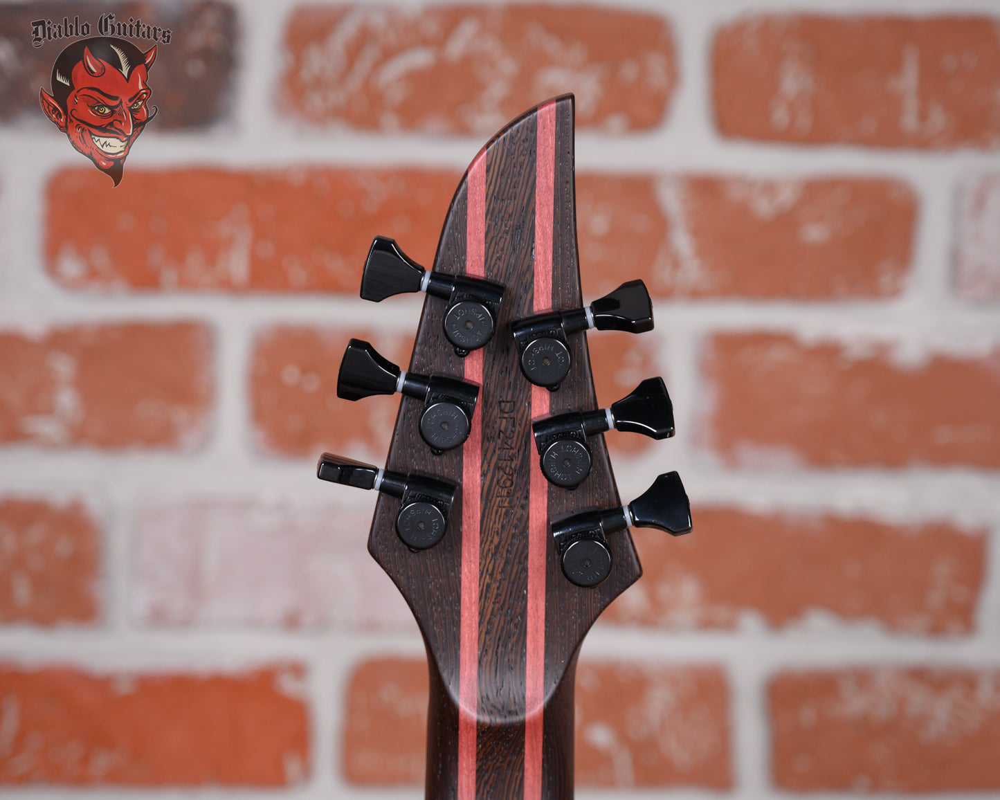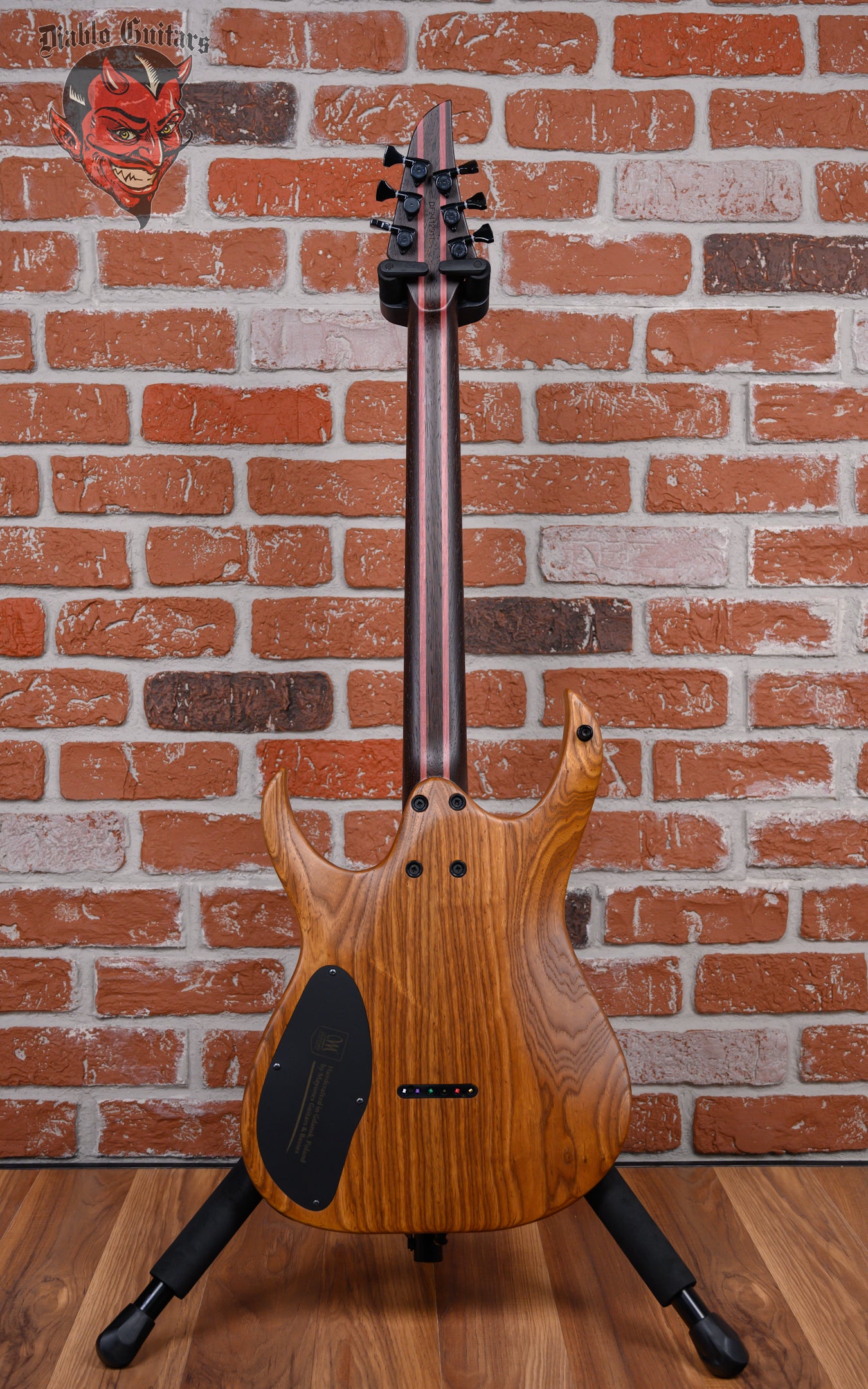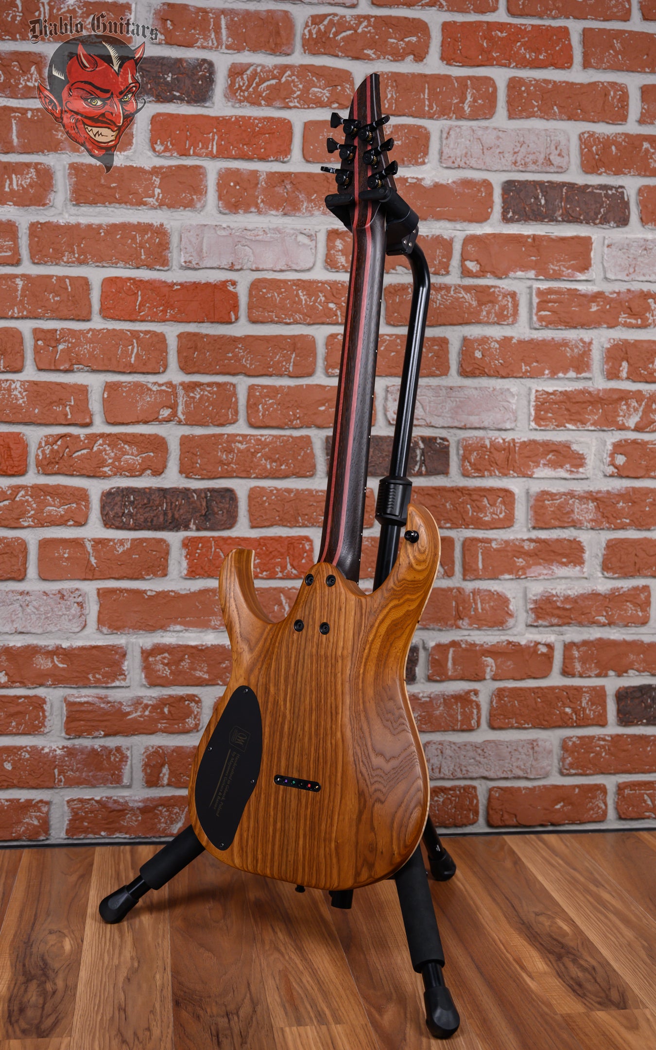 Mayones Duvall Elite 6 Eye Poplar 3A Top in Transparent Dirty Purple Burst Satine finish made in 2024 with Original Soft Shell Case. This guitar features a solid swamp ash TEW body with a bound 3A eye poplar burl top, 5-Ply wenge/purpleheart neck and ebony fingerboard with a color matched 3A eye poplar overlay headstock. Equipped with a velvtrone solium in the neck position and a velvtrone ironside in the bridge position. Controlled by one master volume pot and a 5-Way blade switch. The 25.4" scale length neck has acrylic white 4mm dot inlays, SB-20 super blue side markers with 24 ferd wagner stainless steel 2.80 x 3.34 frets on a 16" radius with a thin "C" profile. The hardware is comprised of black hipshot griplock tuning machines with keystone heads, a graphtech black tusq nut, a hipshot hardtail 6 and black knurled dome knob.
