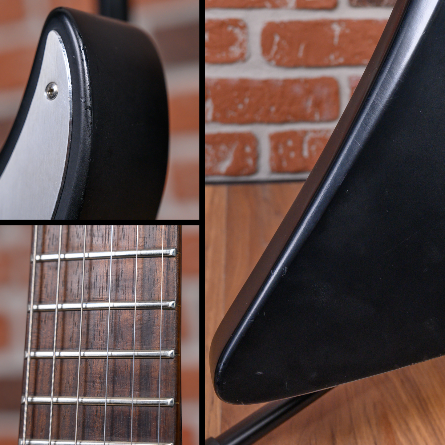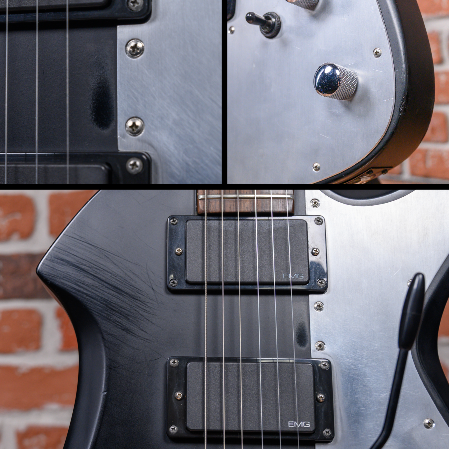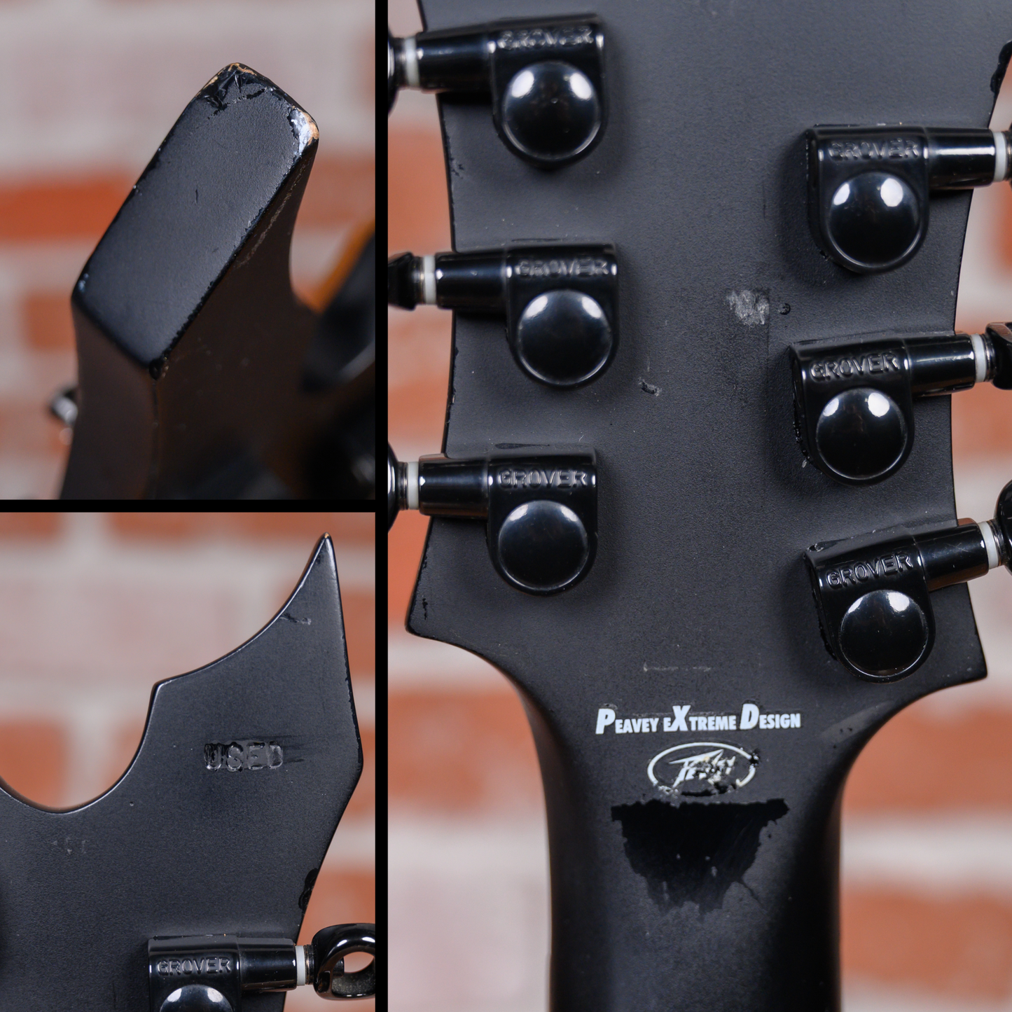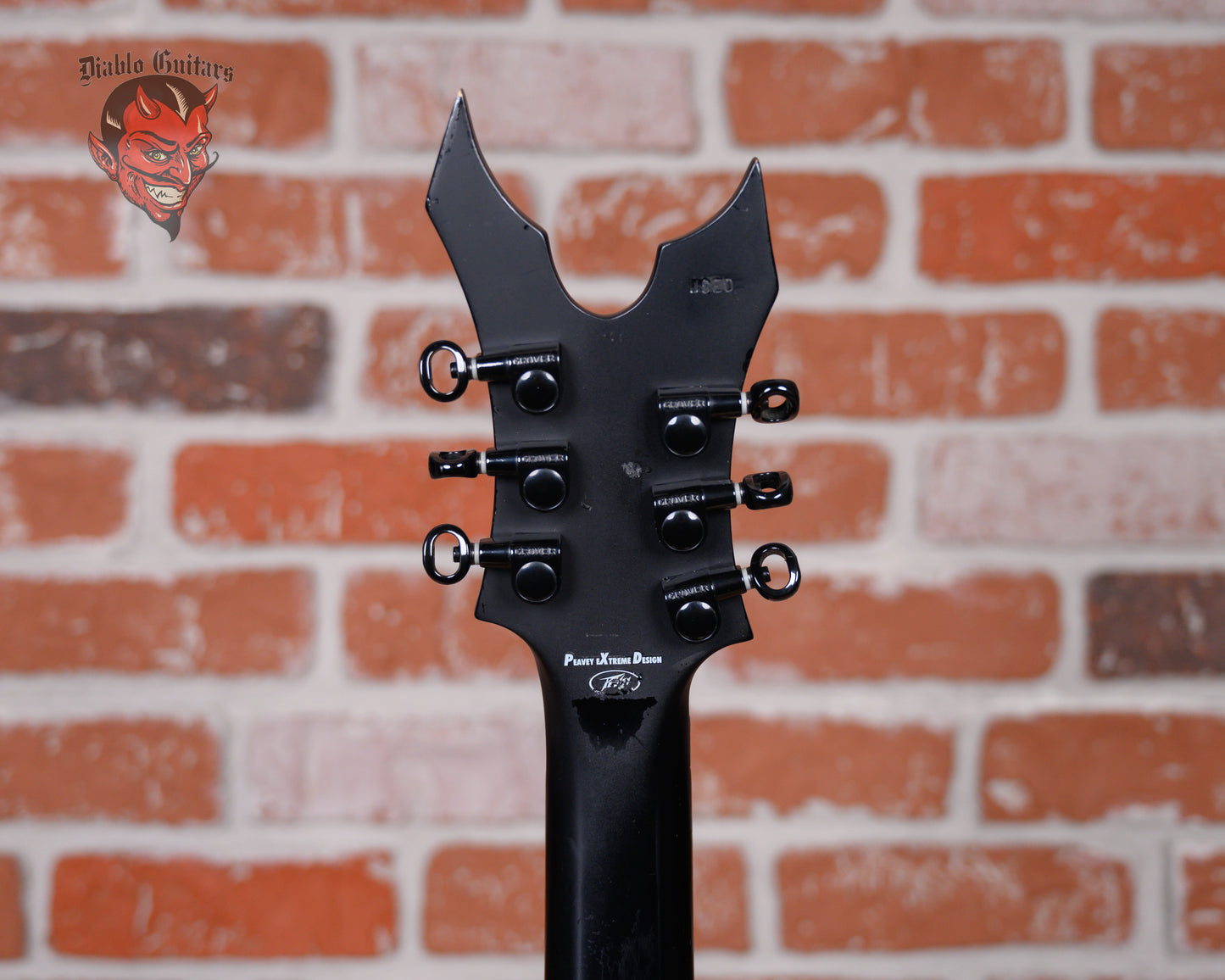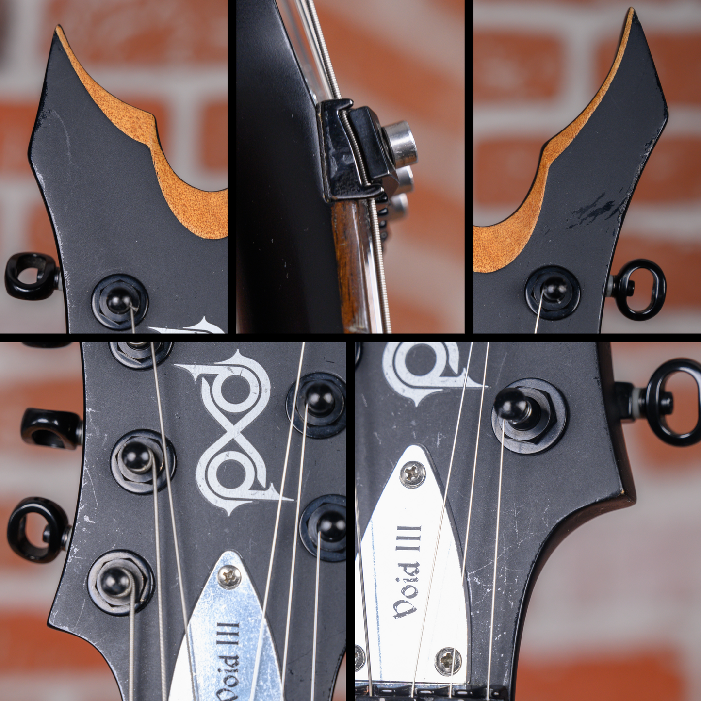 Peavey Void III in Satin Black finish made in 2009 with Gigbag. This guitar features a solid mahogany body, mahogany neck and rosewood fingerboard. Equipped with an EMG 60 in the neck position and an EMG 81 in the bridge position. Controlled by 2 volume pots, 1 tone pot and a 3-way toggle switch. The 24.75" scale length neck has a 12th fret aluminum reverse sharkfin inlay and white side markers with 24 jumbo frets on a 15" radius with a medium C profile. The hardware is comprised of black Grover Rotomatic tuning machines with skeletonized oval heads, a Kahler locking nut, a Kahler X-Trem bridge and chrome knurled dome knobs with an anodized aluminum pickguard.