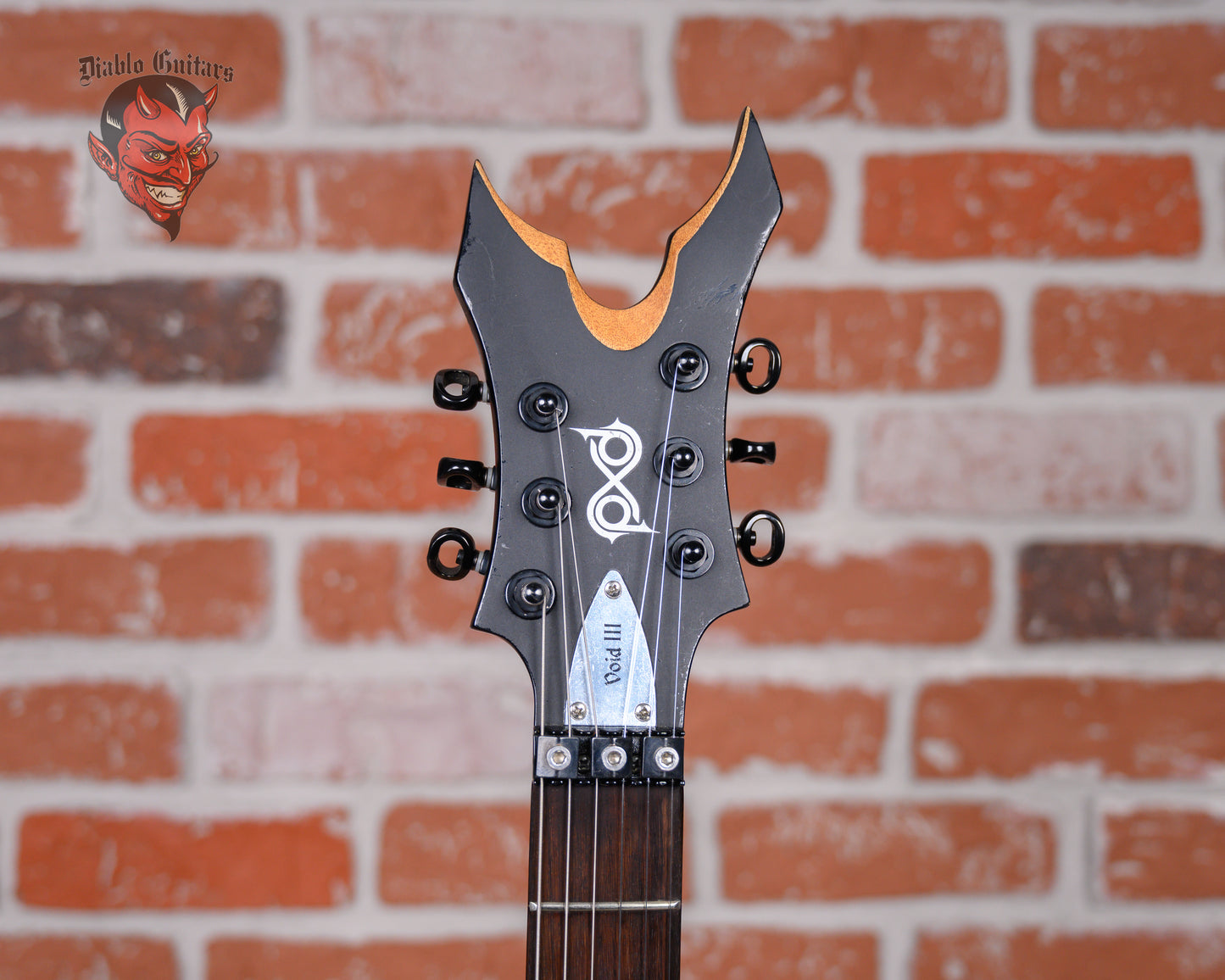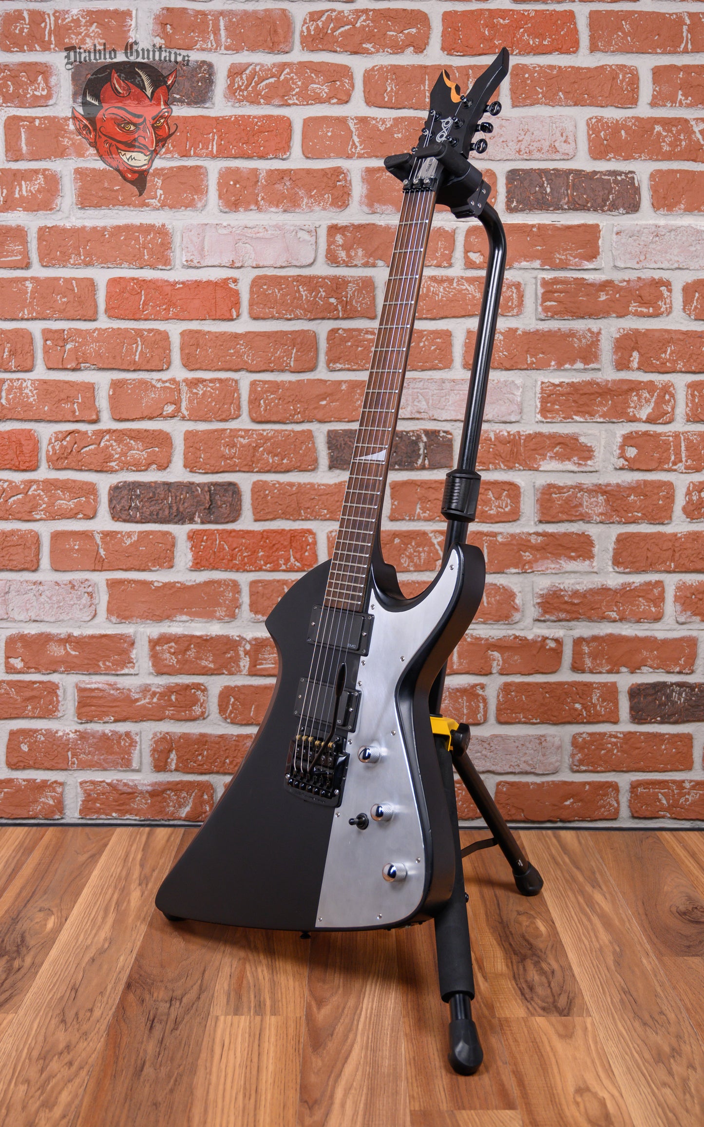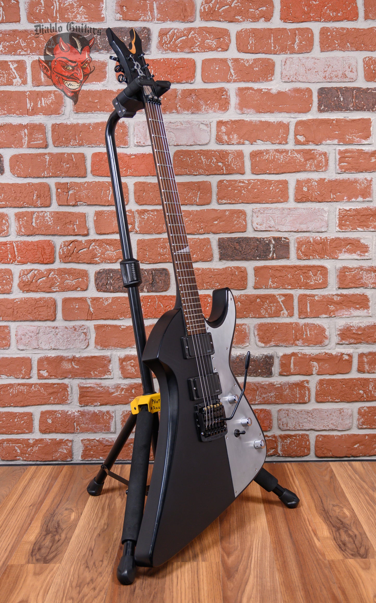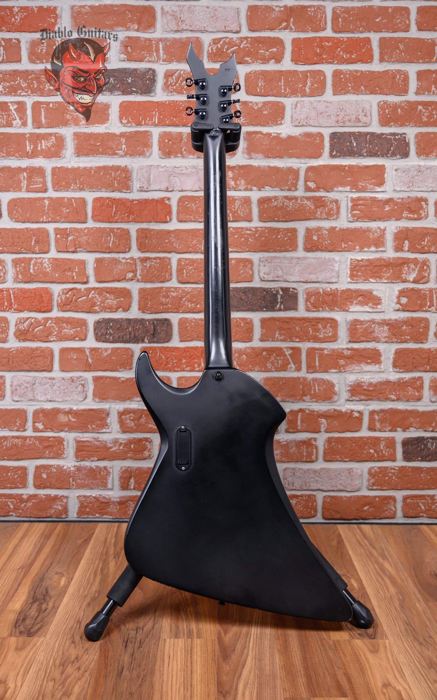 Peavey Void III in Satin Black finish made in 2009 with Gigbag. This guitar features a solid mahogany body, mahogany neck and rosewood fingerboard. Equipped with an EMG 60 in the neck position and an EMG 81 in the bridge position. Controlled by 2 volume pots, 1 tone pot and a 3-way toggle switch. The 24.75" scale length neck has a 12th fret aluminum reverse sharkfin inlay and white side markers with 24 jumbo frets on a 15" radius with a medium C profile. The hardware is comprised of black Grover Rotomatic tuning machines with skeletonized oval heads, a Kahler locking nut, a Kahler X-Trem bridge and chrome knurled dome knobs with an anodized aluminum pickguard.