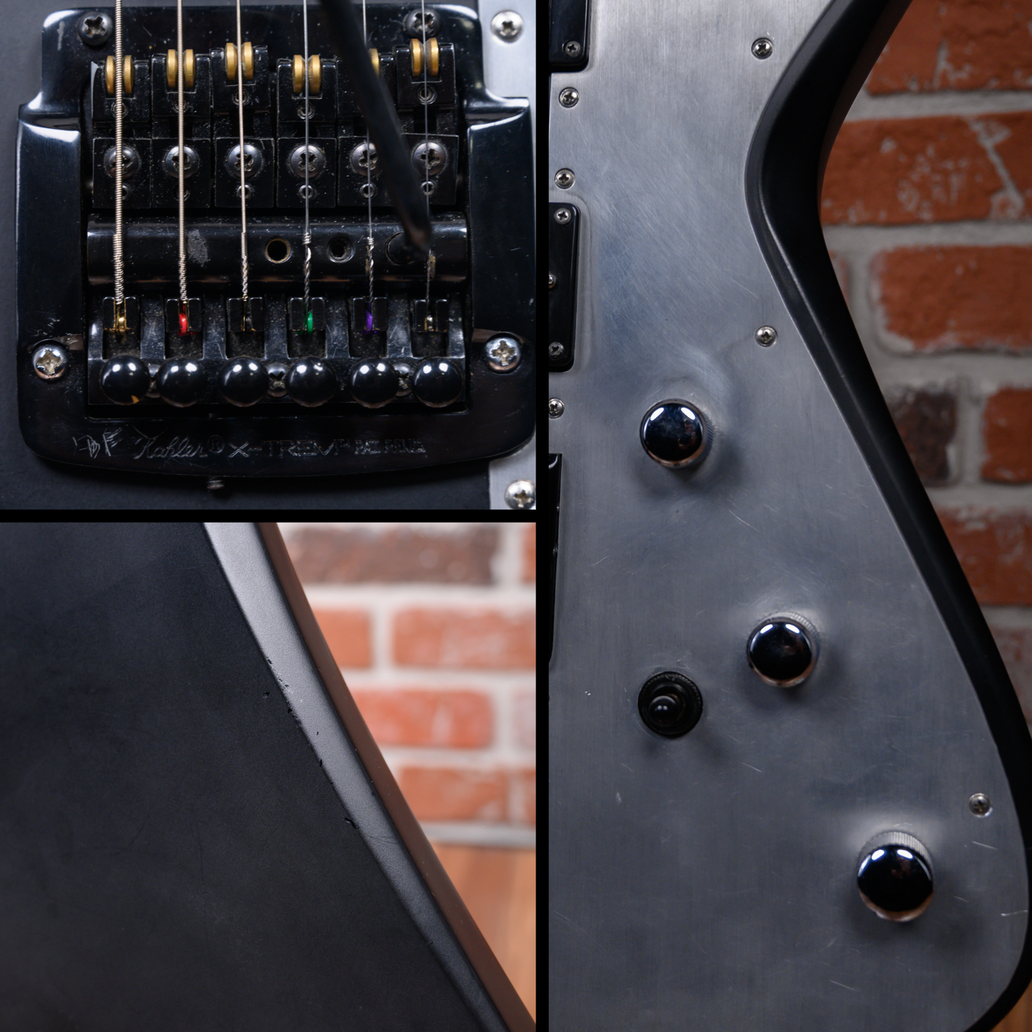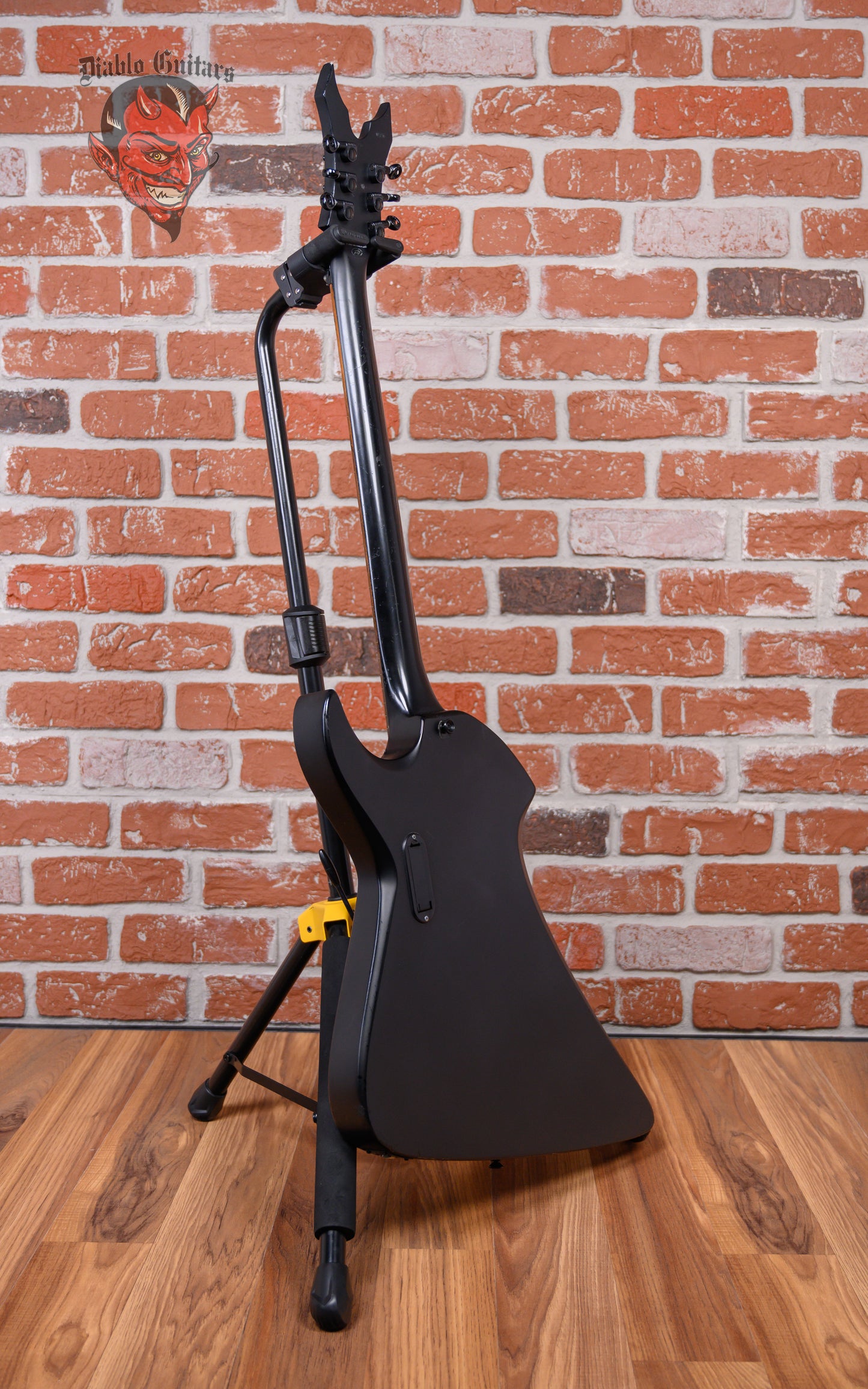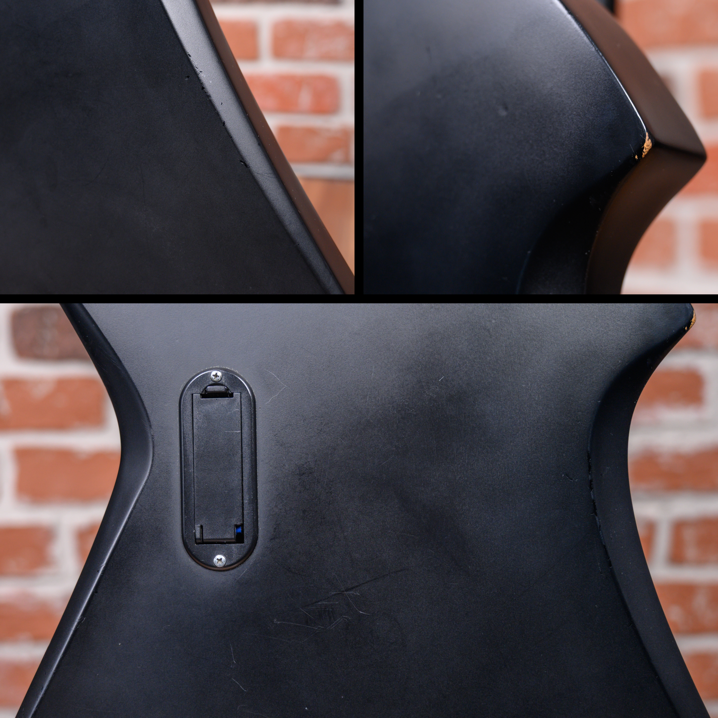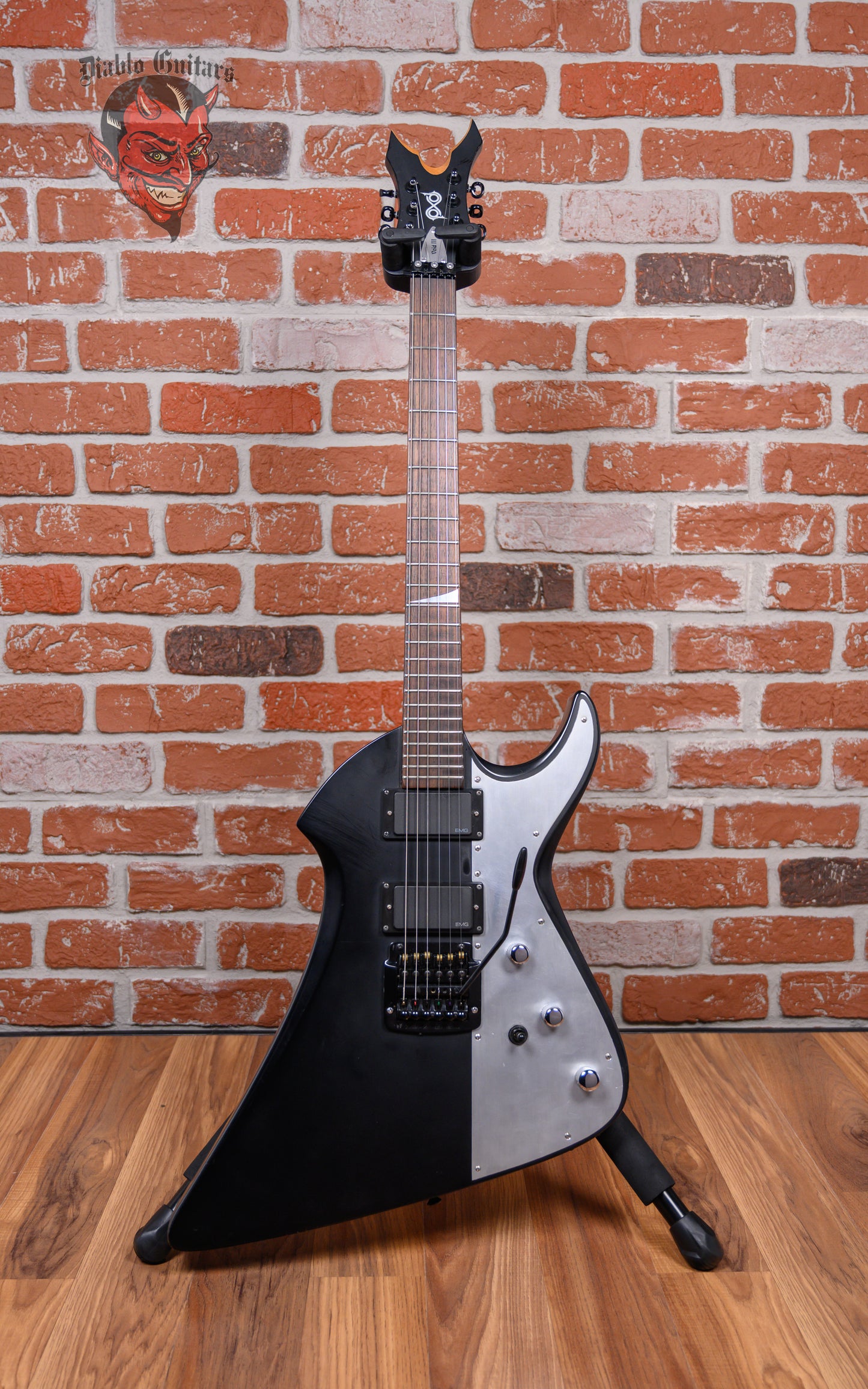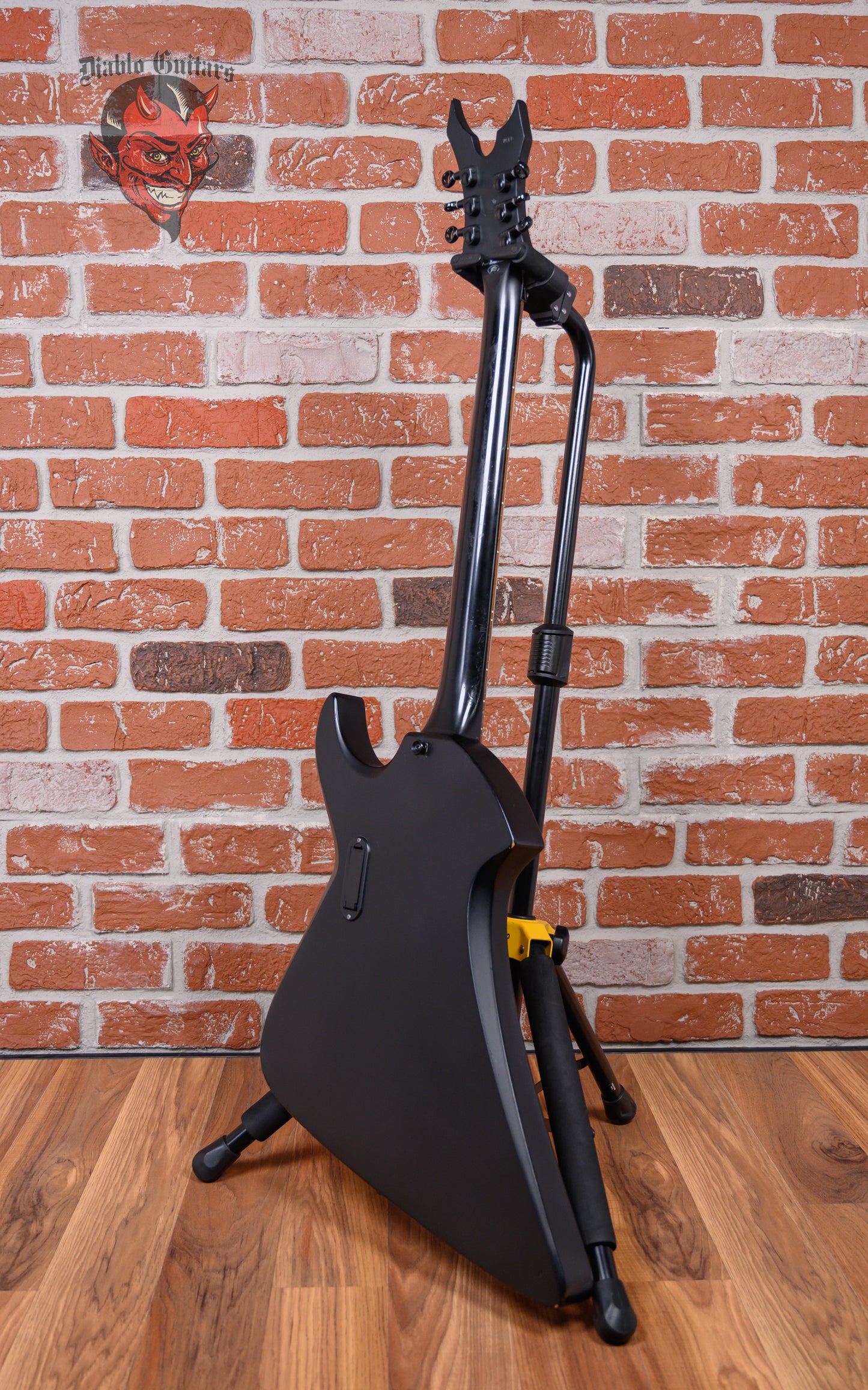 Peavey Void III in Satin Black finish made in 2009 with Gigbag. This guitar features a solid mahogany body, mahogany neck and rosewood fingerboard. Equipped with an EMG 60 in the neck position and an EMG 81 in the bridge position. Controlled by 2 volume pots, 1 tone pot and a 3-way toggle switch. The 24.75" scale length neck has a 12th fret aluminum reverse sharkfin inlay and white side markers with 24 jumbo frets on a 15" radius with a medium C profile. The hardware is comprised of black Grover Rotomatic tuning machines with skeletonized oval heads, a Kahler locking nut, a Kahler X-Trem bridge and chrome knurled dome knobs with an anodized aluminum pickguard.