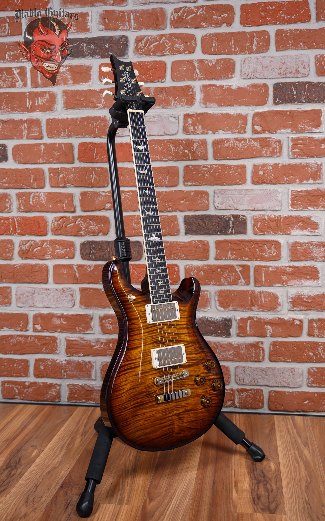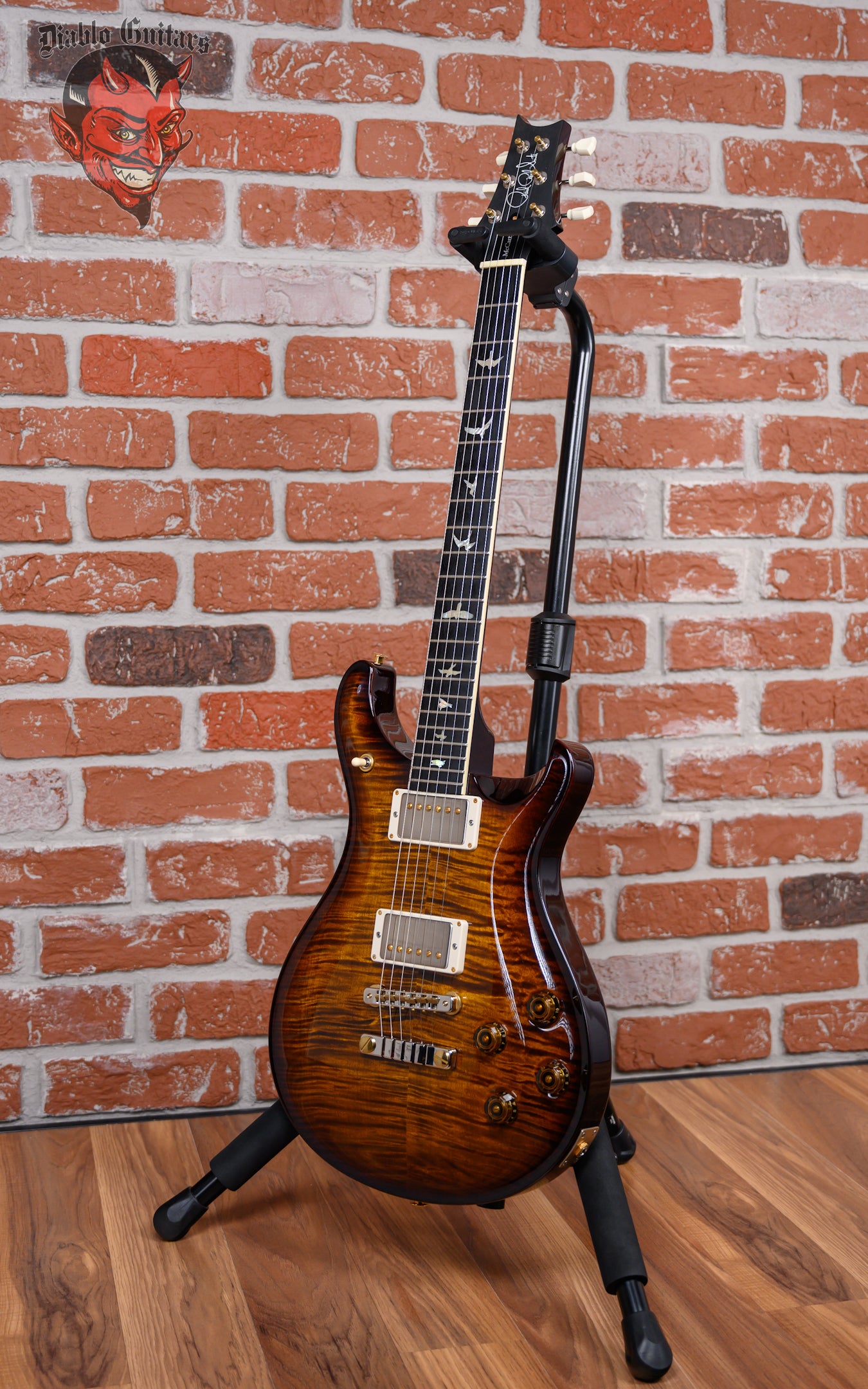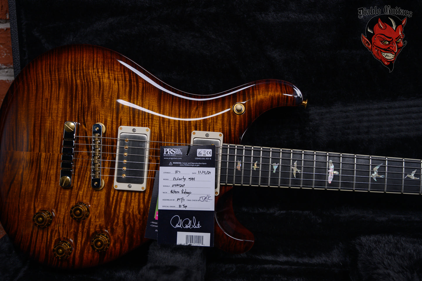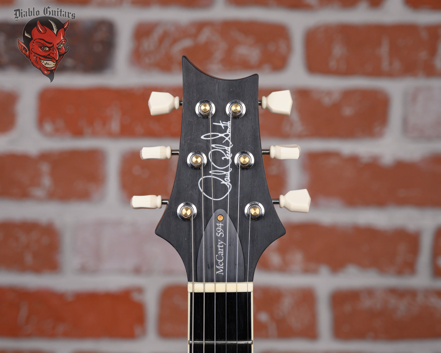 PRS 594 McCarty Flame Maple 10 Top in Black Gold Wrap Around Burst finish made in 2021 with Original Hard Shell Case. This guitar features a solid mahogany body with a flame maple 10 top, flamed maple neck and bound ebony fingerboard with an ebony overlay headstock. Equipped with a pair of brushed nickel PRS 59/15LT with gold pole pieces in the neck position and bridge position. Controlled by 2 volume, 2 tone pots with push/pull coil taps and a 3-Way toggle switch. The 24.594" scale length neck has mother of pearl birds inlays and black side markers with 22 medium jumbo frets on a 10" radius with a pattern vintage profile. The hardware is comprised of nickel/gold PRS vintage style tuning machines with keystone heads, a bone nut, a PRS adjustable bridge with PRS 2-piece stoptail and amber lamp shade knobs.
