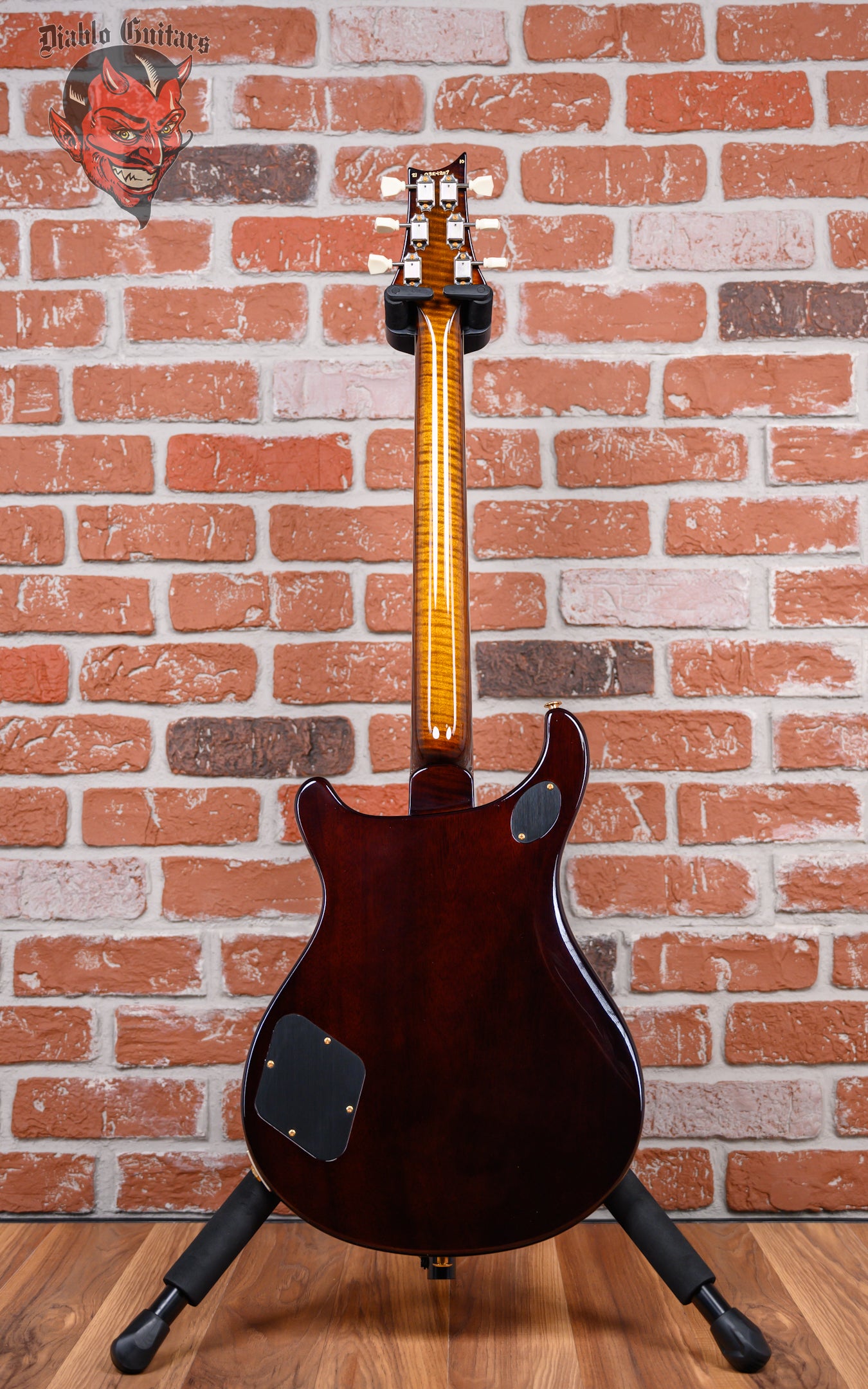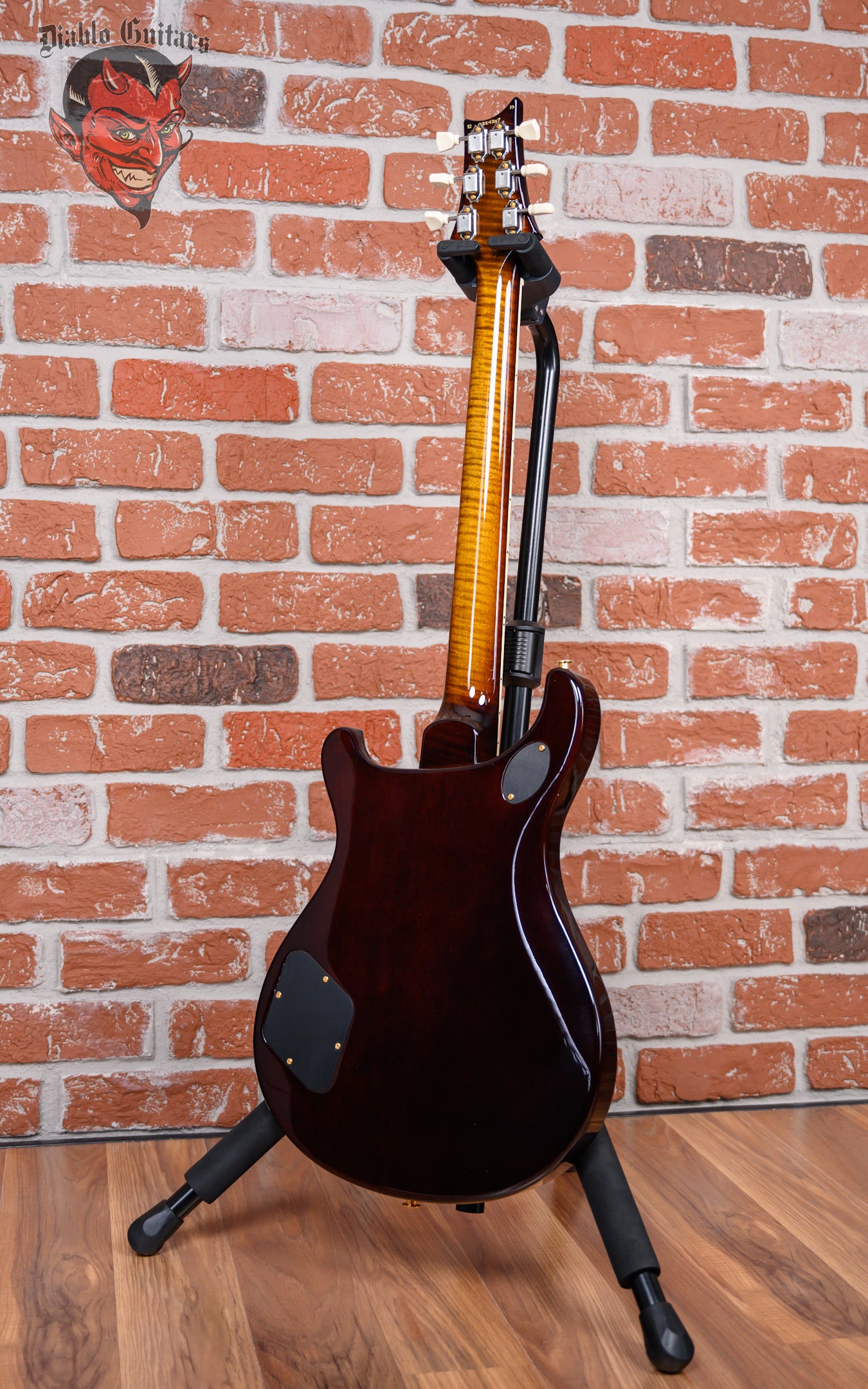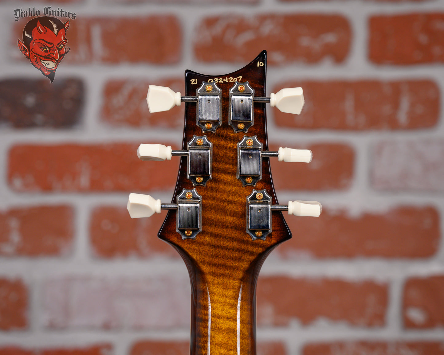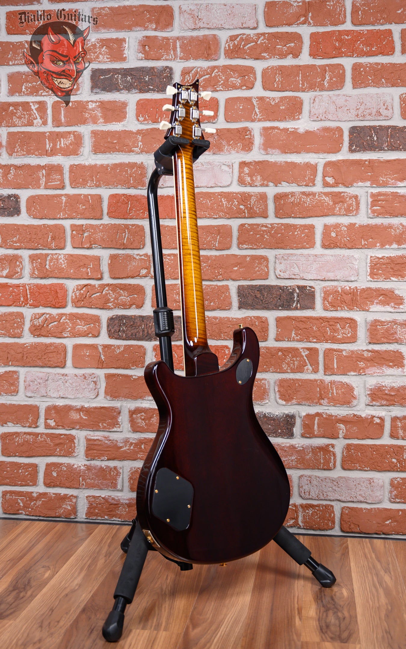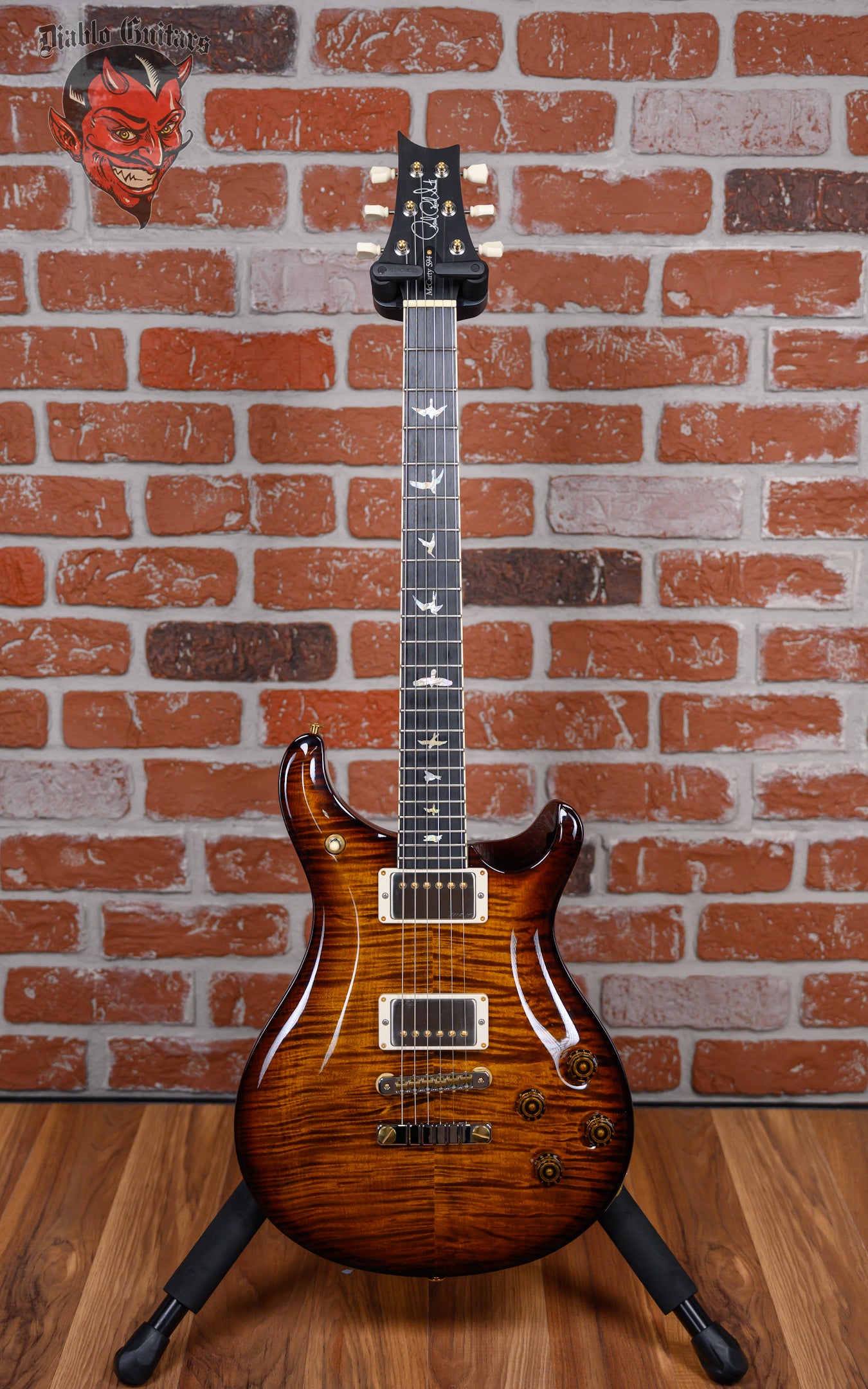 PRS 594 McCarty Flame Maple 10 Top in Black Gold Wrap Around Burst finish made in 2021 with Original Hard Shell Case. This guitar features a solid mahogany body with a flame maple 10 top, flamed maple neck and bound ebony fingerboard with an ebony overlay headstock. Equipped with a pair of brushed nickel PRS 59/15LT with gold pole pieces in the neck position and bridge position. Controlled by 2 volume, 2 tone pots with push/pull coil taps and a 3-Way toggle switch. The 24.594" scale length neck has mother of pearl birds inlays and black side markers with 22 medium jumbo frets on a 10" radius with a pattern vintage profile. The hardware is comprised of nickel/gold PRS vintage style tuning machines with keystone heads, a bone nut, a PRS adjustable bridge with PRS 2-piece stoptail and amber lamp shade knobs.