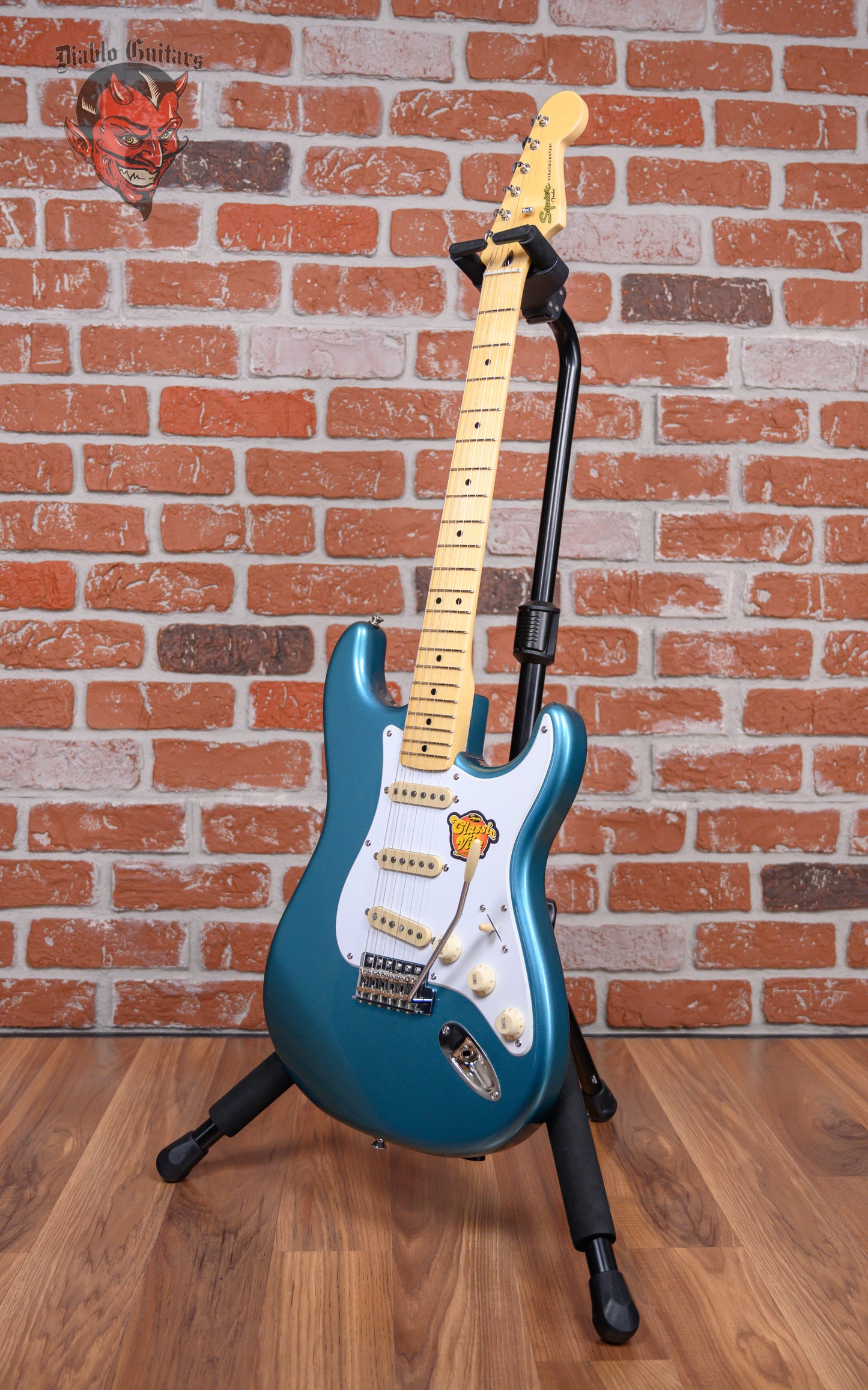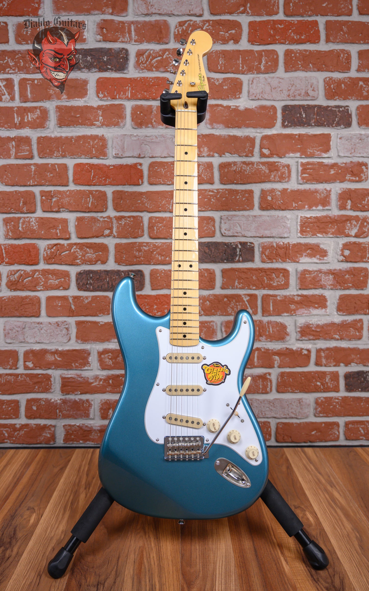 Squier Classic Vibe Stratocaster '50s in Lake Placid Blue finish made in 2009 with Gigbag. This guitar features a solid alder body, maple neck and maple fingerboard. Equipped with a set of Custom Vintage-Style Single-Coil Strat pickups in the neck, middle, and bridge positions. Controlled by 1 volume pot, 2 tone pots and a 5-Way blade switch. The 25.5" scale length neck has black dot inlays and black side markers with 21 medium jumbo frets on a 9.5" radius with a medium C profile. The hardware is comprised of chrome Vintage-Style tuning machines with oval heads, a synthetic bone nut, a 6-saddle Vintage-Style synchronized tremolo bridge and aged white top hat knobs with a single ply white pickguard.