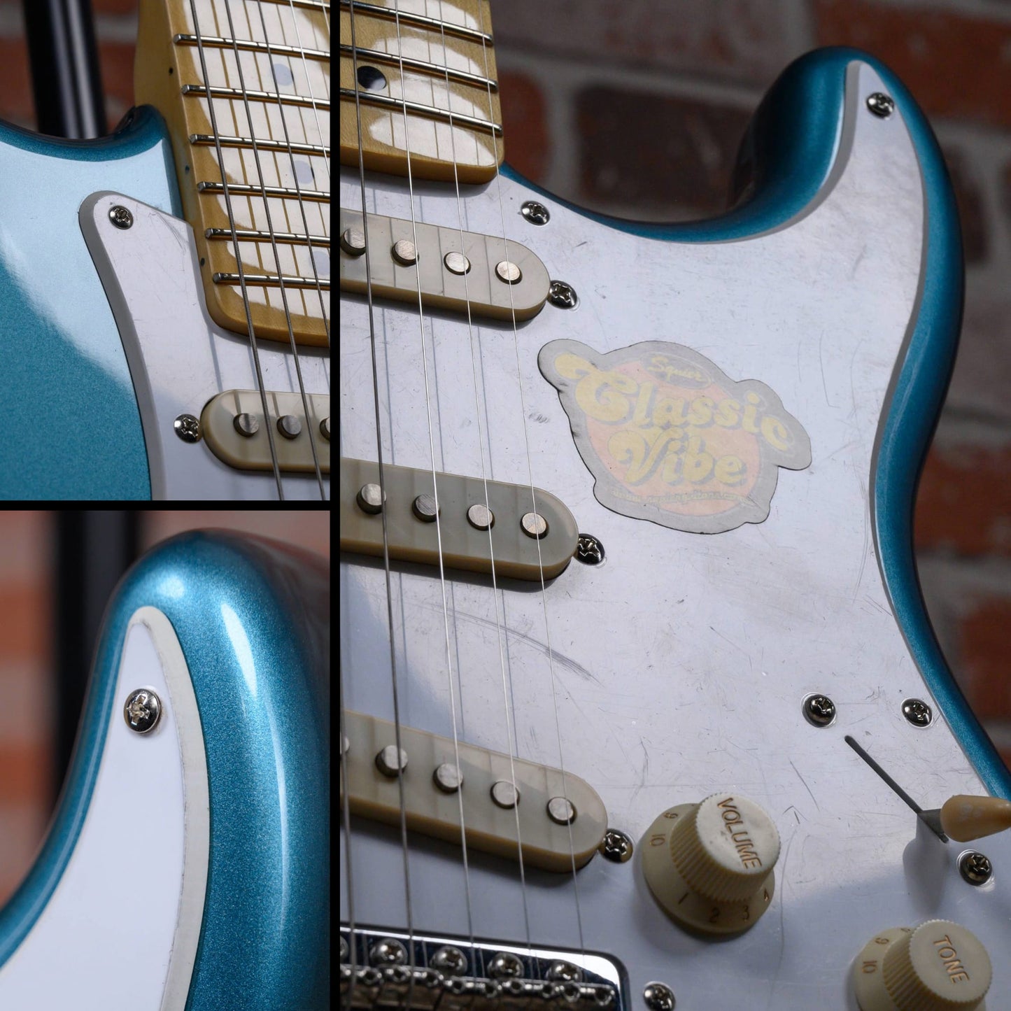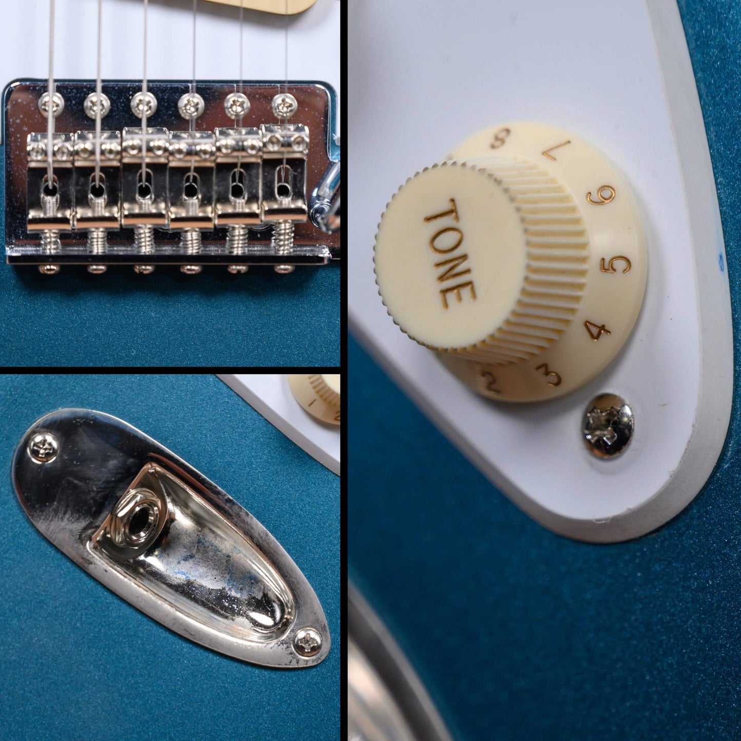 This guitar is in overall excellent condition. The hardware shows some sign of play and age. There is some light pitting and plating wear on the chrome parts. The pickguard shows signs of play but still has the factory film on it. (See pics)